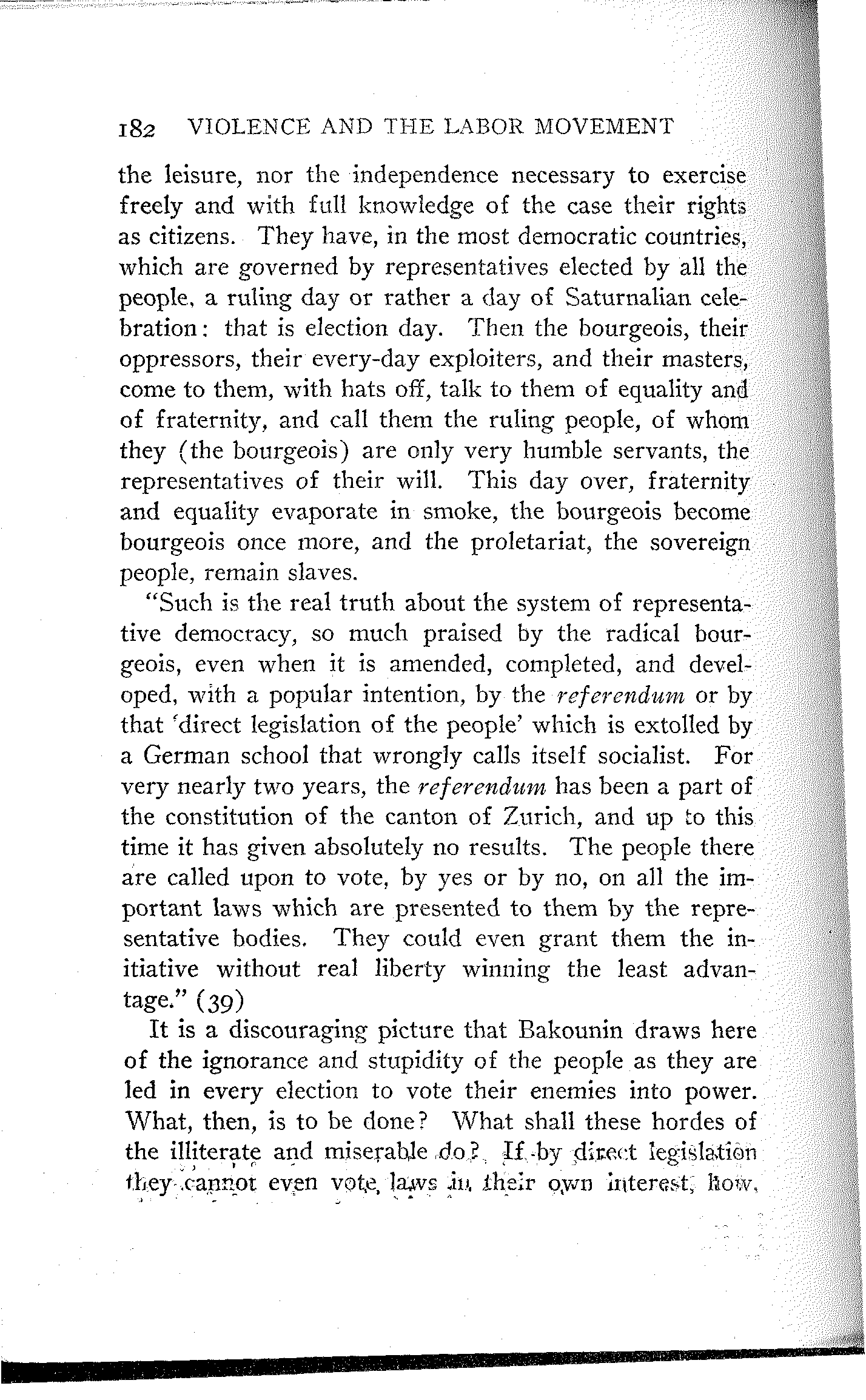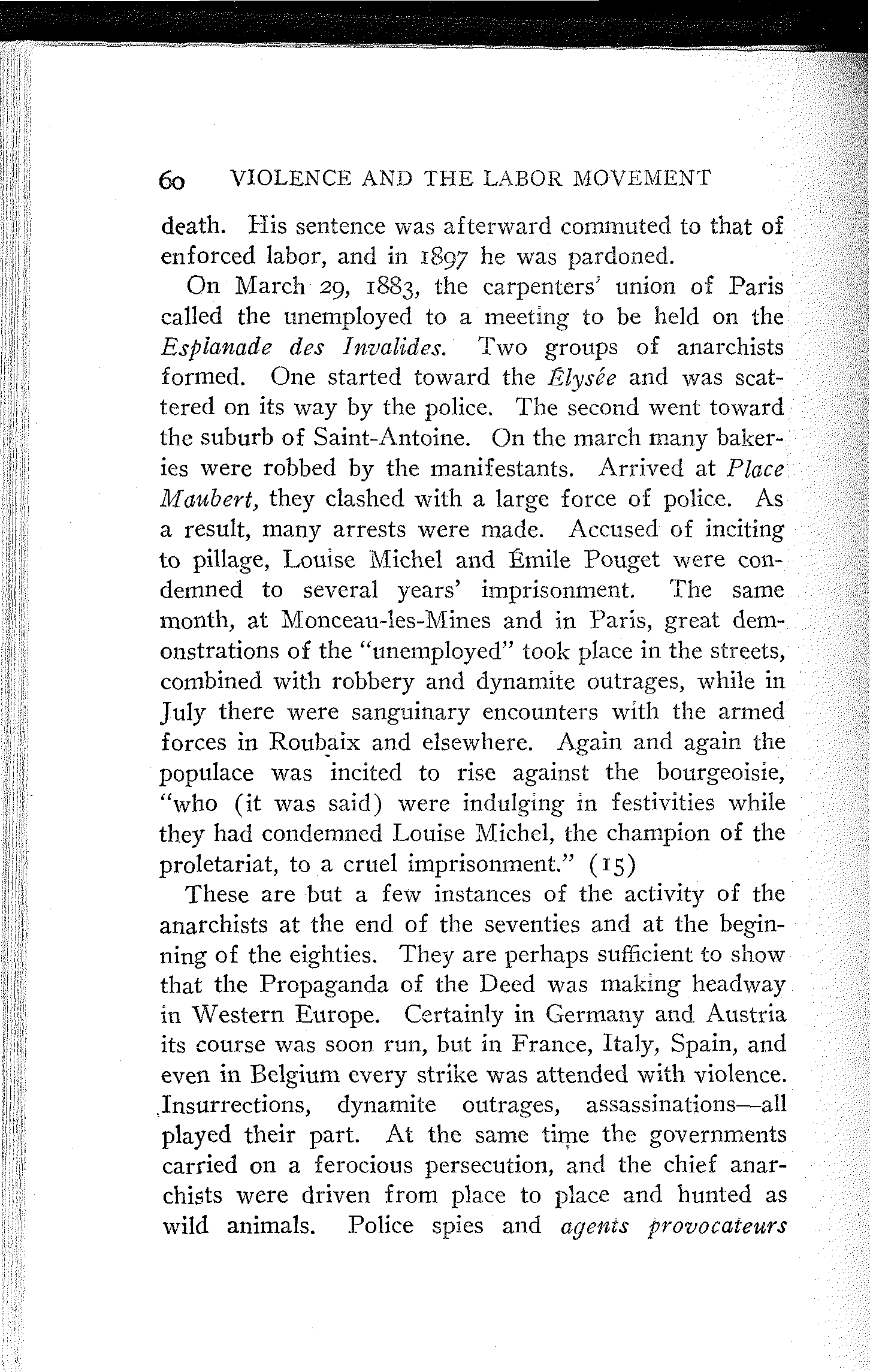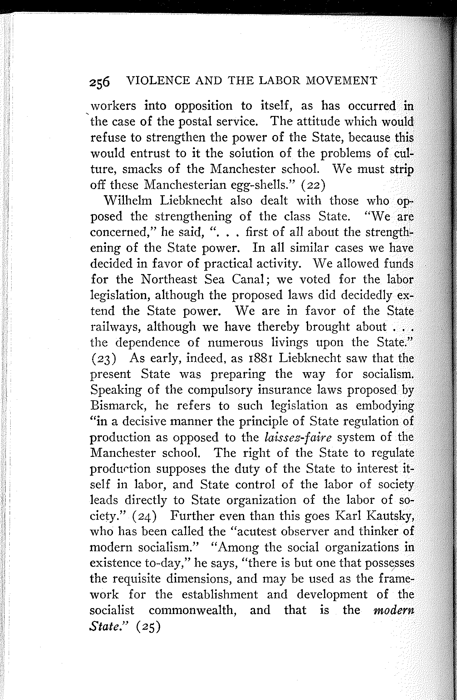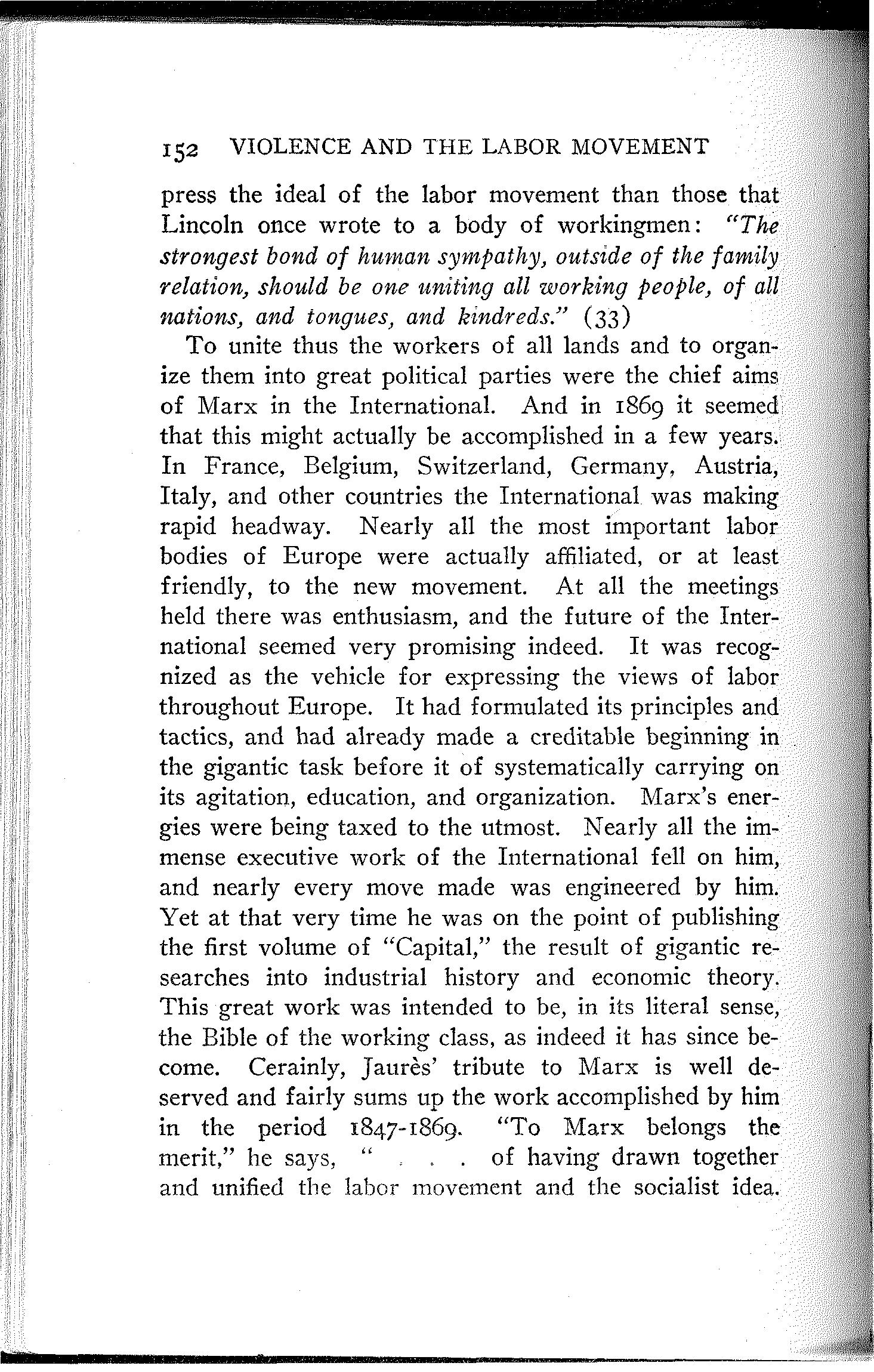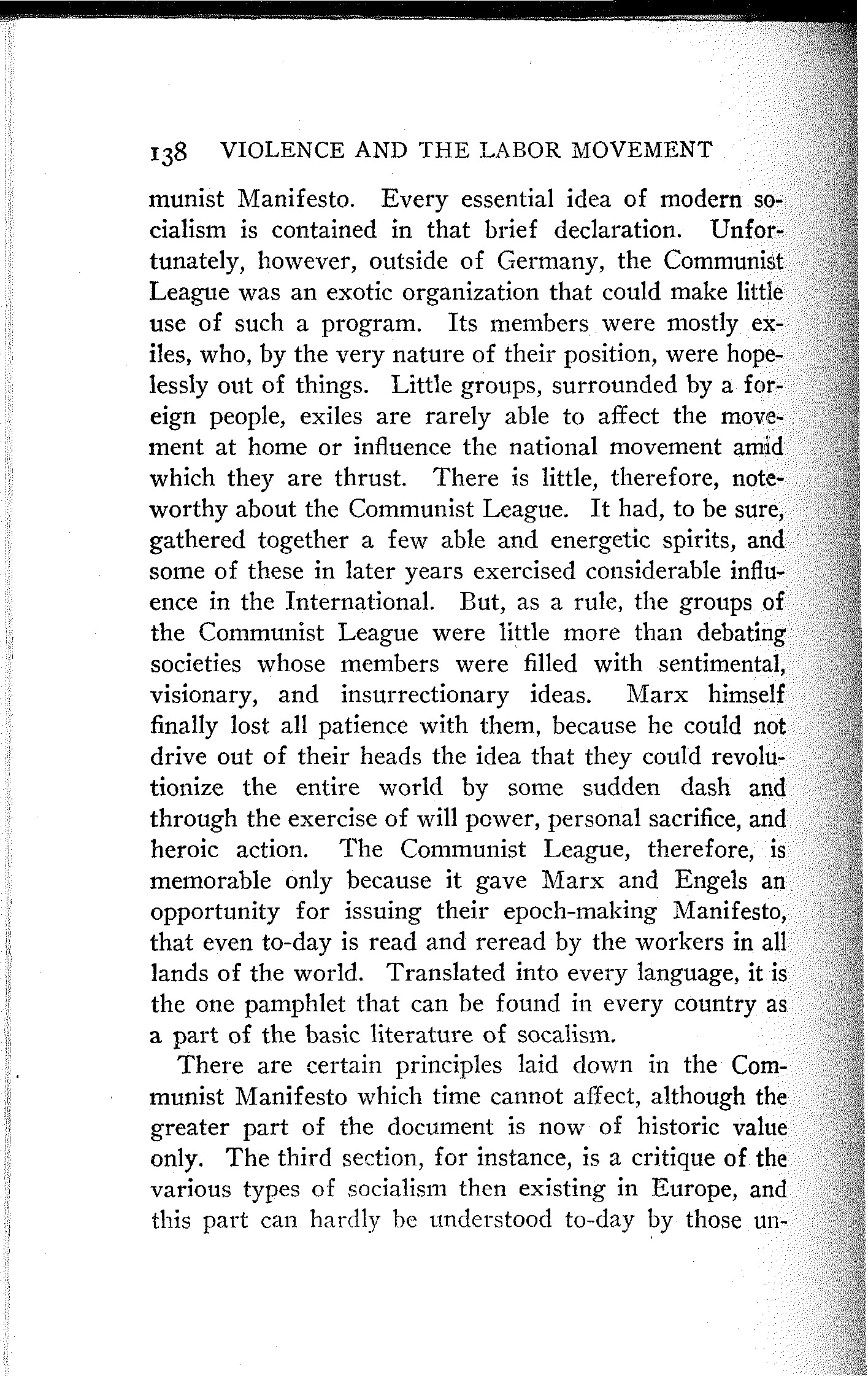 This volume is the result of some studies that I felt impelled to make when, about three years ago, certain sections of the labor movement in the United States were discussing vehemently political action versus direct action. A number of causes combined to produce a serious and critical controversy. The Industrial Workers of the World were carrying on a lively agitation that later culminated in a series of spectacular strikes. With ideas and methods that were not only in opposition to those of the trade unions, but also to those of the socialist party, the new organization sought to displace the older organizations by what it called the "one Big Union." There were many in the older organizations who firmly believed in industrial unionism, and the dissensions which arose were not so much over that question as over the antagonistic character of the new movement and its advocacy here of the violent methods employed by the revolutionary section of the French unions. The most forceful and active spokesman of these methods was Mr. William D. Haywood, and, largely as a result of his agitation, la grève générale and le sabotage became the subjects of the hour in labor and socialist circles. In 1911 Mr. Haywood and Mr. Frank Bohn published a booklet, entitled Industrial Socialism, in which they urged that the worker should "use any weapon which will win his fight."[A] They declared that, as "the present laws of[viii] property are made by and for the capitalists, the workers should not hesitate to break them."[B]