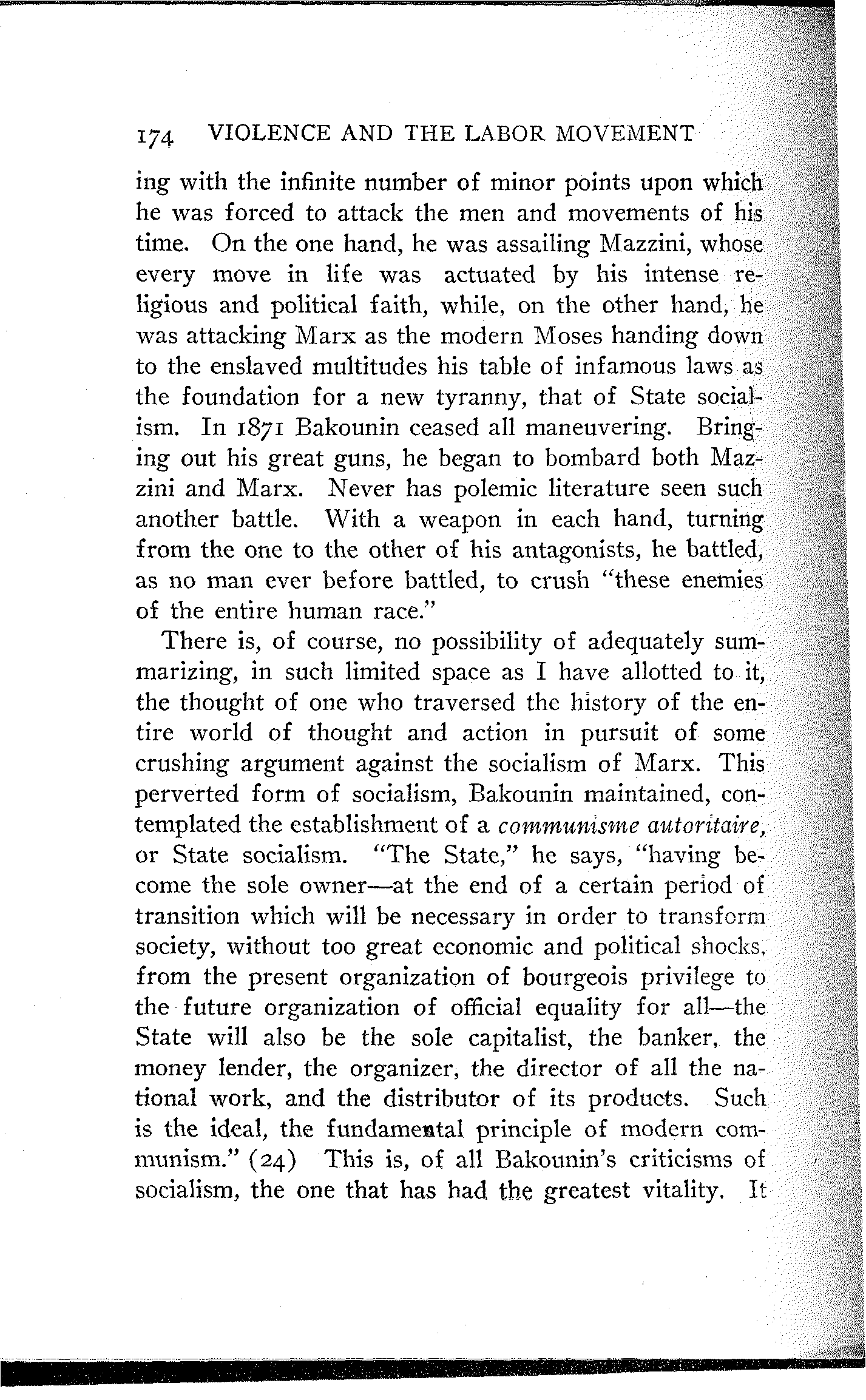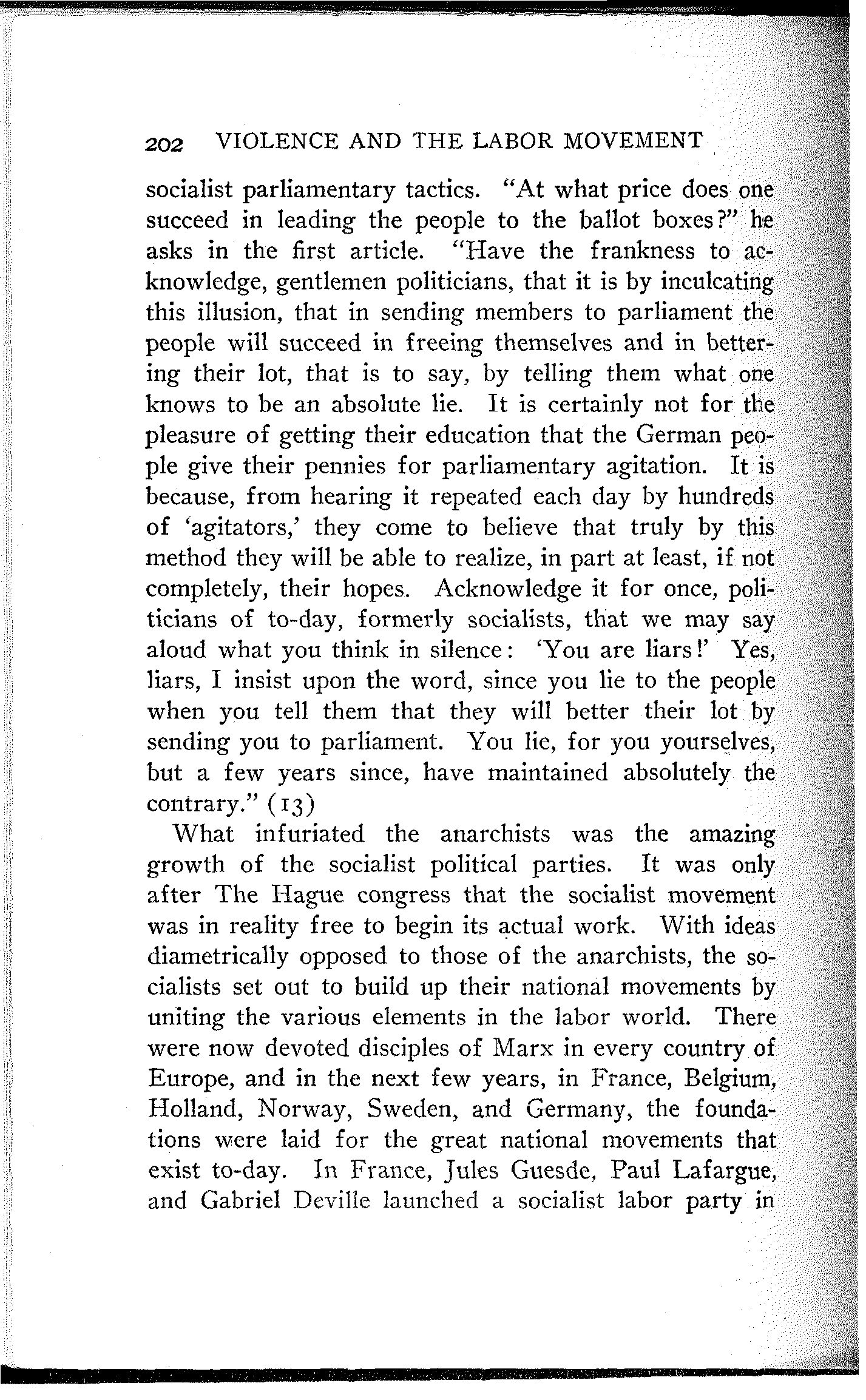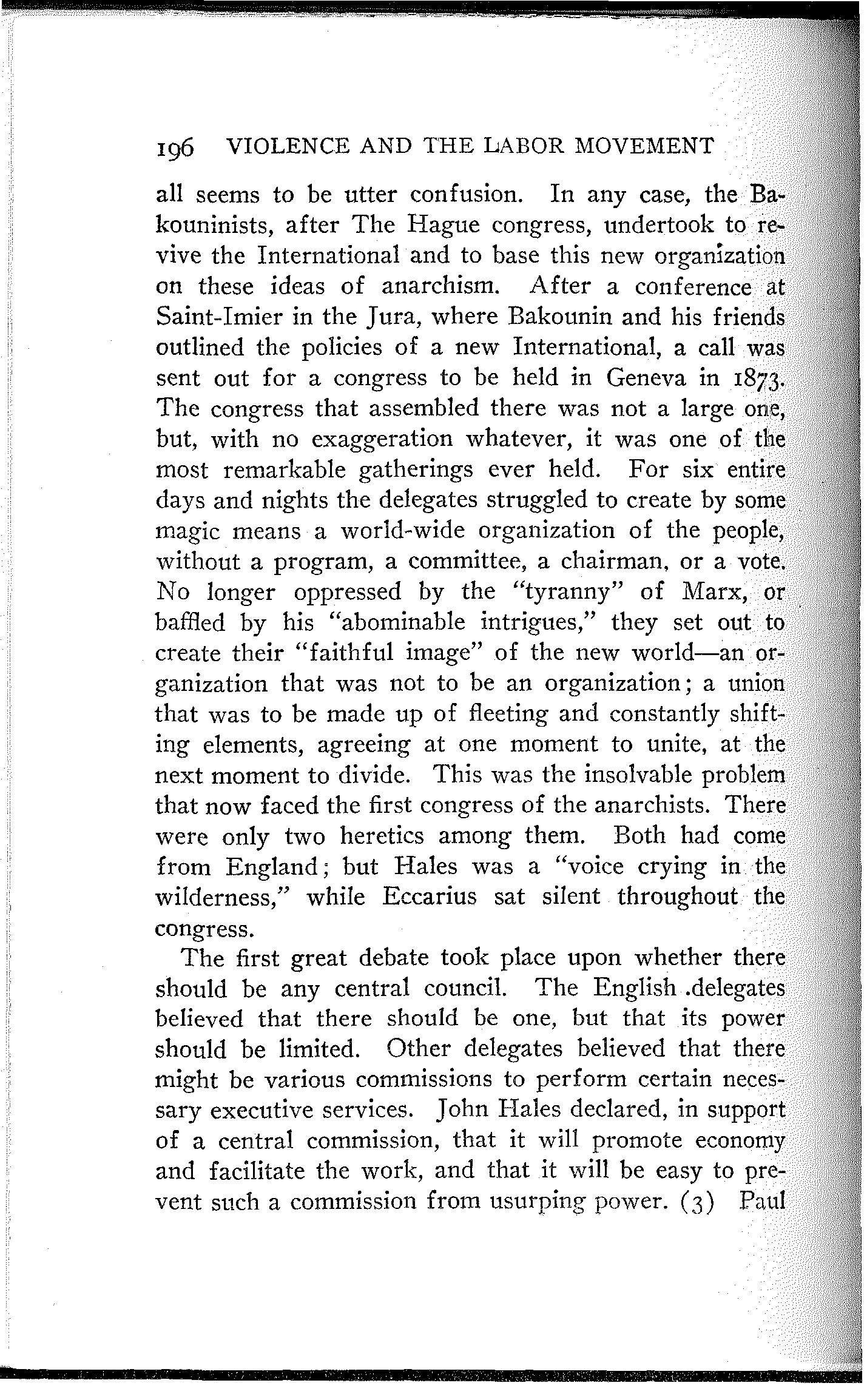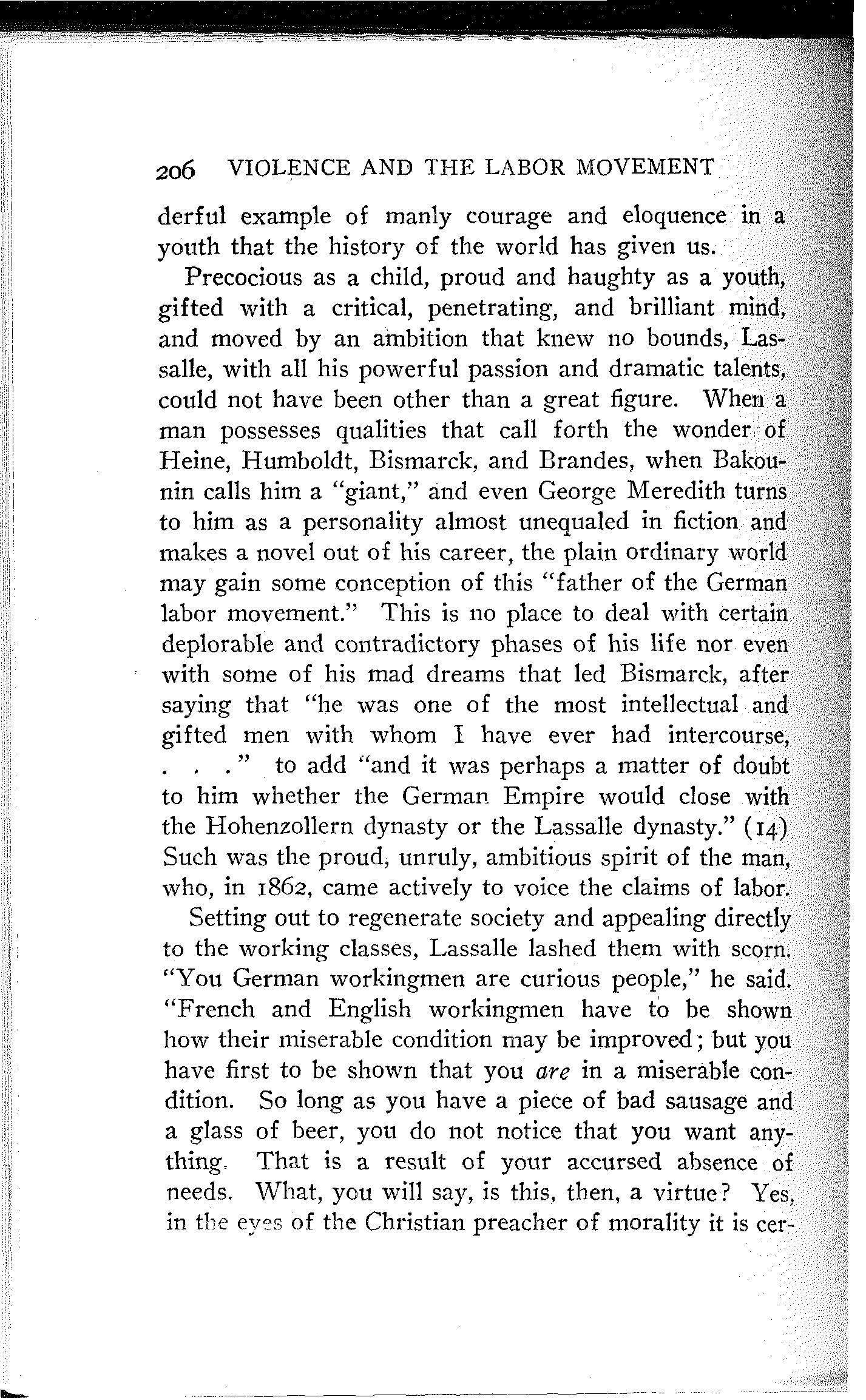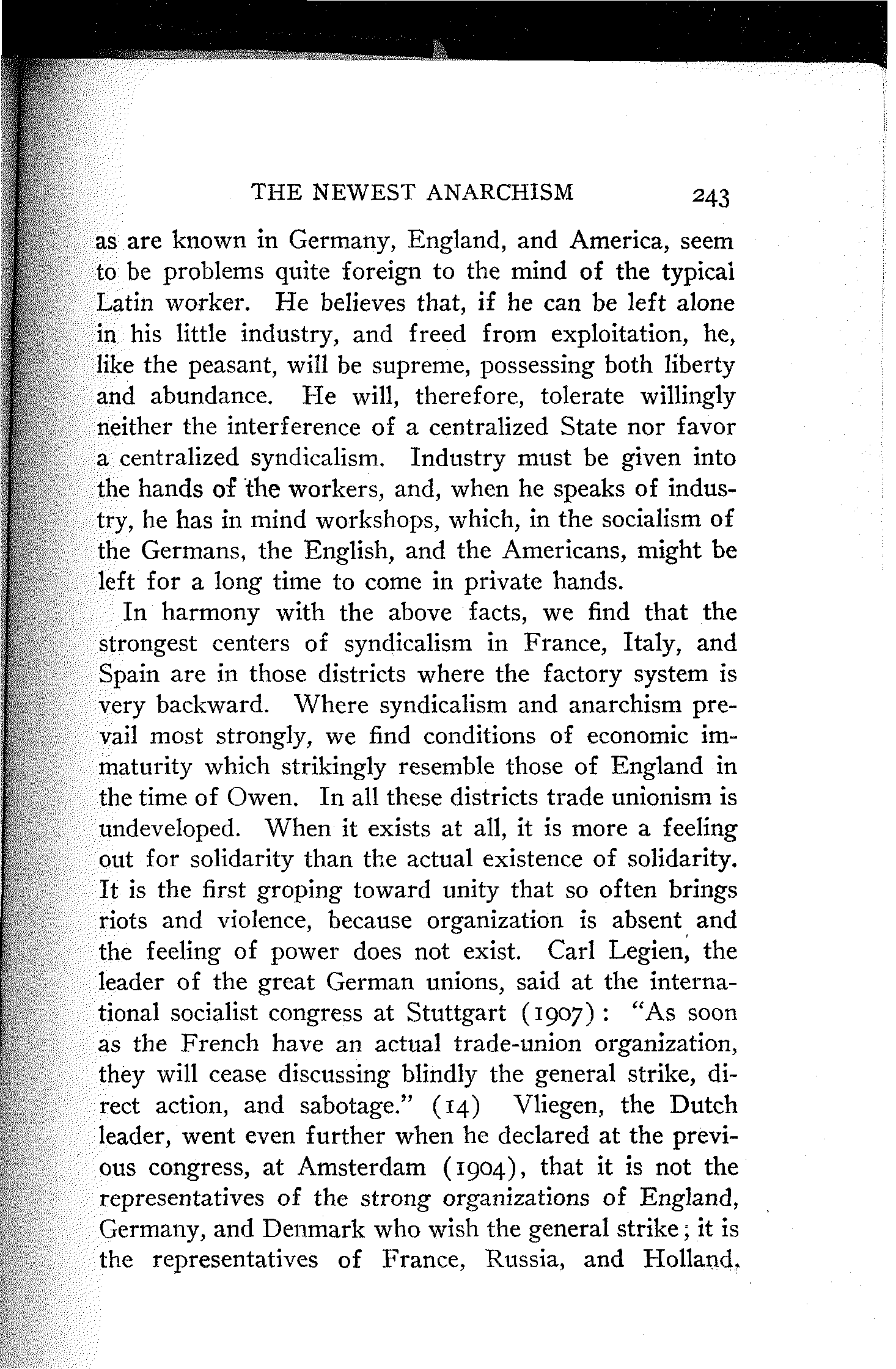 This volume is the result of some studies that I felt impelled to make when, about three years ago, certain sections of the labor movement in the United States were discussing vehemently political action versus direct action. A number of causes combined to produce a serious and critical controversy. The Industrial Workers of the World were carrying on a lively agitation that later culminated in a series of spectacular strikes. With ideas and methods that were not only in opposition to those of the trade unions, but also to those of the socialist party, the new organization sought to displace the older organizations by what it called the "one Big Union." There were many in the older organizations who firmly believed in industrial unionism, and the dissensions which arose were not so much over that question as over the antagonistic character of the new movement and its advocacy here of the violent methods employed by the revolutionary section of the French unions. The most forceful and active spokesman of these methods was Mr. William D. Haywood, and, largely as a result of his agitation, la grève générale and le sabotage became the subjects of the hour in labor and socialist circles. In 1911 Mr. Haywood and Mr. Frank Bohn published a booklet, entitled Industrial Socialism, in which they urged that the worker should "use any weapon which will win his fight."[A] They declared that, as "the present laws of[viii] property are made by and for the capitalists, the workers should not hesitate to break them."[B]