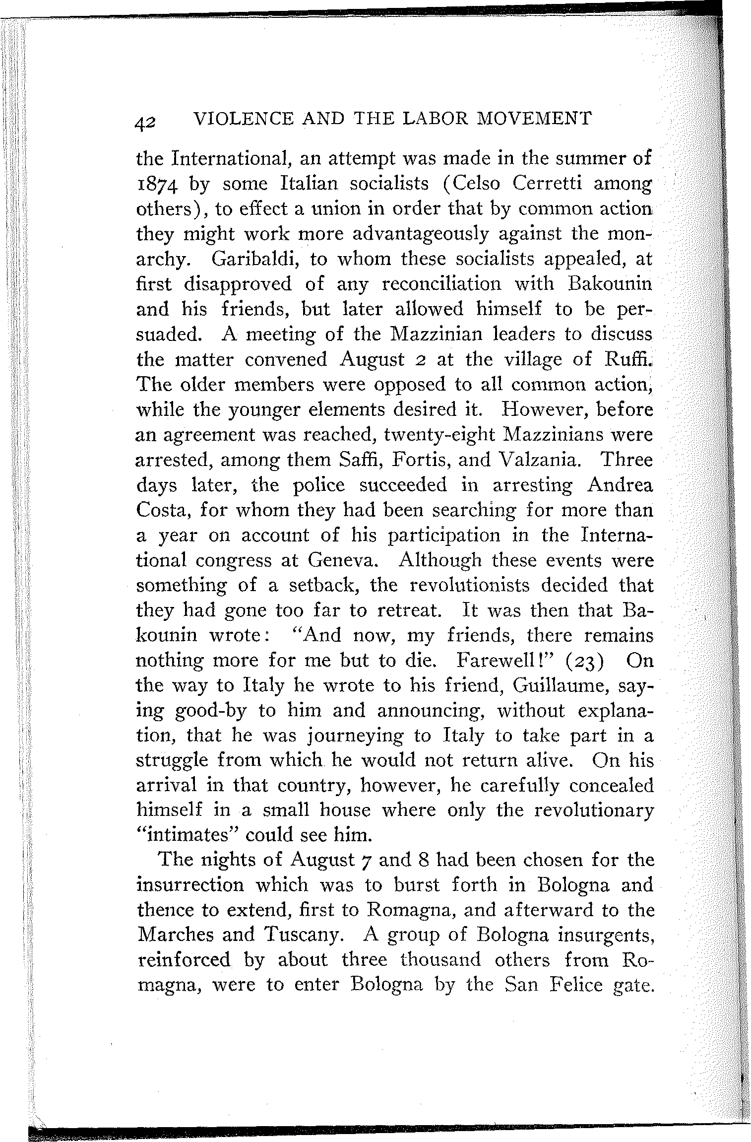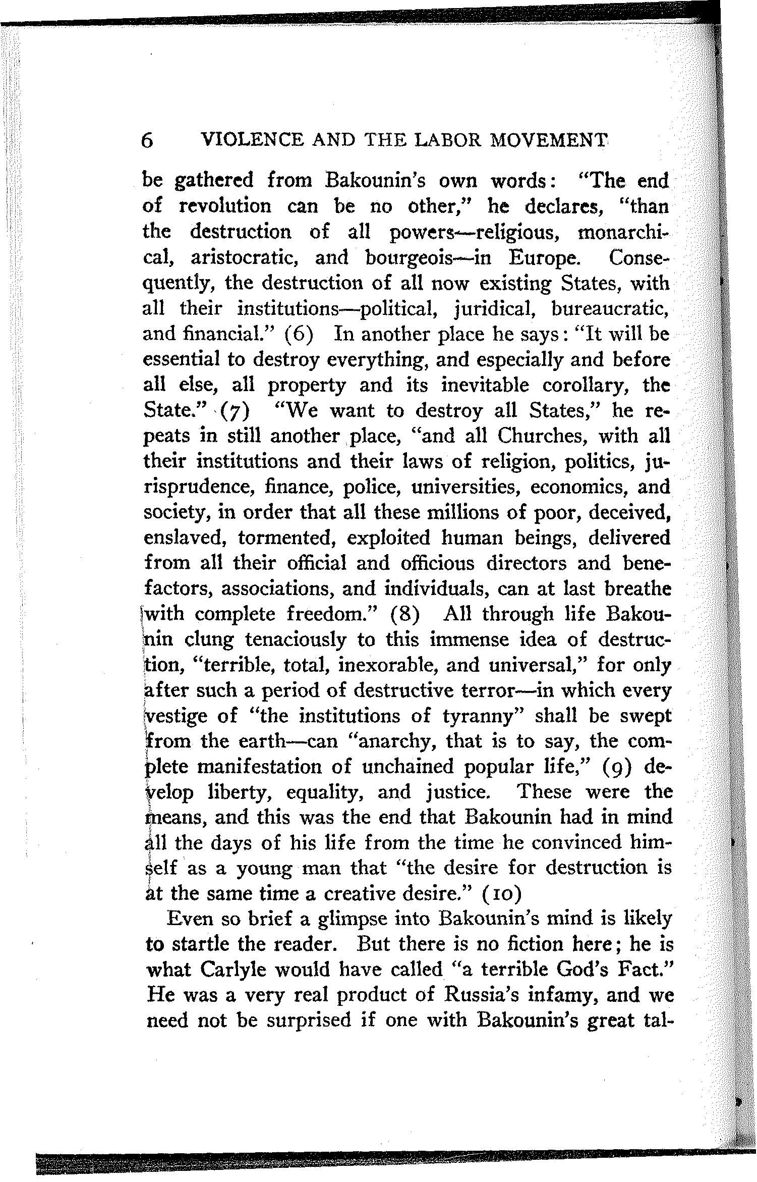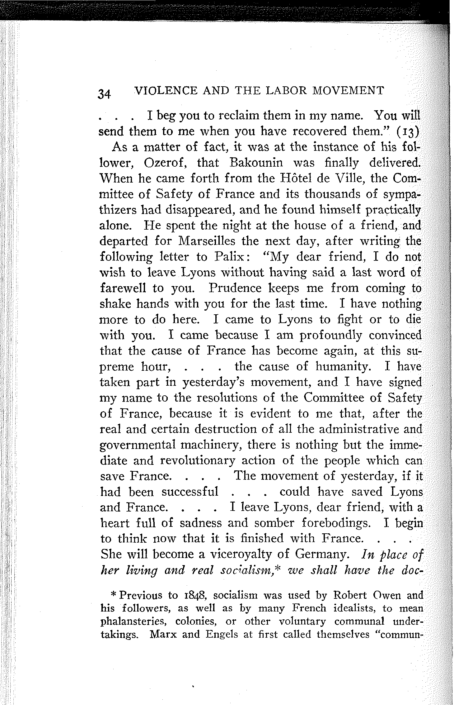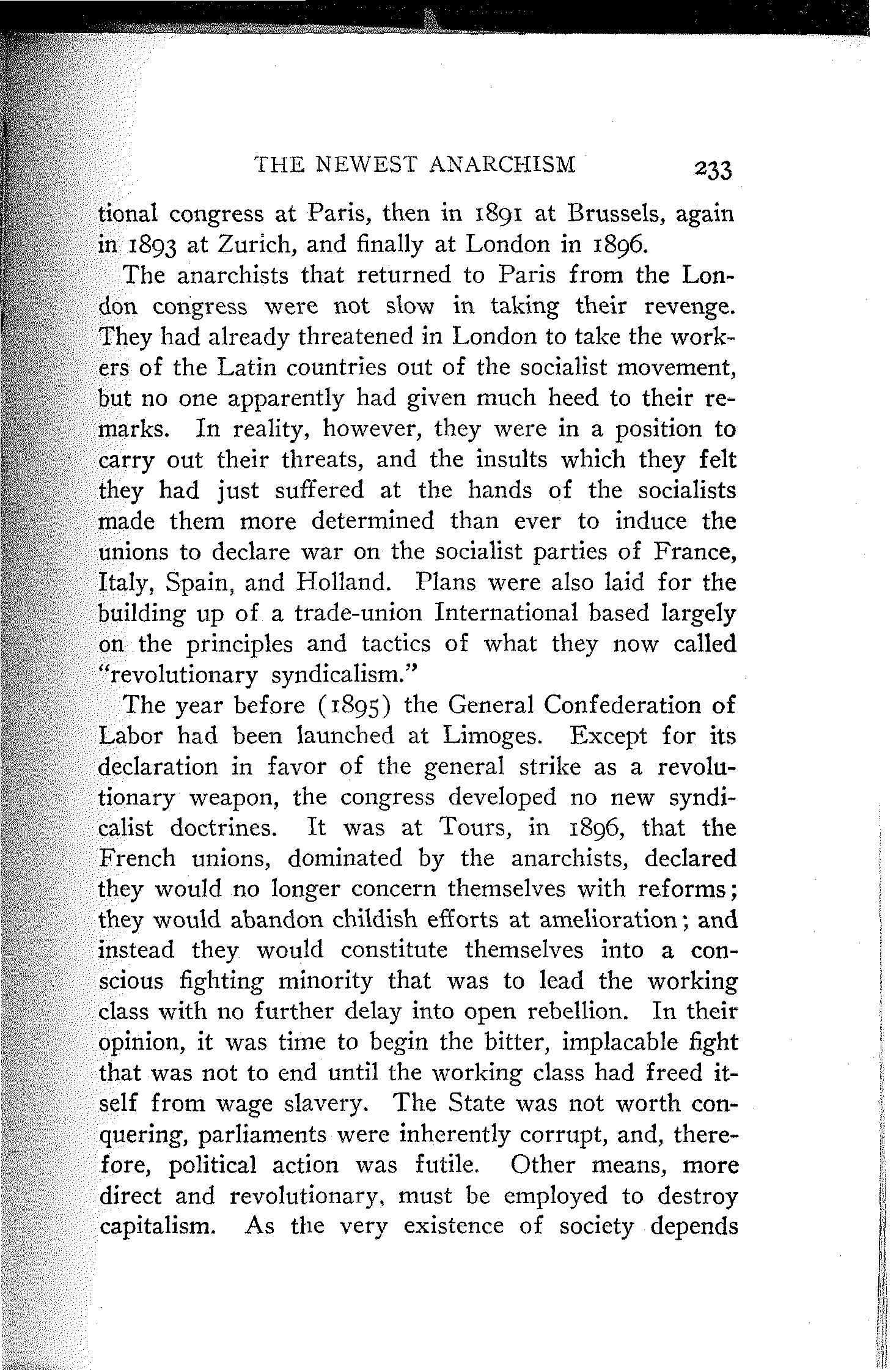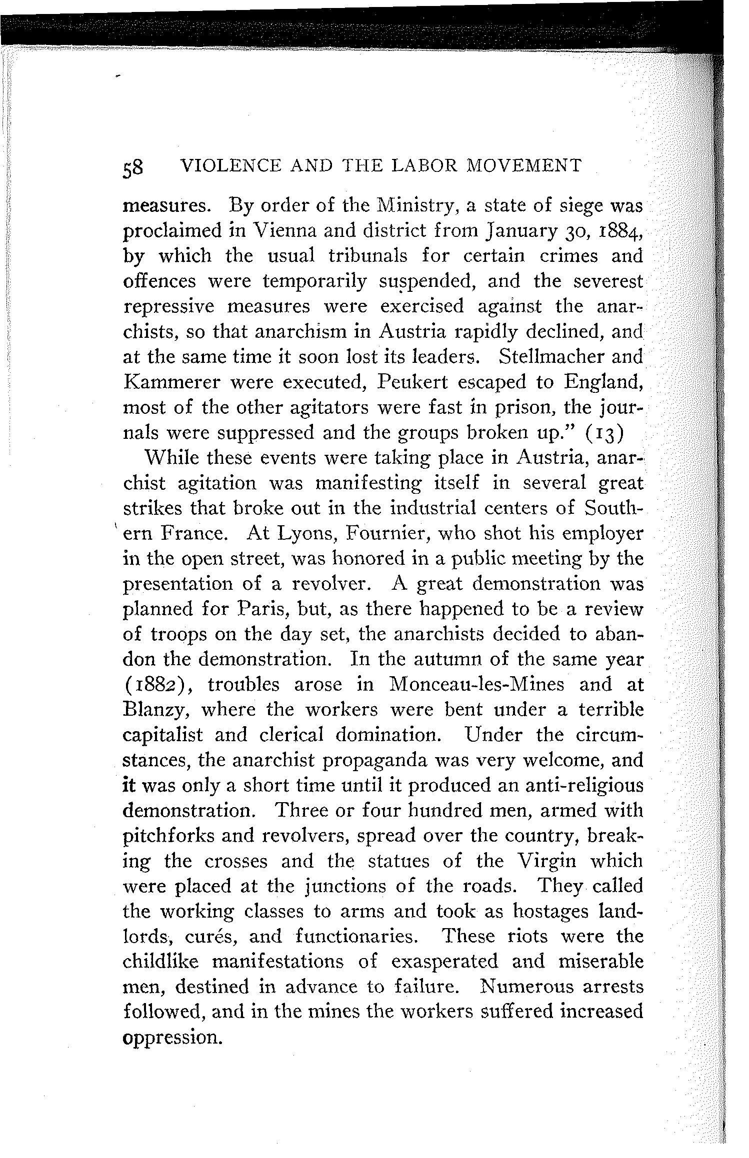 This volume is the result of some studies that I felt impelled to make when, about three years ago, certain sections of the labor movement in the United States were discussing vehemently political action versus direct action. A number of causes combined to produce a serious and critical controversy. The Industrial Workers of the World were carrying on a lively agitation that later culminated in a series of spectacular strikes. With ideas and methods that were not only in opposition to those of the trade unions, but also to those of the socialist party, the new organization sought to displace the older organizations by what it called the "one Big Union." There were many in the older organizations who firmly believed in industrial unionism, and the dissensions which arose were not so much over that question as over the antagonistic character of the new movement and its advocacy here of the violent methods employed by the revolutionary section of the French unions. The most forceful and active spokesman of these methods was Mr. William D. Haywood, and, largely as a result of his agitation, la grève générale and le sabotage became the subjects of the hour in labor and socialist circles. In 1911 Mr. Haywood and Mr. Frank Bohn published a booklet, entitled Industrial Socialism, in which they urged that the worker should "use any weapon which will win his fight."[A] They declared that, as "the present laws of[viii] property are made by and for the capitalists, the workers should not hesitate to break them."[B]