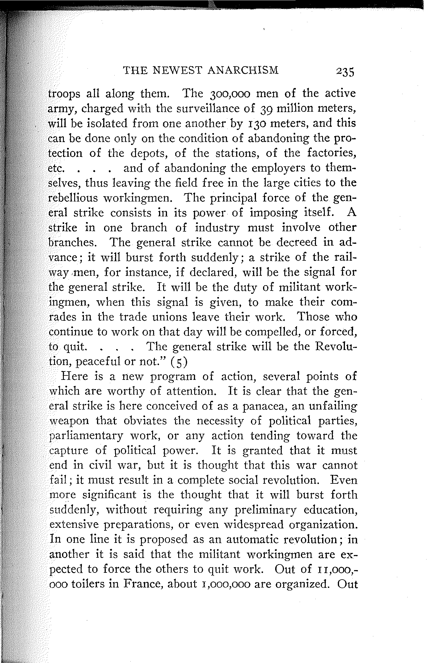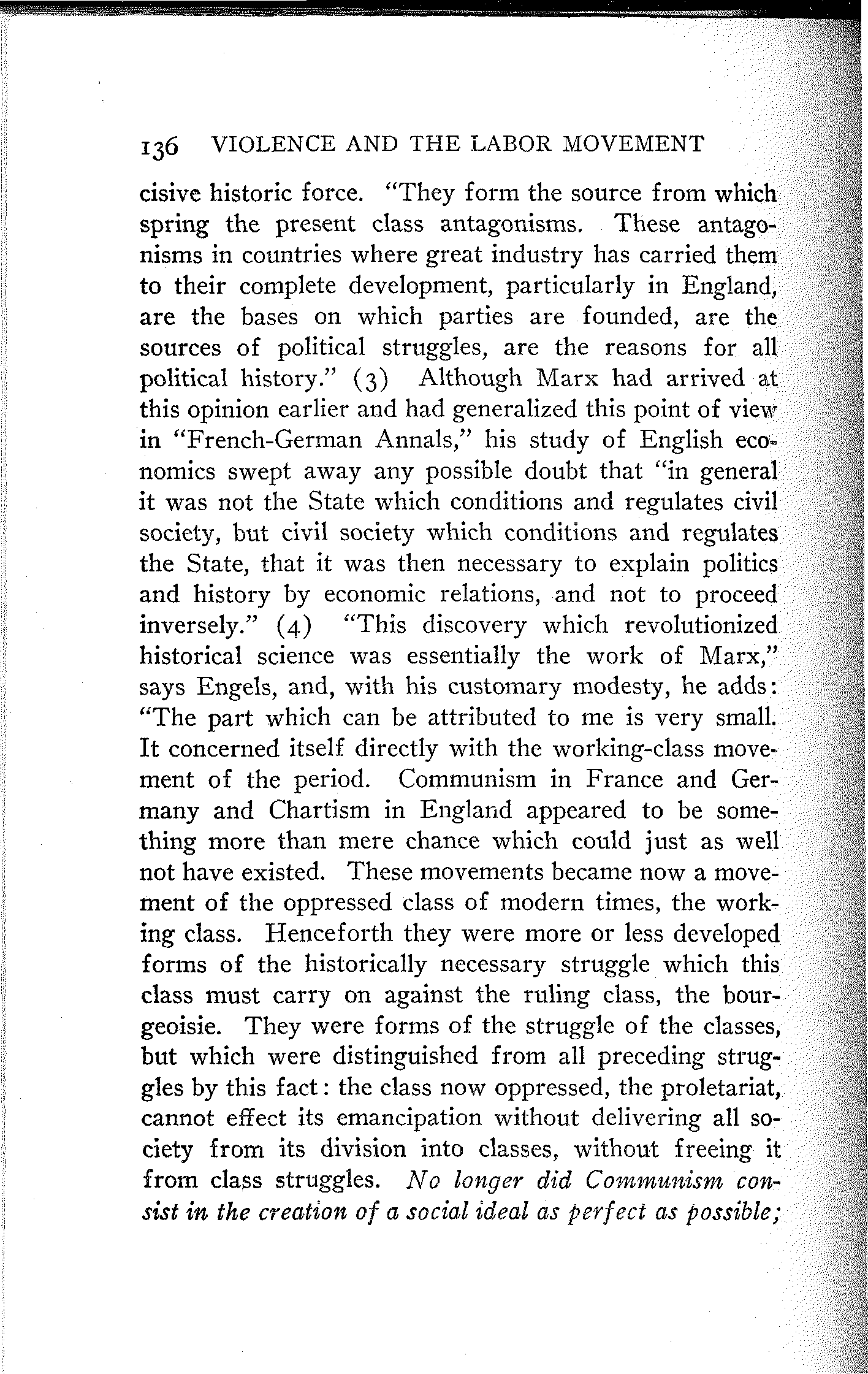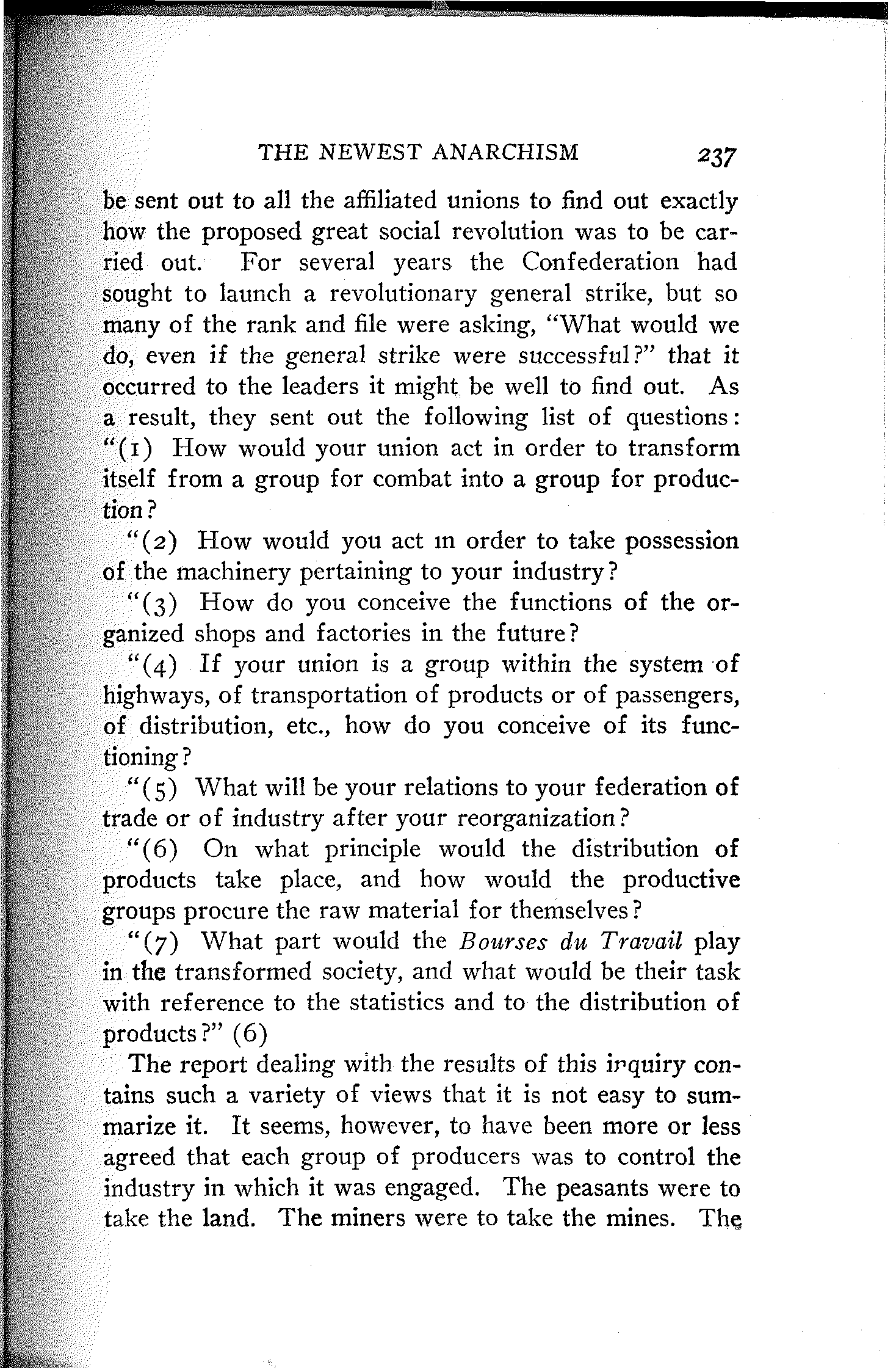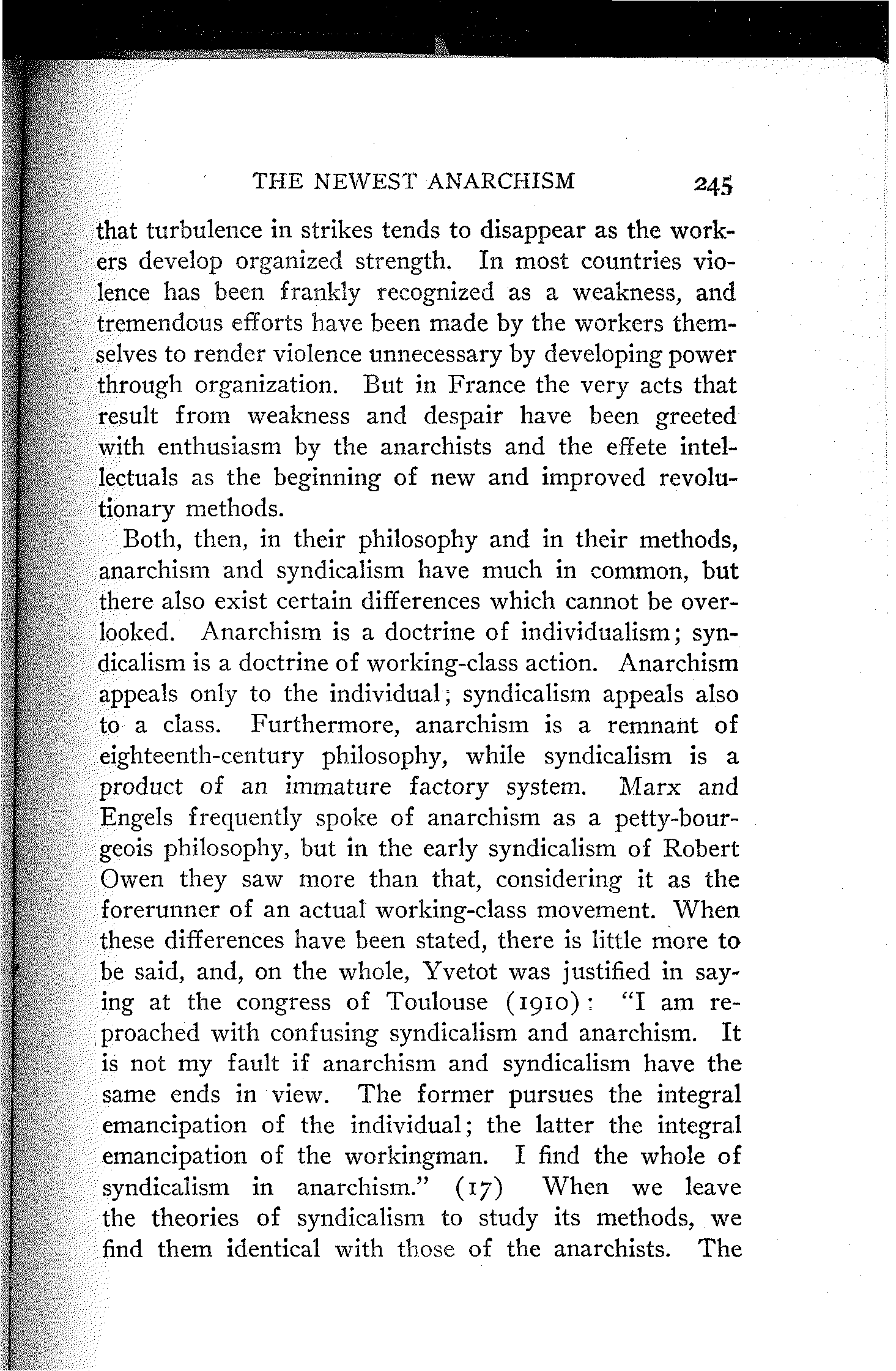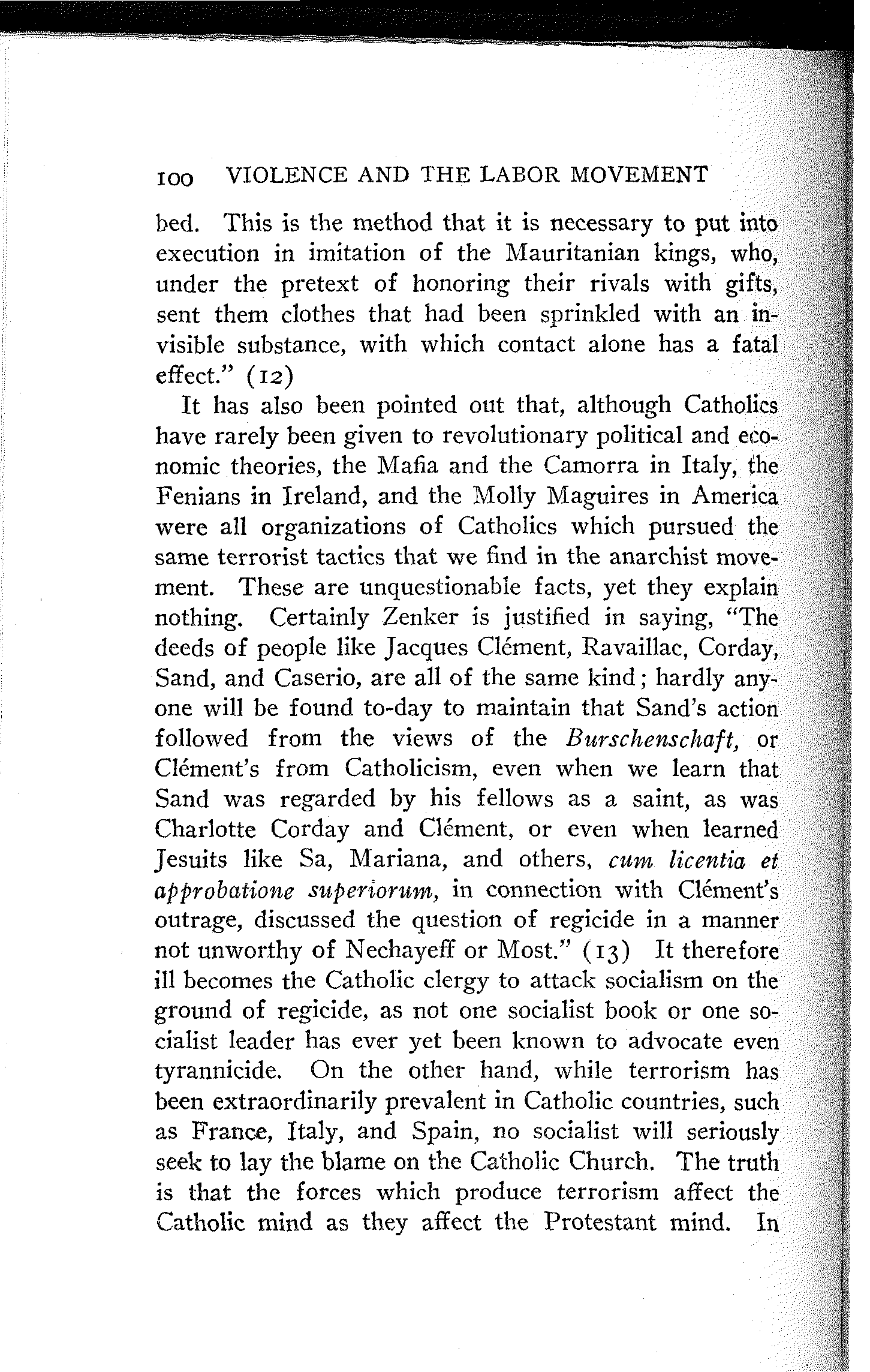 This volume is the result of some studies that I felt impelled to make when, about three years ago, certain sections of the labor movement in the United States were discussing vehemently political action versus direct action. A number of causes combined to produce a serious and critical controversy. The Industrial Workers of the World were carrying on a lively agitation that later culminated in a series of spectacular strikes. With ideas and methods that were not only in opposition to those of the trade unions, but also to those of the socialist party, the new organization sought to displace the older organizations by what it called the "one Big Union." There were many in the older organizations who firmly believed in industrial unionism, and the dissensions which arose were not so much over that question as over the antagonistic character of the new movement and its advocacy here of the violent methods employed by the revolutionary section of the French unions. The most forceful and active spokesman of these methods was Mr. William D. Haywood, and, largely as a result of his agitation, la grève générale and le sabotage became the subjects of the hour in labor and socialist circles. In 1911 Mr. Haywood and Mr. Frank Bohn published a booklet, entitled Industrial Socialism, in which they urged that the worker should "use any weapon which will win his fight."[A] They declared that, as "the present laws of[viii] property are made by and for the capitalists, the workers should not hesitate to break them."[B]