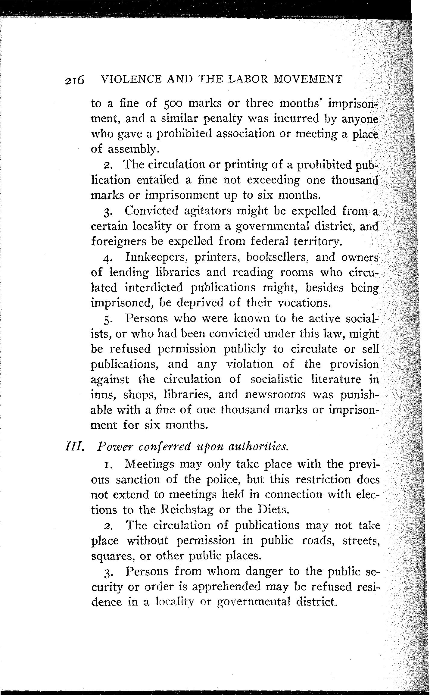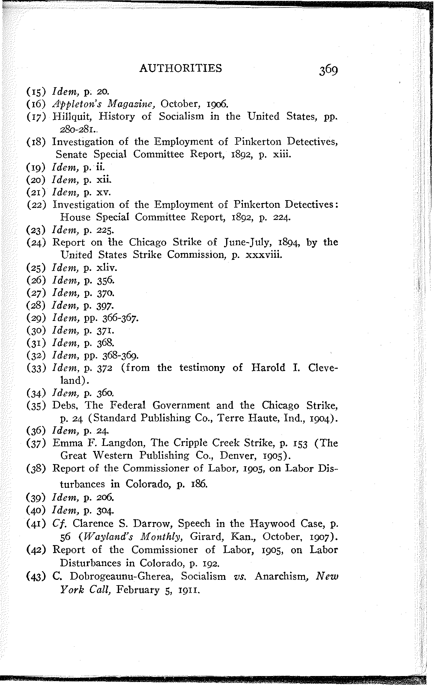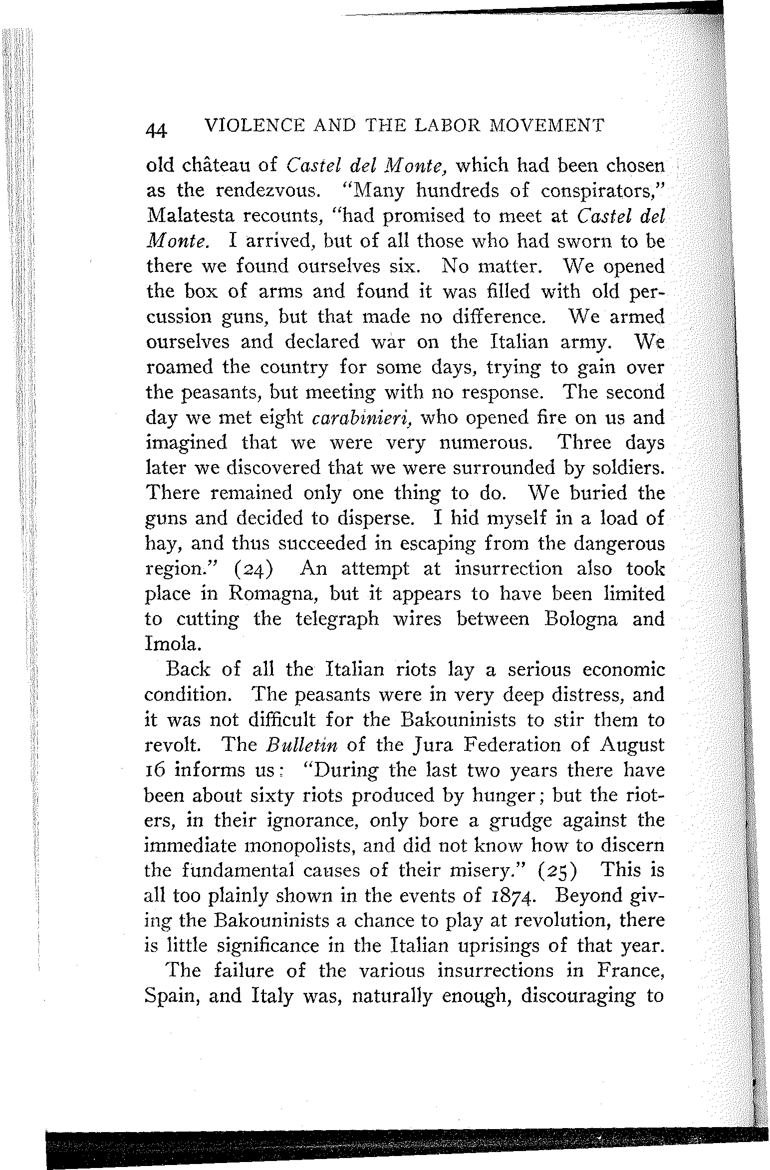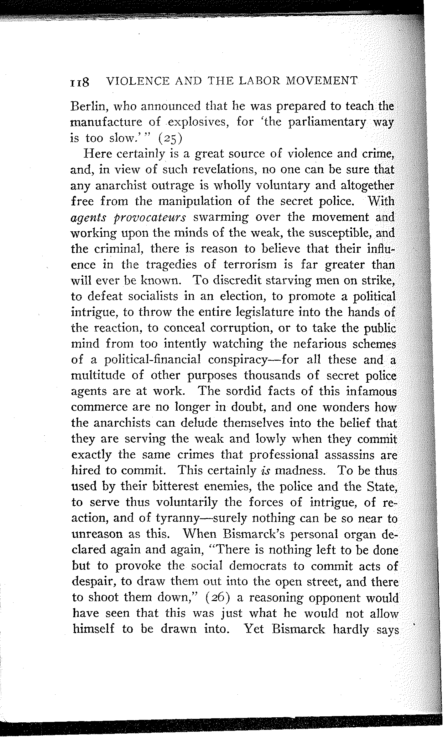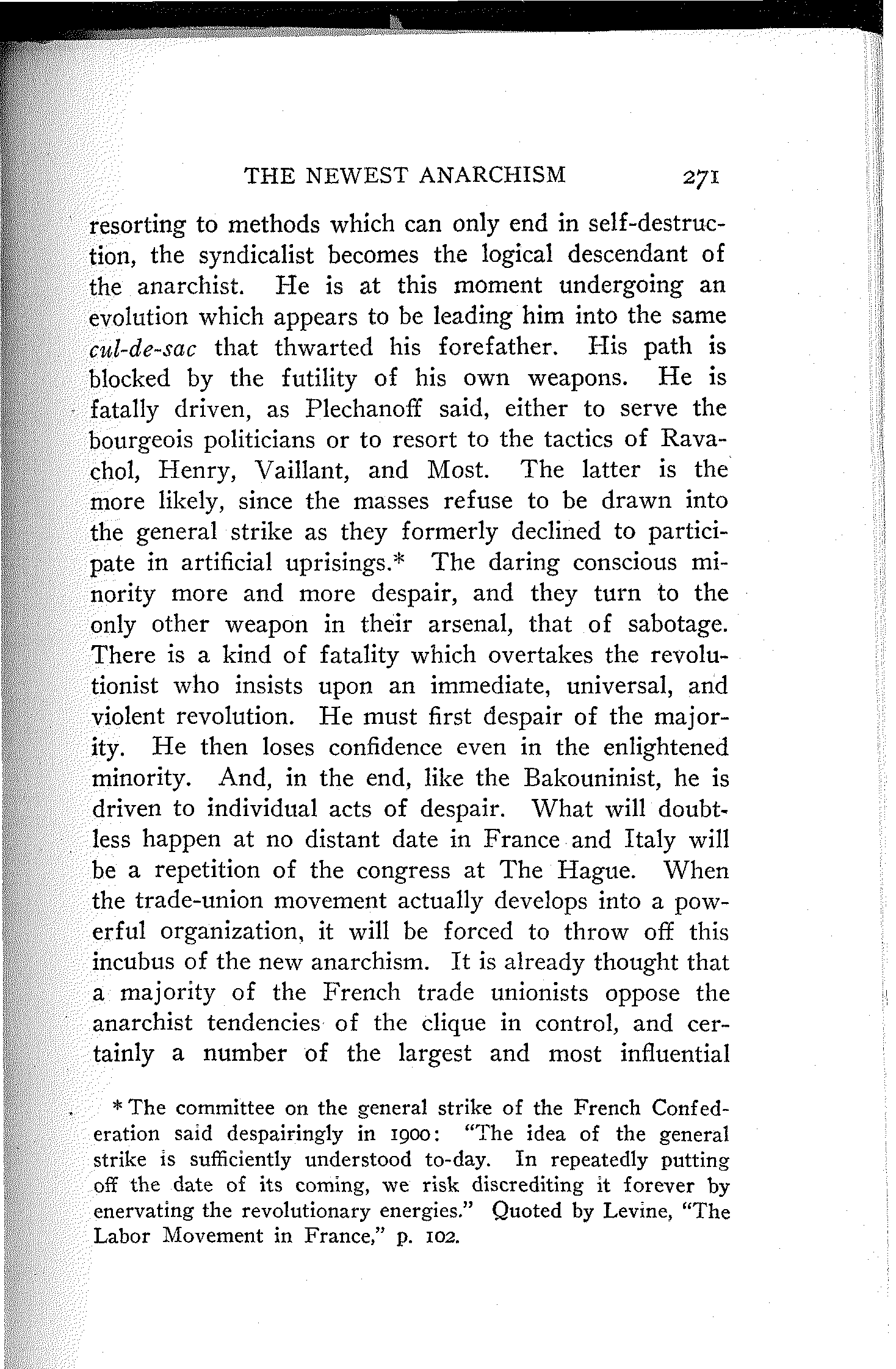 This volume is the result of some studies that I felt impelled to make when, about three years ago, certain sections of the labor movement in the United States were discussing vehemently political action versus direct action. A number of causes combined to produce a serious and critical controversy. The Industrial Workers of the World were carrying on a lively agitation that later culminated in a series of spectacular strikes. With ideas and methods that were not only in opposition to those of the trade unions, but also to those of the socialist party, the new organization sought to displace the older organizations by what it called the "one Big Union." There were many in the older organizations who firmly believed in industrial unionism, and the dissensions which arose were not so much over that question as over the antagonistic character of the new movement and its advocacy here of the violent methods employed by the revolutionary section of the French unions. The most forceful and active spokesman of these methods was Mr. William D. Haywood, and, largely as a result of his agitation, la grève générale and le sabotage became the subjects of the hour in labor and socialist circles. In 1911 Mr. Haywood and Mr. Frank Bohn published a booklet, entitled Industrial Socialism, in which they urged that the worker should "use any weapon which will win his fight."[A] They declared that, as "the present laws of[viii] property are made by and for the capitalists, the workers should not hesitate to break them."[B]