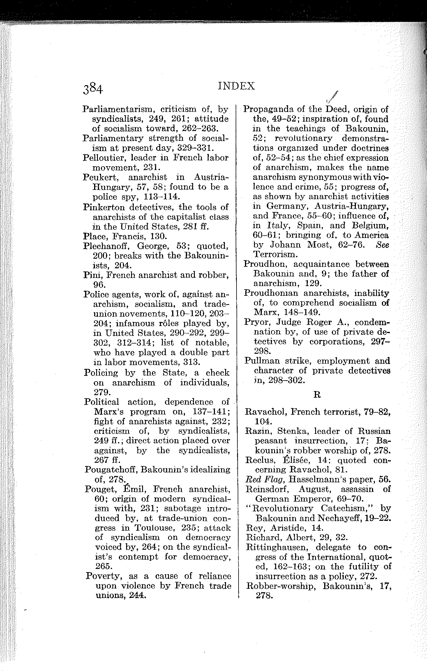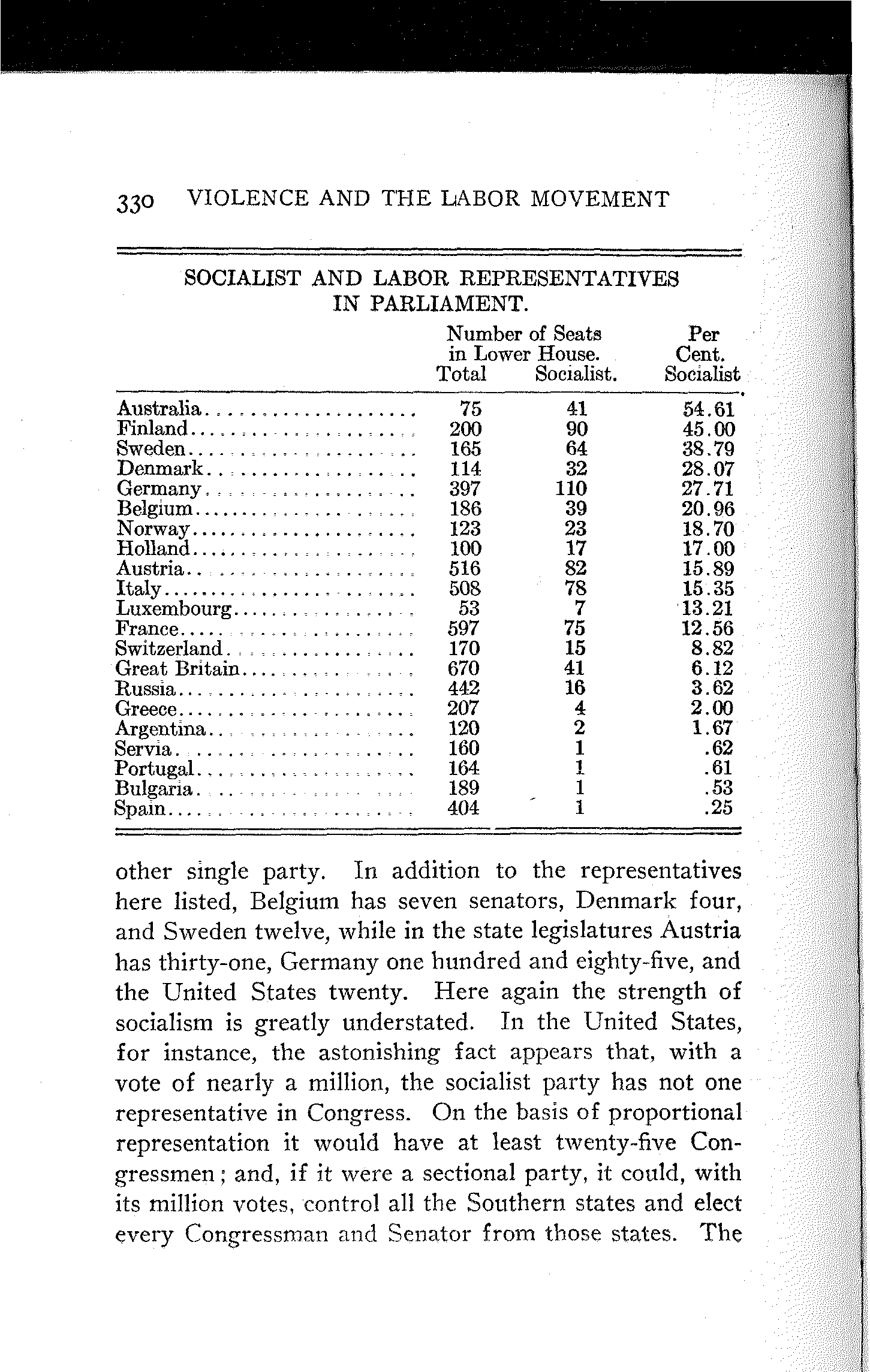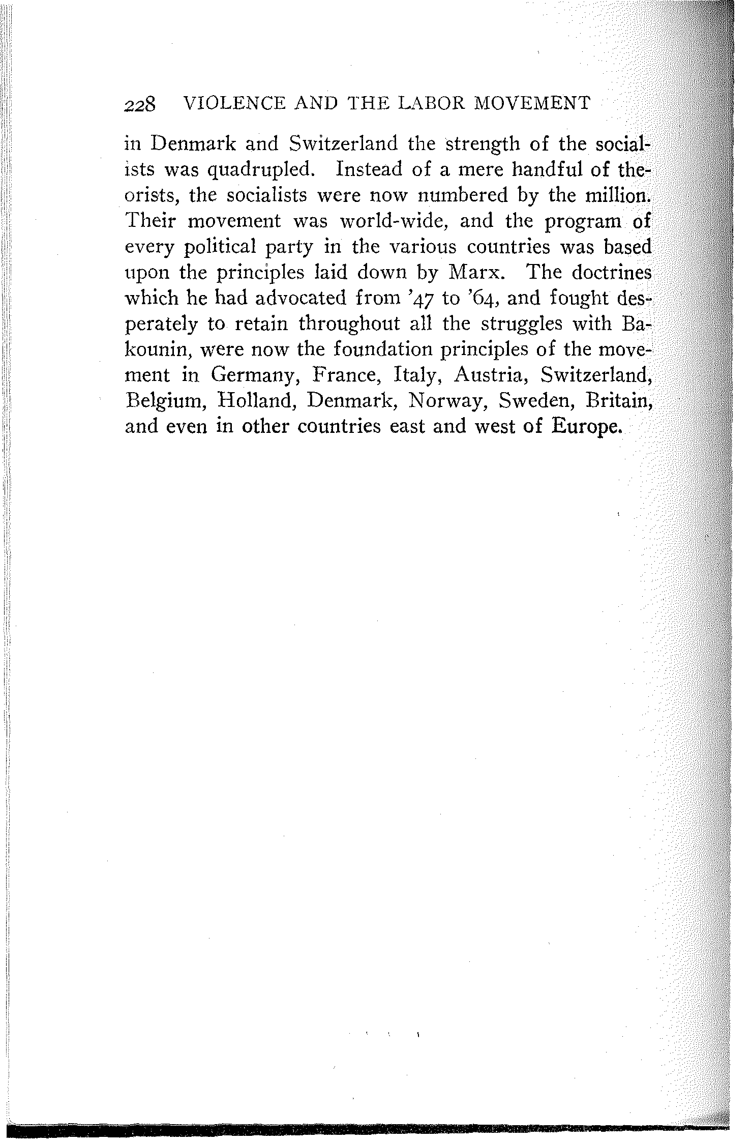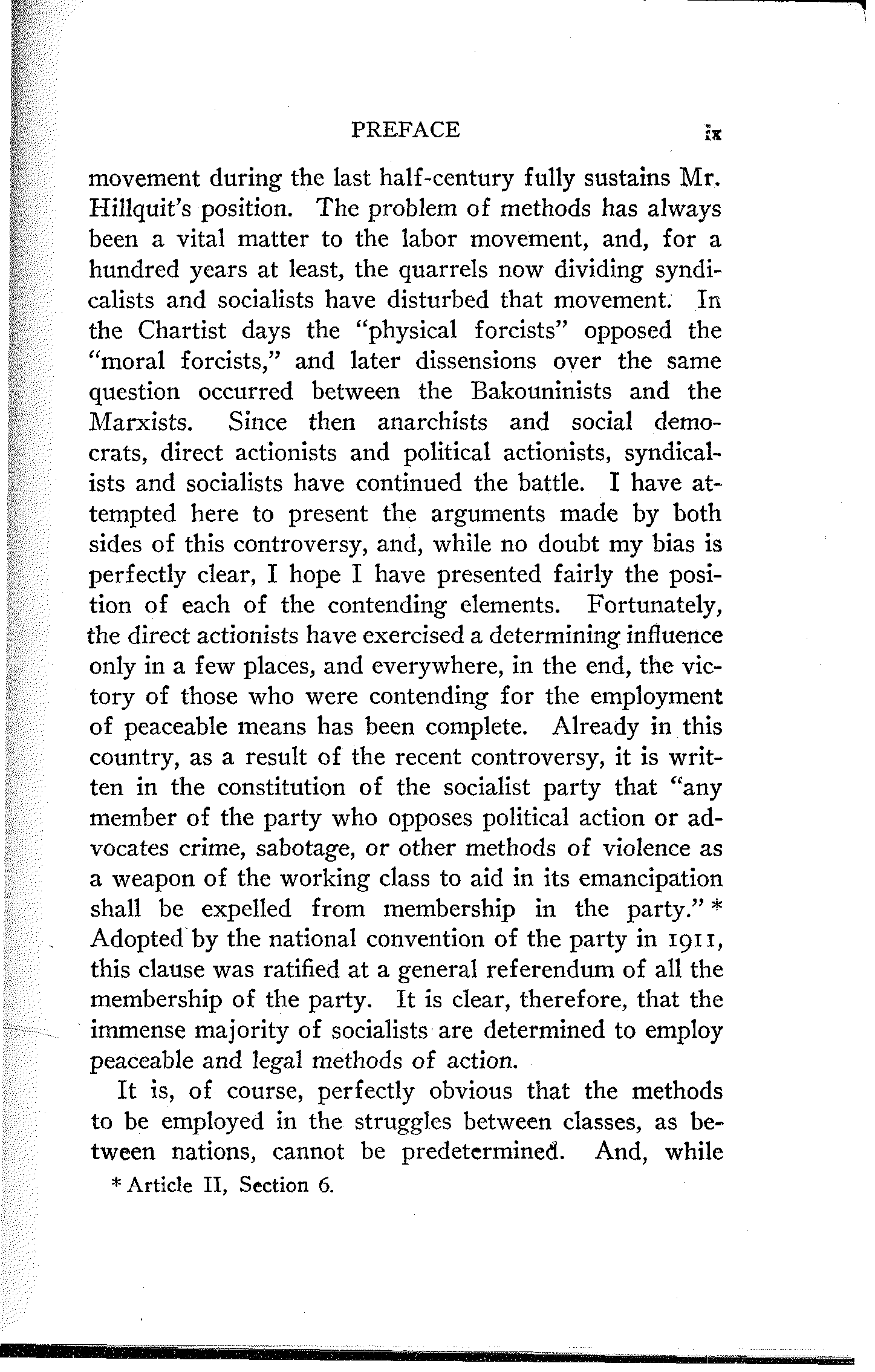 There could be no better introduction to the present volume than these words of Mr. Hillquit, and it will, I think, be clear to the reader that the history of the labor[ix] movement during the last half-century fully sustains Mr. Hillquit's position. The problem of methods has always been a vital matter to the labor movement, and, for a hundred years at least, the quarrels now dividing syndicalists and socialists have disturbed that movement. In the Chartist days the "physical forcists" opposed the "moral forcists," and later dissensions over the same question occurred between the Bakouninists and the Marxists. Since then anarchists and social democrats, direct actionists and political actionists, syndicalists and socialists have continued the battle. I have attempted here to present the arguments made by both sides of this controversy, and, while no doubt my bias is perfectly clear, I hope I have presented fairly the position of each of the contending elements. Fortunately, the direct actionists have exercised a determining influence only in a few places, and everywhere, in the end, the victory of those who were contending for the employment of peaceable means has been complete. Already in this country, as a result of the recent controversy, it is written in the constitution of the socialist party that "any member of the party who opposes political action or advocates crime, sabotage, or other methods of violence as a weapon of the working class to aid in its emancipation shall be expelled from membership in the party."[D] Adopted by the national convention of the party in 1911, this clause was ratified at a general referendum of all the membership of the party. It is clear, therefore, that the immense majority of socialists are determined to employ peaceable and legal methods of action.