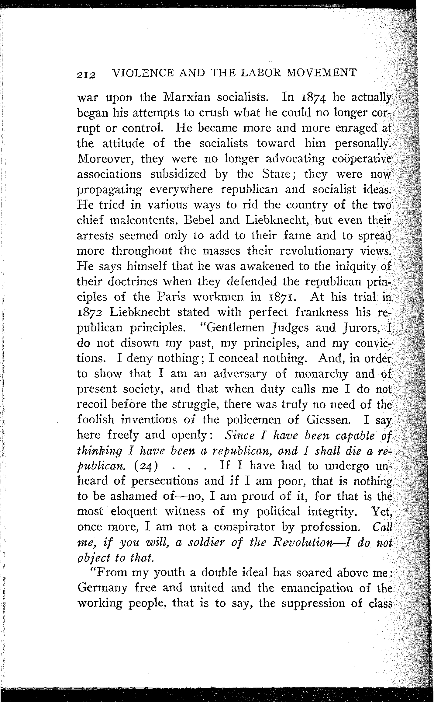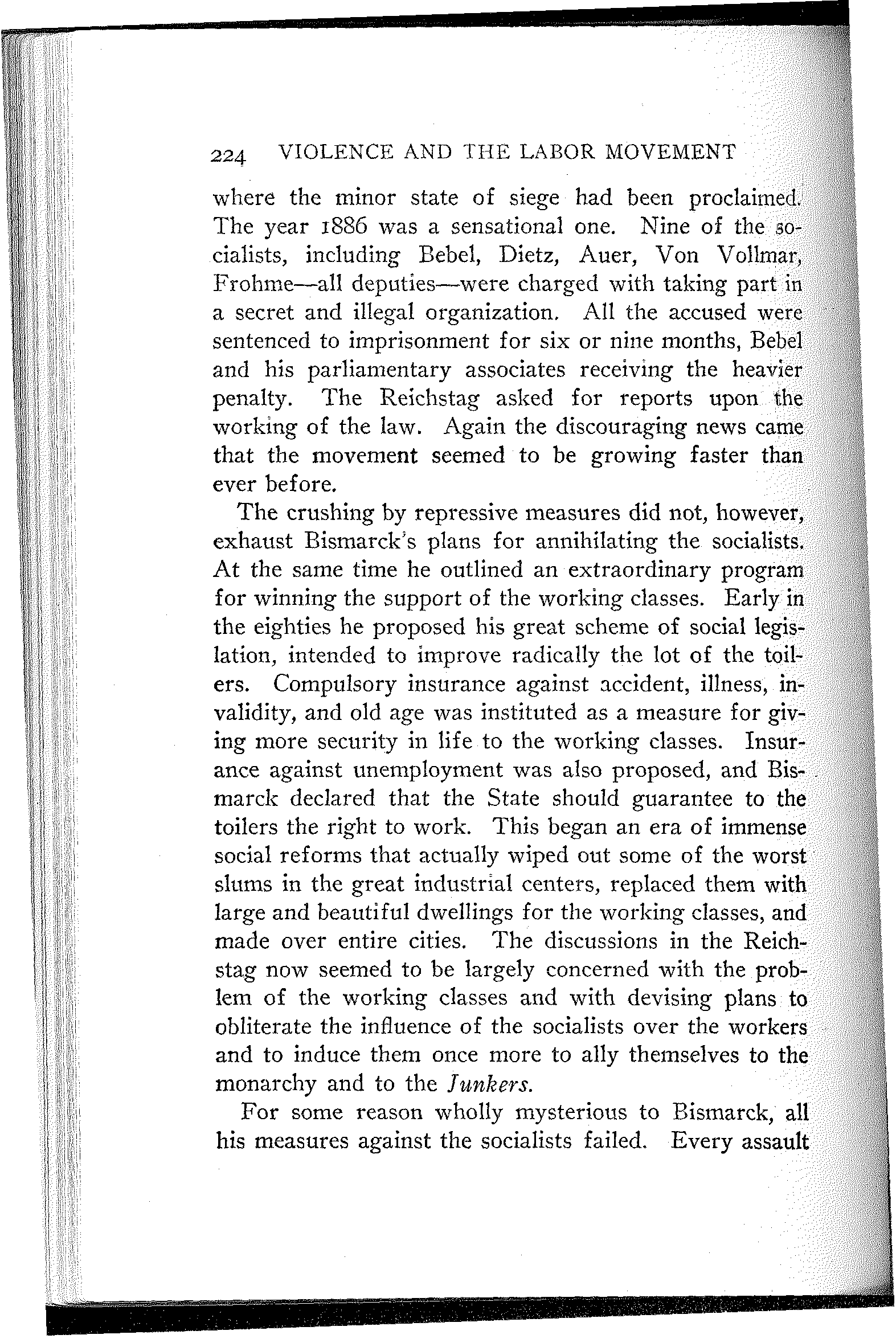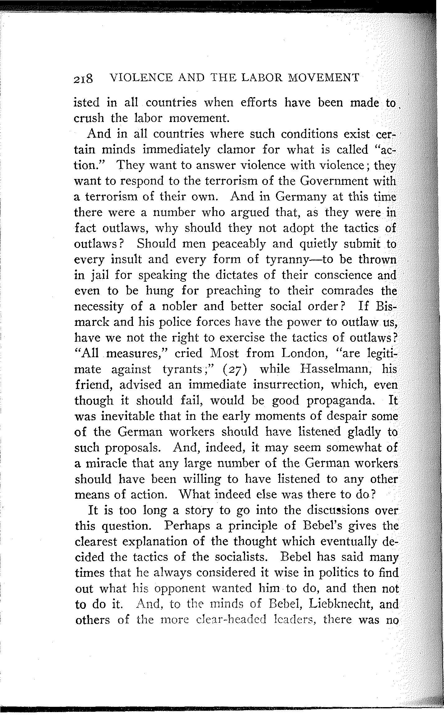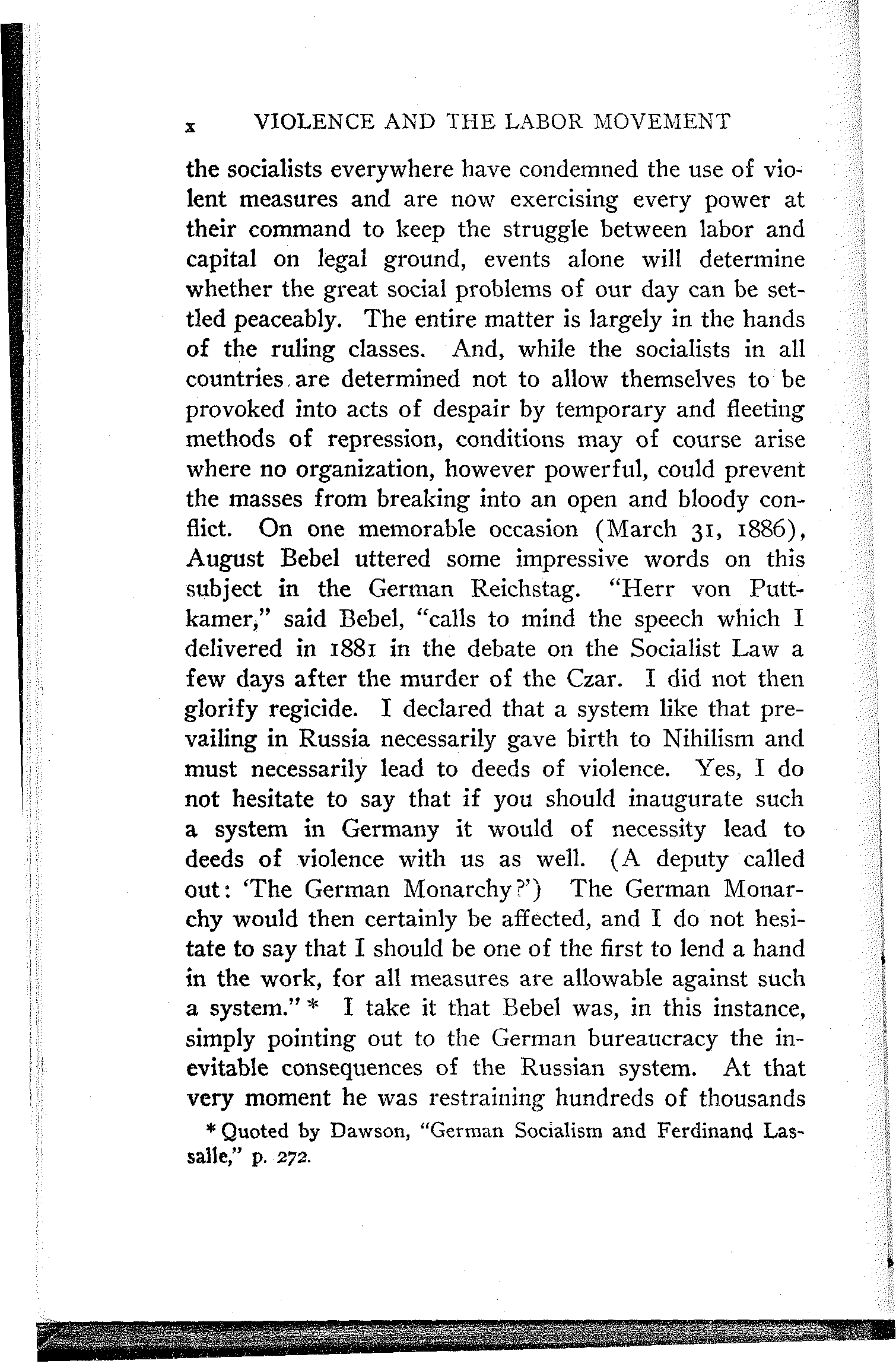 It is, of course, perfectly obvious that the methods to be employed in the struggles between classes, as between nations, cannot be predetermined. And, while[x] the socialists everywhere have condemned the use of violent measures and are now exercising every power at their command to keep the struggle between labor and capital on legal ground, events alone will determine whether the great social problems of our day can be settled peaceably. The entire matter is largely in the hands of the ruling classes. And, while the socialists in all countries are determined not to allow themselves to be provoked into acts of despair by temporary and fleeting methods of repression, conditions may of course arise where no organization, however powerful, could prevent the masses from breaking into an open and bloody conflict. On one memorable occasion (March 31, 1886), August Bebel uttered some impressive words on this subject in the German Reichstag. "Herr von Puttkamer," said Bebel, "calls to mind the speech which I delivered in 1881 in the debate on the Socialist Law a few days after the murder of the Czar. I did not then glorify regicide. I declared that a system like that prevailing in Russia necessarily gave birth to Nihilism and must necessarily lead to deeds of violence. Yes, I do not hesitate to say that if you should inaugurate such a system in Germany it would of necessity lead to deeds of violence with us as well. (A deputy called out: 'The German Monarchy?') The German Monarchy would then certainly be affected, and I do not hesitate to say that I should be one of the first to lend a hand in the work, for all measures are allowable against such a system."[E] I take it that Bebel was, in this instance, simply pointing out to the German bureaucracy the inevitable consequences of the Russian system. At that very moment he was restraining hundreds of thousands[xi] of his followers from acts of despair, yet he could not resist warning the German rulers that the time might come in that country when no considerations whatever could persuade men to forego the use of the most violent retaliative measures. This view is, of course, well established in our national history, and our Declaration of Independence, as well as many of our State constitutions, asserts that it is both the right and the duty of the people to overthrow by any means in their power an oppressive and tyrannical government. This was, of course, always the teaching of what Marx liked to call "the bourgeois democrats." It was, in fact, their only conception of revolution.