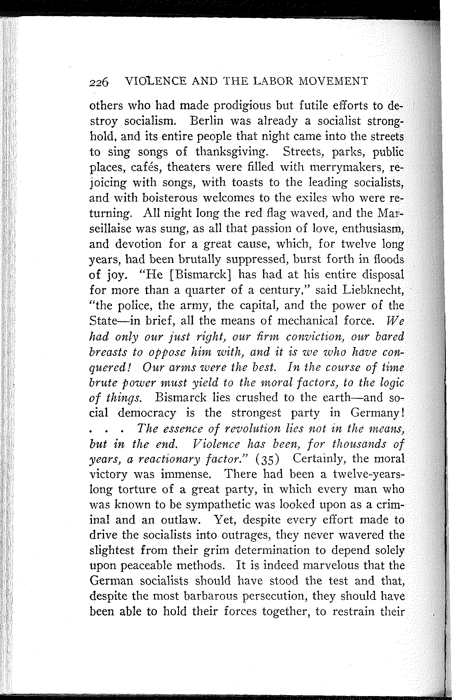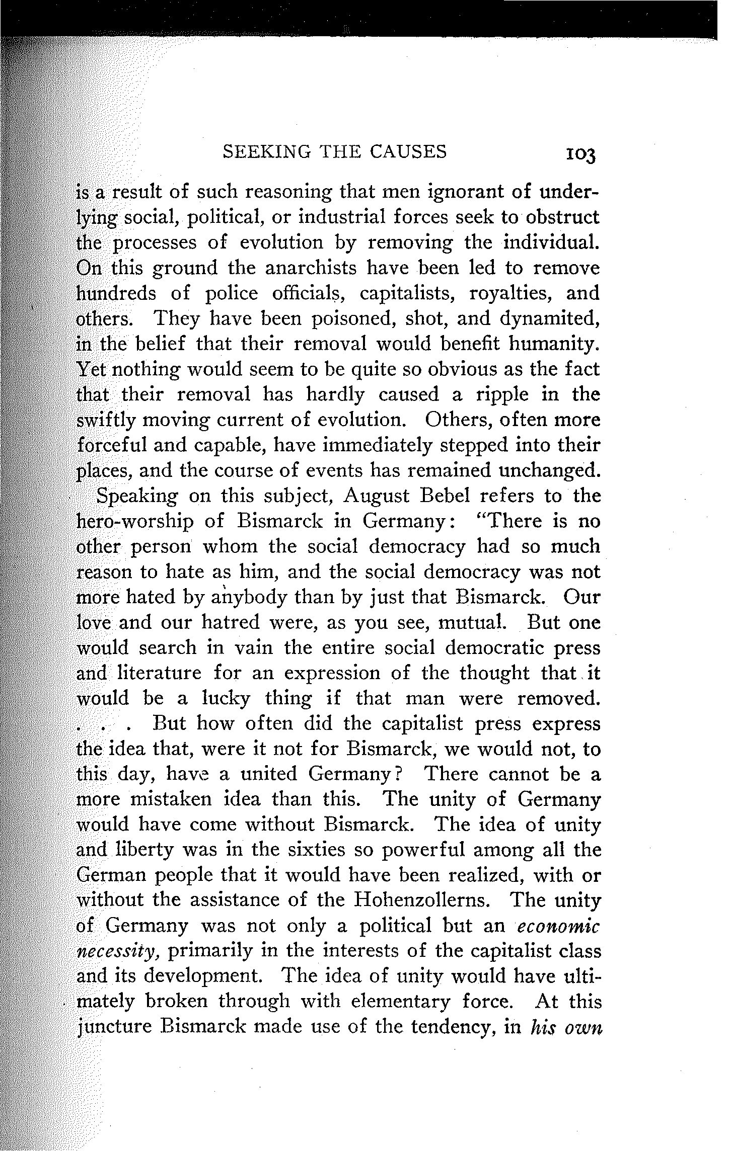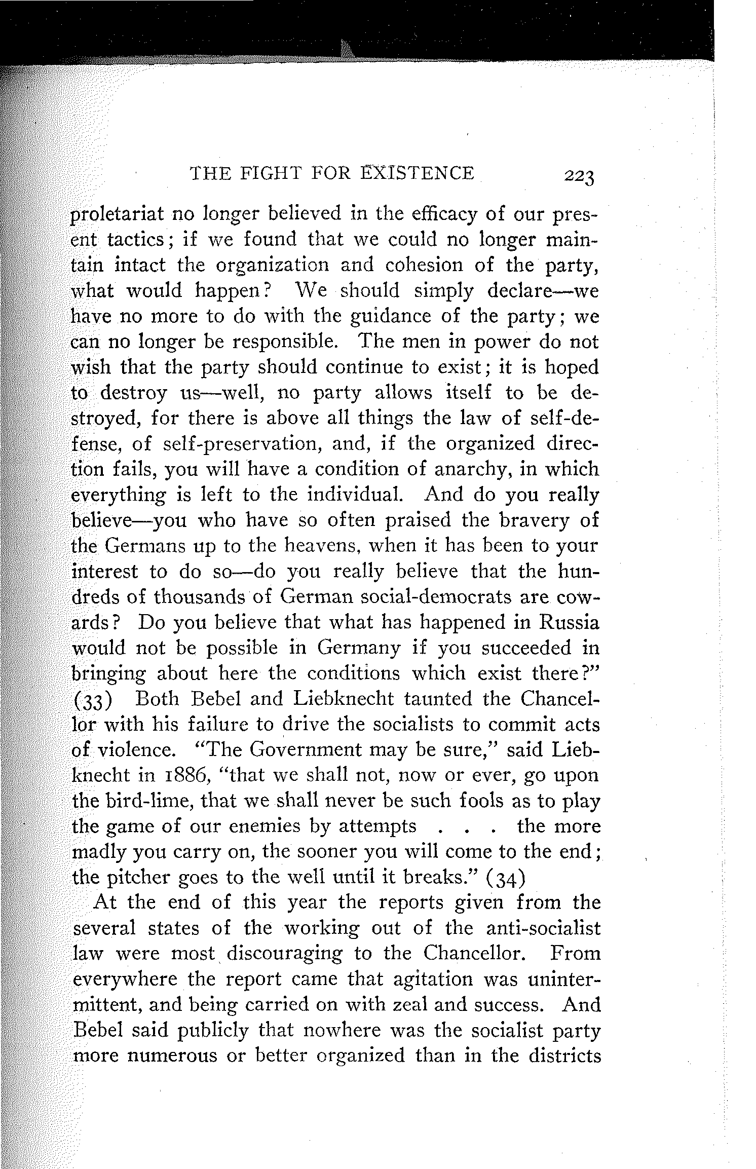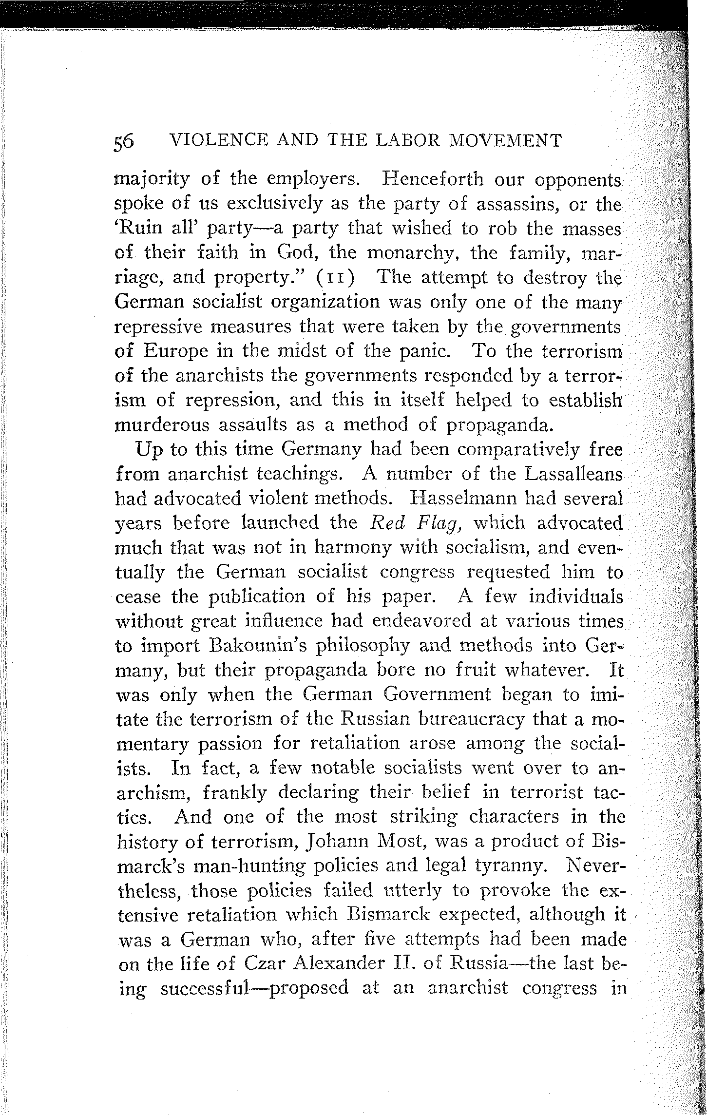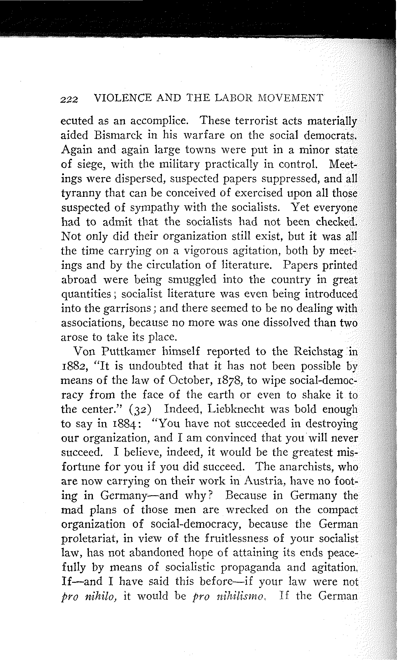 It is, of course, perfectly obvious that the methods to be employed in the struggles between classes, as between nations, cannot be predetermined. And, while[x] the socialists everywhere have condemned the use of violent measures and are now exercising every power at their command to keep the struggle between labor and capital on legal ground, events alone will determine whether the great social problems of our day can be settled peaceably. The entire matter is largely in the hands of the ruling classes. And, while the socialists in all countries are determined not to allow themselves to be provoked into acts of despair by temporary and fleeting methods of repression, conditions may of course arise where no organization, however powerful, could prevent the masses from breaking into an open and bloody conflict. On one memorable occasion (March 31, 1886), August Bebel uttered some impressive words on this subject in the German Reichstag. "Herr von Puttkamer," said Bebel, "calls to mind the speech which I delivered in 1881 in the debate on the Socialist Law a few days after the murder of the Czar. I did not then glorify regicide. I declared that a system like that prevailing in Russia necessarily gave birth to Nihilism and must necessarily lead to deeds of violence. Yes, I do not hesitate to say that if you should inaugurate such a system in Germany it would of necessity lead to deeds of violence with us as well. (A deputy called out: 'The German Monarchy?') The German Monarchy would then certainly be affected, and I do not hesitate to say that I should be one of the first to lend a hand in the work, for all measures are allowable against such a system."[E] I take it that Bebel was, in this instance, simply pointing out to the German bureaucracy the inevitable consequences of the Russian system. At that very moment he was restraining hundreds of thousands[xi] of his followers from acts of despair, yet he could not resist warning the German rulers that the time might come in that country when no considerations whatever could persuade men to forego the use of the most violent retaliative measures. This view is, of course, well established in our national history, and our Declaration of Independence, as well as many of our State constitutions, asserts that it is both the right and the duty of the people to overthrow by any means in their power an oppressive and tyrannical government. This was, of course, always the teaching of what Marx liked to call "the bourgeois democrats." It was, in fact, their only conception of revolution.