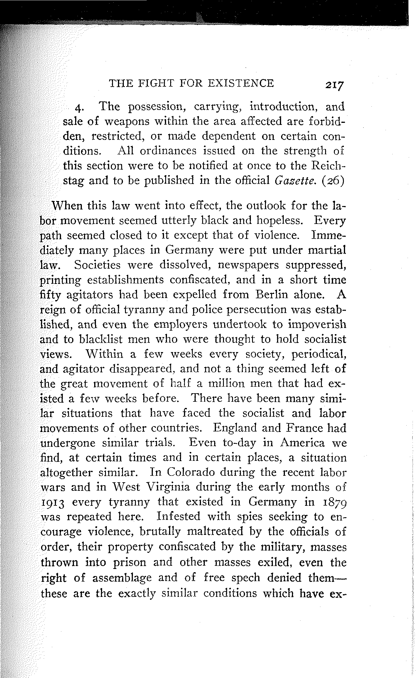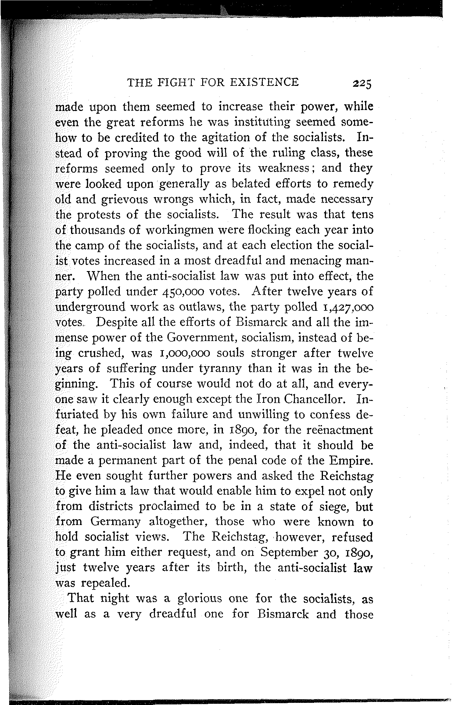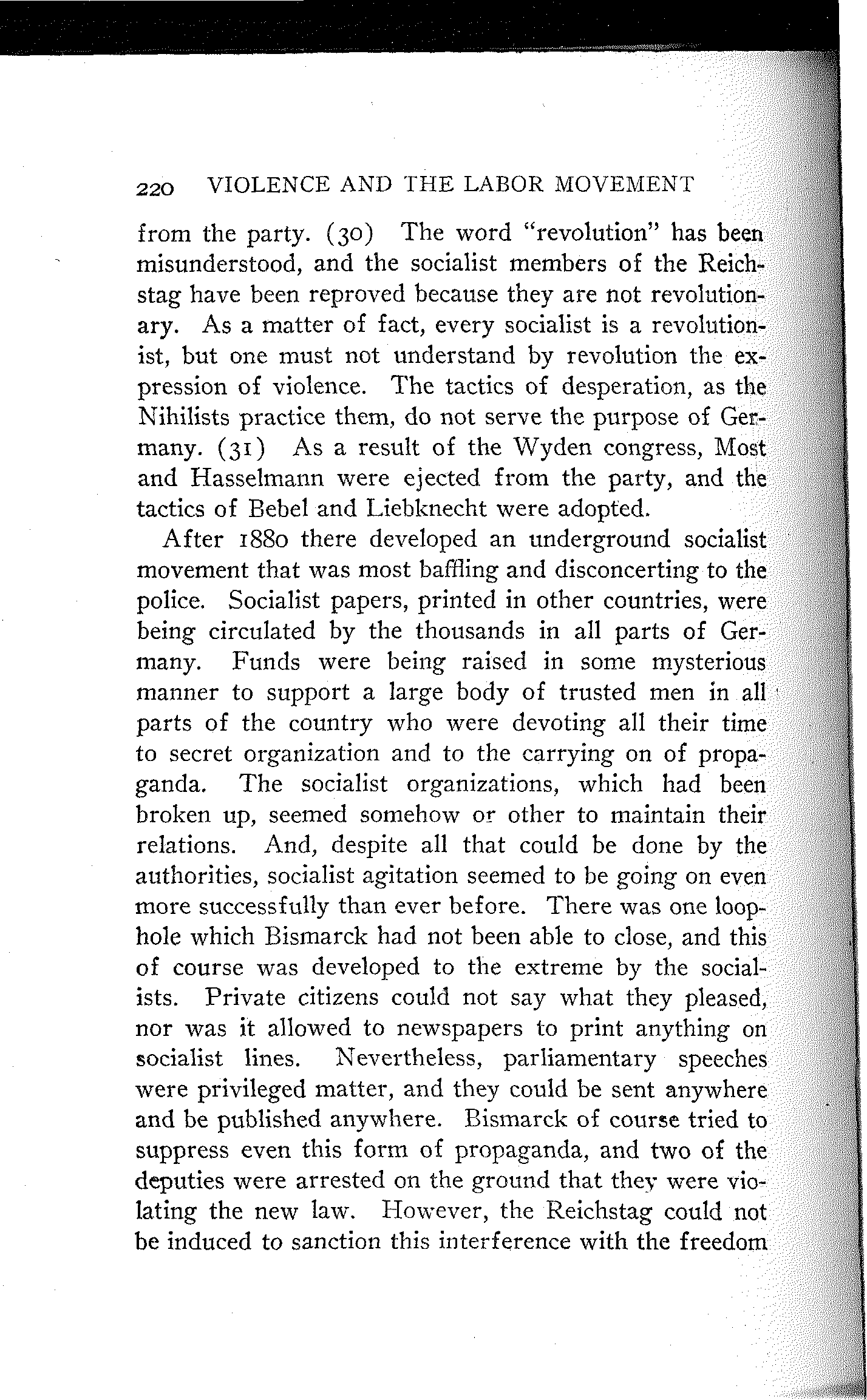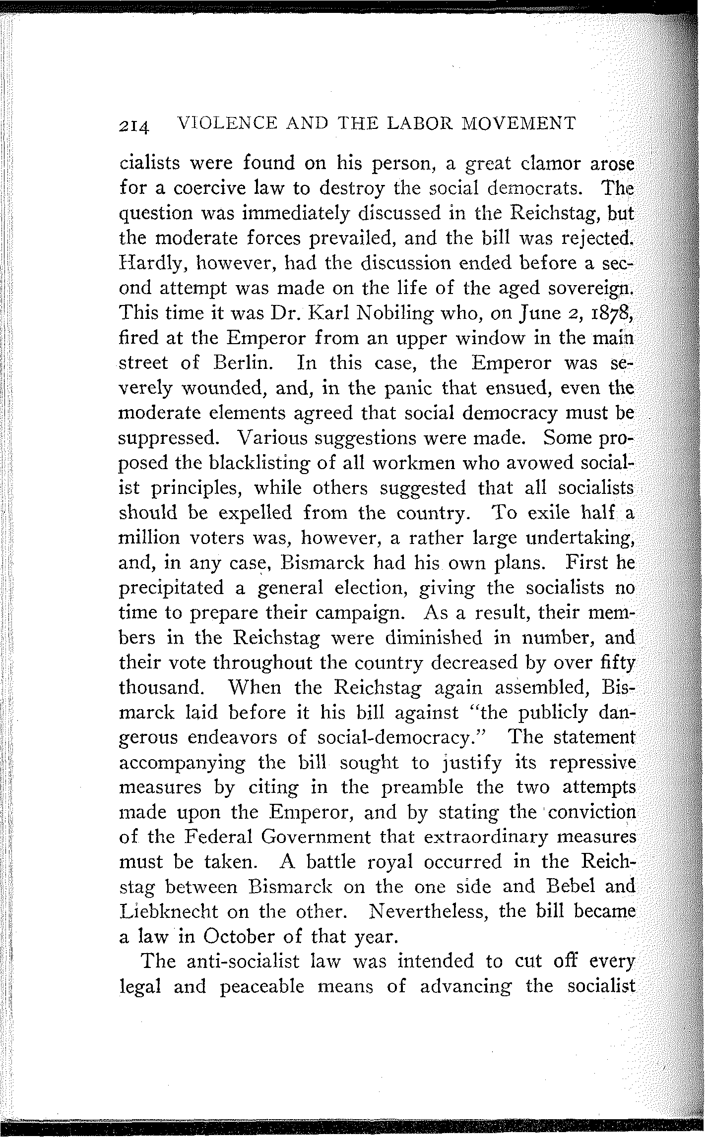 It is, of course, perfectly obvious that the methods to be employed in the struggles between classes, as between nations, cannot be predetermined. And, while[x] the socialists everywhere have condemned the use of violent measures and are now exercising every power at their command to keep the struggle between labor and capital on legal ground, events alone will determine whether the great social problems of our day can be settled peaceably. The entire matter is largely in the hands of the ruling classes. And, while the socialists in all countries are determined not to allow themselves to be provoked into acts of despair by temporary and fleeting methods of repression, conditions may of course arise where no organization, however powerful, could prevent the masses from breaking into an open and bloody conflict. On one memorable occasion (March 31, 1886), August Bebel uttered some impressive words on this subject in the German Reichstag. "Herr von Puttkamer," said Bebel, "calls to mind the speech which I delivered in 1881 in the debate on the Socialist Law a few days after the murder of the Czar. I did not then glorify regicide. I declared that a system like that prevailing in Russia necessarily gave birth to Nihilism and must necessarily lead to deeds of violence. Yes, I do not hesitate to say that if you should inaugurate such a system in Germany it would of necessity lead to deeds of violence with us as well. (A deputy called out: 'The German Monarchy?') The German Monarchy would then certainly be affected, and I do not hesitate to say that I should be one of the first to lend a hand in the work, for all measures are allowable against such a system."[E] I take it that Bebel was, in this instance, simply pointing out to the German bureaucracy the inevitable consequences of the Russian system. At that very moment he was restraining hundreds of thousands[xi] of his followers from acts of despair, yet he could not resist warning the German rulers that the time might come in that country when no considerations whatever could persuade men to forego the use of the most violent retaliative measures. This view is, of course, well established in our national history, and our Declaration of Independence, as well as many of our State constitutions, asserts that it is both the right and the duty of the people to overthrow by any means in their power an oppressive and tyrannical government. This was, of course, always the teaching of what Marx liked to call "the bourgeois democrats." It was, in fact, their only conception of revolution.