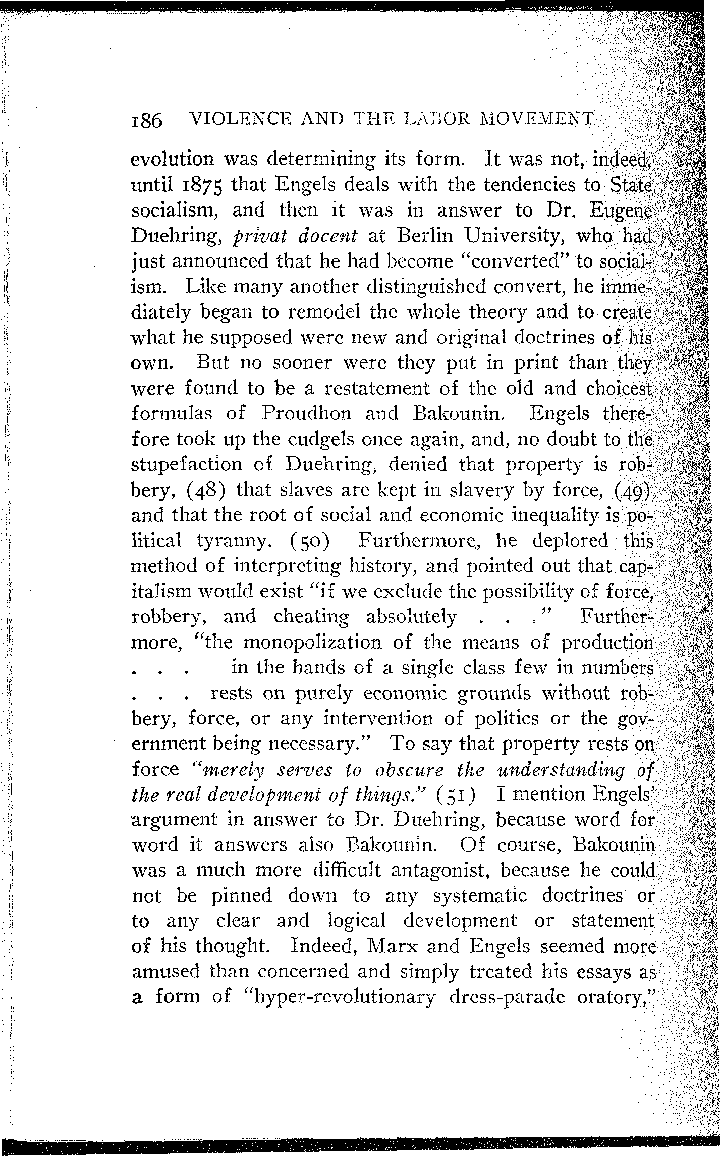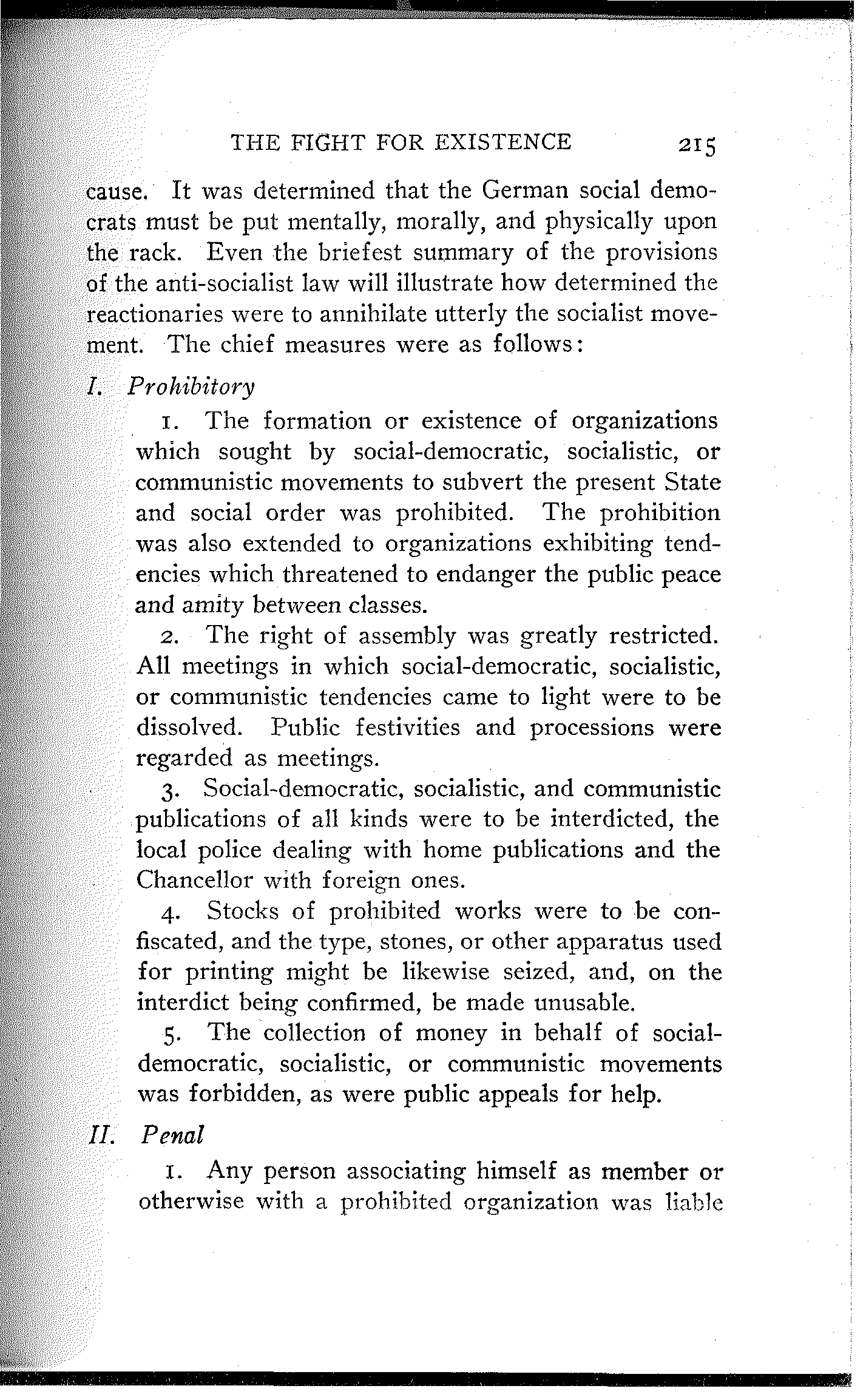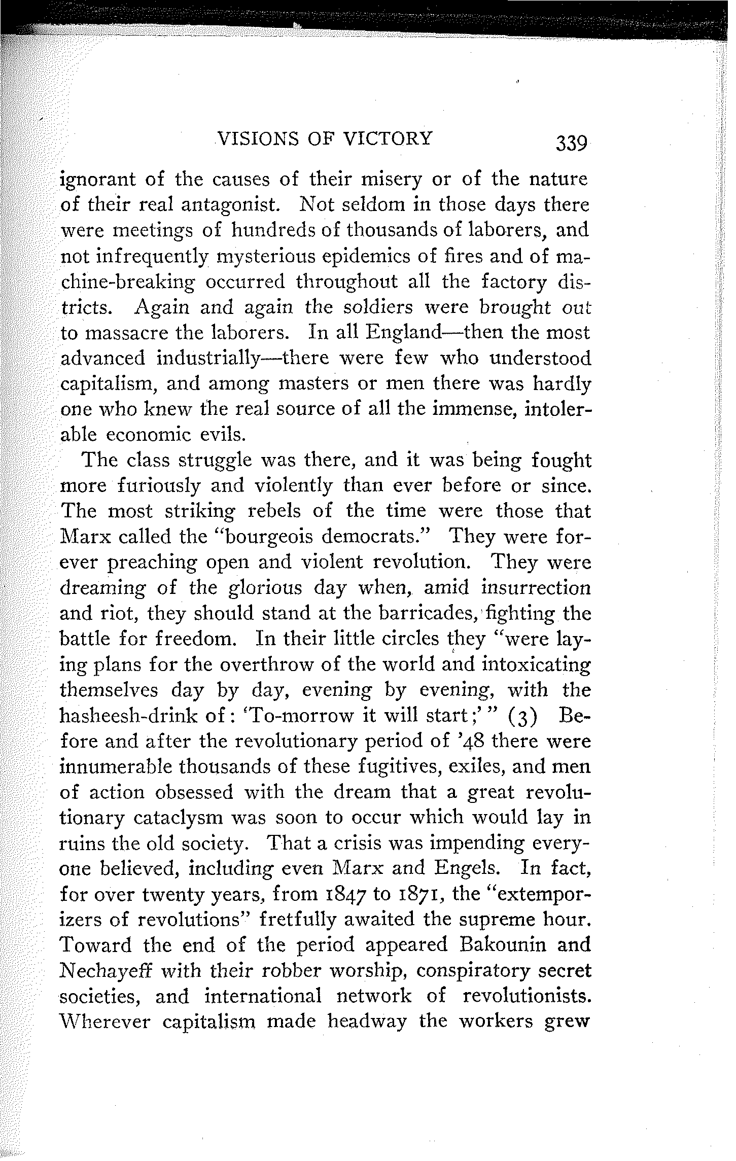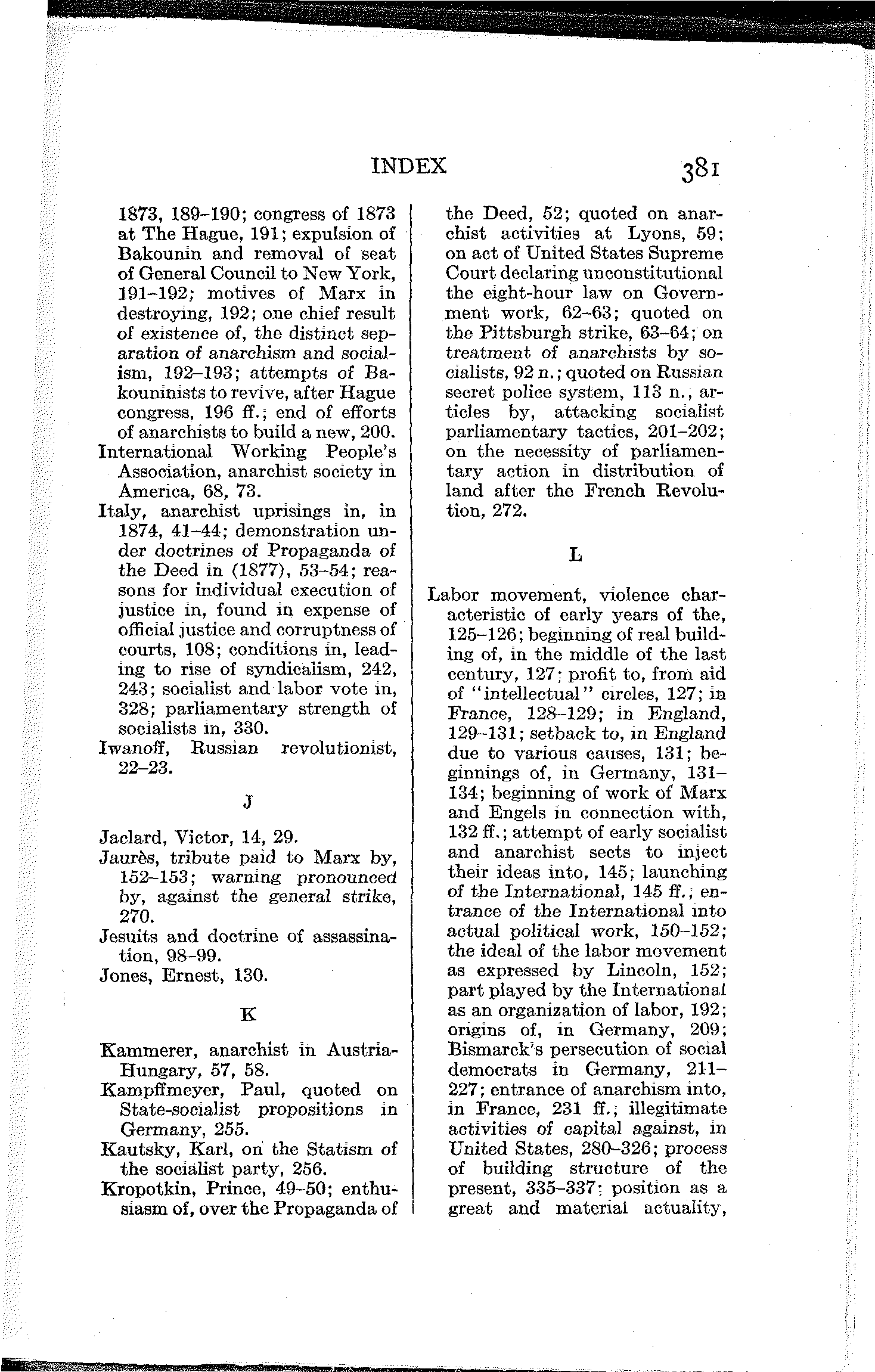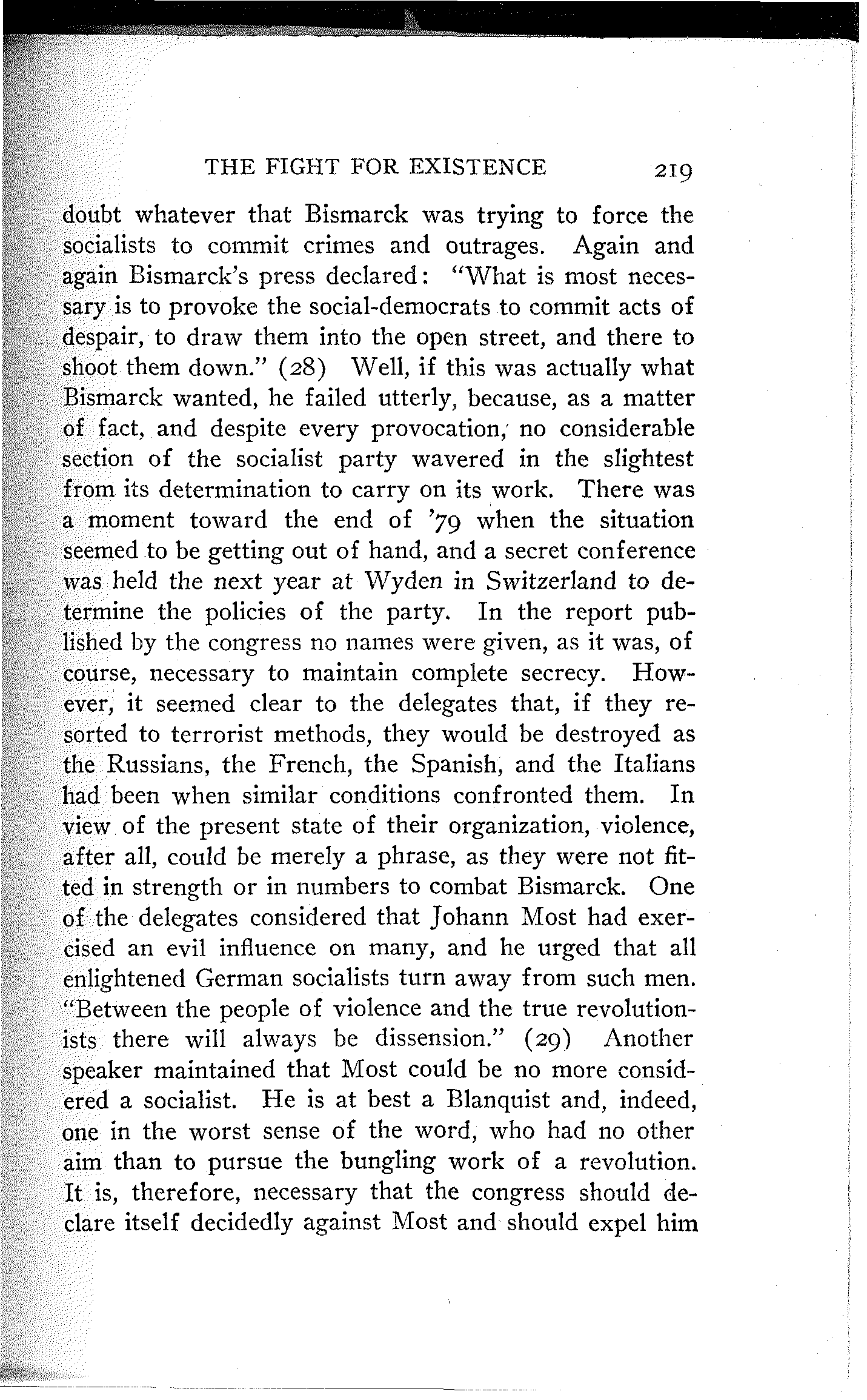 It is, of course, perfectly obvious that the methods to be employed in the struggles between classes, as between nations, cannot be predetermined. And, while[x] the socialists everywhere have condemned the use of violent measures and are now exercising every power at their command to keep the struggle between labor and capital on legal ground, events alone will determine whether the great social problems of our day can be settled peaceably. The entire matter is largely in the hands of the ruling classes. And, while the socialists in all countries are determined not to allow themselves to be provoked into acts of despair by temporary and fleeting methods of repression, conditions may of course arise where no organization, however powerful, could prevent the masses from breaking into an open and bloody conflict. On one memorable occasion (March 31, 1886), August Bebel uttered some impressive words on this subject in the German Reichstag. "Herr von Puttkamer," said Bebel, "calls to mind the speech which I delivered in 1881 in the debate on the Socialist Law a few days after the murder of the Czar. I did not then glorify regicide. I declared that a system like that prevailing in Russia necessarily gave birth to Nihilism and must necessarily lead to deeds of violence. Yes, I do not hesitate to say that if you should inaugurate such a system in Germany it would of necessity lead to deeds of violence with us as well. (A deputy called out: 'The German Monarchy?') The German Monarchy would then certainly be affected, and I do not hesitate to say that I should be one of the first to lend a hand in the work, for all measures are allowable against such a system."[E] I take it that Bebel was, in this instance, simply pointing out to the German bureaucracy the inevitable consequences of the Russian system. At that very moment he was restraining hundreds of thousands[xi] of his followers from acts of despair, yet he could not resist warning the German rulers that the time might come in that country when no considerations whatever could persuade men to forego the use of the most violent retaliative measures. This view is, of course, well established in our national history, and our Declaration of Independence, as well as many of our State constitutions, asserts that it is both the right and the duty of the people to overthrow by any means in their power an oppressive and tyrannical government. This was, of course, always the teaching of what Marx liked to call "the bourgeois democrats." It was, in fact, their only conception of revolution.