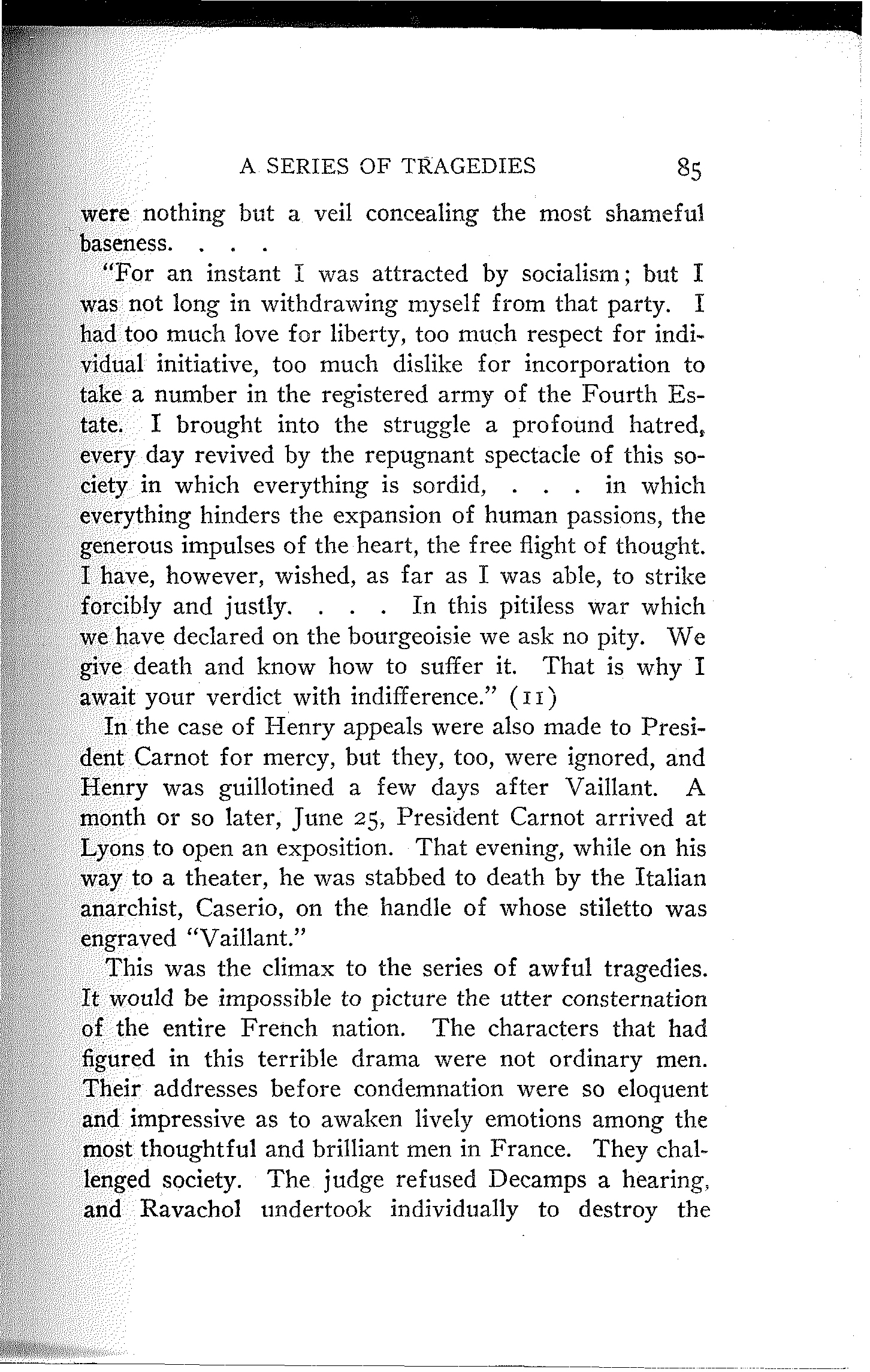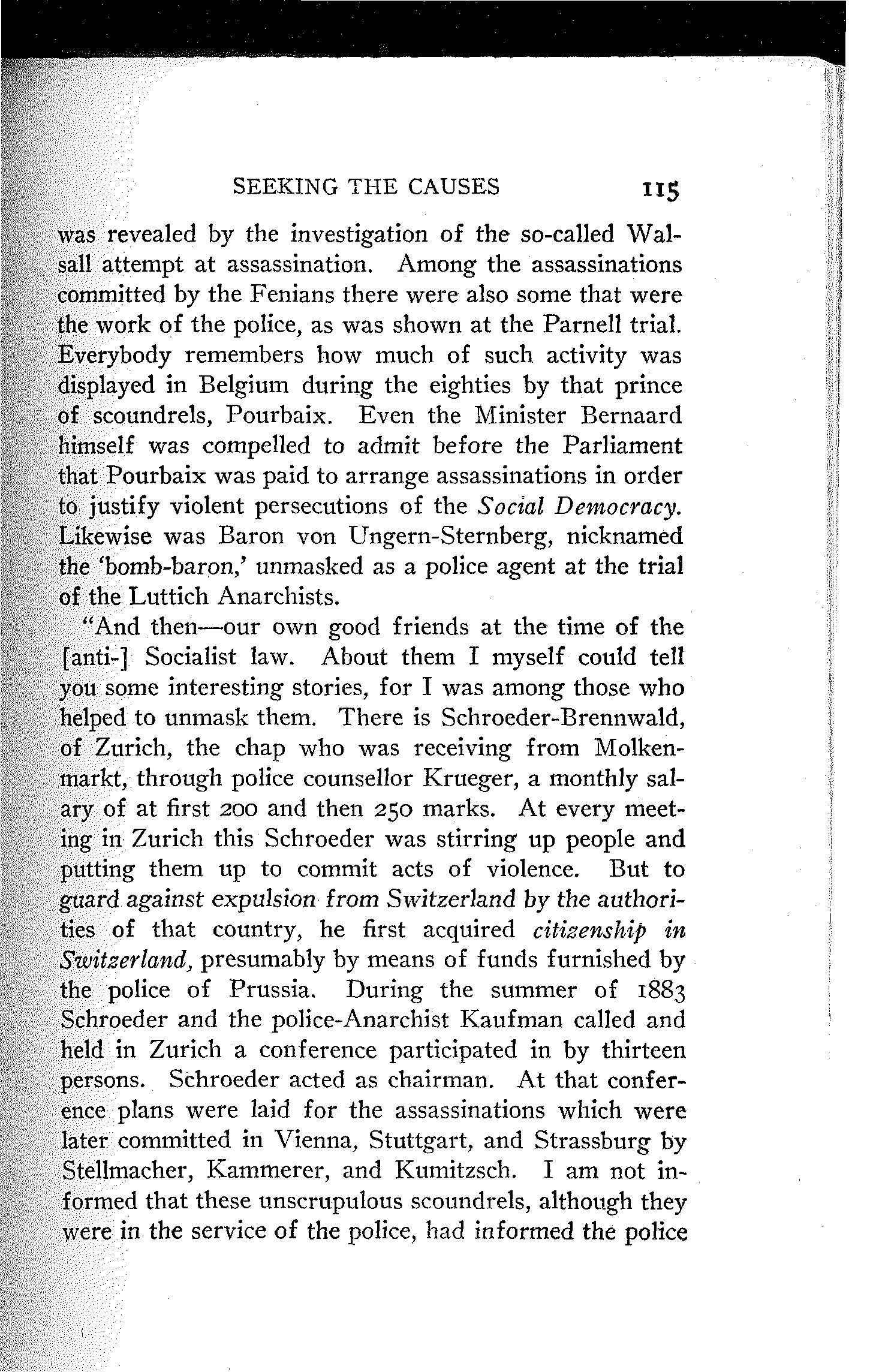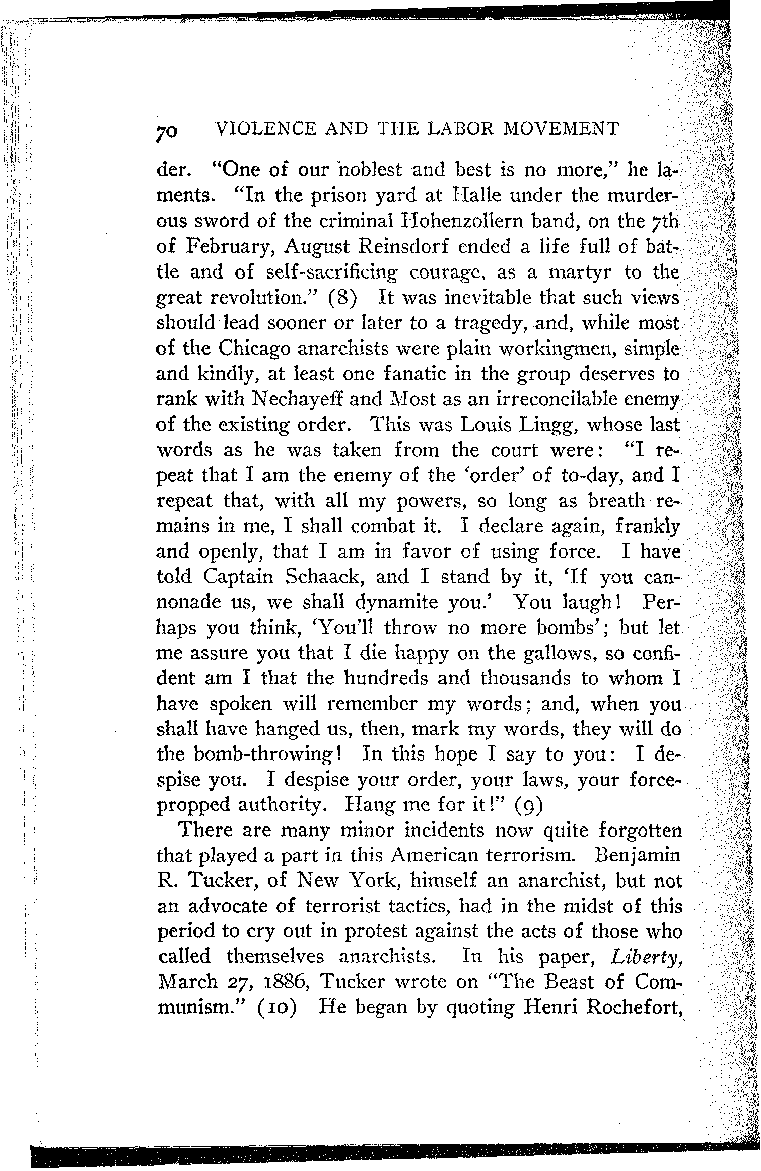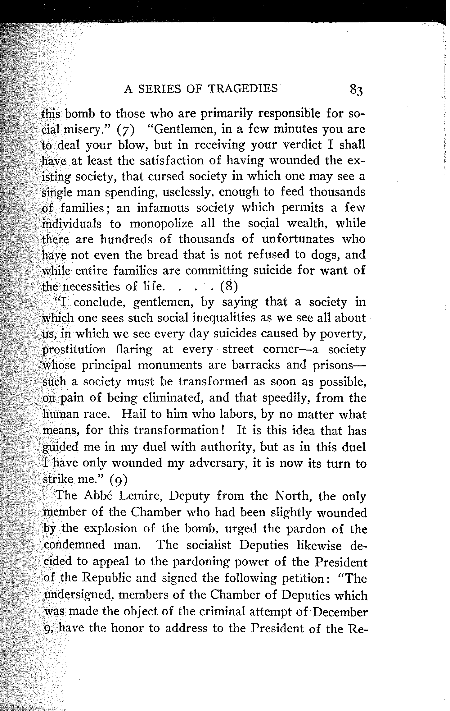 It is, of course, perfectly obvious that the methods to be employed in the struggles between classes, as between nations, cannot be predetermined. And, while[x] the socialists everywhere have condemned the use of violent measures and are now exercising every power at their command to keep the struggle between labor and capital on legal ground, events alone will determine whether the great social problems of our day can be settled peaceably. The entire matter is largely in the hands of the ruling classes. And, while the socialists in all countries are determined not to allow themselves to be provoked into acts of despair by temporary and fleeting methods of repression, conditions may of course arise where no organization, however powerful, could prevent the masses from breaking into an open and bloody conflict. On one memorable occasion (March 31, 1886), August Bebel uttered some impressive words on this subject in the German Reichstag. "Herr von Puttkamer," said Bebel, "calls to mind the speech which I delivered in 1881 in the debate on the Socialist Law a few days after the murder of the Czar. I did not then glorify regicide. I declared that a system like that prevailing in Russia necessarily gave birth to Nihilism and must necessarily lead to deeds of violence. Yes, I do not hesitate to say that if you should inaugurate such a system in Germany it would of necessity lead to deeds of violence with us as well. (A deputy called out: 'The German Monarchy?') The German Monarchy would then certainly be affected, and I do not hesitate to say that I should be one of the first to lend a hand in the work, for all measures are allowable against such a system."[E] I take it that Bebel was, in this instance, simply pointing out to the German bureaucracy the inevitable consequences of the Russian system. At that very moment he was restraining hundreds of thousands[xi] of his followers from acts of despair, yet he could not resist warning the German rulers that the time might come in that country when no considerations whatever could persuade men to forego the use of the most violent retaliative measures. This view is, of course, well established in our national history, and our Declaration of Independence, as well as many of our State constitutions, asserts that it is both the right and the duty of the people to overthrow by any means in their power an oppressive and tyrannical government. This was, of course, always the teaching of what Marx liked to call "the bourgeois democrats." It was, in fact, their only conception of revolution.