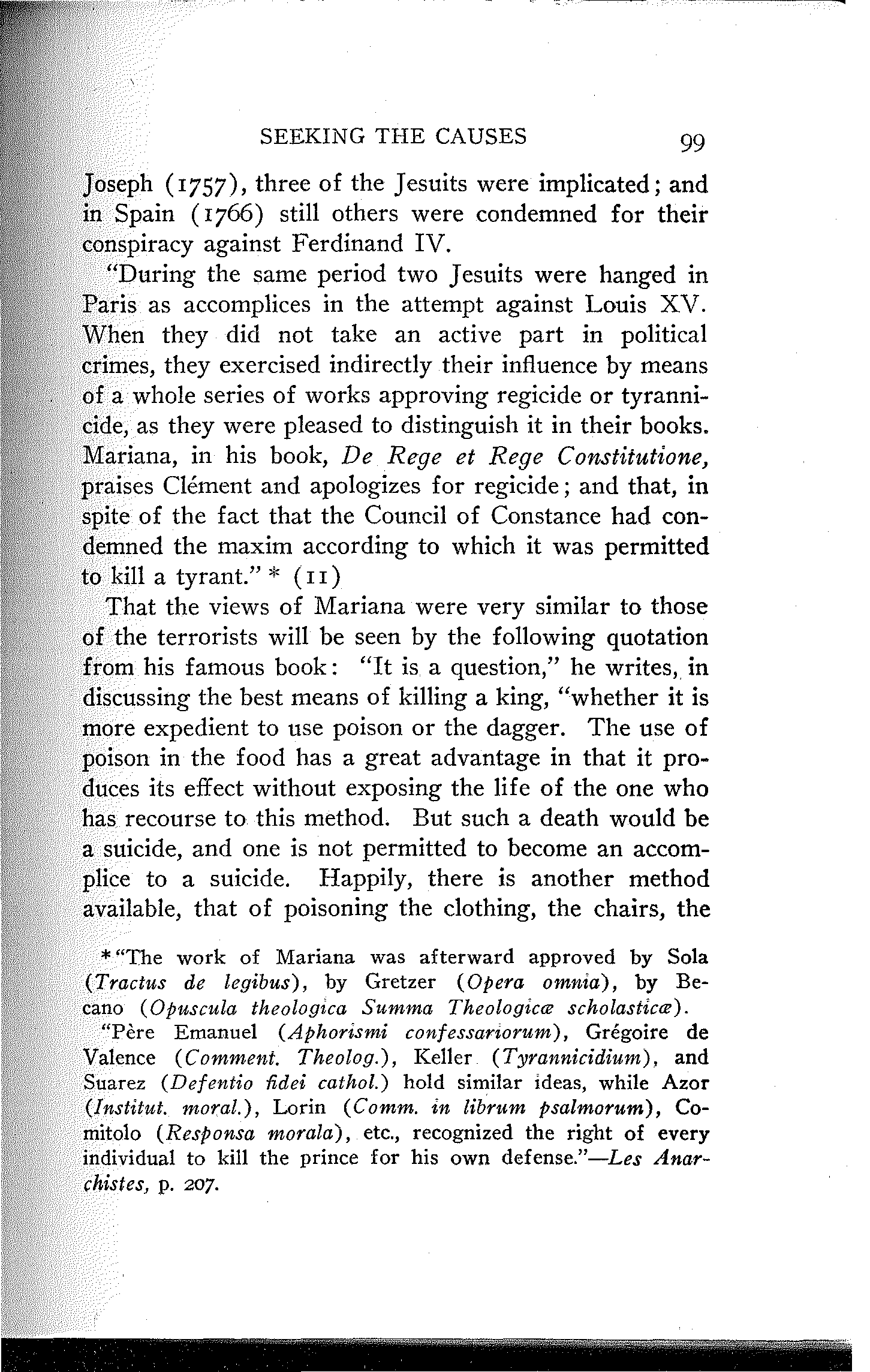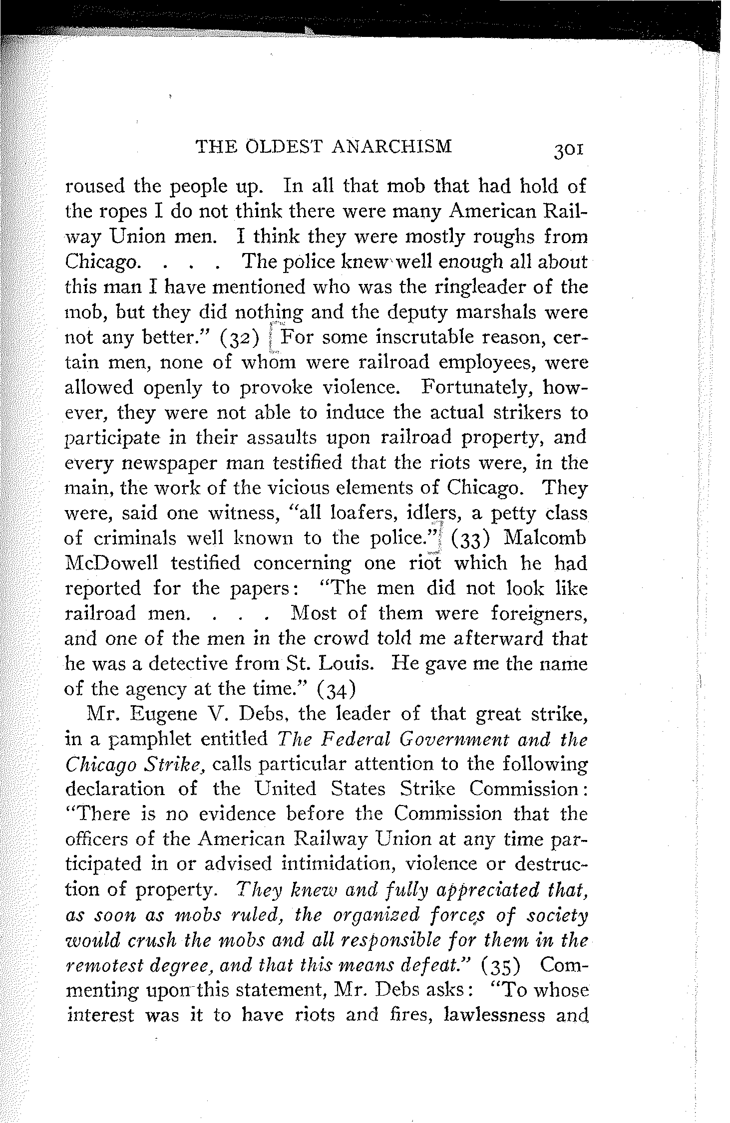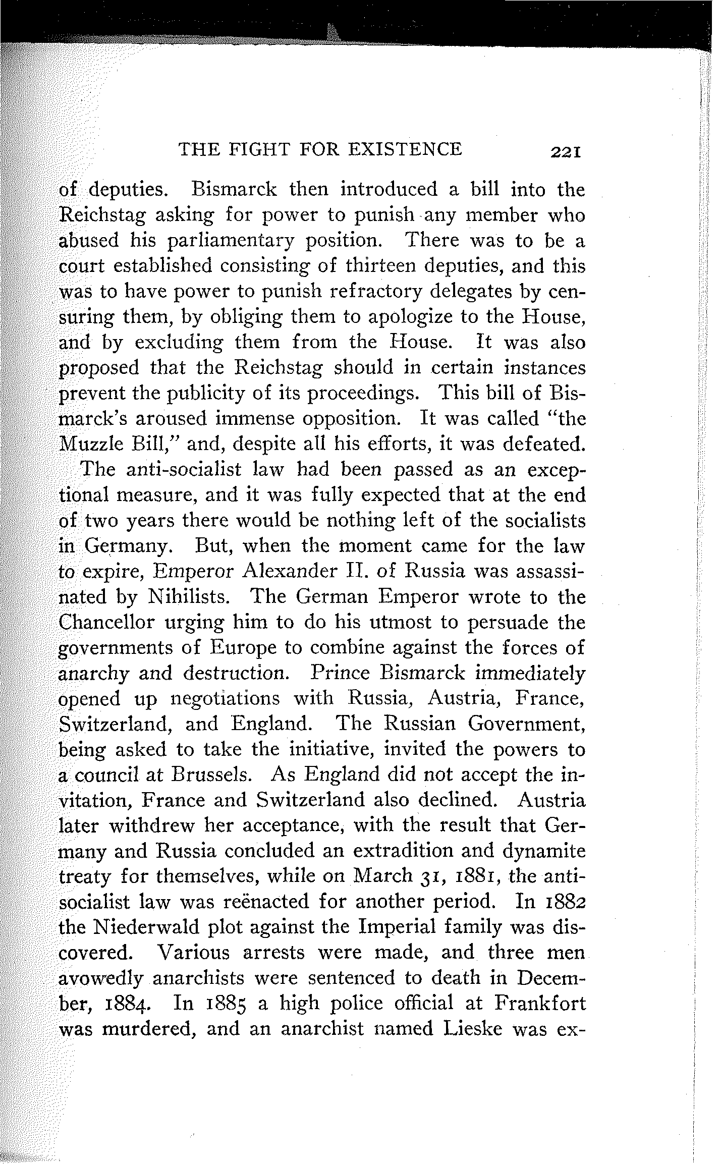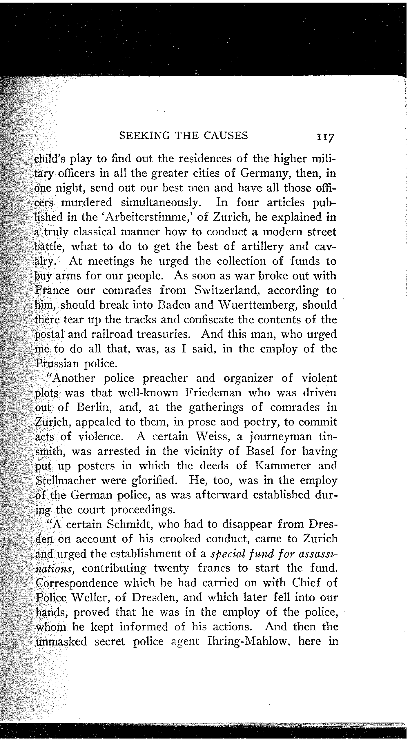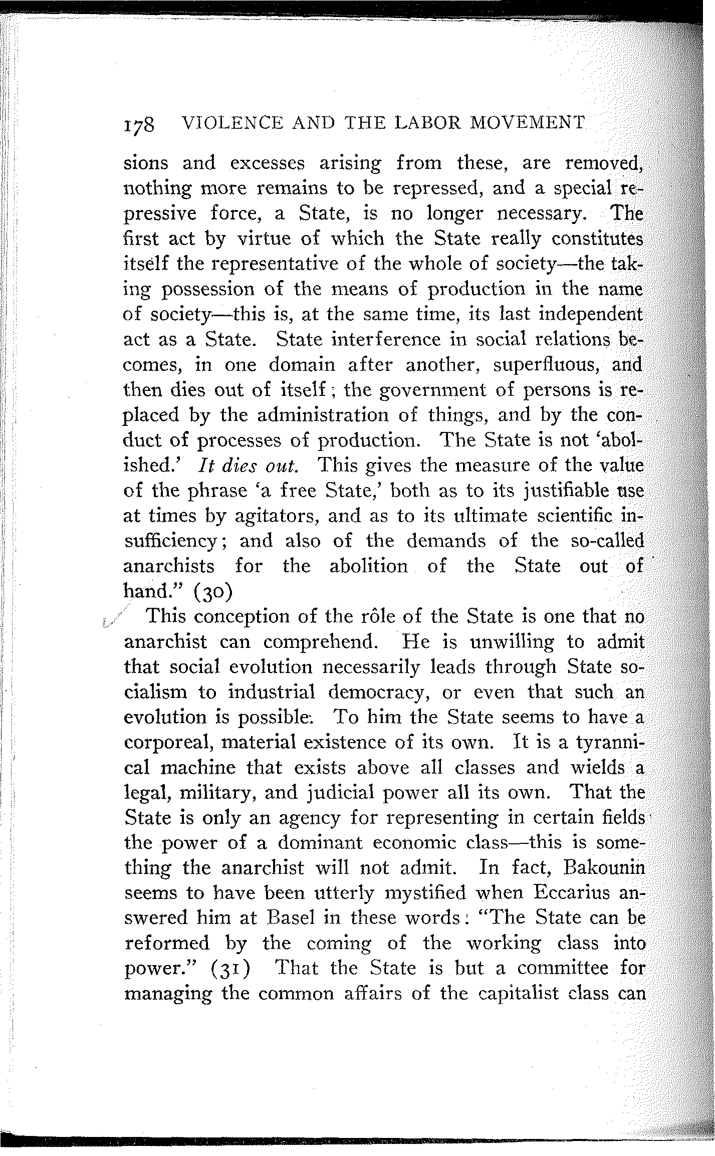 It is, of course, perfectly obvious that the methods to be employed in the struggles between classes, as between nations, cannot be predetermined. And, while[x] the socialists everywhere have condemned the use of violent measures and are now exercising every power at their command to keep the struggle between labor and capital on legal ground, events alone will determine whether the great social problems of our day can be settled peaceably. The entire matter is largely in the hands of the ruling classes. And, while the socialists in all countries are determined not to allow themselves to be provoked into acts of despair by temporary and fleeting methods of repression, conditions may of course arise where no organization, however powerful, could prevent the masses from breaking into an open and bloody conflict. On one memorable occasion (March 31, 1886), August Bebel uttered some impressive words on this subject in the German Reichstag. "Herr von Puttkamer," said Bebel, "calls to mind the speech which I delivered in 1881 in the debate on the Socialist Law a few days after the murder of the Czar. I did not then glorify regicide. I declared that a system like that prevailing in Russia necessarily gave birth to Nihilism and must necessarily lead to deeds of violence. Yes, I do not hesitate to say that if you should inaugurate such a system in Germany it would of necessity lead to deeds of violence with us as well. (A deputy called out: 'The German Monarchy?') The German Monarchy would then certainly be affected, and I do not hesitate to say that I should be one of the first to lend a hand in the work, for all measures are allowable against such a system."[E] I take it that Bebel was, in this instance, simply pointing out to the German bureaucracy the inevitable consequences of the Russian system. At that very moment he was restraining hundreds of thousands[xi] of his followers from acts of despair, yet he could not resist warning the German rulers that the time might come in that country when no considerations whatever could persuade men to forego the use of the most violent retaliative measures. This view is, of course, well established in our national history, and our Declaration of Independence, as well as many of our State constitutions, asserts that it is both the right and the duty of the people to overthrow by any means in their power an oppressive and tyrannical government. This was, of course, always the teaching of what Marx liked to call "the bourgeois democrats." It was, in fact, their only conception of revolution.