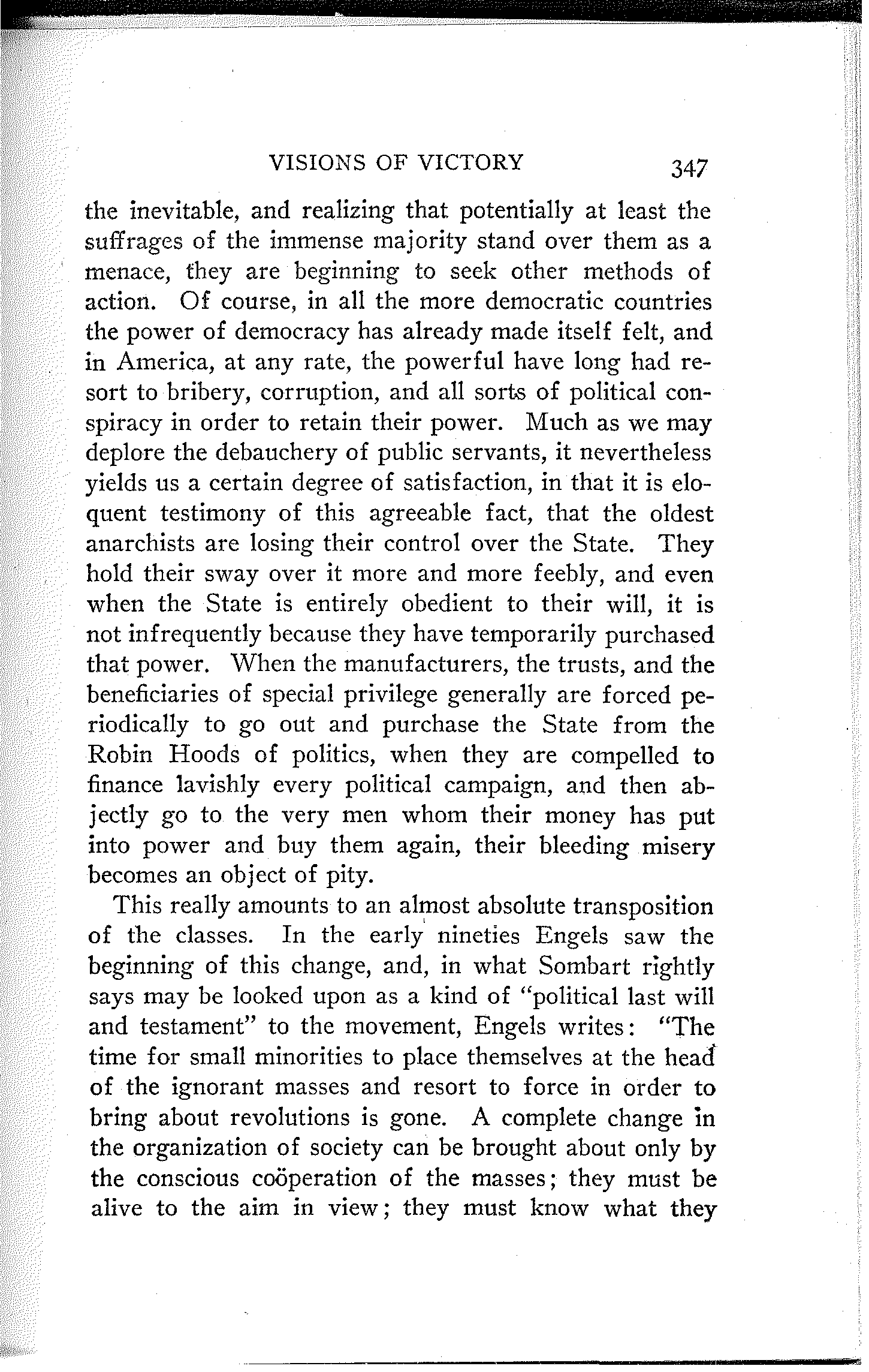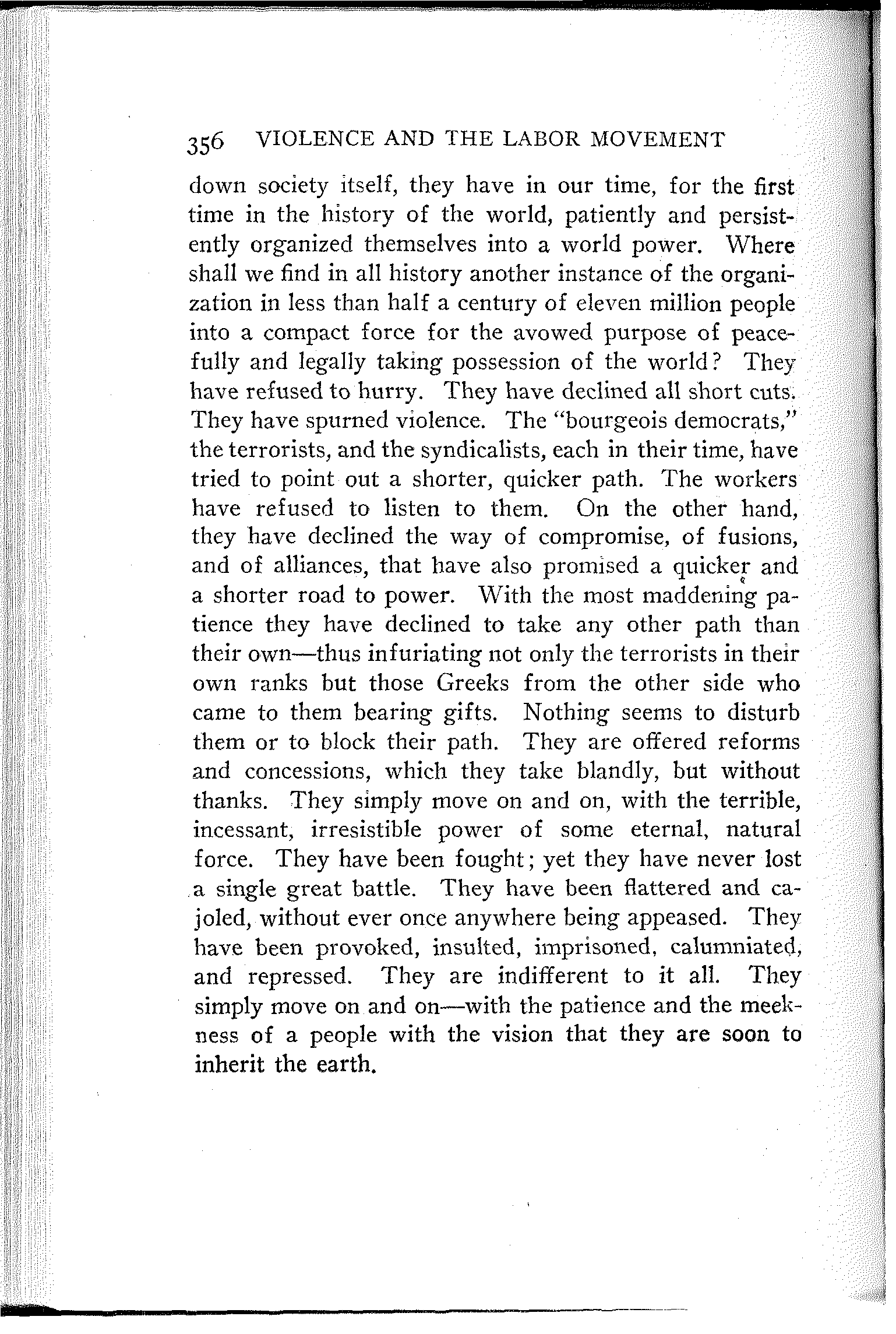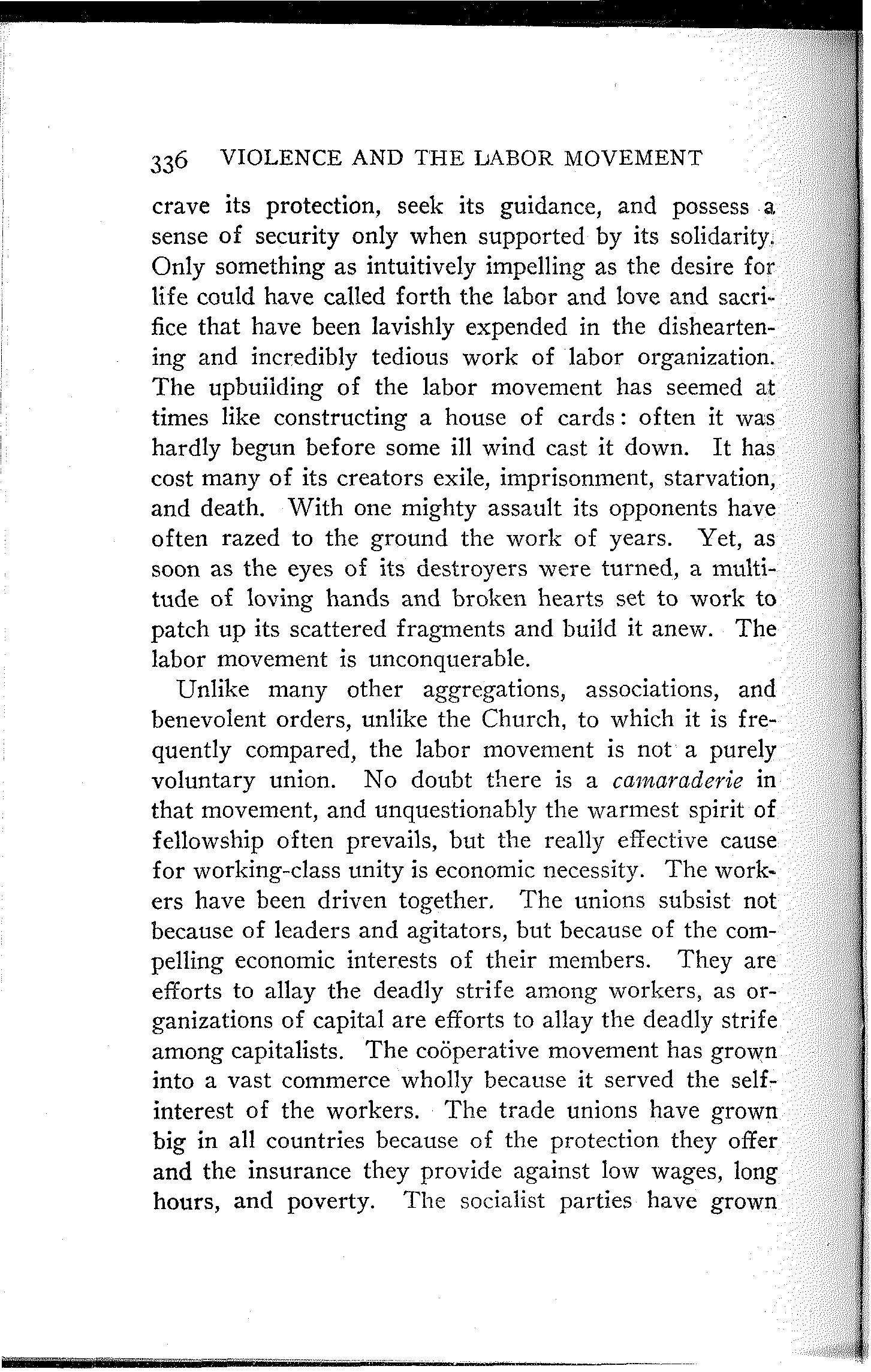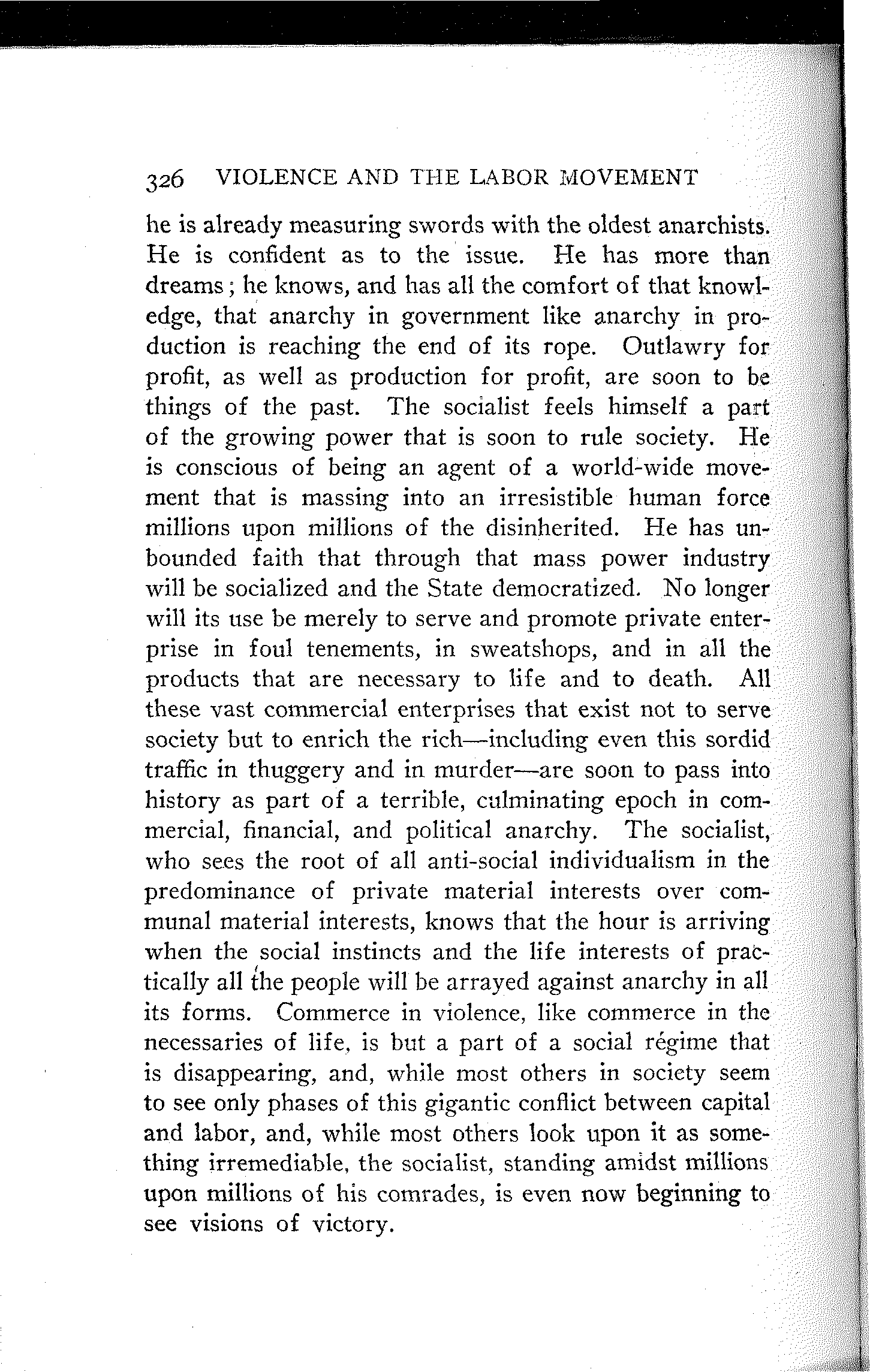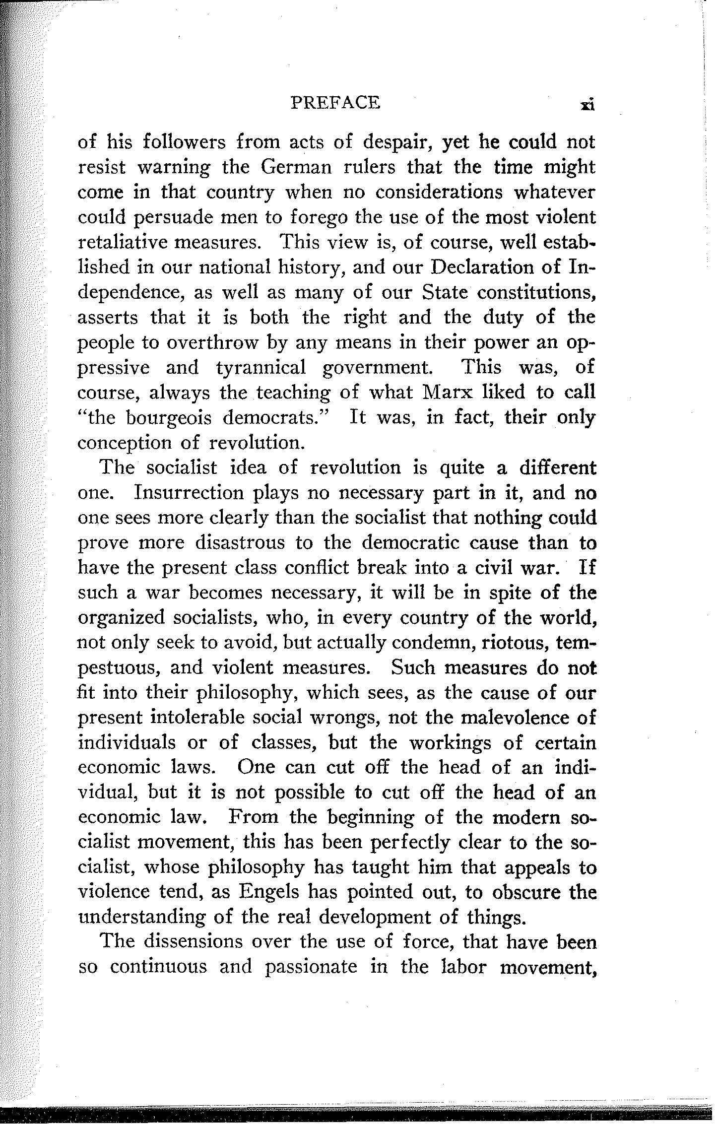 The socialist idea of revolution is quite a different one. Insurrection plays no necessary part in it, and no one sees more clearly than the socialist that nothing could prove more disastrous to the democratic cause than to have the present class conflict break into a civil war. If such a war becomes necessary, it will be in spite of the organized socialists, who, in every country of the world, not only seek to avoid, but actually condemn, riotous, tempestuous, and violent measures. Such measures do not fit into their philosophy, which sees, as the cause of our present intolerable social wrongs, not the malevolence of individuals or of classes, but the workings of certain economic laws. One can cut off the head of an individual, but it is not possible to cut off the head of an economic law. From the beginning of the modern socialist movement, this has been perfectly clear to the socialist, whose philosophy has taught him that appeals to violence tend, as Engels has pointed out, to obscure the understanding of the real development of things.