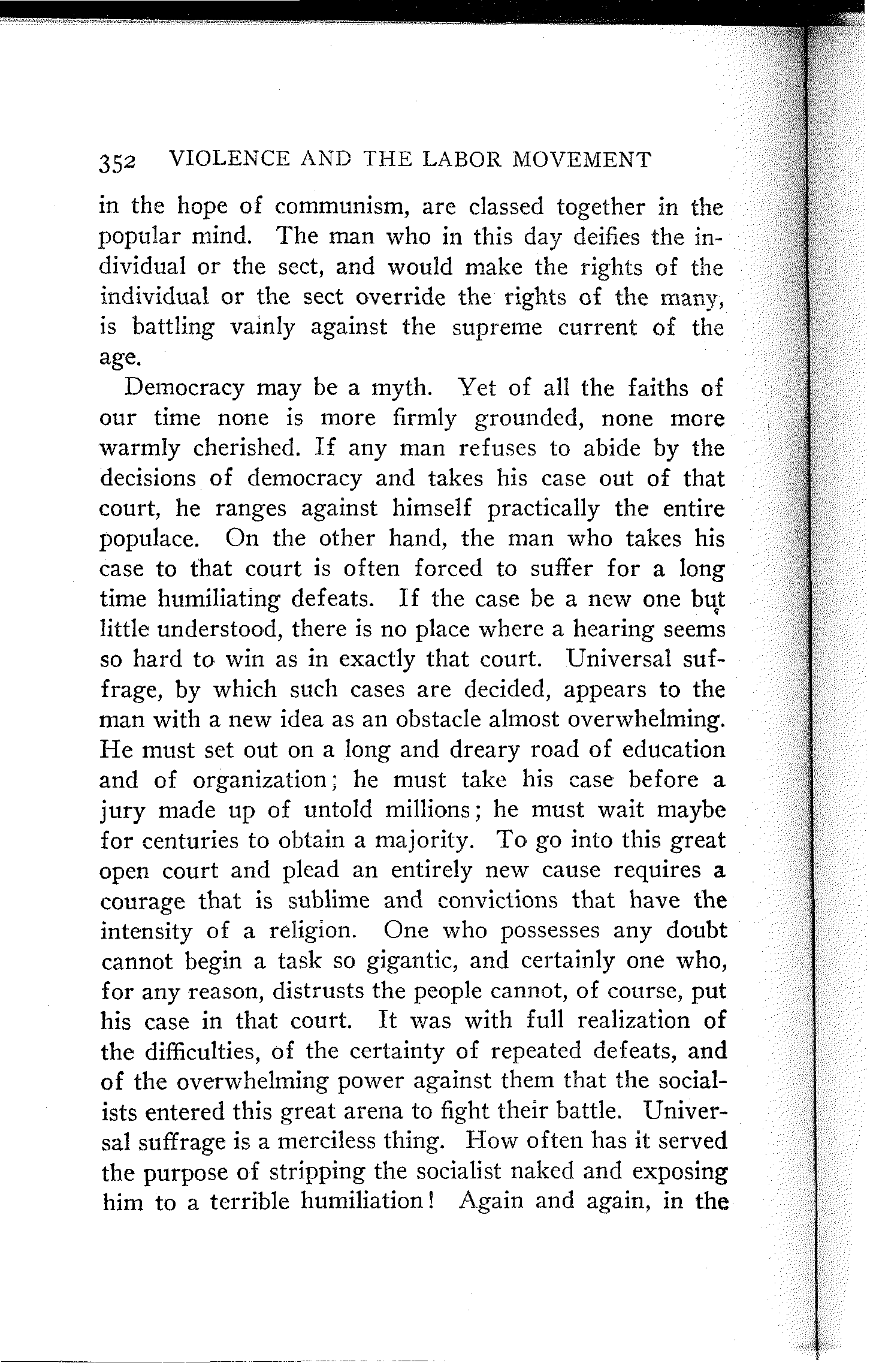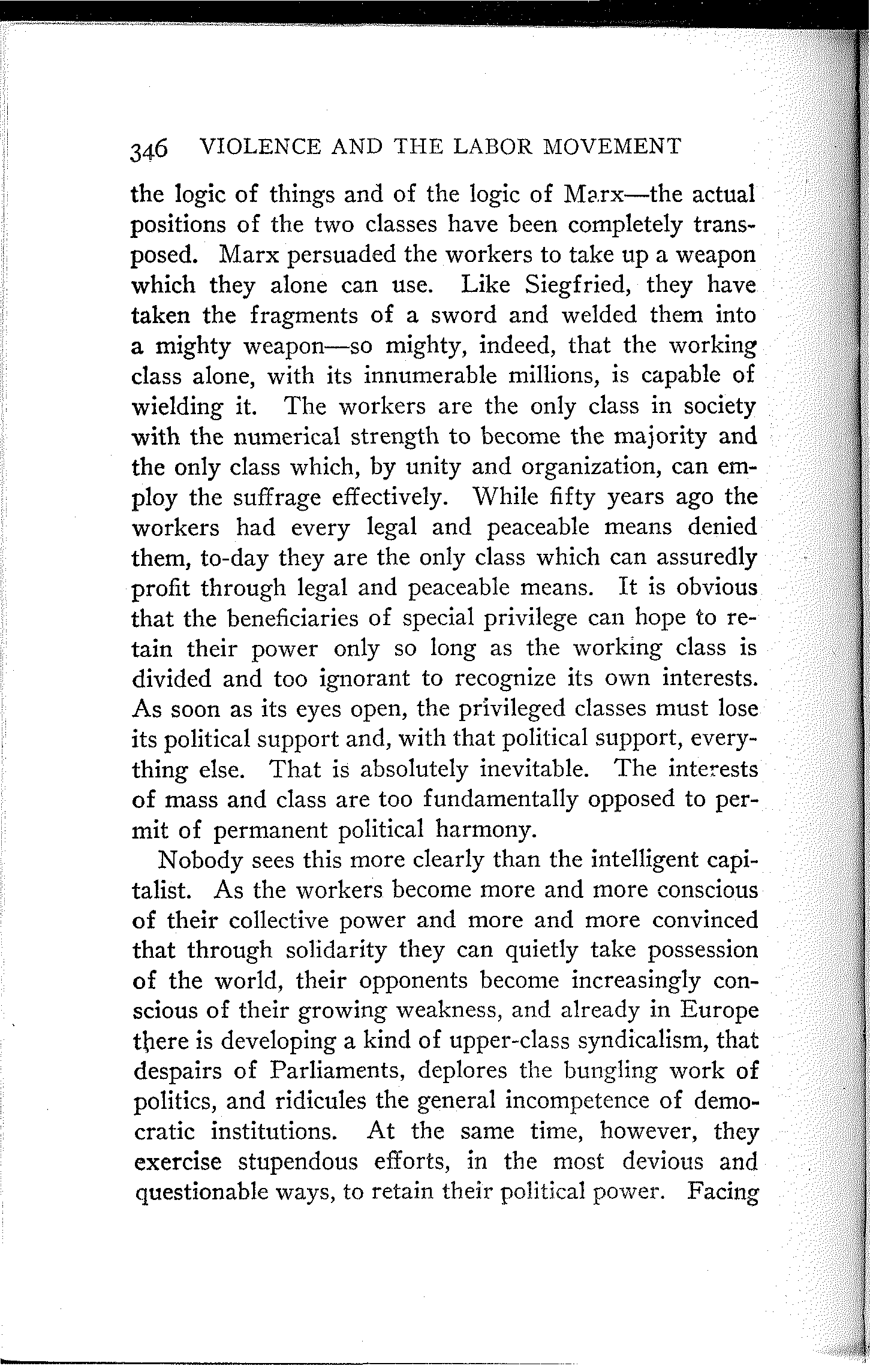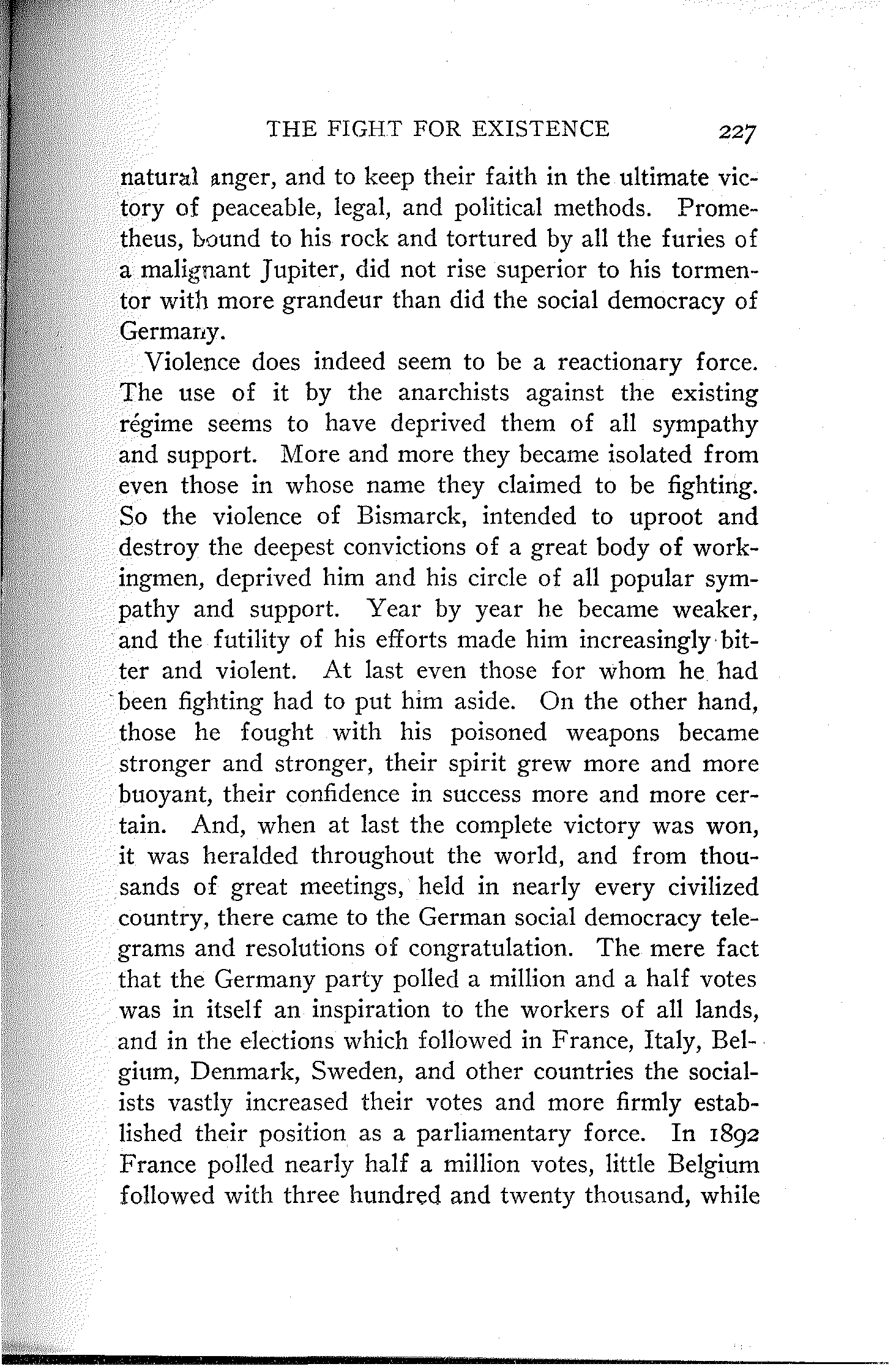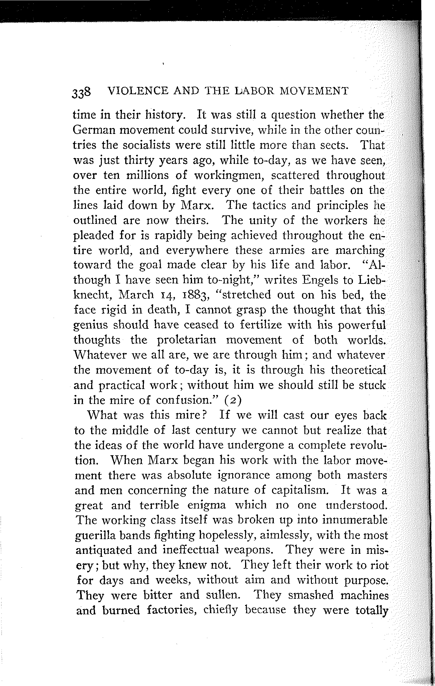 The socialist idea of revolution is quite a different one. Insurrection plays no necessary part in it, and no one sees more clearly than the socialist that nothing could prove more disastrous to the democratic cause than to have the present class conflict break into a civil war. If such a war becomes necessary, it will be in spite of the organized socialists, who, in every country of the world, not only seek to avoid, but actually condemn, riotous, tempestuous, and violent measures. Such measures do not fit into their philosophy, which sees, as the cause of our present intolerable social wrongs, not the malevolence of individuals or of classes, but the workings of certain economic laws. One can cut off the head of an individual, but it is not possible to cut off the head of an economic law. From the beginning of the modern socialist movement, this has been perfectly clear to the socialist, whose philosophy has taught him that appeals to violence tend, as Engels has pointed out, to obscure the understanding of the real development of things.