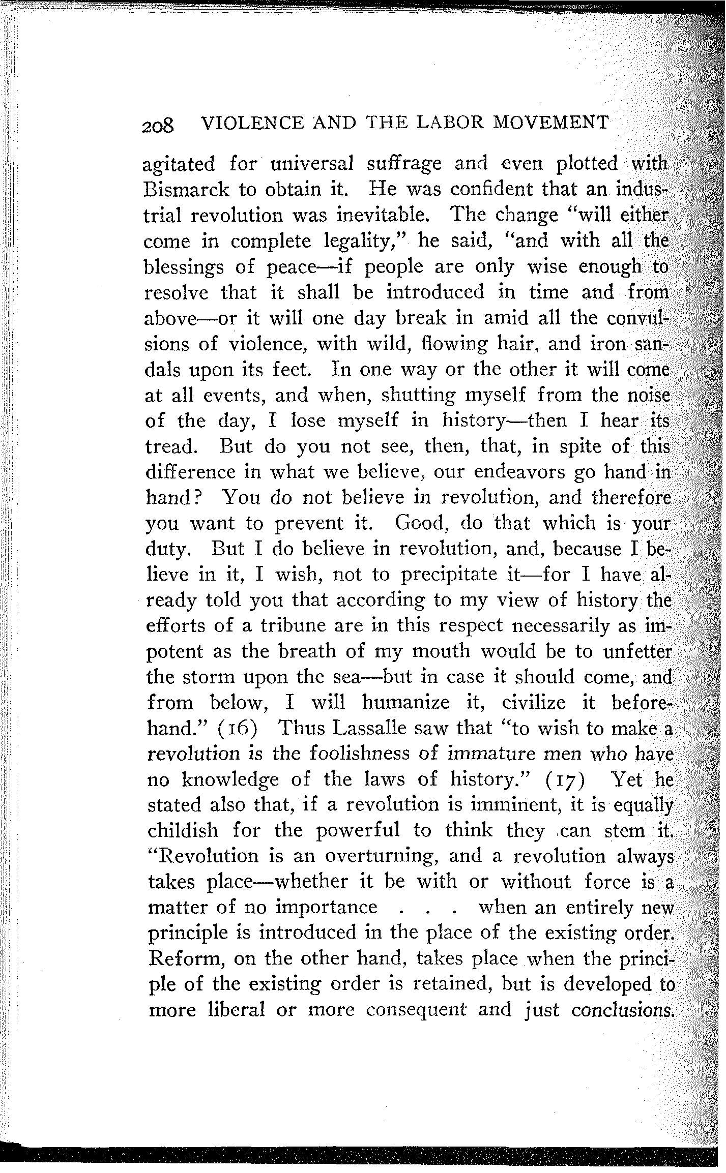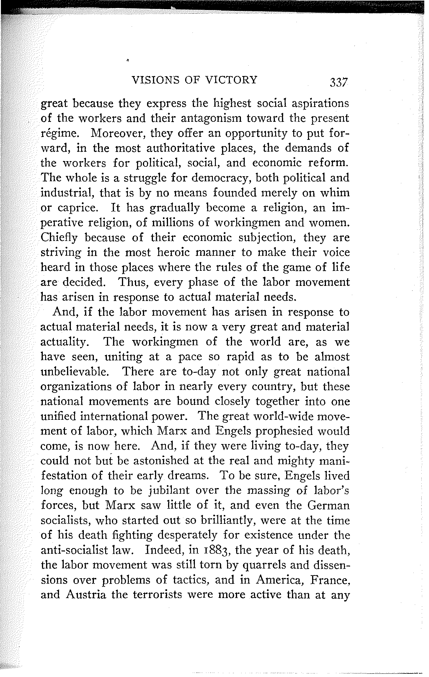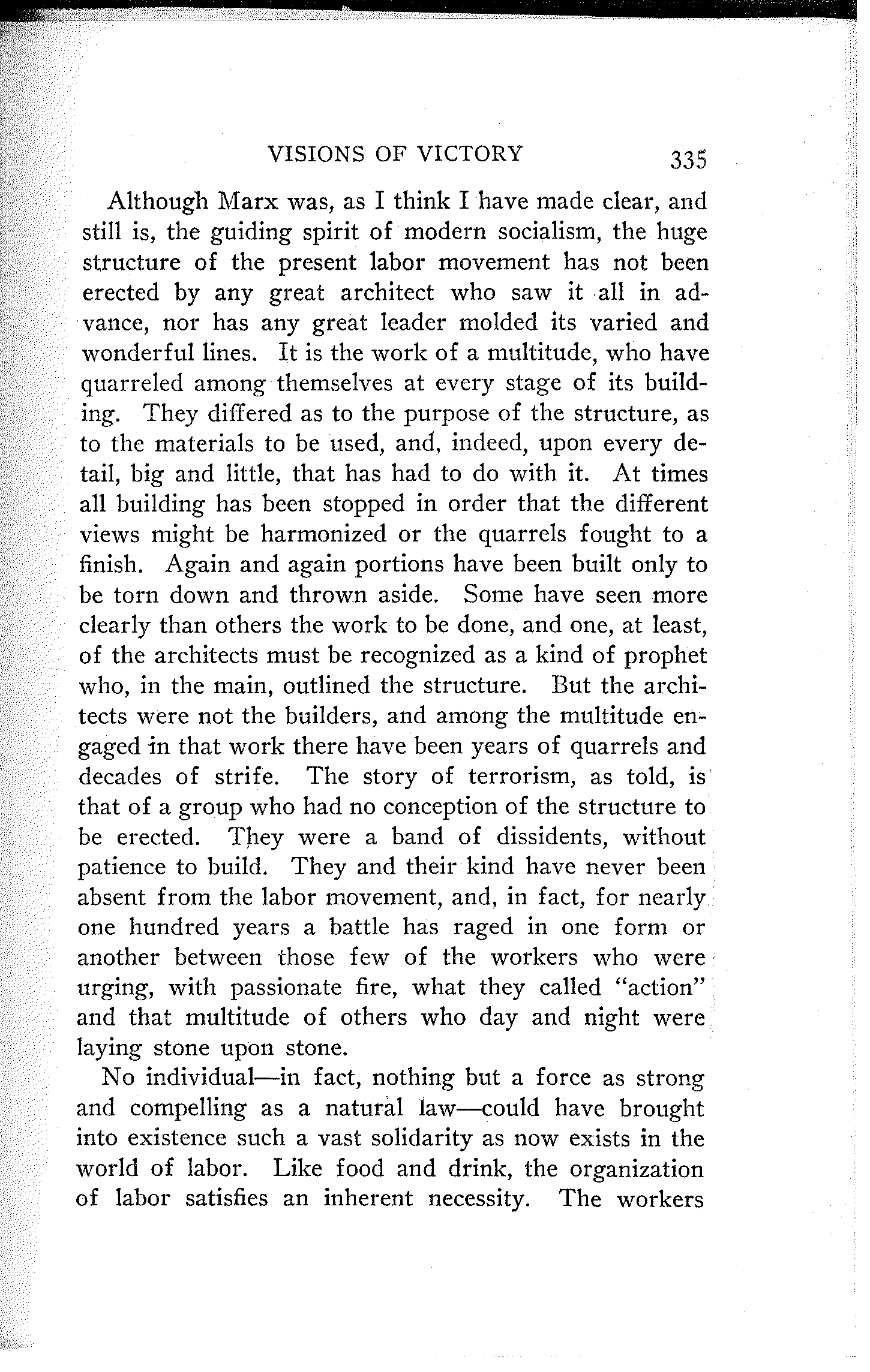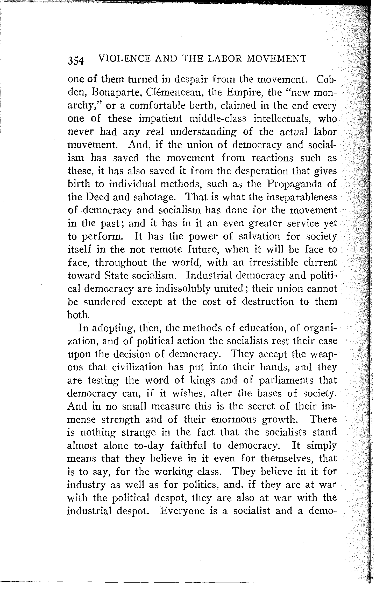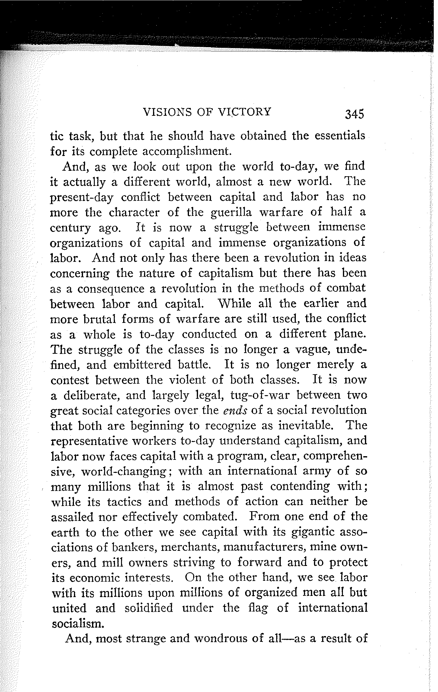 The socialist idea of revolution is quite a different one. Insurrection plays no necessary part in it, and no one sees more clearly than the socialist that nothing could prove more disastrous to the democratic cause than to have the present class conflict break into a civil war. If such a war becomes necessary, it will be in spite of the organized socialists, who, in every country of the world, not only seek to avoid, but actually condemn, riotous, tempestuous, and violent measures. Such measures do not fit into their philosophy, which sees, as the cause of our present intolerable social wrongs, not the malevolence of individuals or of classes, but the workings of certain economic laws. One can cut off the head of an individual, but it is not possible to cut off the head of an economic law. From the beginning of the modern socialist movement, this has been perfectly clear to the socialist, whose philosophy has taught him that appeals to violence tend, as Engels has pointed out, to obscure the understanding of the real development of things.