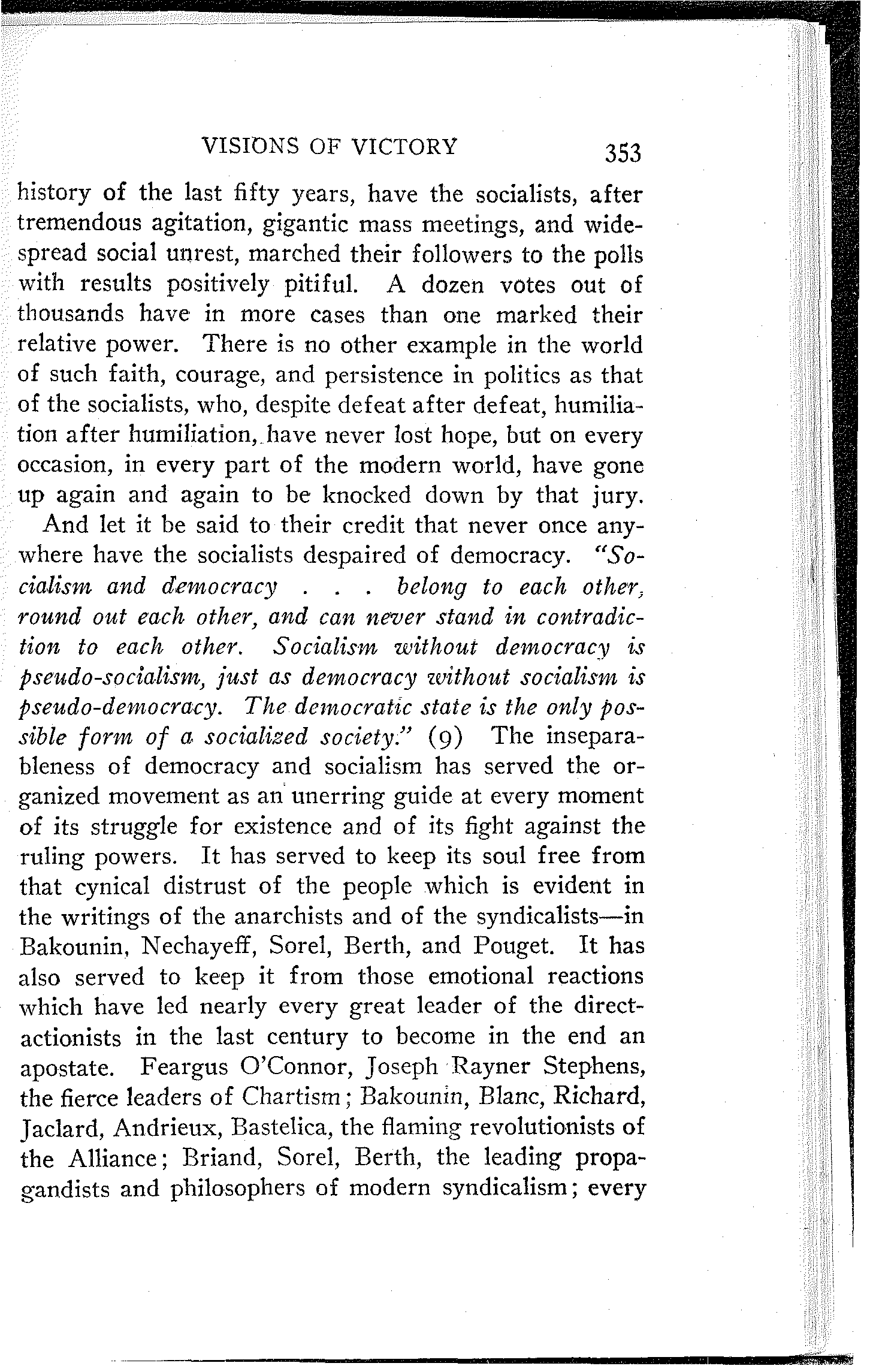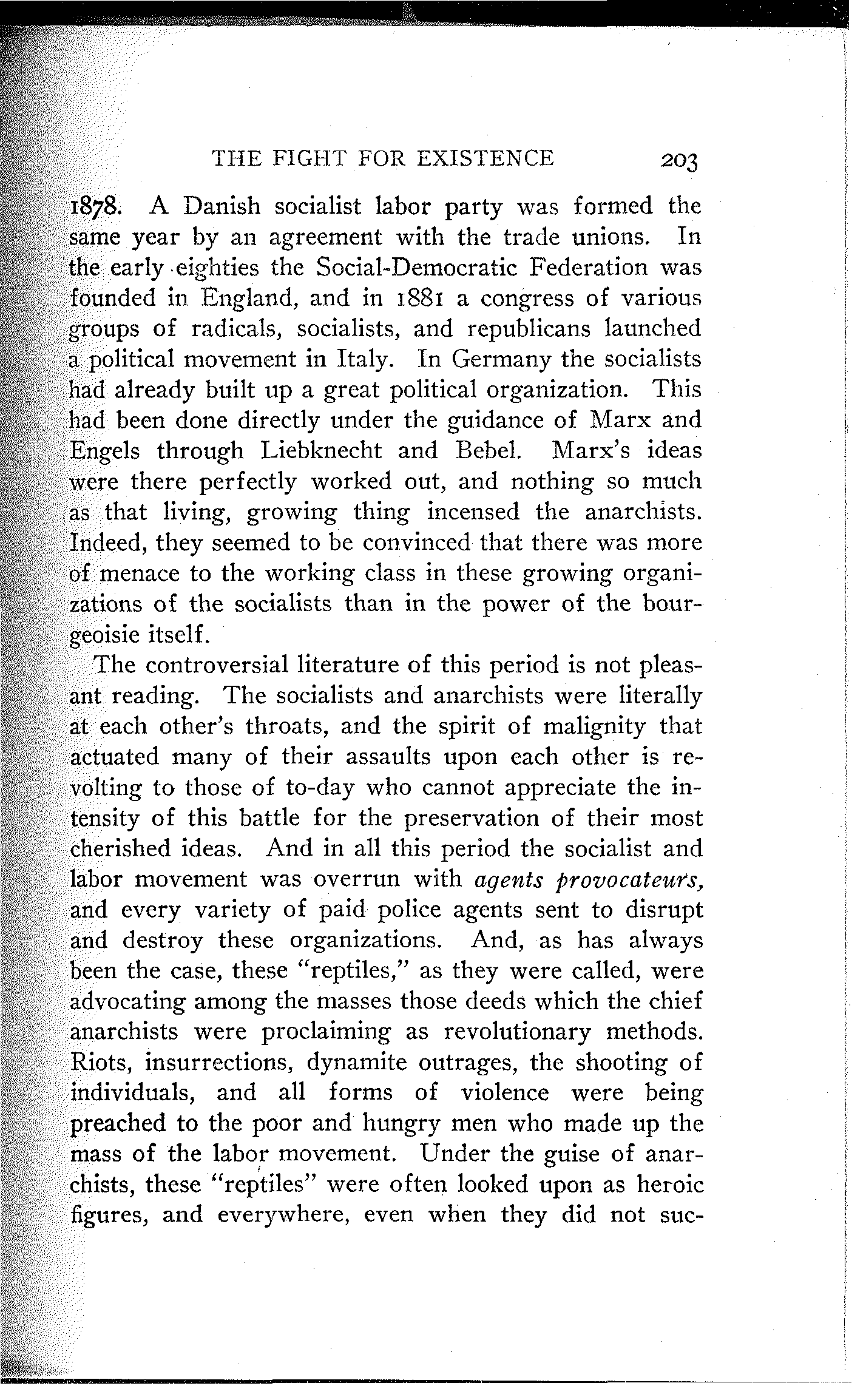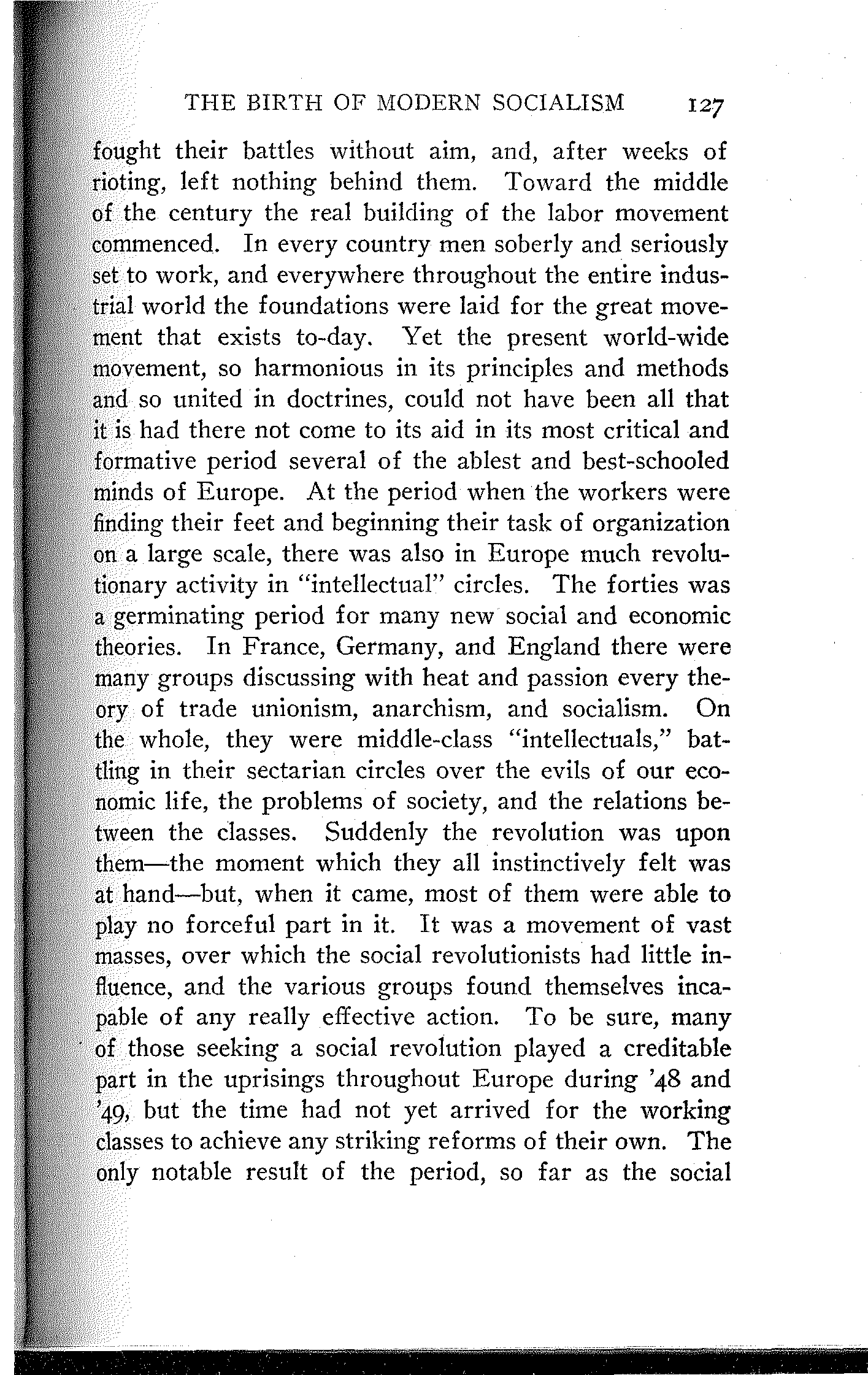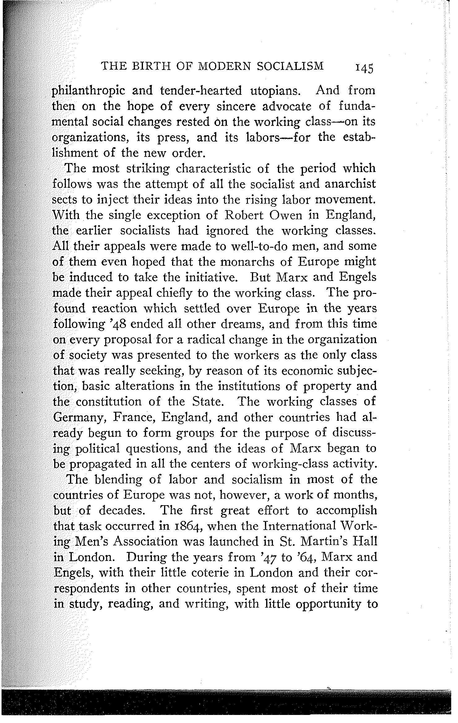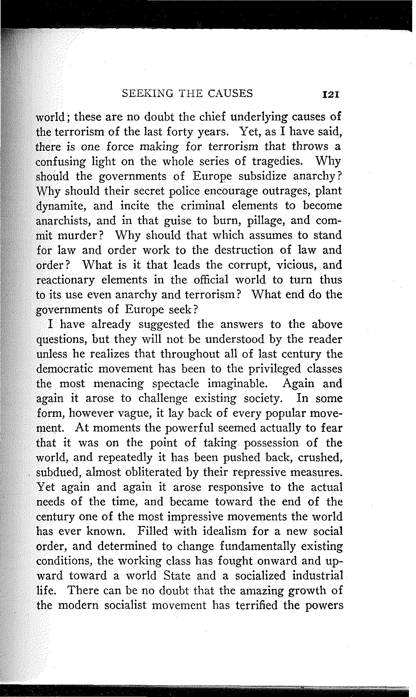 The socialist idea of revolution is quite a different one. Insurrection plays no necessary part in it, and no one sees more clearly than the socialist that nothing could prove more disastrous to the democratic cause than to have the present class conflict break into a civil war. If such a war becomes necessary, it will be in spite of the organized socialists, who, in every country of the world, not only seek to avoid, but actually condemn, riotous, tempestuous, and violent measures. Such measures do not fit into their philosophy, which sees, as the cause of our present intolerable social wrongs, not the malevolence of individuals or of classes, but the workings of certain economic laws. One can cut off the head of an individual, but it is not possible to cut off the head of an economic law. From the beginning of the modern socialist movement, this has been perfectly clear to the socialist, whose philosophy has taught him that appeals to violence tend, as Engels has pointed out, to obscure the understanding of the real development of things.