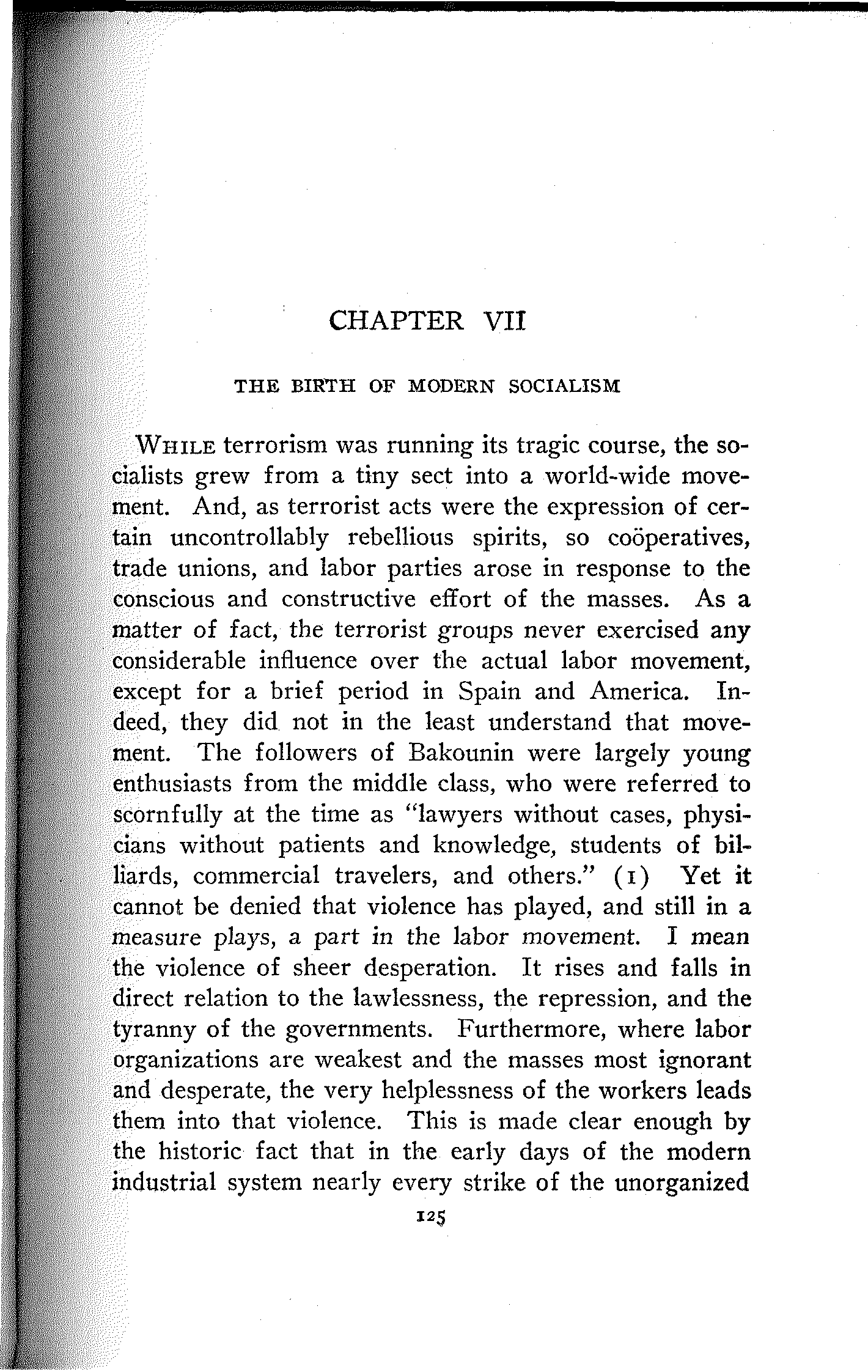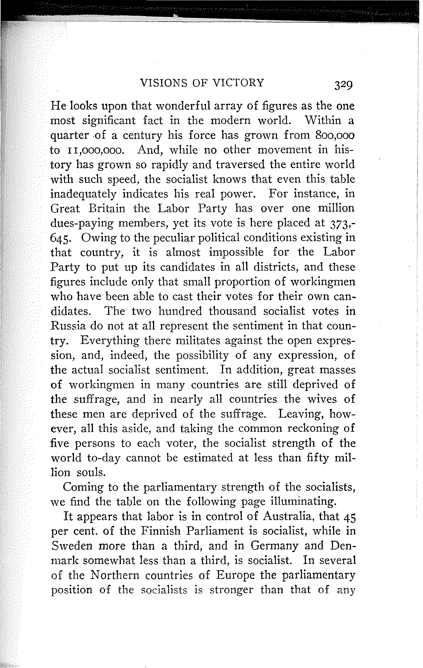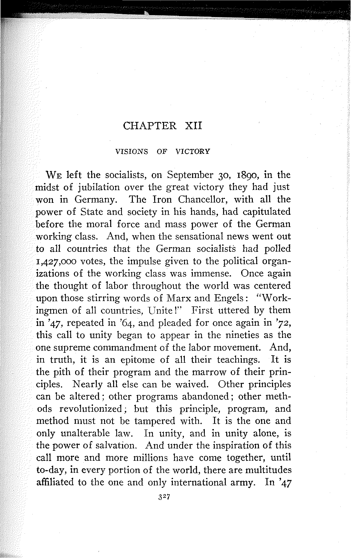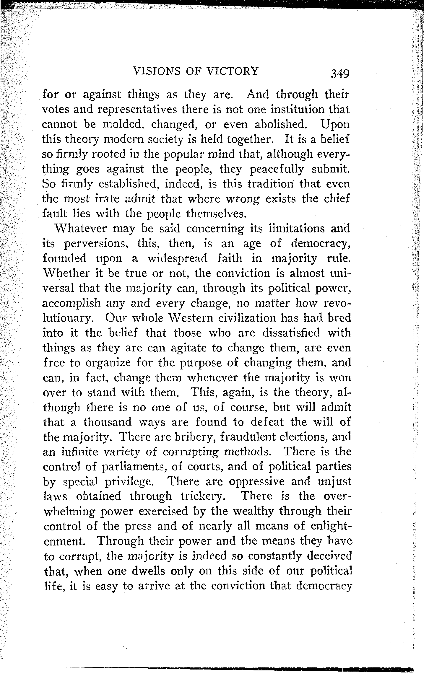 The socialist idea of revolution is quite a different one. Insurrection plays no necessary part in it, and no one sees more clearly than the socialist that nothing could prove more disastrous to the democratic cause than to have the present class conflict break into a civil war. If such a war becomes necessary, it will be in spite of the organized socialists, who, in every country of the world, not only seek to avoid, but actually condemn, riotous, tempestuous, and violent measures. Such measures do not fit into their philosophy, which sees, as the cause of our present intolerable social wrongs, not the malevolence of individuals or of classes, but the workings of certain economic laws. One can cut off the head of an individual, but it is not possible to cut off the head of an economic law. From the beginning of the modern socialist movement, this has been perfectly clear to the socialist, whose philosophy has taught him that appeals to violence tend, as Engels has pointed out, to obscure the understanding of the real development of things.