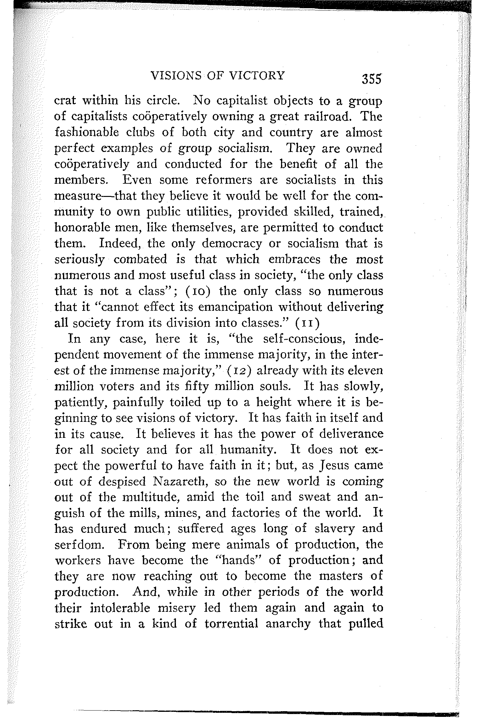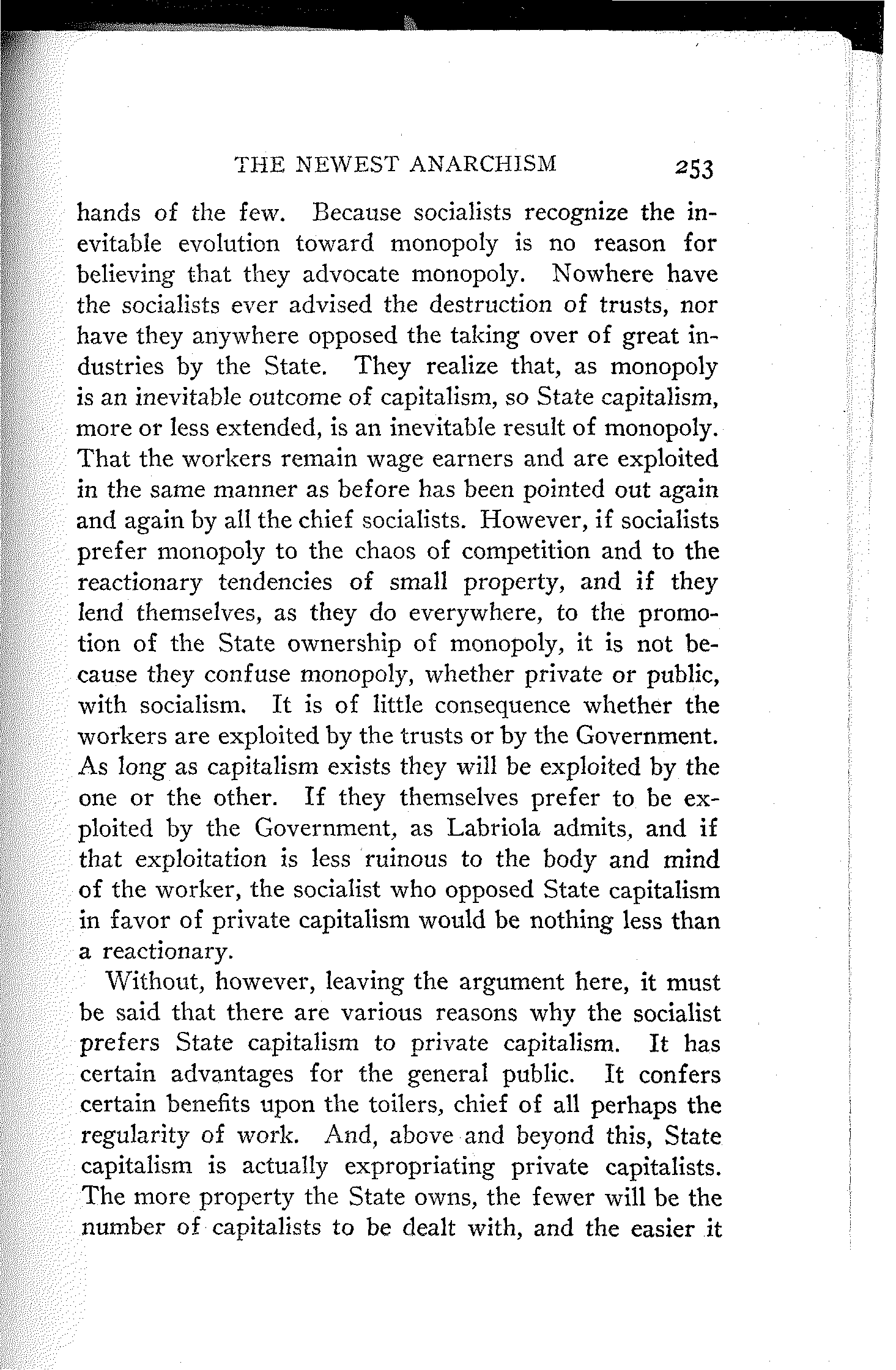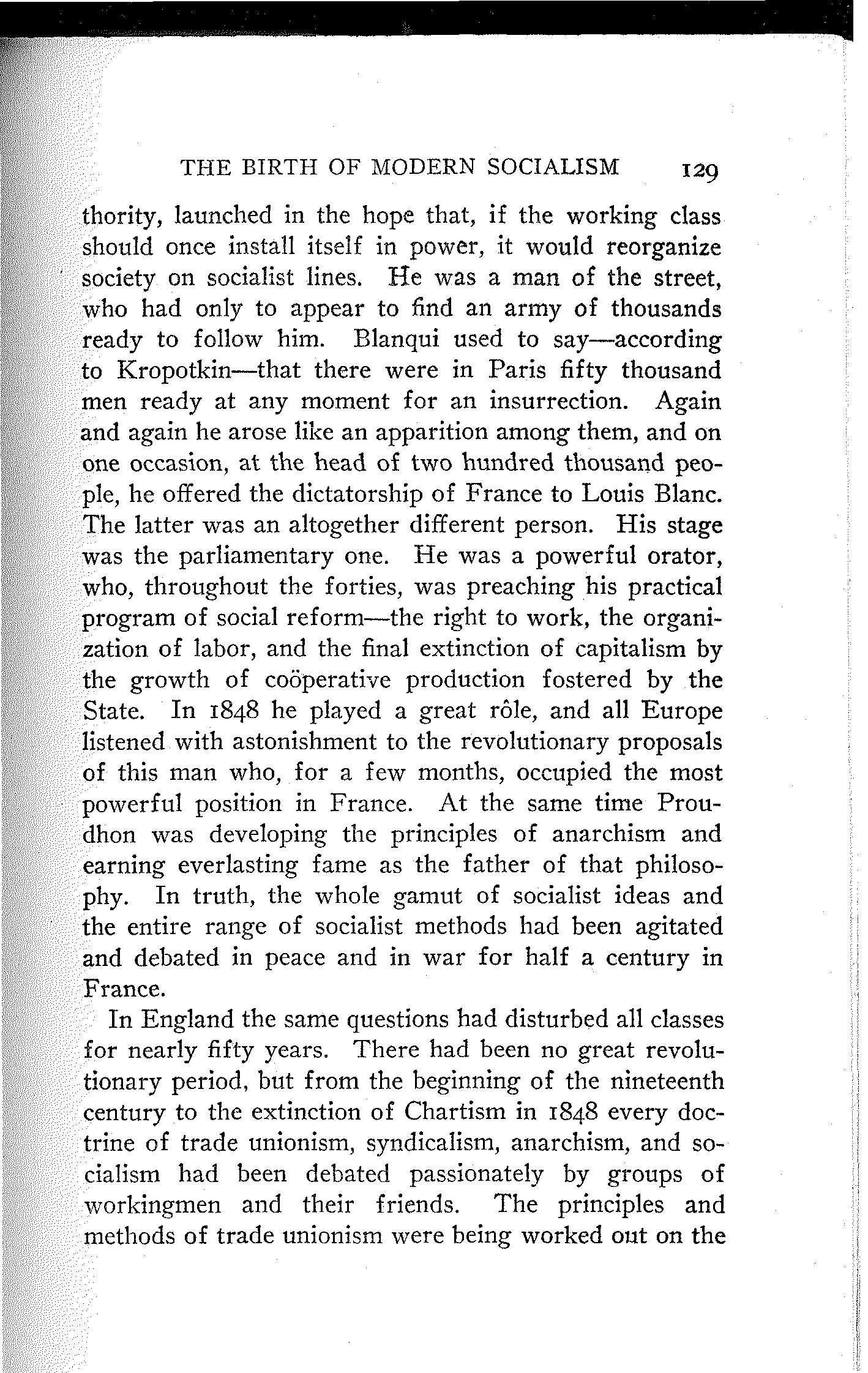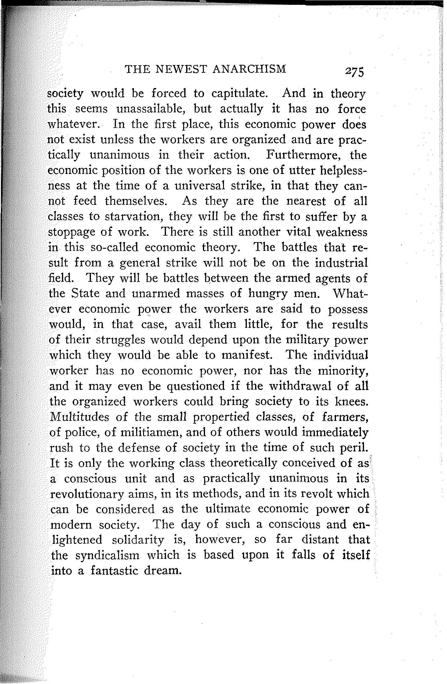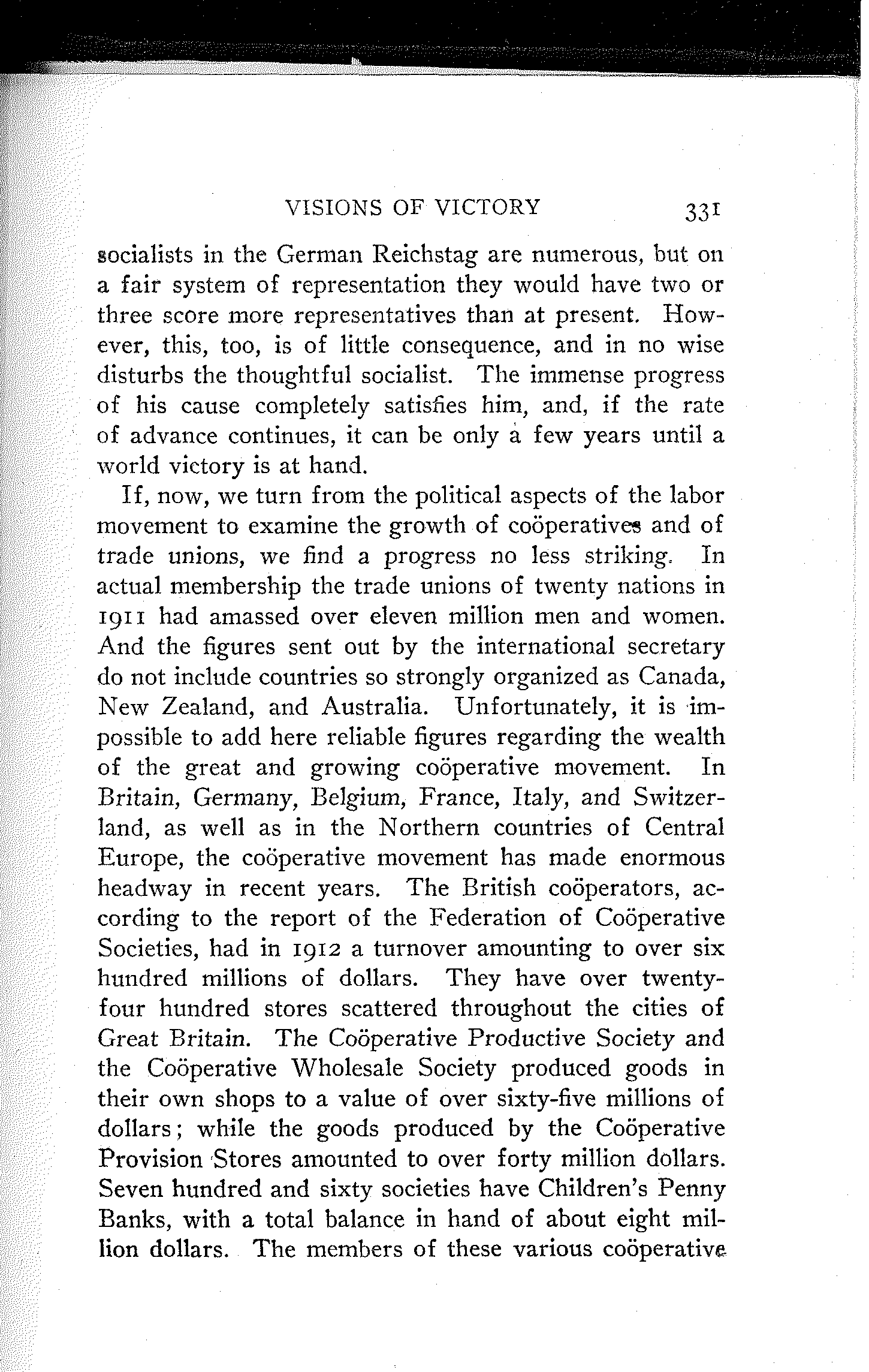 The socialist idea of revolution is quite a different one. Insurrection plays no necessary part in it, and no one sees more clearly than the socialist that nothing could prove more disastrous to the democratic cause than to have the present class conflict break into a civil war. If such a war becomes necessary, it will be in spite of the organized socialists, who, in every country of the world, not only seek to avoid, but actually condemn, riotous, tempestuous, and violent measures. Such measures do not fit into their philosophy, which sees, as the cause of our present intolerable social wrongs, not the malevolence of individuals or of classes, but the workings of certain economic laws. One can cut off the head of an individual, but it is not possible to cut off the head of an economic law. From the beginning of the modern socialist movement, this has been perfectly clear to the socialist, whose philosophy has taught him that appeals to violence tend, as Engels has pointed out, to obscure the understanding of the real development of things.