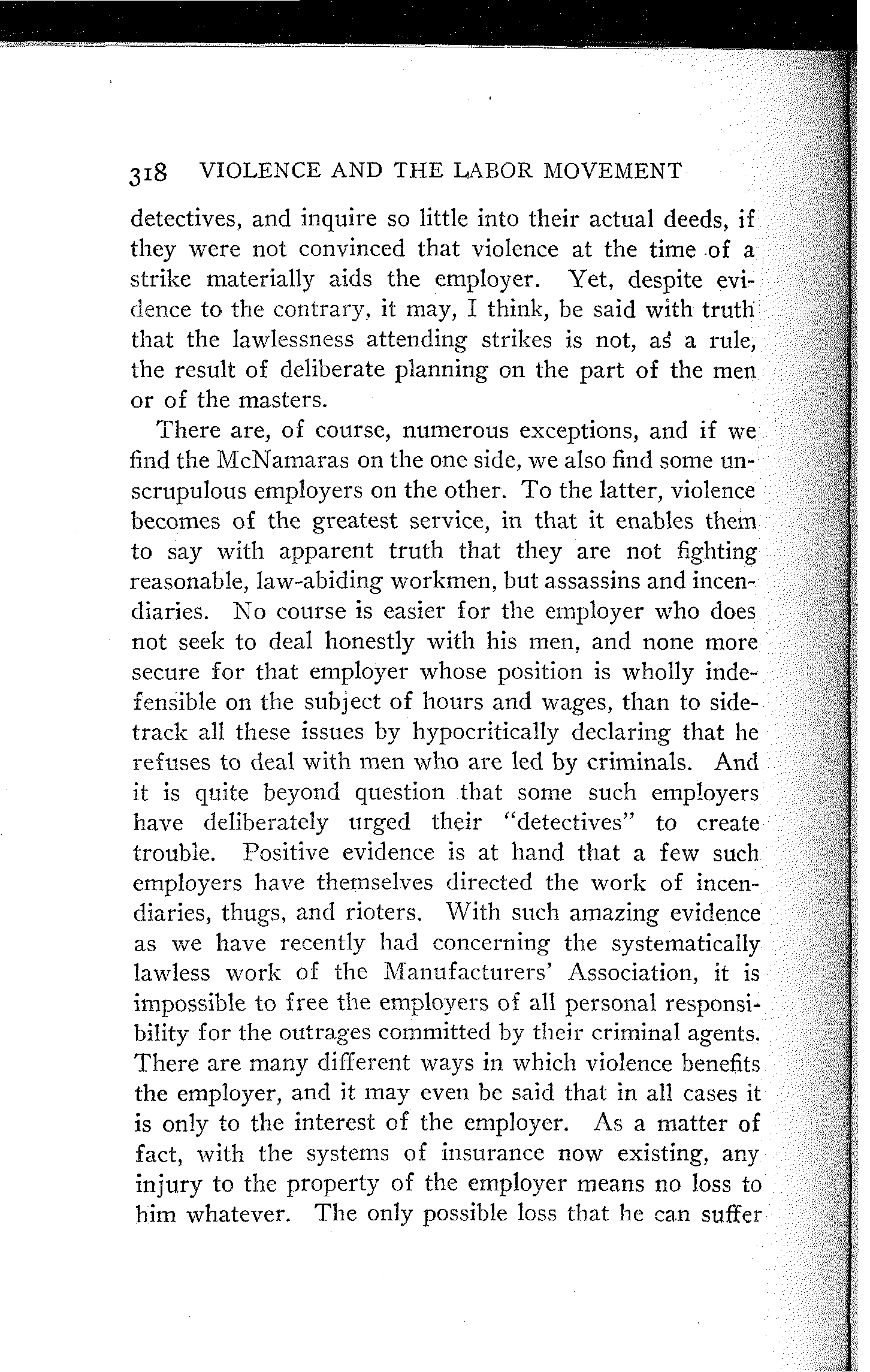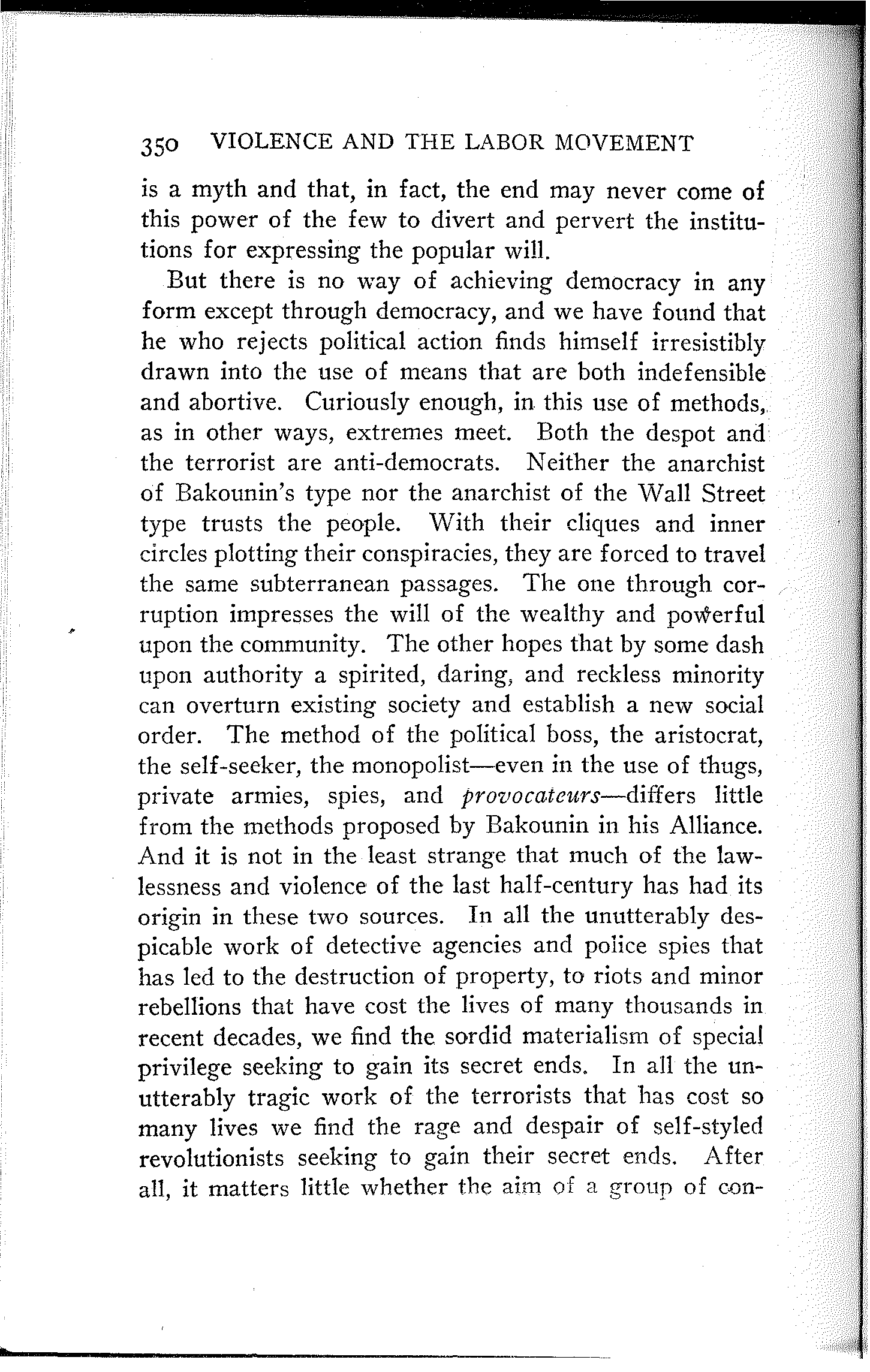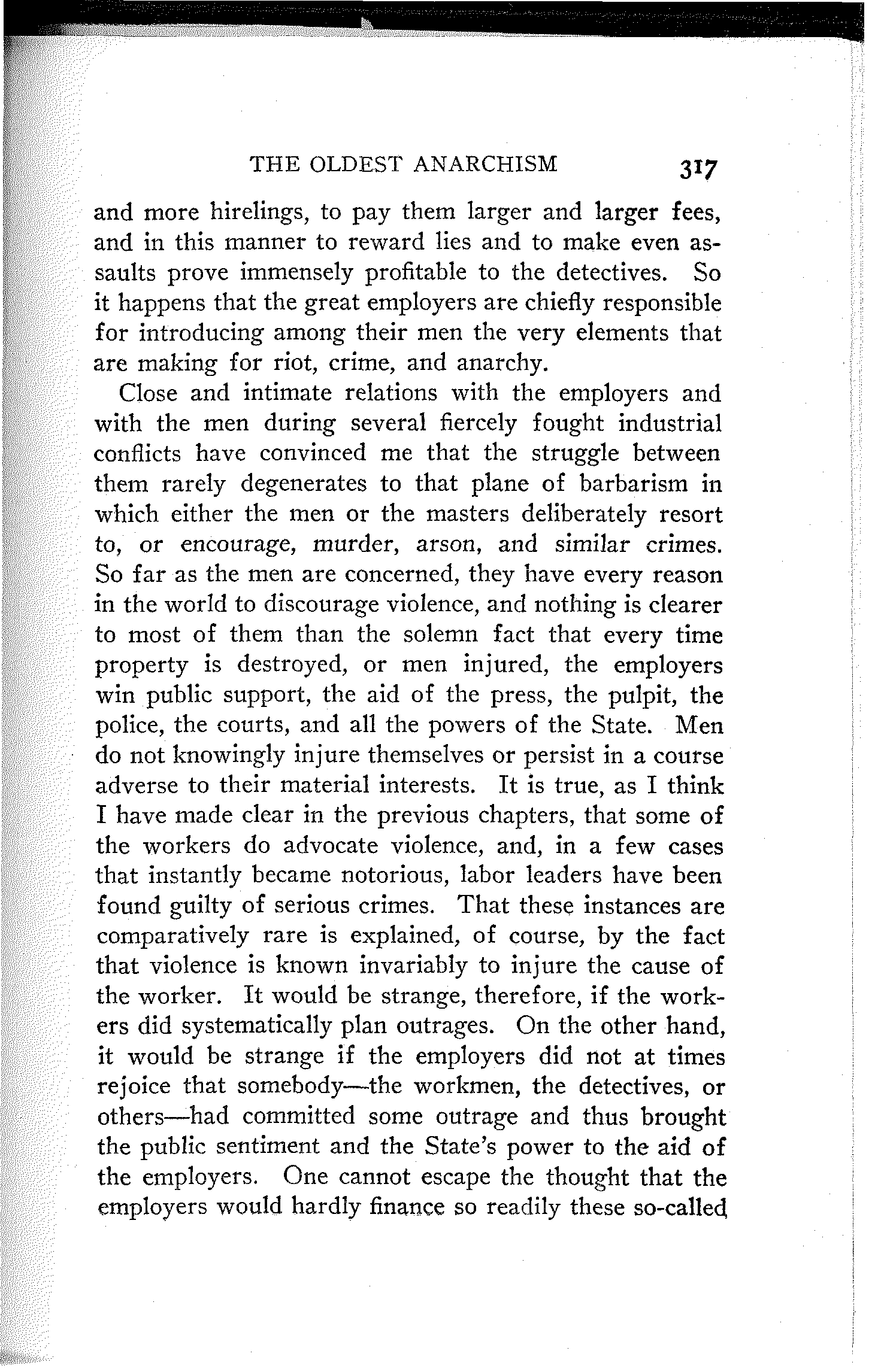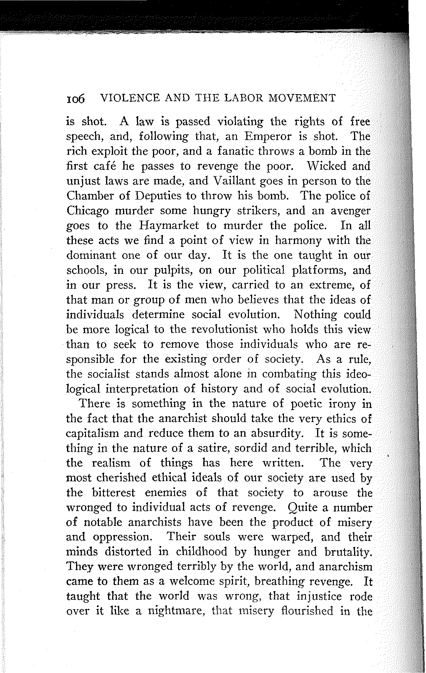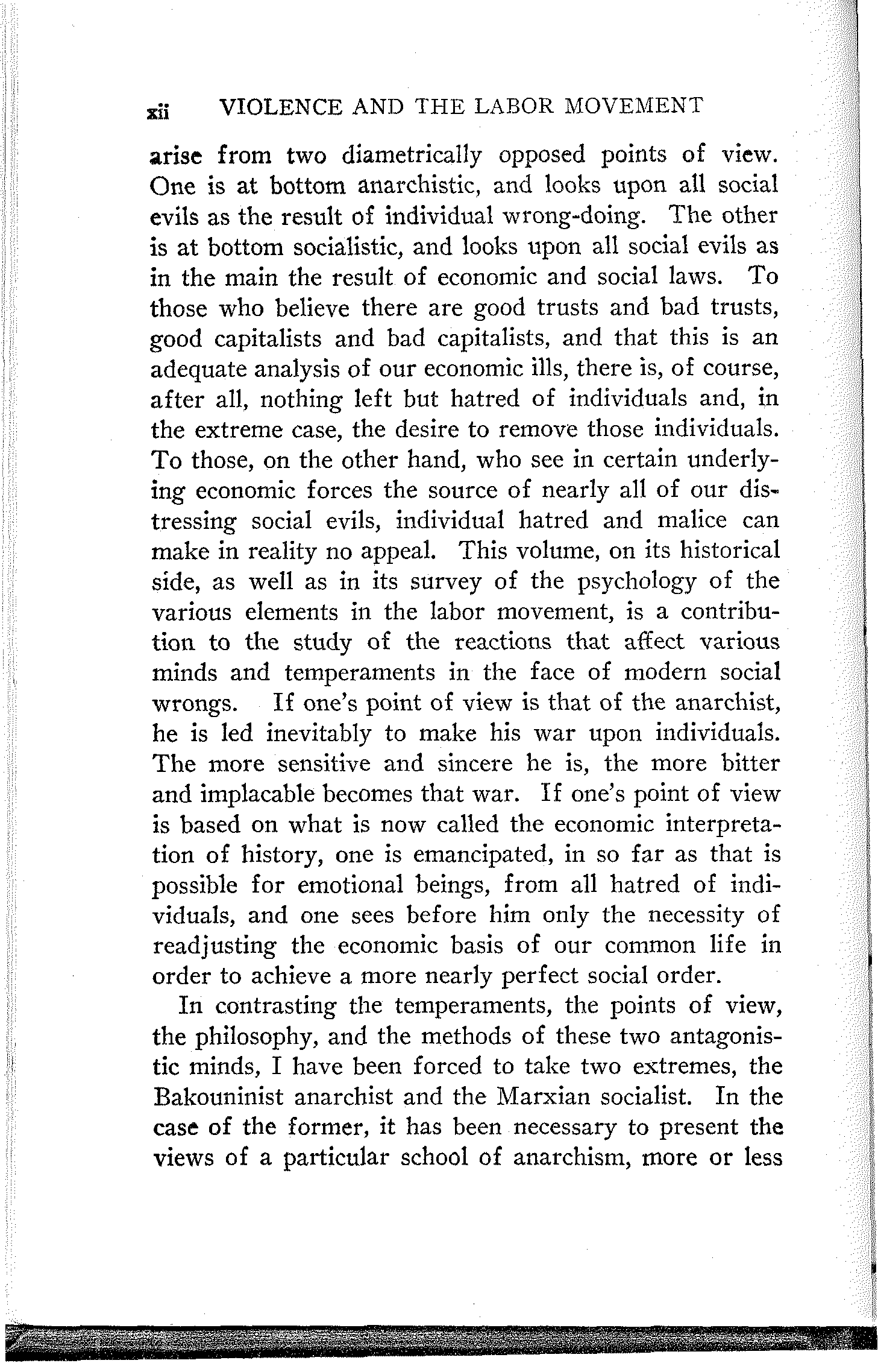 The dissensions over the use of force, that have been so continuous and passionate in the labor movement,[xii] arise from two diametrically opposed points of view. One is at bottom anarchistic, and looks upon all social evils as the result of individual wrong-doing. The other is at bottom socialistic, and looks upon all social evils as in the main the result of economic and social laws. To those who believe there are good trusts and bad trusts, good capitalists and bad capitalists, and that this is an adequate analysis of our economic ills, there is, of course, after all, nothing left but hatred of individuals and, in the extreme case, the desire to remove those individuals. To those, on the other hand, who see in certain underlying economic forces the source of nearly all of our distressing social evils, individual hatred and malice can make in reality no appeal. This volume, on its historical side, as well as in its survey of the psychology of the various elements in the labor movement, is a contribution to the study of the reactions that affect various minds and temperaments in the face of modern social wrongs. If one's point of view is that of the anarchist, he is led inevitably to make his war upon individuals. The more sensitive and sincere he is, the more bitter and implacable becomes that war. If one's point of view is based on what is now called the economic interpretation of history, one is emancipated, in so far as that is possible for emotional beings, from all hatred of individuals, and one sees before him only the necessity of readjusting the economic basis of our common life in order to achieve a more nearly perfect social order.