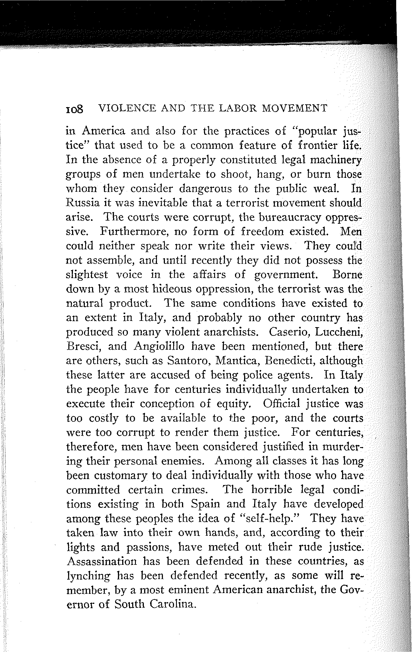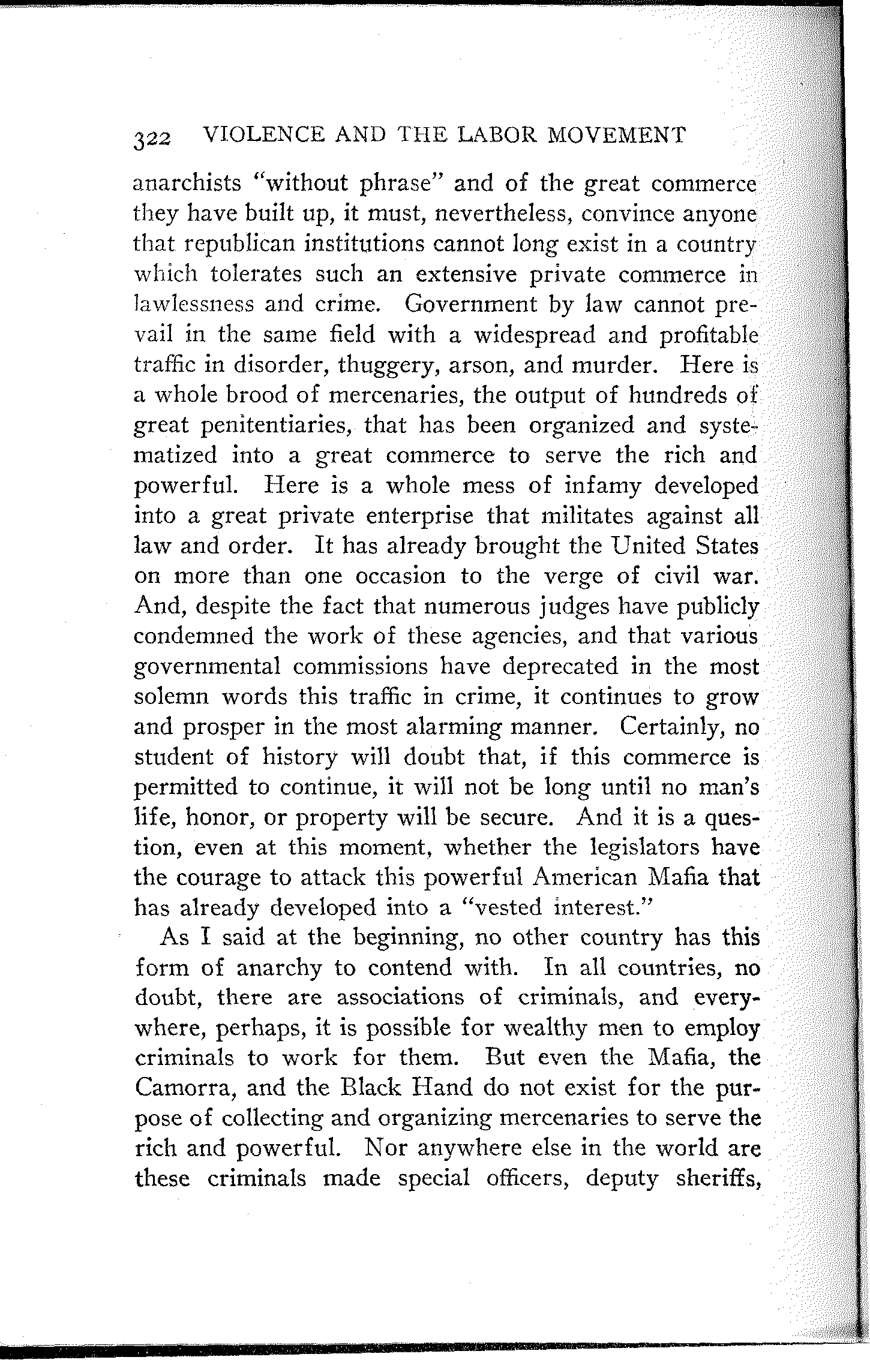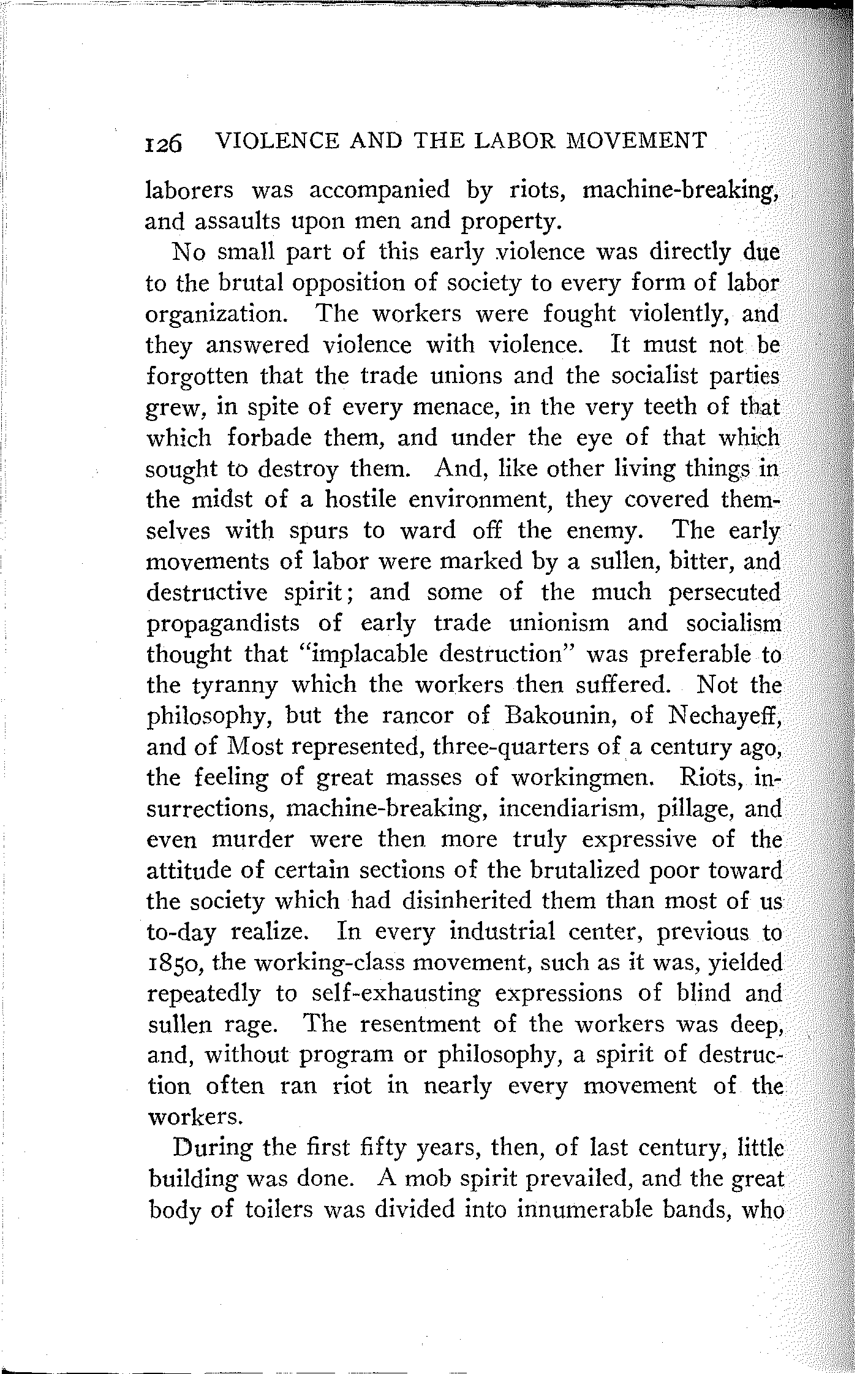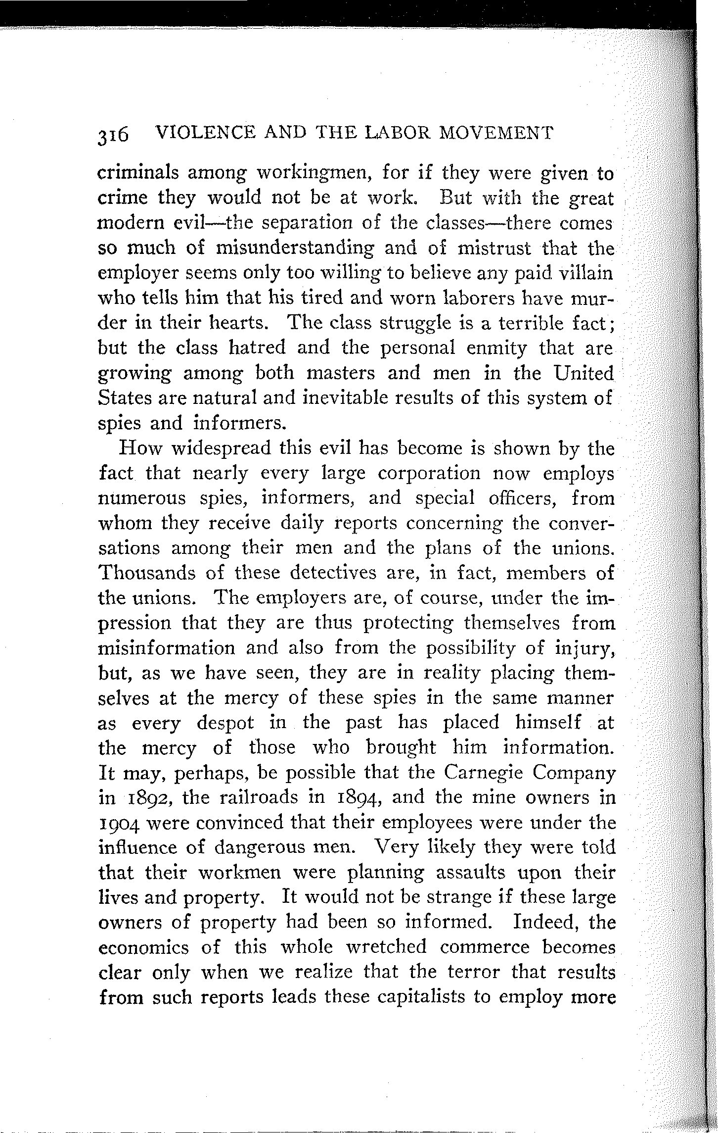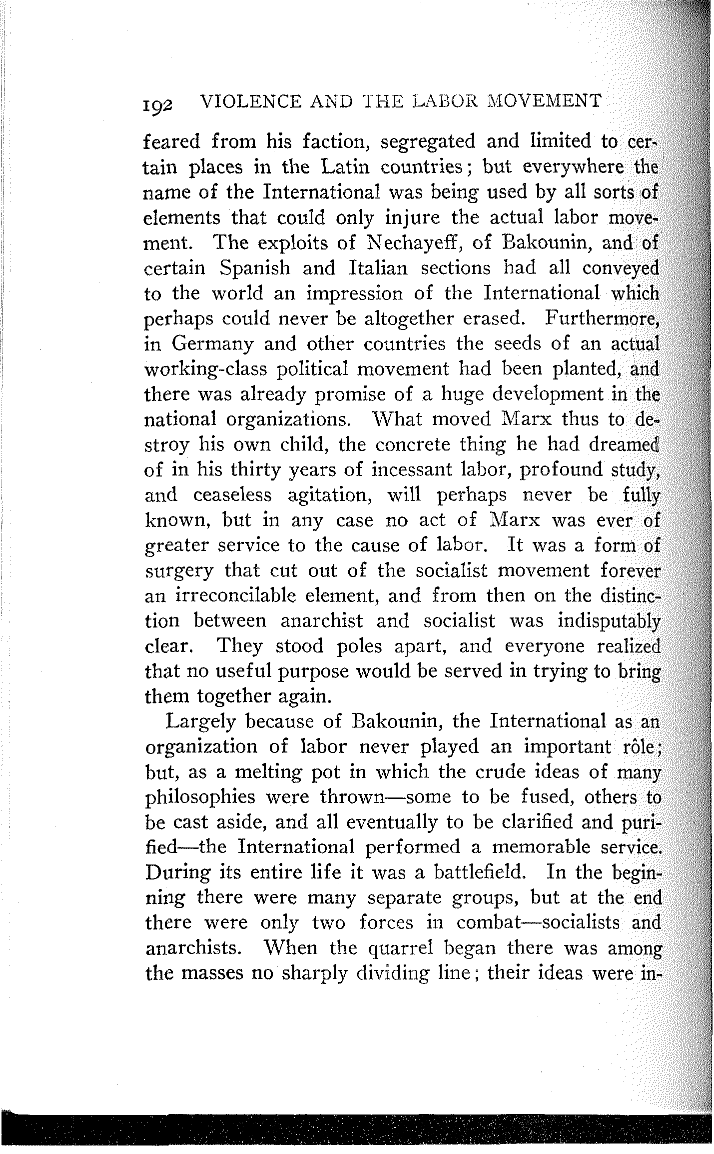 The dissensions over the use of force, that have been so continuous and passionate in the labor movement,[xii] arise from two diametrically opposed points of view. One is at bottom anarchistic, and looks upon all social evils as the result of individual wrong-doing. The other is at bottom socialistic, and looks upon all social evils as in the main the result of economic and social laws. To those who believe there are good trusts and bad trusts, good capitalists and bad capitalists, and that this is an adequate analysis of our economic ills, there is, of course, after all, nothing left but hatred of individuals and, in the extreme case, the desire to remove those individuals. To those, on the other hand, who see in certain underlying economic forces the source of nearly all of our distressing social evils, individual hatred and malice can make in reality no appeal. This volume, on its historical side, as well as in its survey of the psychology of the various elements in the labor movement, is a contribution to the study of the reactions that affect various minds and temperaments in the face of modern social wrongs. If one's point of view is that of the anarchist, he is led inevitably to make his war upon individuals. The more sensitive and sincere he is, the more bitter and implacable becomes that war. If one's point of view is based on what is now called the economic interpretation of history, one is emancipated, in so far as that is possible for emotional beings, from all hatred of individuals, and one sees before him only the necessity of readjusting the economic basis of our common life in order to achieve a more nearly perfect social order.