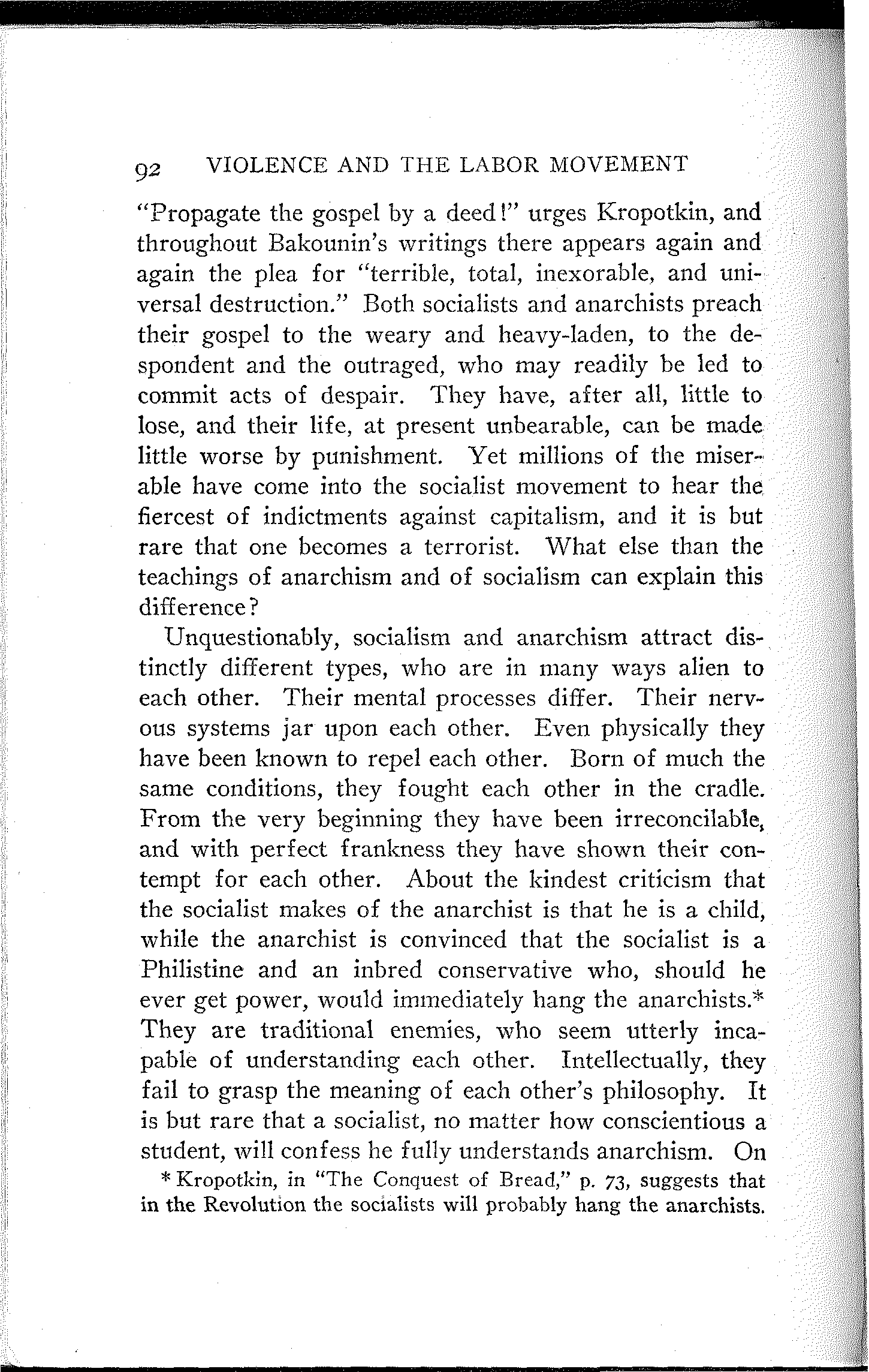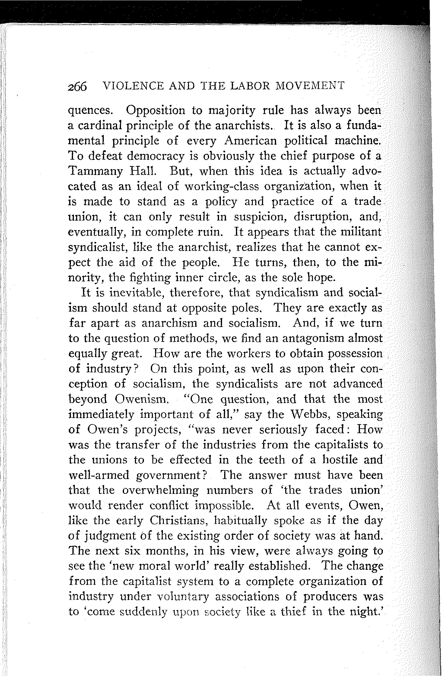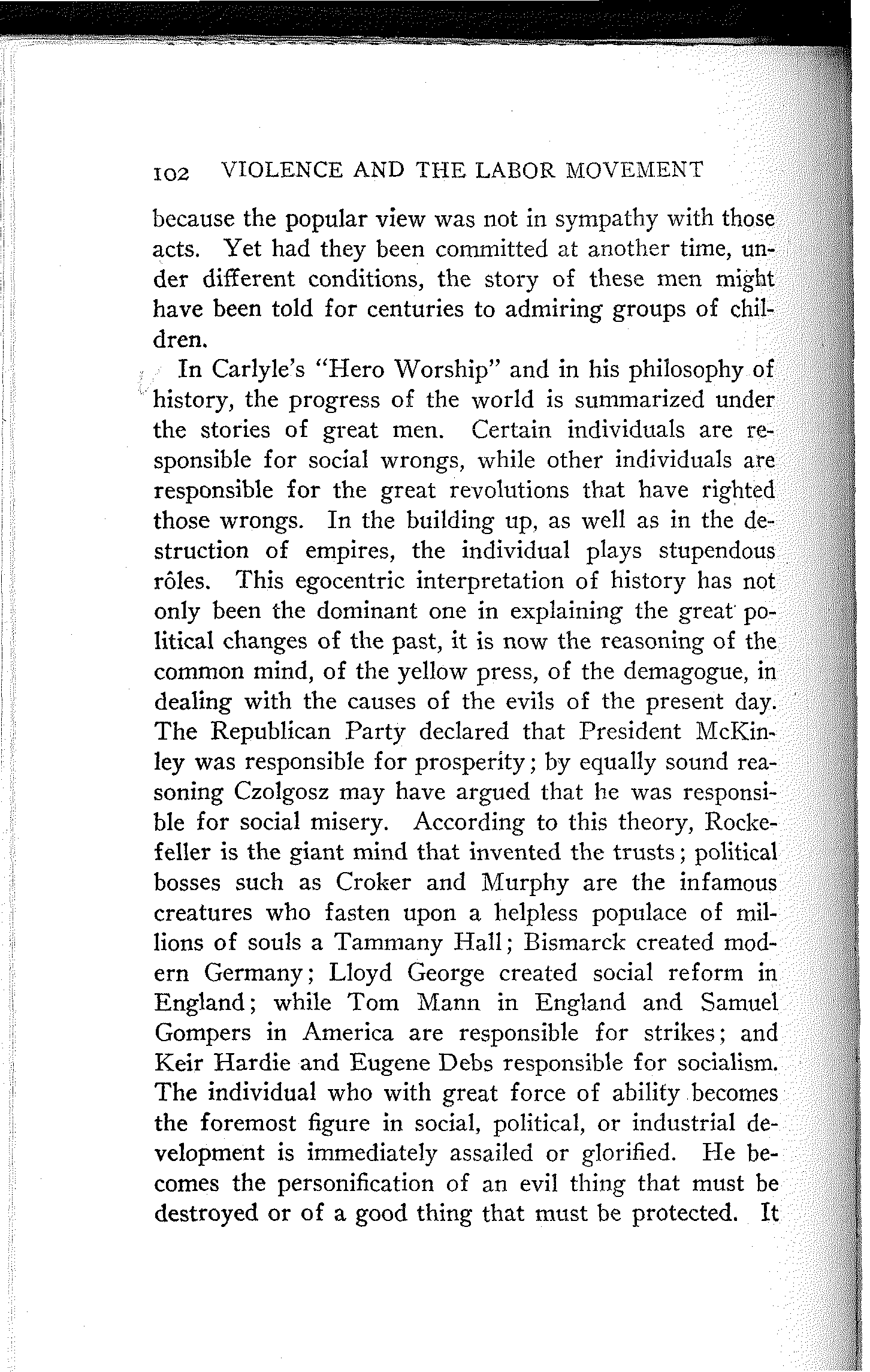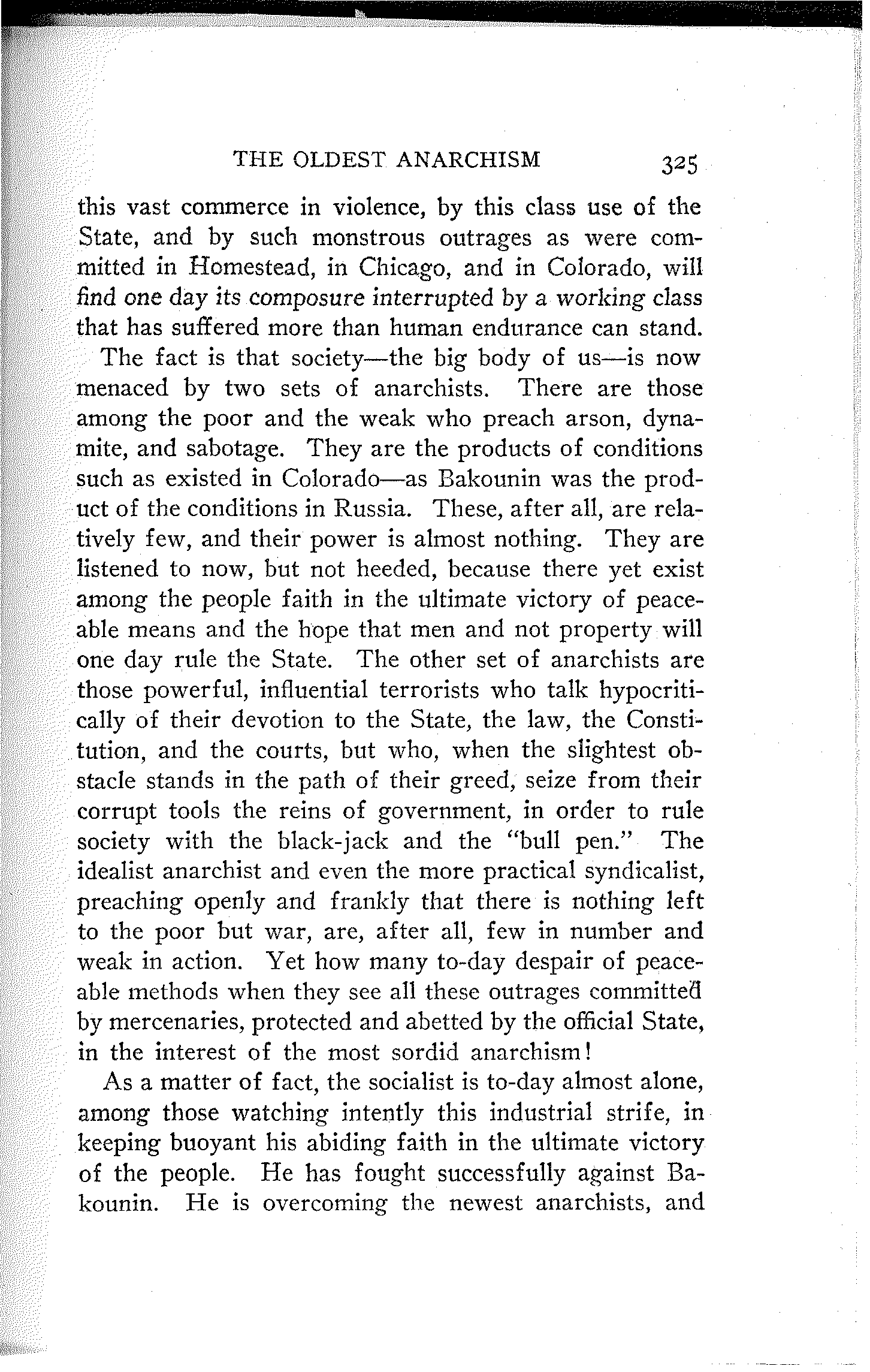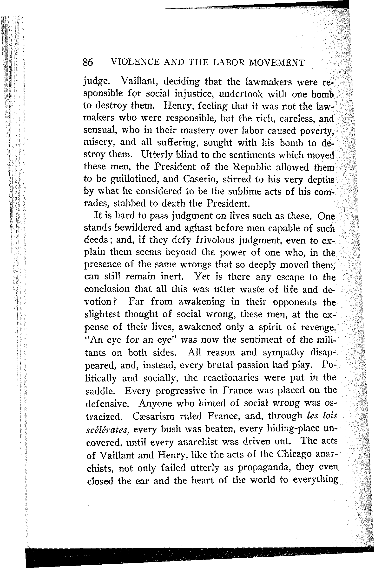 The dissensions over the use of force, that have been so continuous and passionate in the labor movement,[xii] arise from two diametrically opposed points of view. One is at bottom anarchistic, and looks upon all social evils as the result of individual wrong-doing. The other is at bottom socialistic, and looks upon all social evils as in the main the result of economic and social laws. To those who believe there are good trusts and bad trusts, good capitalists and bad capitalists, and that this is an adequate analysis of our economic ills, there is, of course, after all, nothing left but hatred of individuals and, in the extreme case, the desire to remove those individuals. To those, on the other hand, who see in certain underlying economic forces the source of nearly all of our distressing social evils, individual hatred and malice can make in reality no appeal. This volume, on its historical side, as well as in its survey of the psychology of the various elements in the labor movement, is a contribution to the study of the reactions that affect various minds and temperaments in the face of modern social wrongs. If one's point of view is that of the anarchist, he is led inevitably to make his war upon individuals. The more sensitive and sincere he is, the more bitter and implacable becomes that war. If one's point of view is based on what is now called the economic interpretation of history, one is emancipated, in so far as that is possible for emotional beings, from all hatred of individuals, and one sees before him only the necessity of readjusting the economic basis of our common life in order to achieve a more nearly perfect social order.