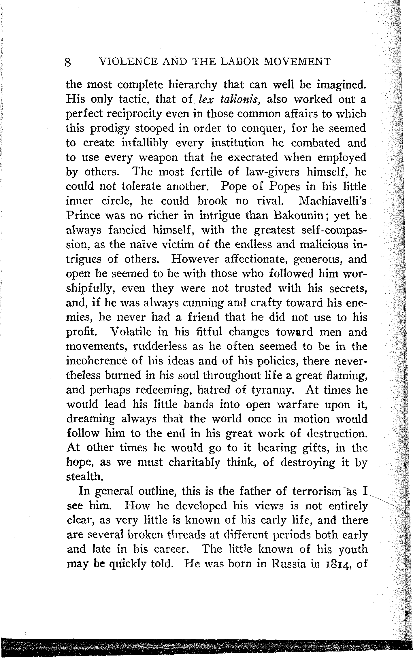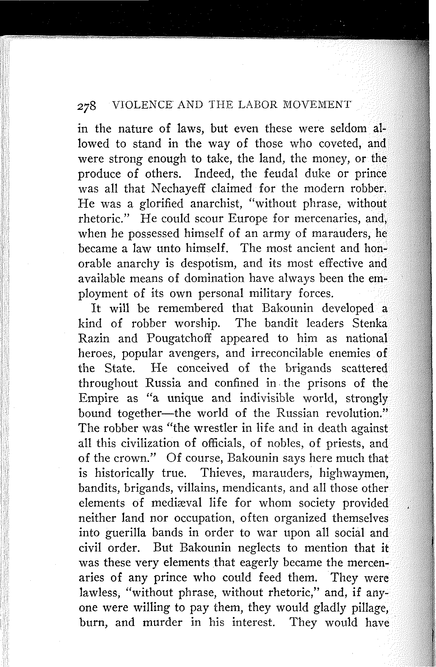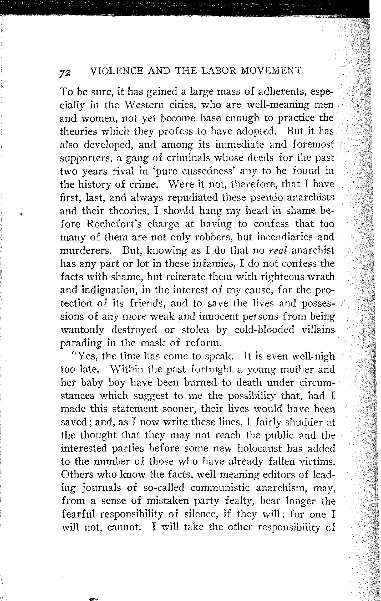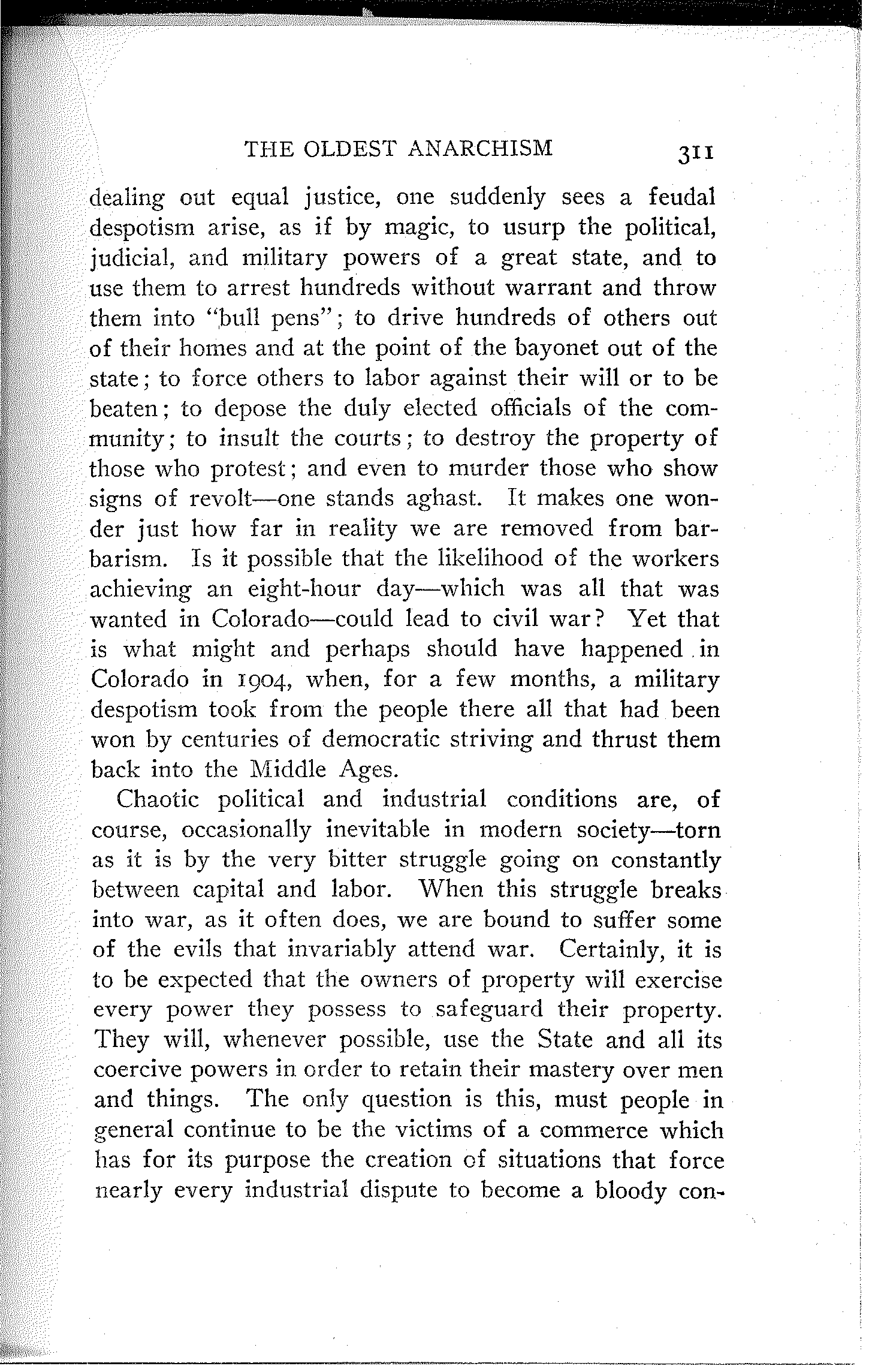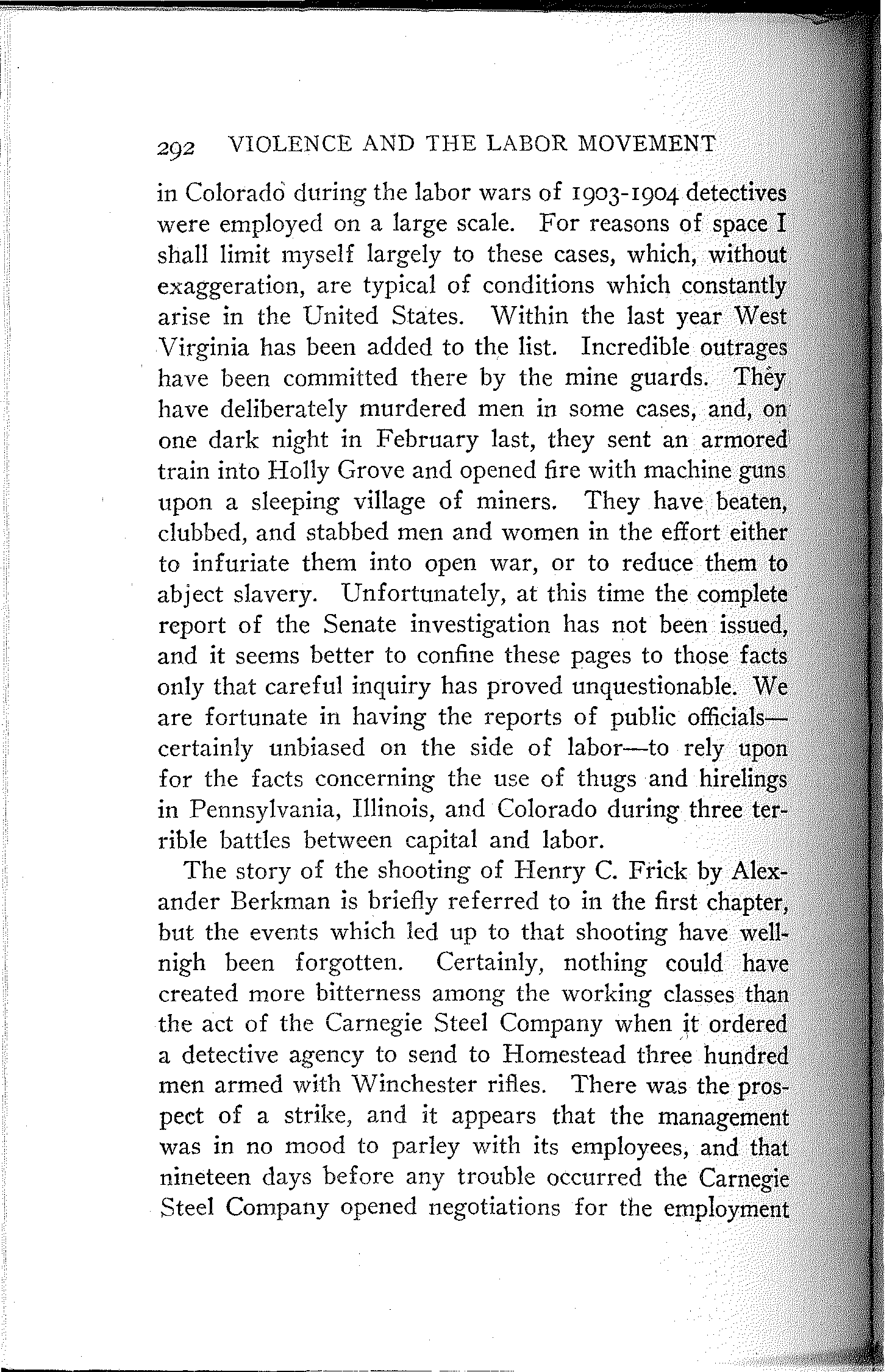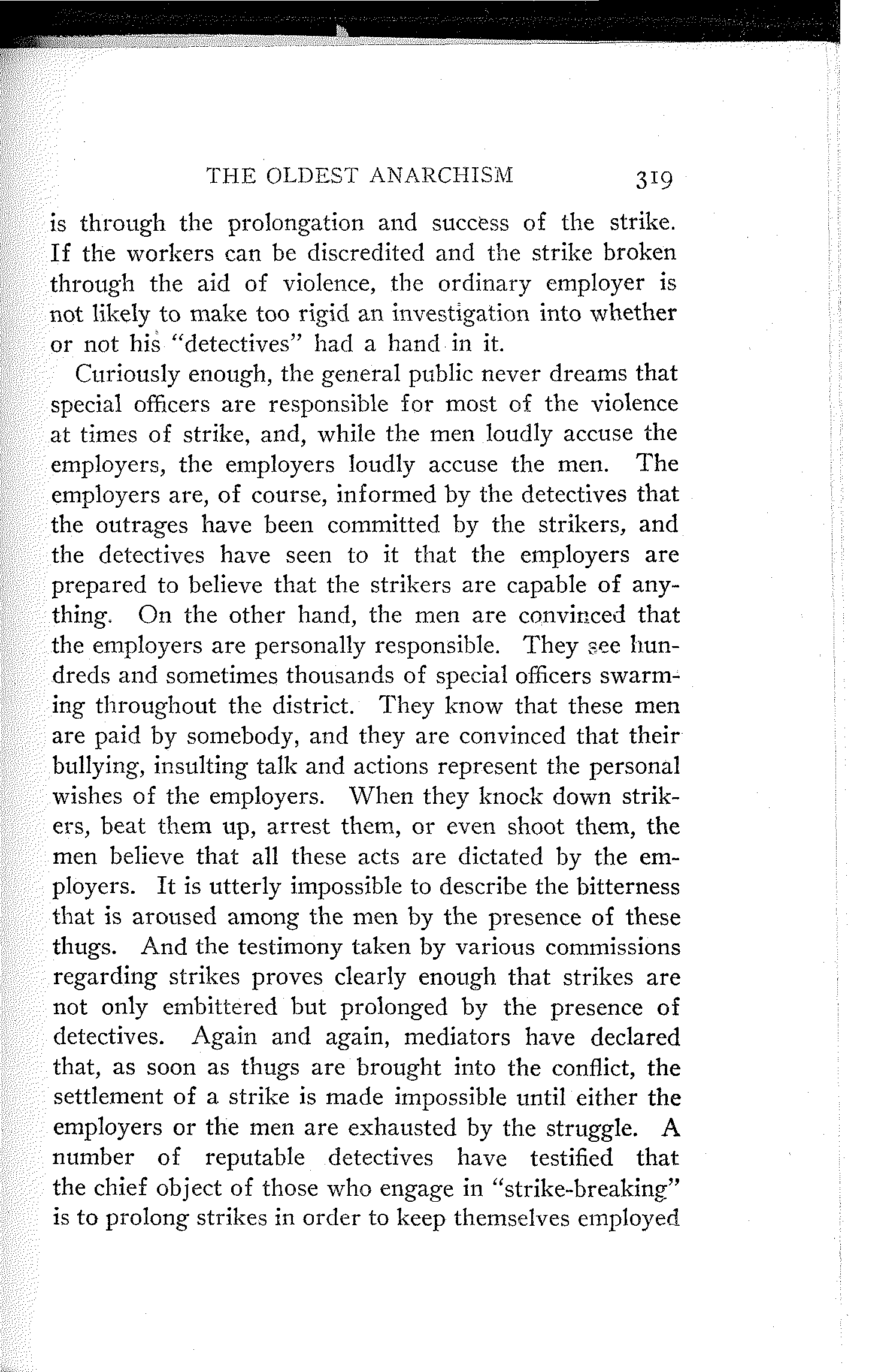 The dissensions over the use of force, that have been so continuous and passionate in the labor movement,[xii] arise from two diametrically opposed points of view. One is at bottom anarchistic, and looks upon all social evils as the result of individual wrong-doing. The other is at bottom socialistic, and looks upon all social evils as in the main the result of economic and social laws. To those who believe there are good trusts and bad trusts, good capitalists and bad capitalists, and that this is an adequate analysis of our economic ills, there is, of course, after all, nothing left but hatred of individuals and, in the extreme case, the desire to remove those individuals. To those, on the other hand, who see in certain underlying economic forces the source of nearly all of our distressing social evils, individual hatred and malice can make in reality no appeal. This volume, on its historical side, as well as in its survey of the psychology of the various elements in the labor movement, is a contribution to the study of the reactions that affect various minds and temperaments in the face of modern social wrongs. If one's point of view is that of the anarchist, he is led inevitably to make his war upon individuals. The more sensitive and sincere he is, the more bitter and implacable becomes that war. If one's point of view is based on what is now called the economic interpretation of history, one is emancipated, in so far as that is possible for emotional beings, from all hatred of individuals, and one sees before him only the necessity of readjusting the economic basis of our common life in order to achieve a more nearly perfect social order.