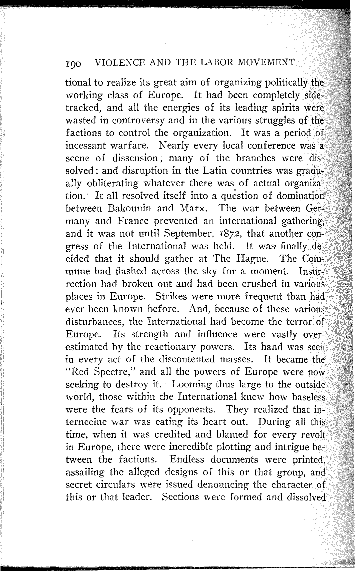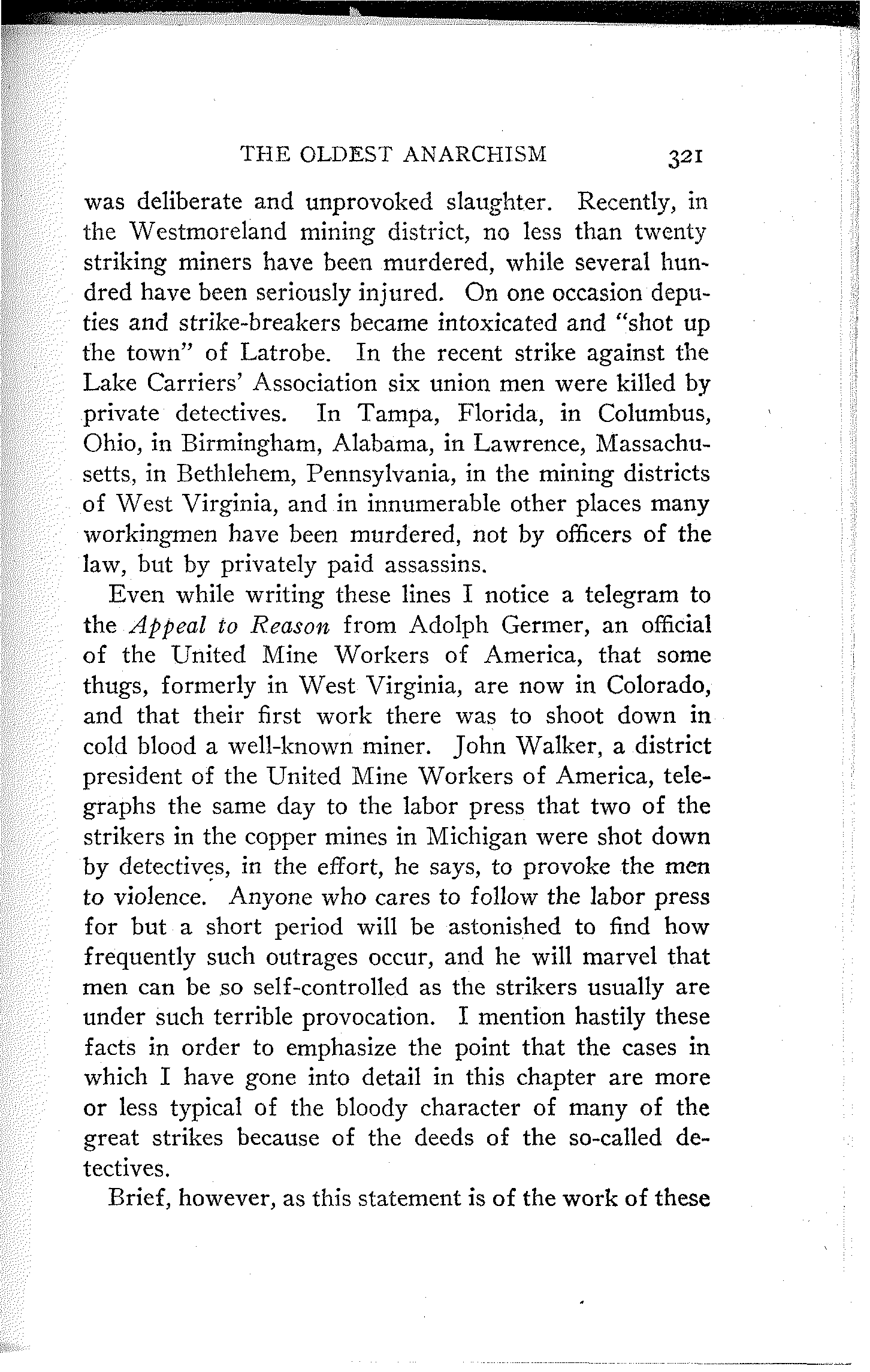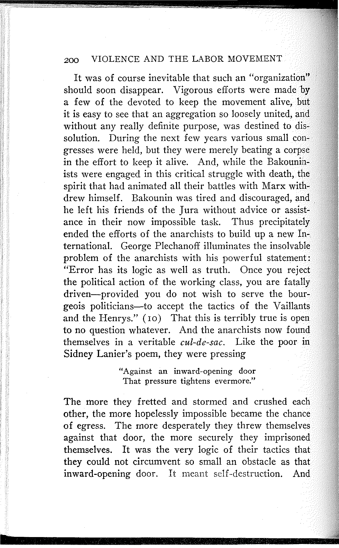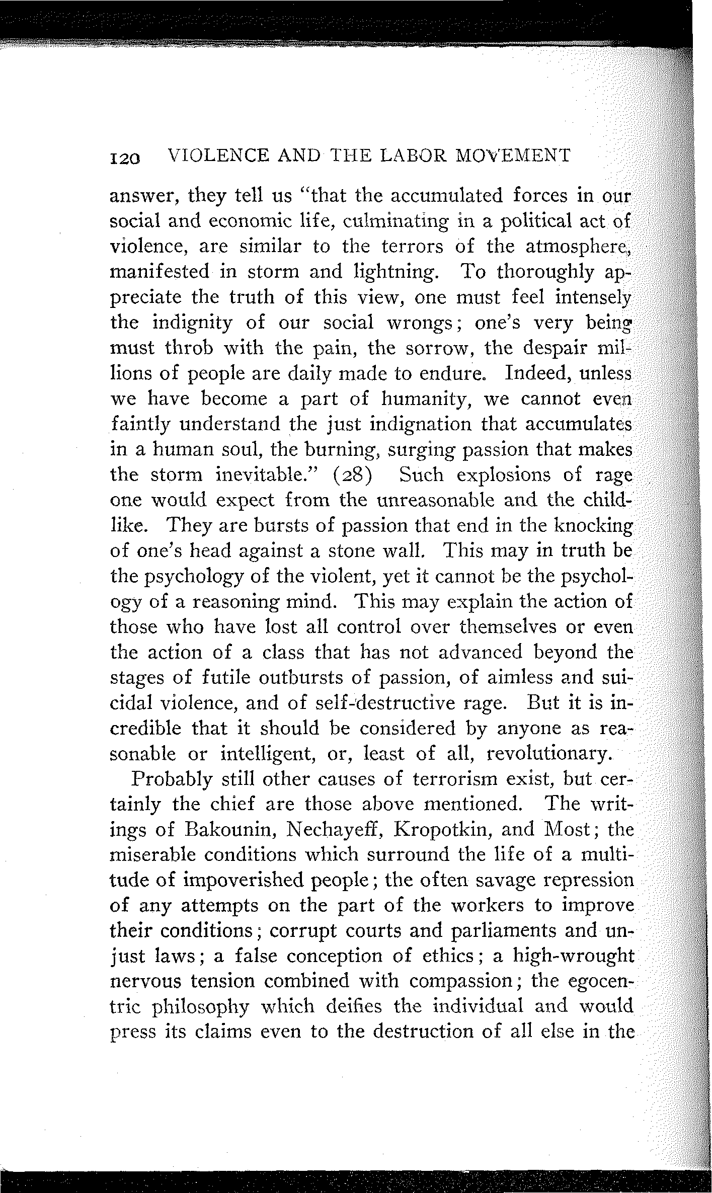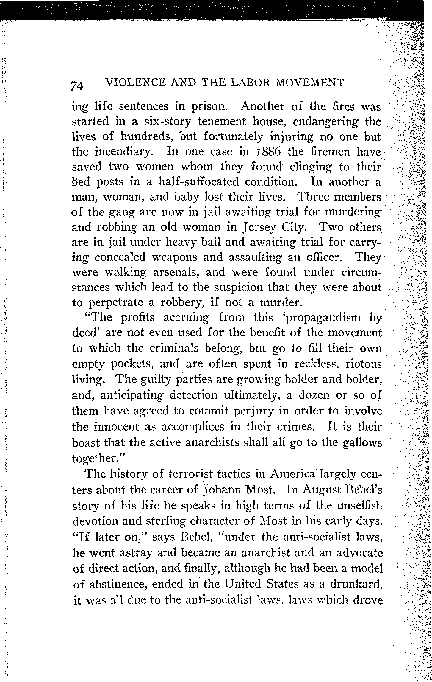 The dissensions over the use of force, that have been so continuous and passionate in the labor movement,[xii] arise from two diametrically opposed points of view. One is at bottom anarchistic, and looks upon all social evils as the result of individual wrong-doing. The other is at bottom socialistic, and looks upon all social evils as in the main the result of economic and social laws. To those who believe there are good trusts and bad trusts, good capitalists and bad capitalists, and that this is an adequate analysis of our economic ills, there is, of course, after all, nothing left but hatred of individuals and, in the extreme case, the desire to remove those individuals. To those, on the other hand, who see in certain underlying economic forces the source of nearly all of our distressing social evils, individual hatred and malice can make in reality no appeal. This volume, on its historical side, as well as in its survey of the psychology of the various elements in the labor movement, is a contribution to the study of the reactions that affect various minds and temperaments in the face of modern social wrongs. If one's point of view is that of the anarchist, he is led inevitably to make his war upon individuals. The more sensitive and sincere he is, the more bitter and implacable becomes that war. If one's point of view is based on what is now called the economic interpretation of history, one is emancipated, in so far as that is possible for emotional beings, from all hatred of individuals, and one sees before him only the necessity of readjusting the economic basis of our common life in order to achieve a more nearly perfect social order.