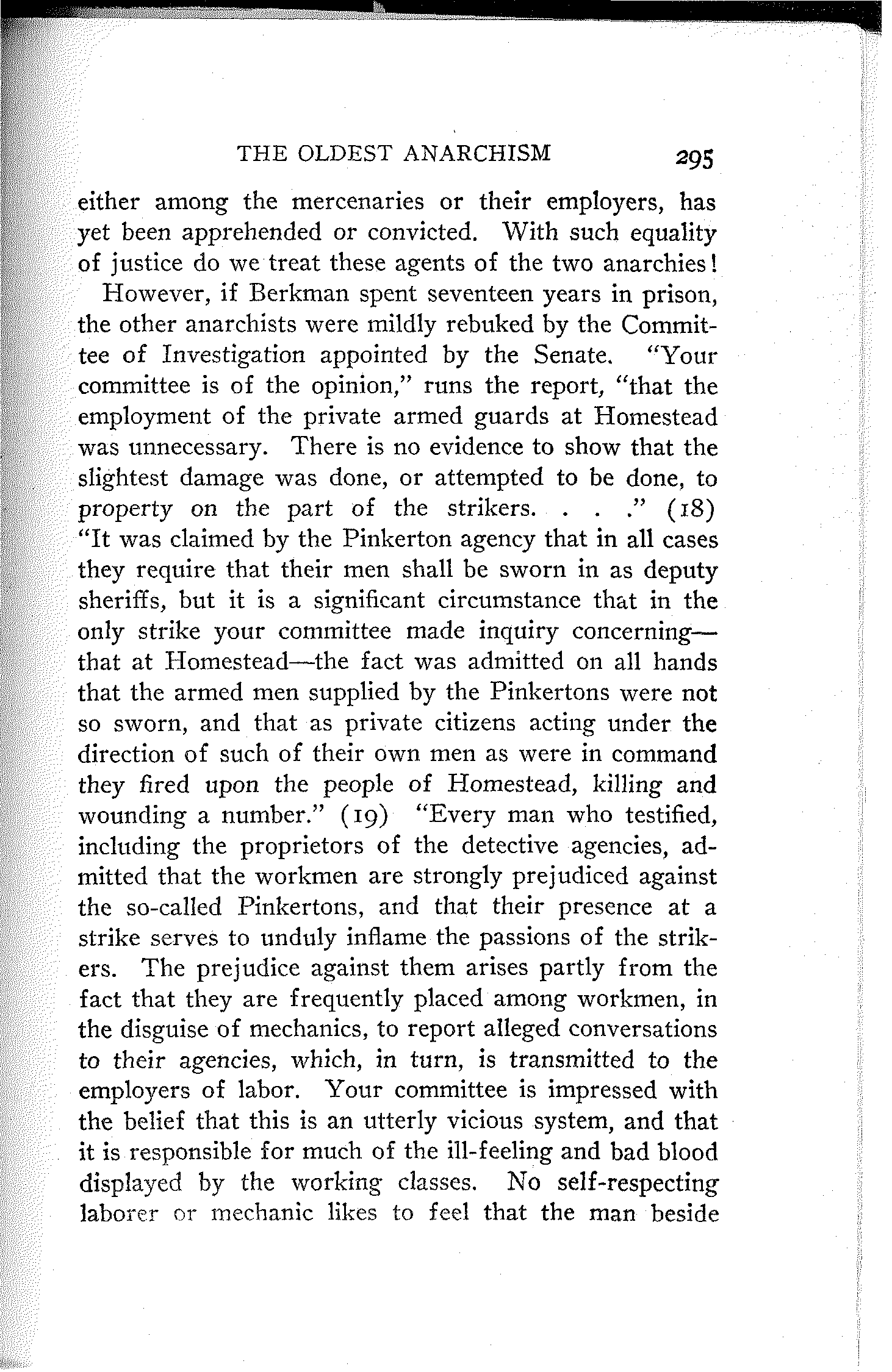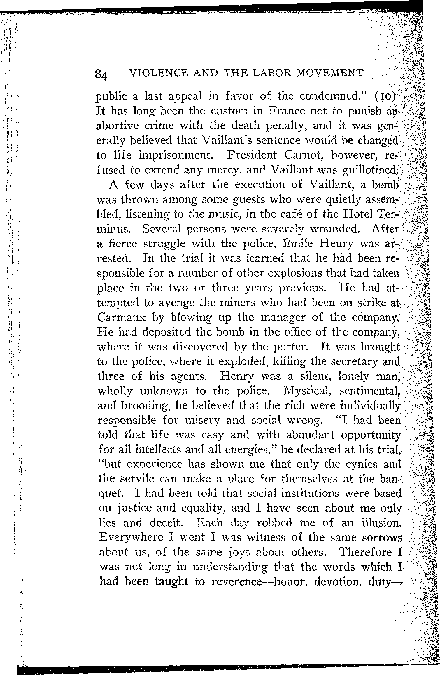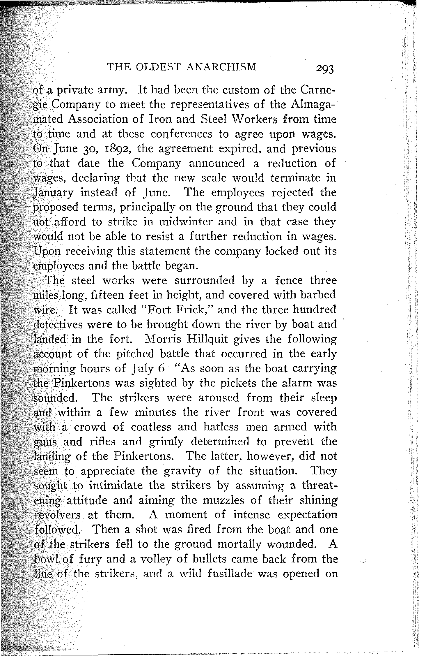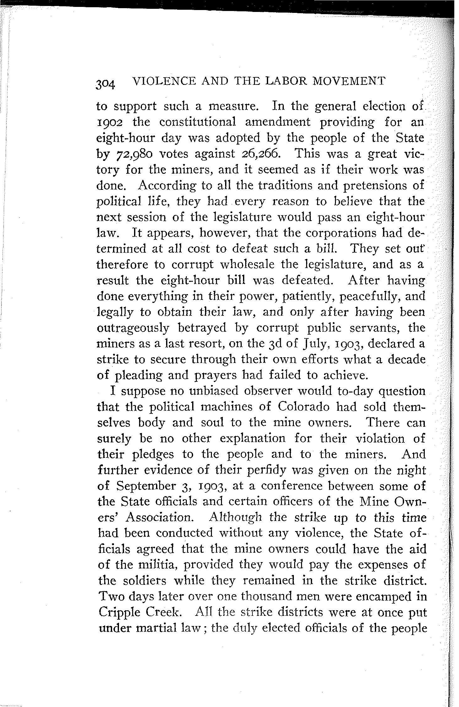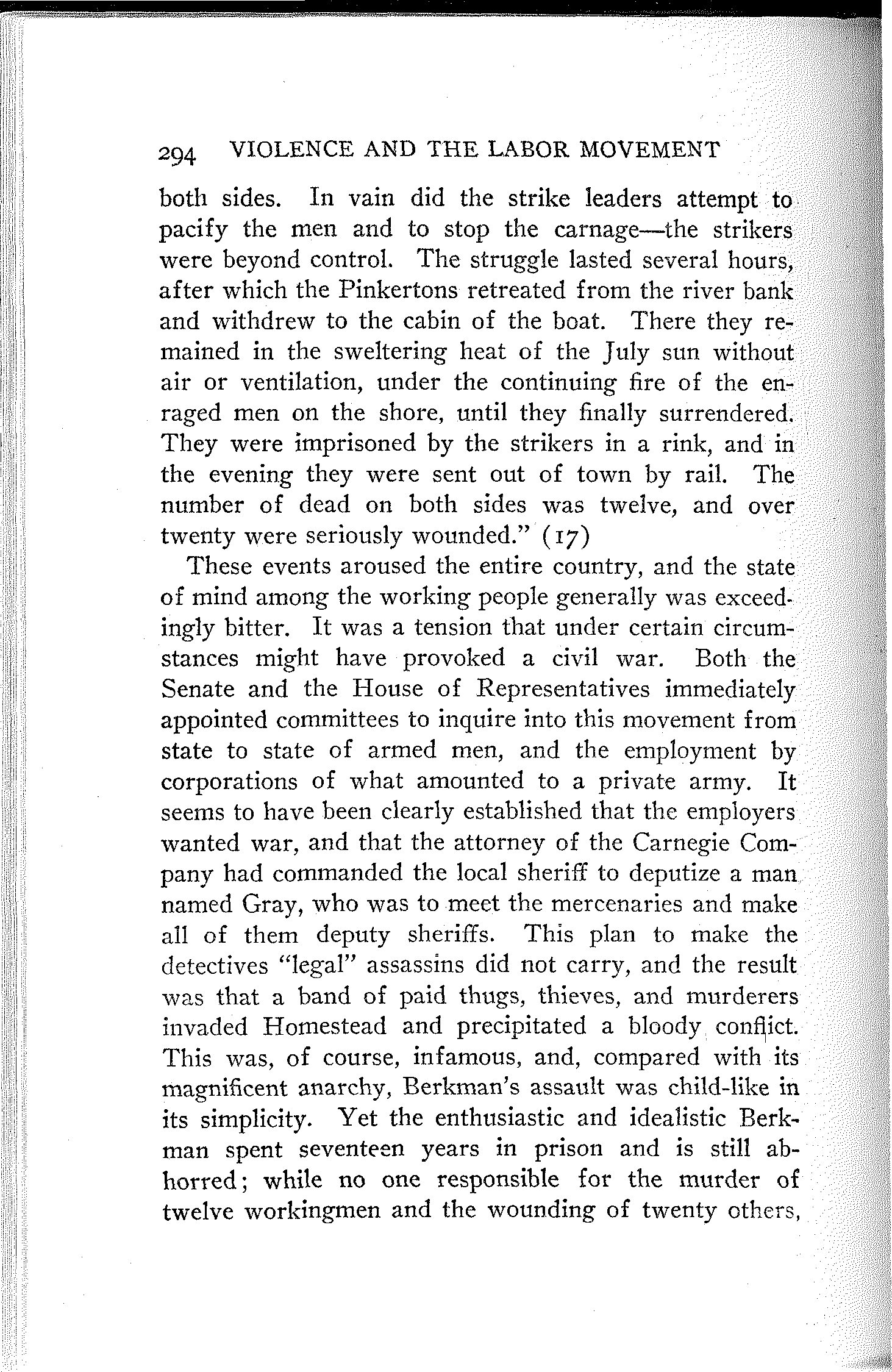 The dissensions over the use of force, that have been so continuous and passionate in the labor movement,[xii] arise from two diametrically opposed points of view. One is at bottom anarchistic, and looks upon all social evils as the result of individual wrong-doing. The other is at bottom socialistic, and looks upon all social evils as in the main the result of economic and social laws. To those who believe there are good trusts and bad trusts, good capitalists and bad capitalists, and that this is an adequate analysis of our economic ills, there is, of course, after all, nothing left but hatred of individuals and, in the extreme case, the desire to remove those individuals. To those, on the other hand, who see in certain underlying economic forces the source of nearly all of our distressing social evils, individual hatred and malice can make in reality no appeal. This volume, on its historical side, as well as in its survey of the psychology of the various elements in the labor movement, is a contribution to the study of the reactions that affect various minds and temperaments in the face of modern social wrongs. If one's point of view is that of the anarchist, he is led inevitably to make his war upon individuals. The more sensitive and sincere he is, the more bitter and implacable becomes that war. If one's point of view is based on what is now called the economic interpretation of history, one is emancipated, in so far as that is possible for emotional beings, from all hatred of individuals, and one sees before him only the necessity of readjusting the economic basis of our common life in order to achieve a more nearly perfect social order.