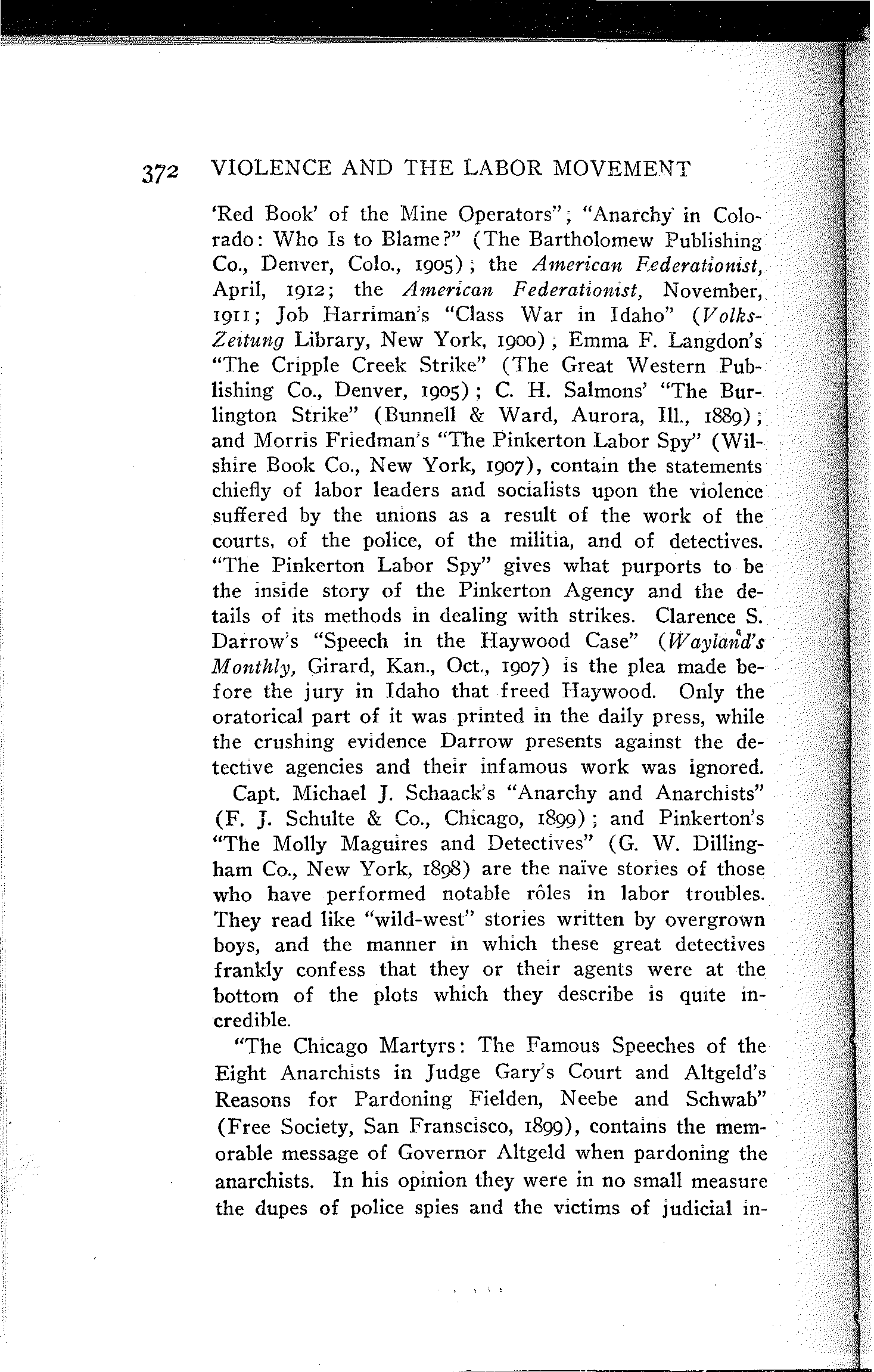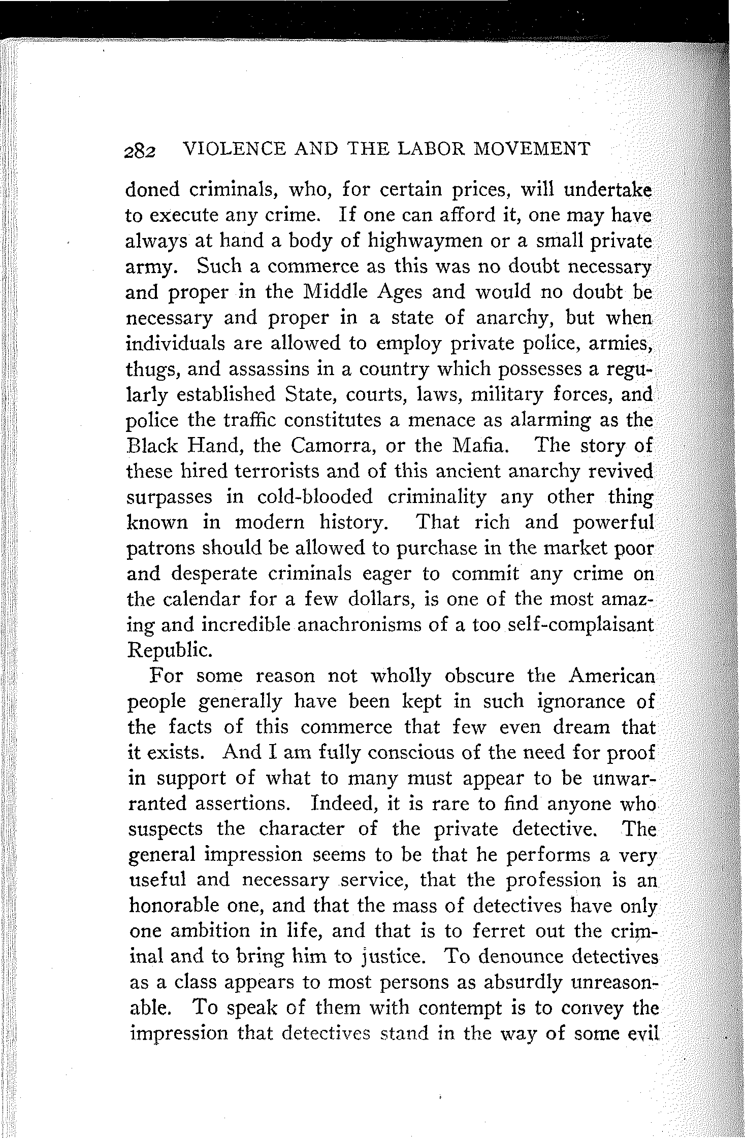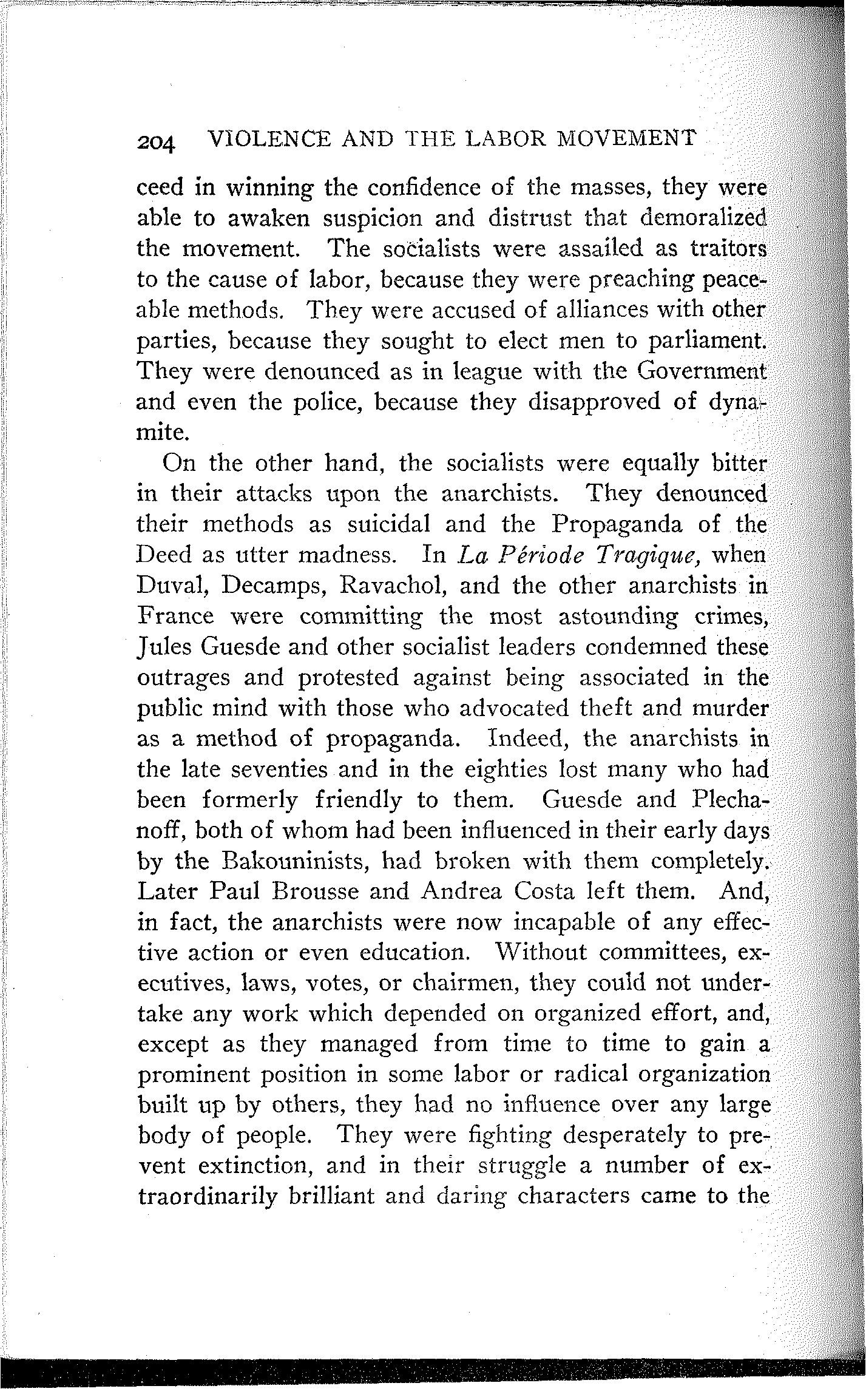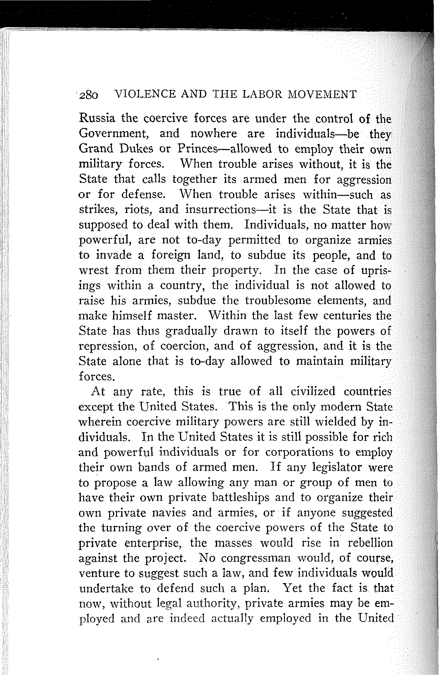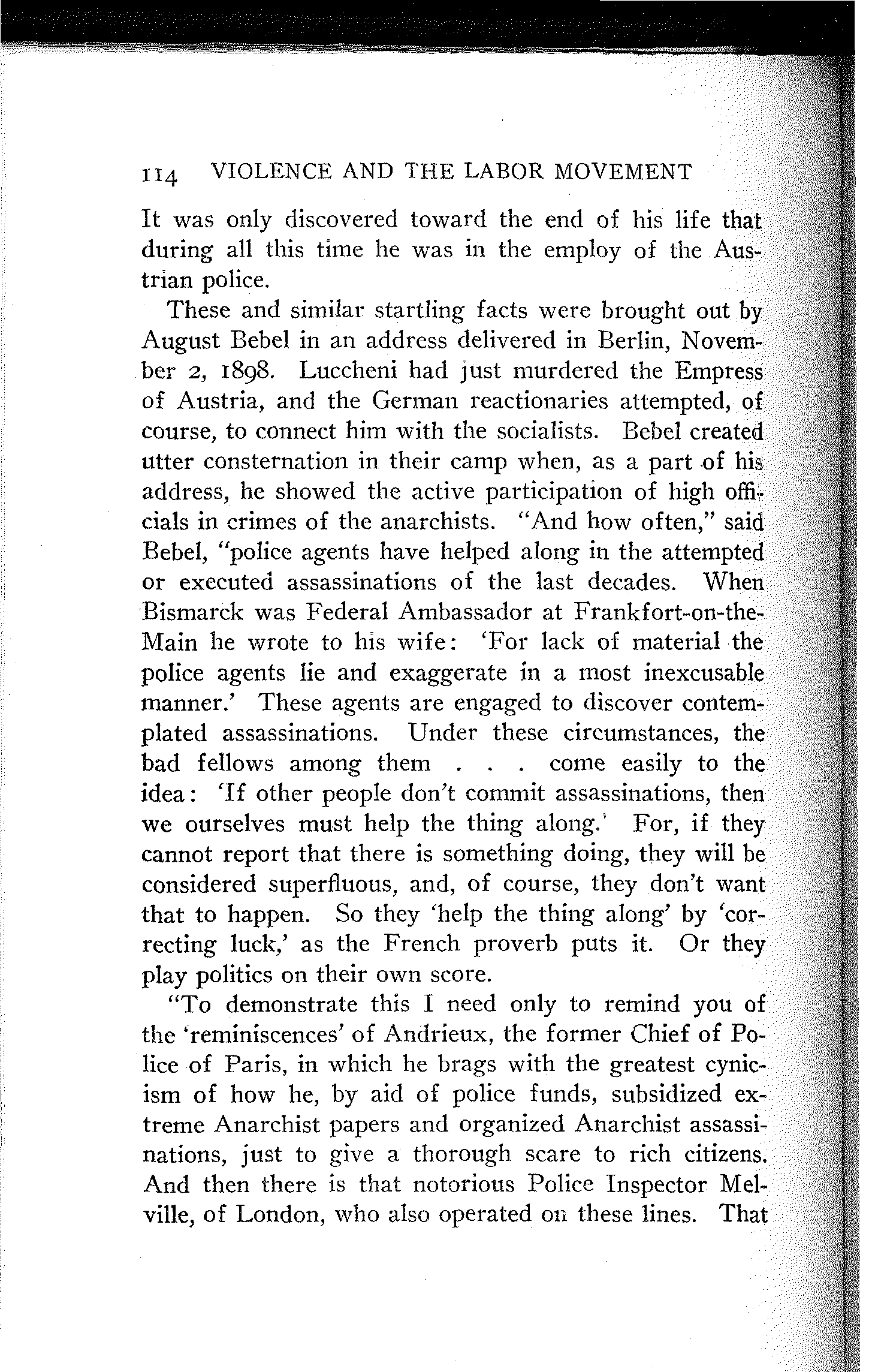 The dissensions over the use of force, that have been so continuous and passionate in the labor movement,[xii] arise from two diametrically opposed points of view. One is at bottom anarchistic, and looks upon all social evils as the result of individual wrong-doing. The other is at bottom socialistic, and looks upon all social evils as in the main the result of economic and social laws. To those who believe there are good trusts and bad trusts, good capitalists and bad capitalists, and that this is an adequate analysis of our economic ills, there is, of course, after all, nothing left but hatred of individuals and, in the extreme case, the desire to remove those individuals. To those, on the other hand, who see in certain underlying economic forces the source of nearly all of our distressing social evils, individual hatred and malice can make in reality no appeal. This volume, on its historical side, as well as in its survey of the psychology of the various elements in the labor movement, is a contribution to the study of the reactions that affect various minds and temperaments in the face of modern social wrongs. If one's point of view is that of the anarchist, he is led inevitably to make his war upon individuals. The more sensitive and sincere he is, the more bitter and implacable becomes that war. If one's point of view is based on what is now called the economic interpretation of history, one is emancipated, in so far as that is possible for emotional beings, from all hatred of individuals, and one sees before him only the necessity of readjusting the economic basis of our common life in order to achieve a more nearly perfect social order.