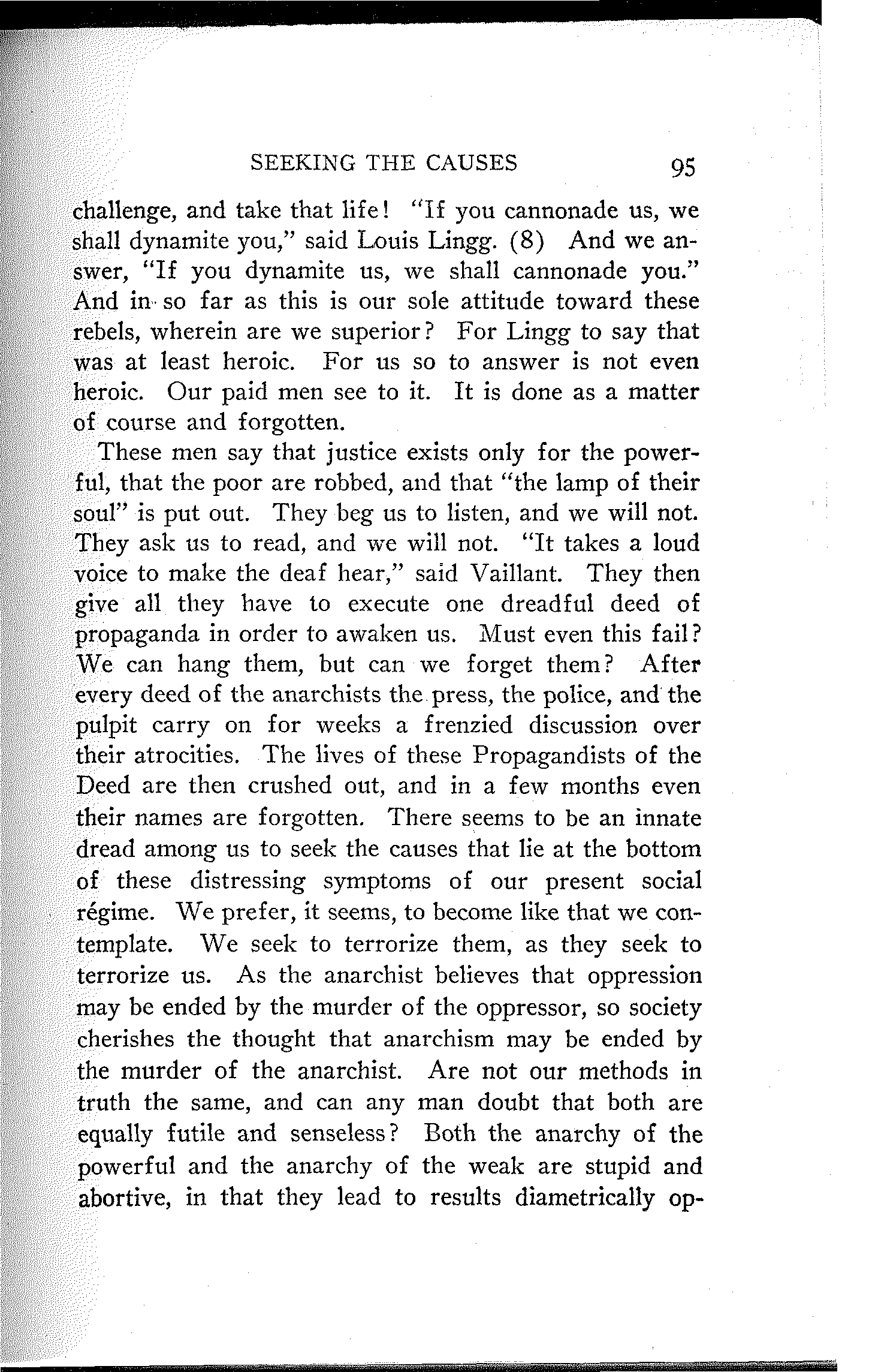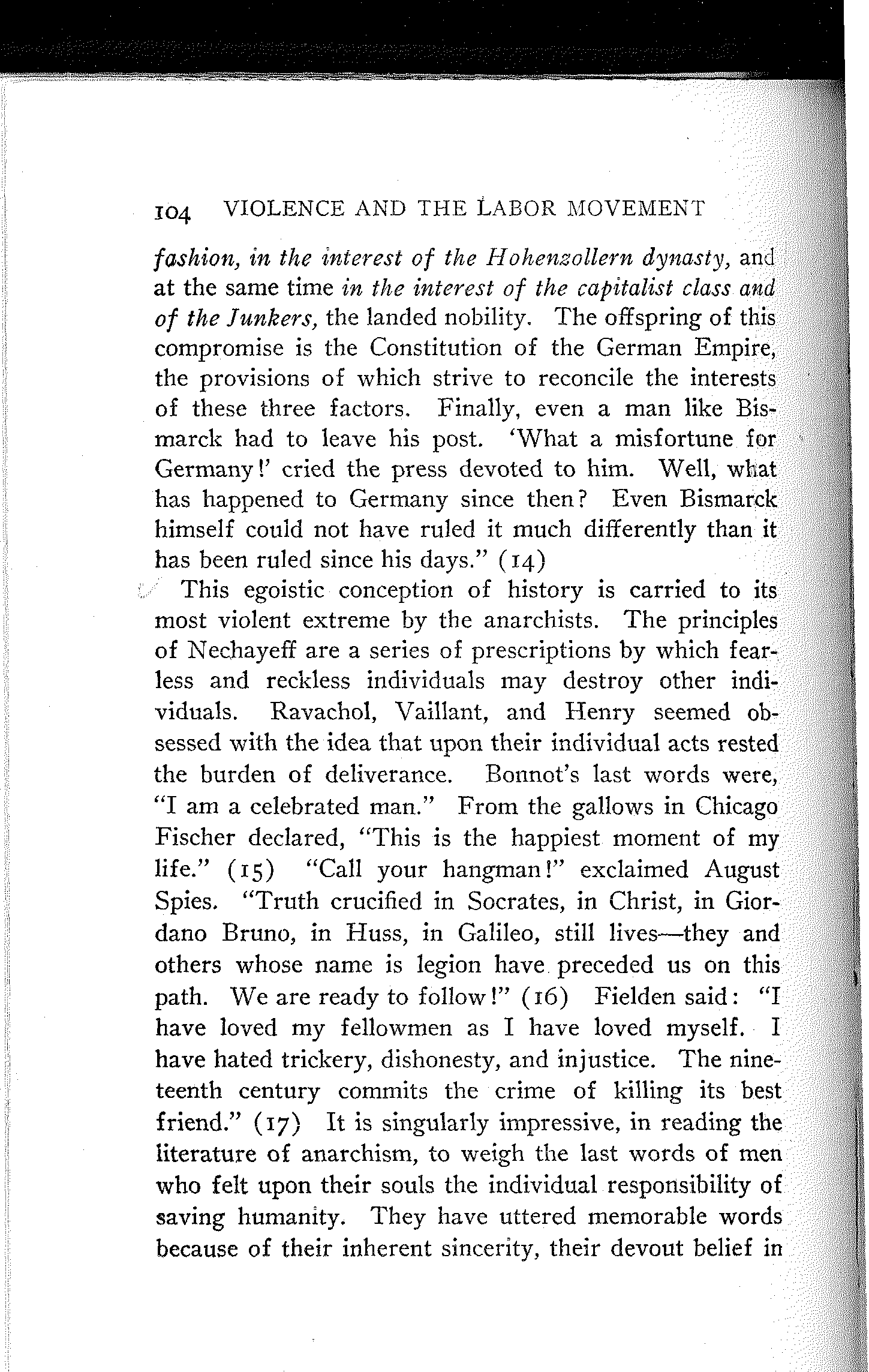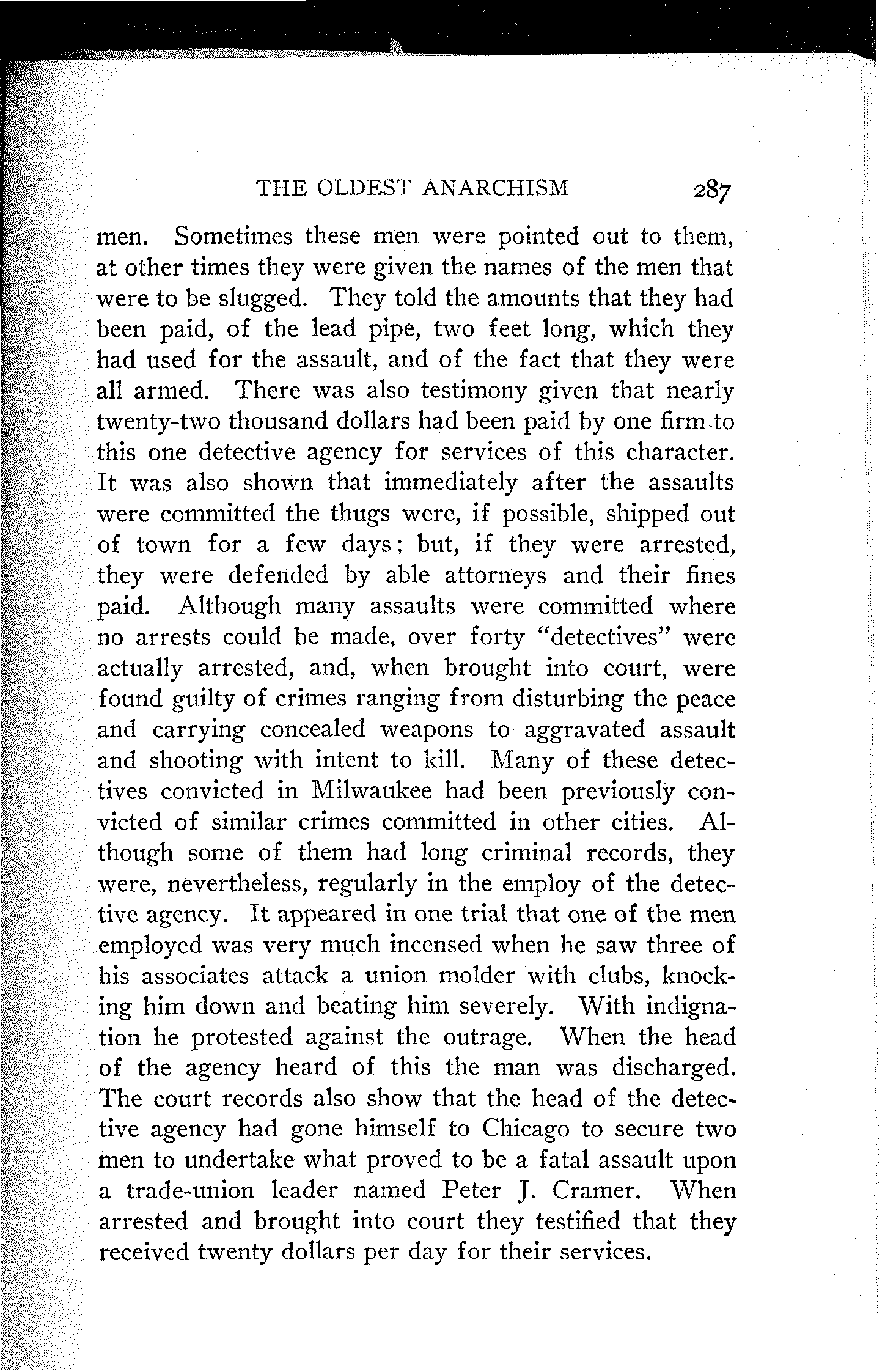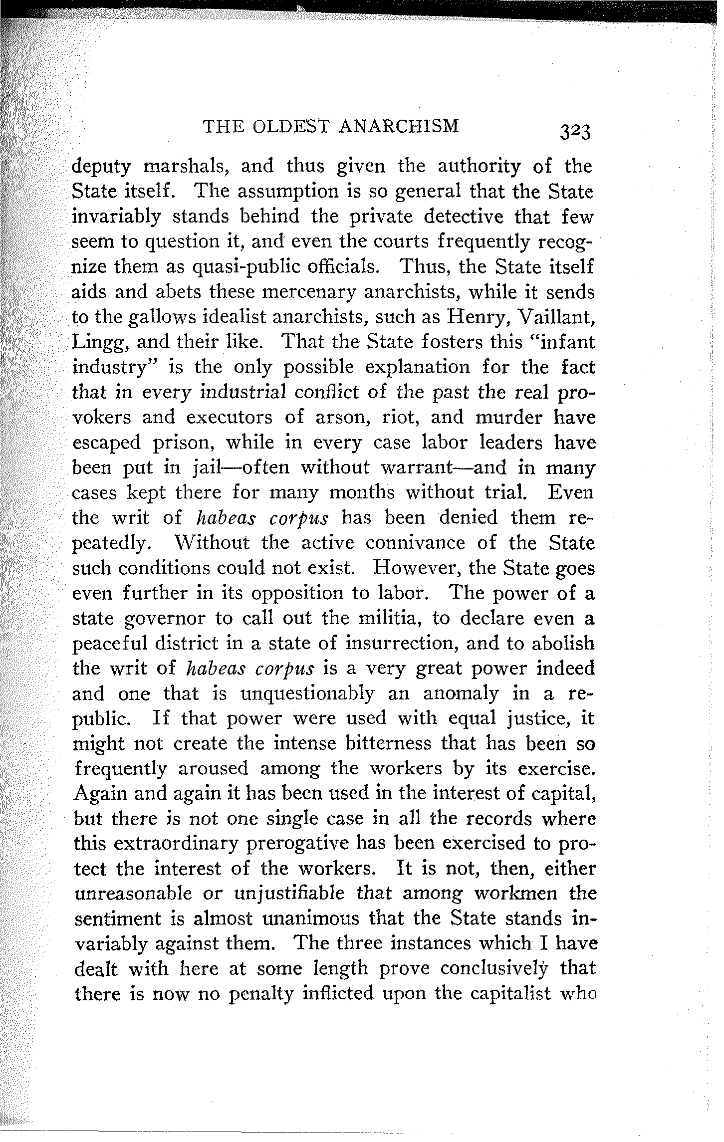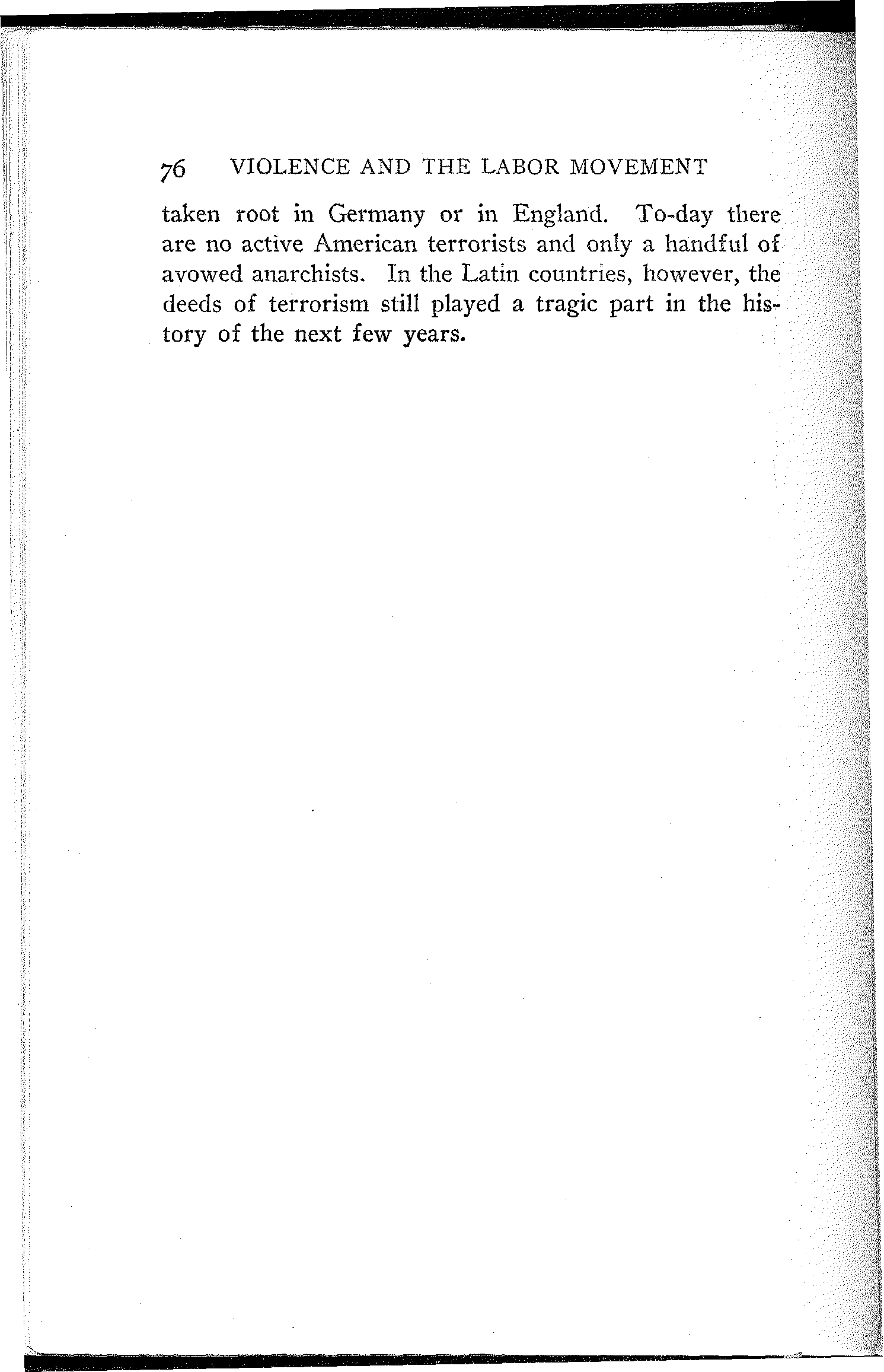 The dissensions over the use of force, that have been so continuous and passionate in the labor movement,[xii] arise from two diametrically opposed points of view. One is at bottom anarchistic, and looks upon all social evils as the result of individual wrong-doing. The other is at bottom socialistic, and looks upon all social evils as in the main the result of economic and social laws. To those who believe there are good trusts and bad trusts, good capitalists and bad capitalists, and that this is an adequate analysis of our economic ills, there is, of course, after all, nothing left but hatred of individuals and, in the extreme case, the desire to remove those individuals. To those, on the other hand, who see in certain underlying economic forces the source of nearly all of our distressing social evils, individual hatred and malice can make in reality no appeal. This volume, on its historical side, as well as in its survey of the psychology of the various elements in the labor movement, is a contribution to the study of the reactions that affect various minds and temperaments in the face of modern social wrongs. If one's point of view is that of the anarchist, he is led inevitably to make his war upon individuals. The more sensitive and sincere he is, the more bitter and implacable becomes that war. If one's point of view is based on what is now called the economic interpretation of history, one is emancipated, in so far as that is possible for emotional beings, from all hatred of individuals, and one sees before him only the necessity of readjusting the economic basis of our common life in order to achieve a more nearly perfect social order.