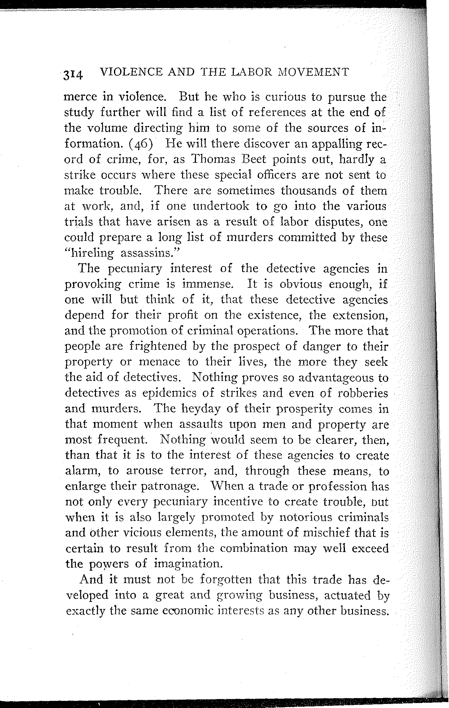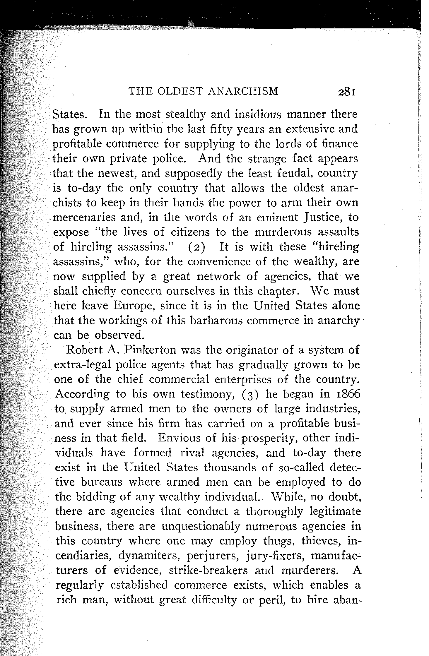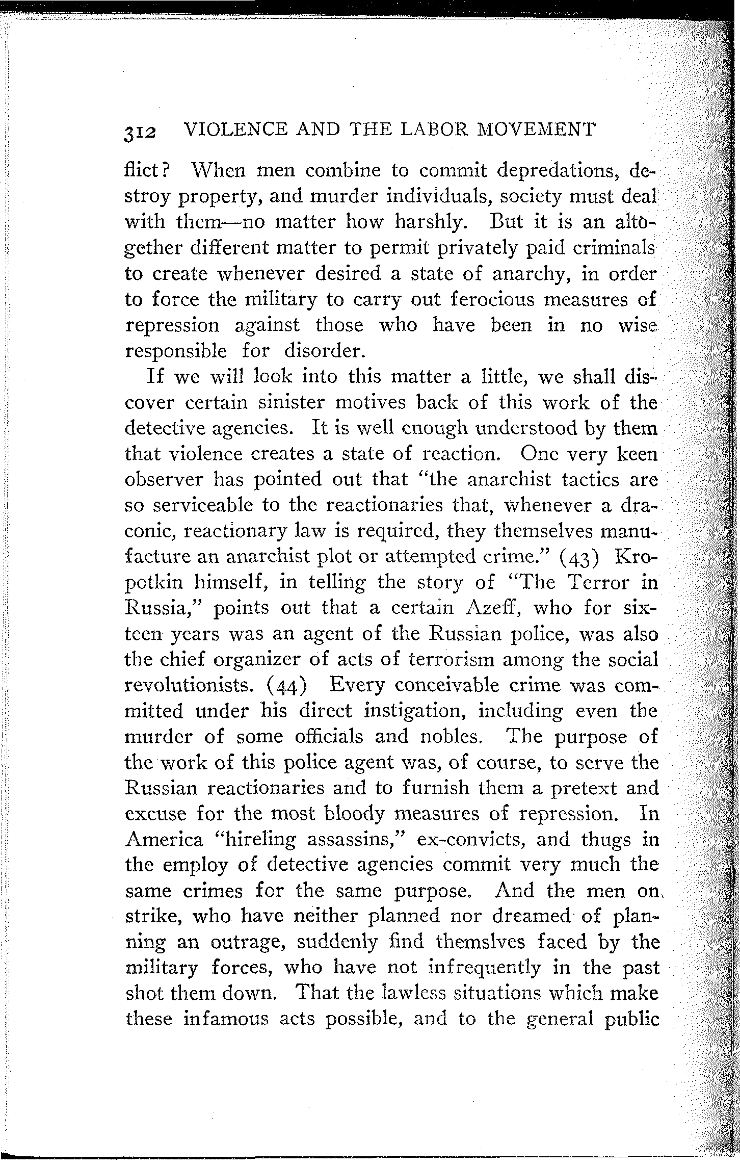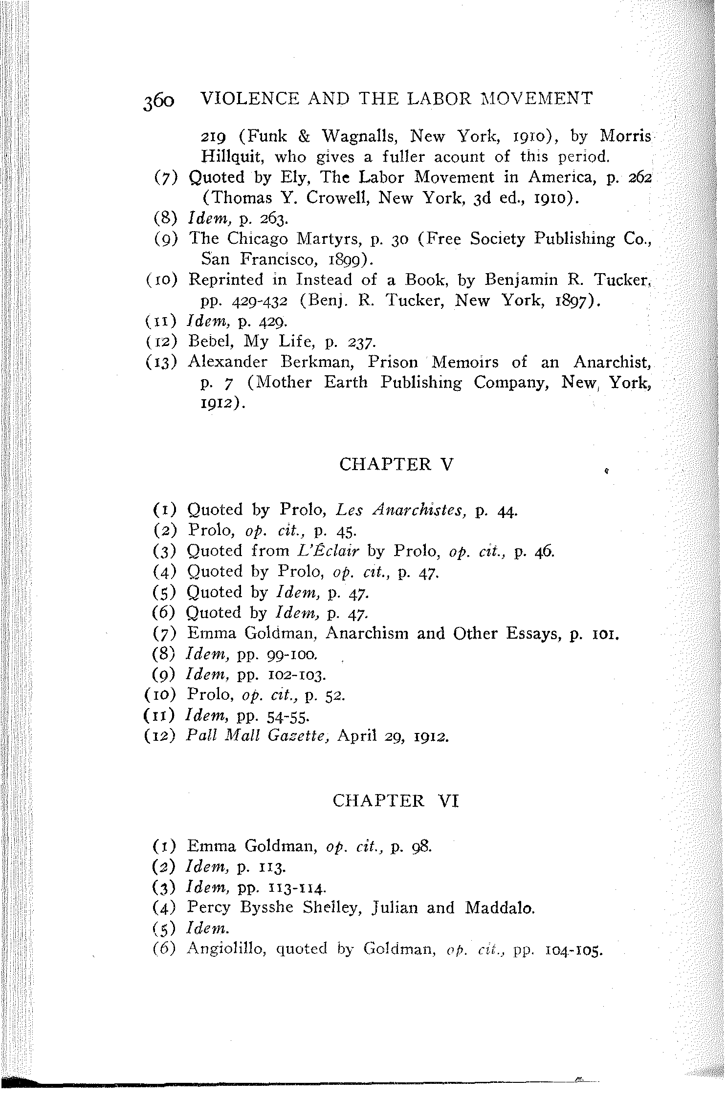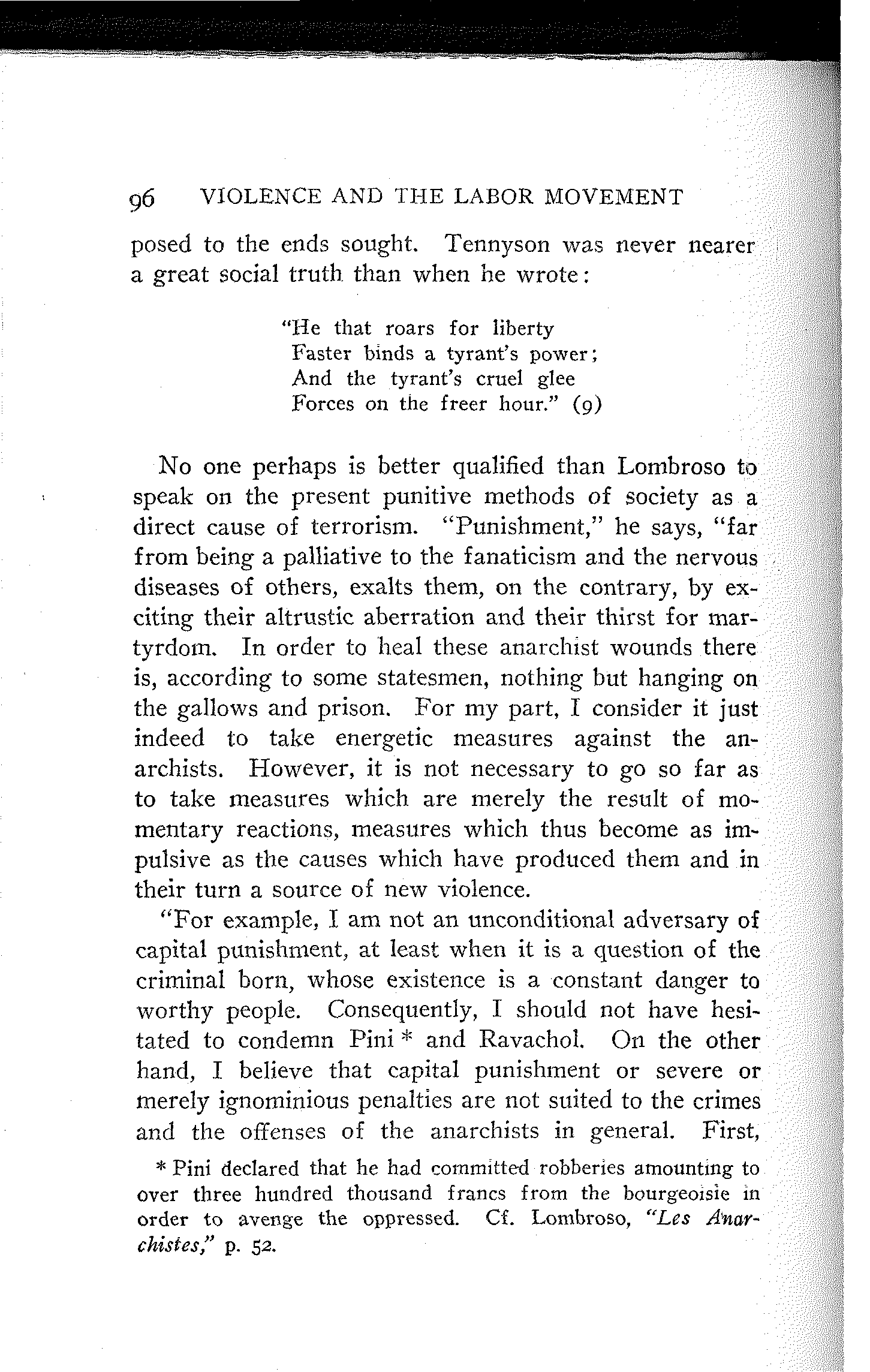 The dissensions over the use of force, that have been so continuous and passionate in the labor movement,[xii] arise from two diametrically opposed points of view. One is at bottom anarchistic, and looks upon all social evils as the result of individual wrong-doing. The other is at bottom socialistic, and looks upon all social evils as in the main the result of economic and social laws. To those who believe there are good trusts and bad trusts, good capitalists and bad capitalists, and that this is an adequate analysis of our economic ills, there is, of course, after all, nothing left but hatred of individuals and, in the extreme case, the desire to remove those individuals. To those, on the other hand, who see in certain underlying economic forces the source of nearly all of our distressing social evils, individual hatred and malice can make in reality no appeal. This volume, on its historical side, as well as in its survey of the psychology of the various elements in the labor movement, is a contribution to the study of the reactions that affect various minds and temperaments in the face of modern social wrongs. If one's point of view is that of the anarchist, he is led inevitably to make his war upon individuals. The more sensitive and sincere he is, the more bitter and implacable becomes that war. If one's point of view is based on what is now called the economic interpretation of history, one is emancipated, in so far as that is possible for emotional beings, from all hatred of individuals, and one sees before him only the necessity of readjusting the economic basis of our common life in order to achieve a more nearly perfect social order.