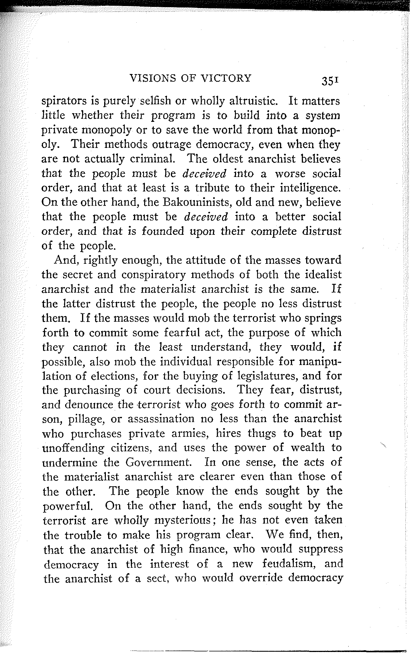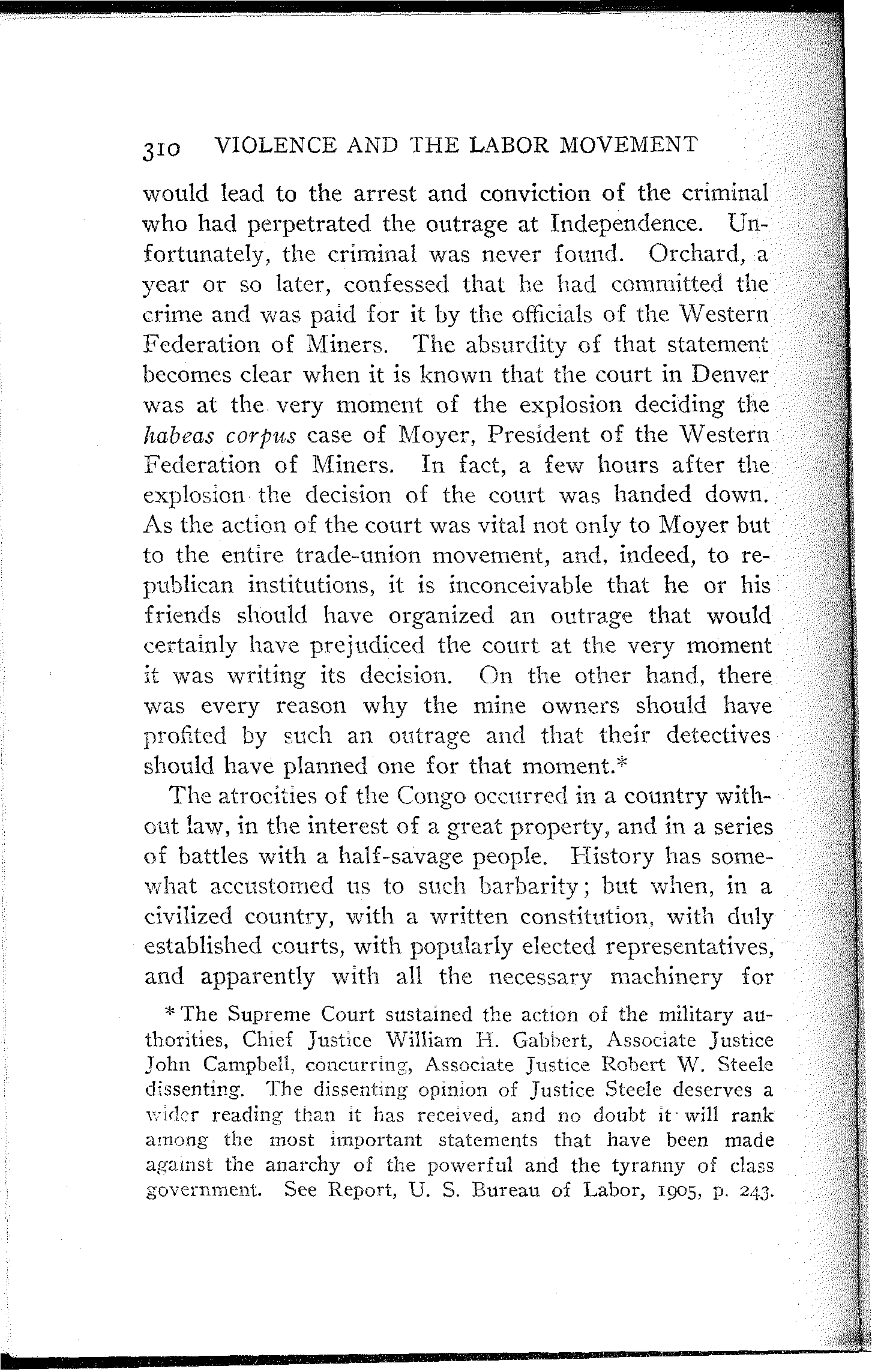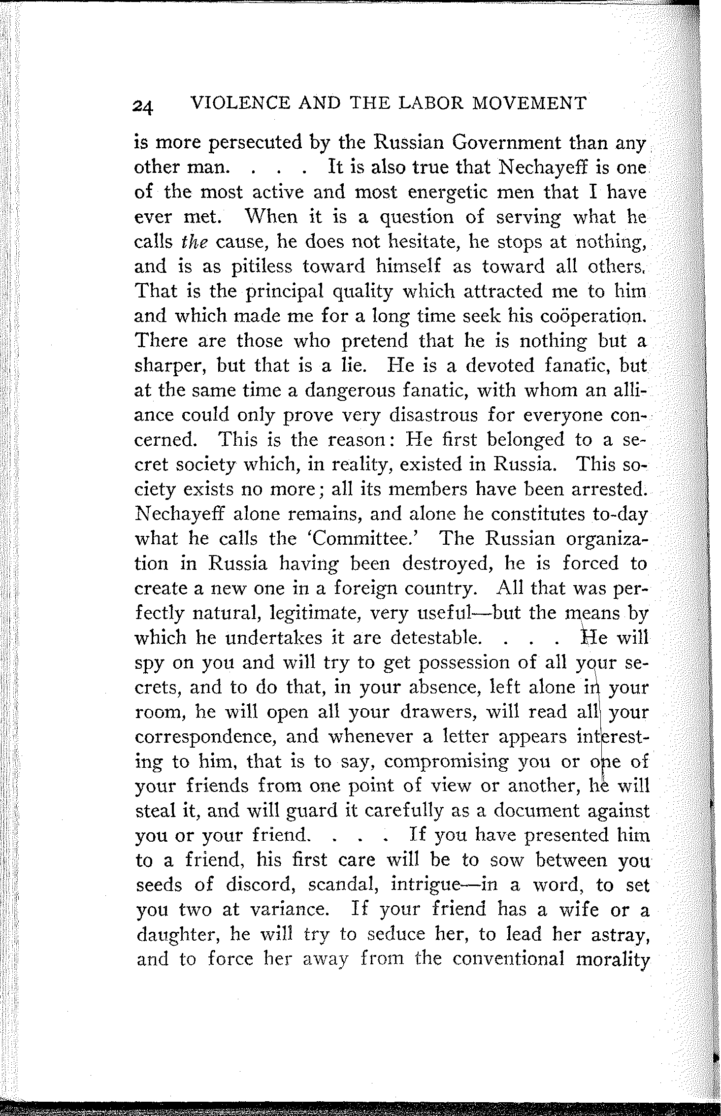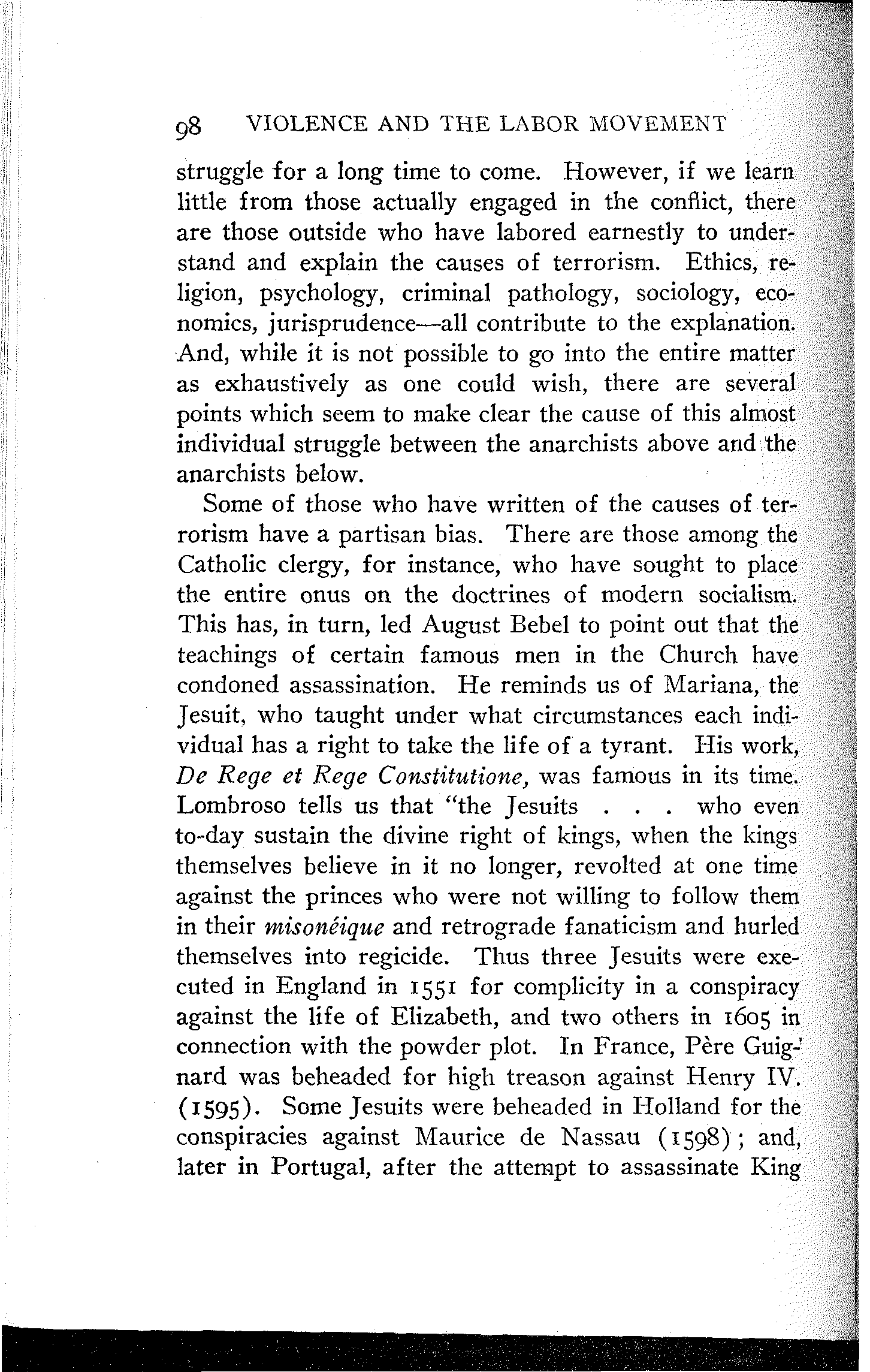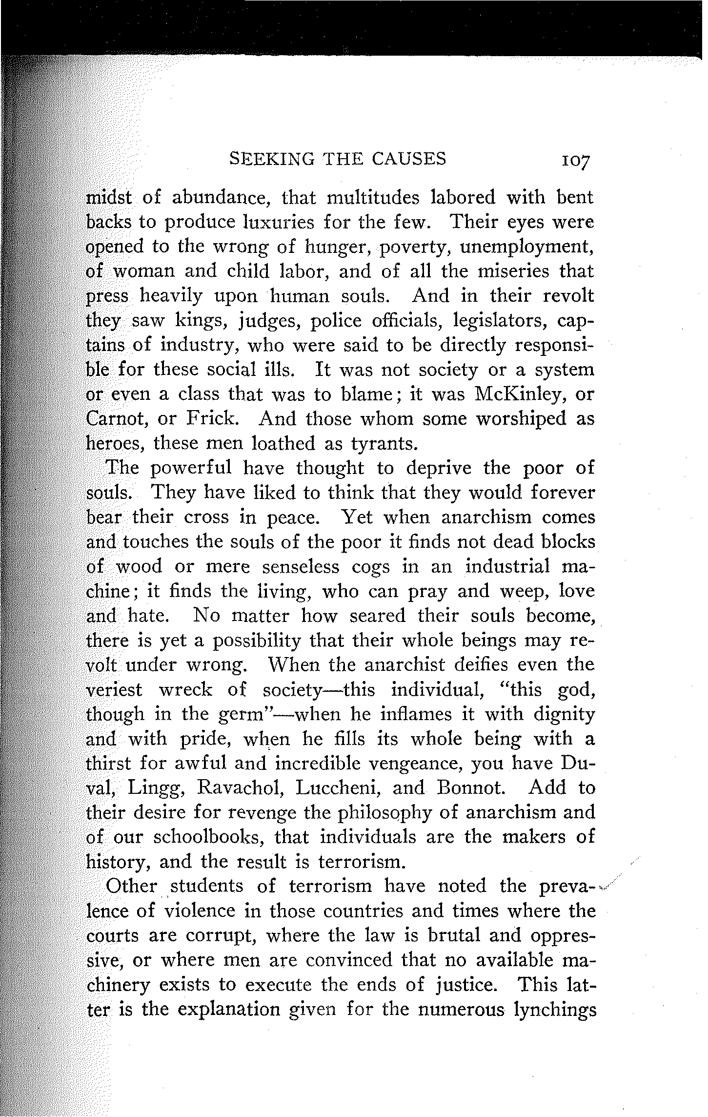 The dissensions over the use of force, that have been so continuous and passionate in the labor movement,[xii] arise from two diametrically opposed points of view. One is at bottom anarchistic, and looks upon all social evils as the result of individual wrong-doing. The other is at bottom socialistic, and looks upon all social evils as in the main the result of economic and social laws. To those who believe there are good trusts and bad trusts, good capitalists and bad capitalists, and that this is an adequate analysis of our economic ills, there is, of course, after all, nothing left but hatred of individuals and, in the extreme case, the desire to remove those individuals. To those, on the other hand, who see in certain underlying economic forces the source of nearly all of our distressing social evils, individual hatred and malice can make in reality no appeal. This volume, on its historical side, as well as in its survey of the psychology of the various elements in the labor movement, is a contribution to the study of the reactions that affect various minds and temperaments in the face of modern social wrongs. If one's point of view is that of the anarchist, he is led inevitably to make his war upon individuals. The more sensitive and sincere he is, the more bitter and implacable becomes that war. If one's point of view is based on what is now called the economic interpretation of history, one is emancipated, in so far as that is possible for emotional beings, from all hatred of individuals, and one sees before him only the necessity of readjusting the economic basis of our common life in order to achieve a more nearly perfect social order.