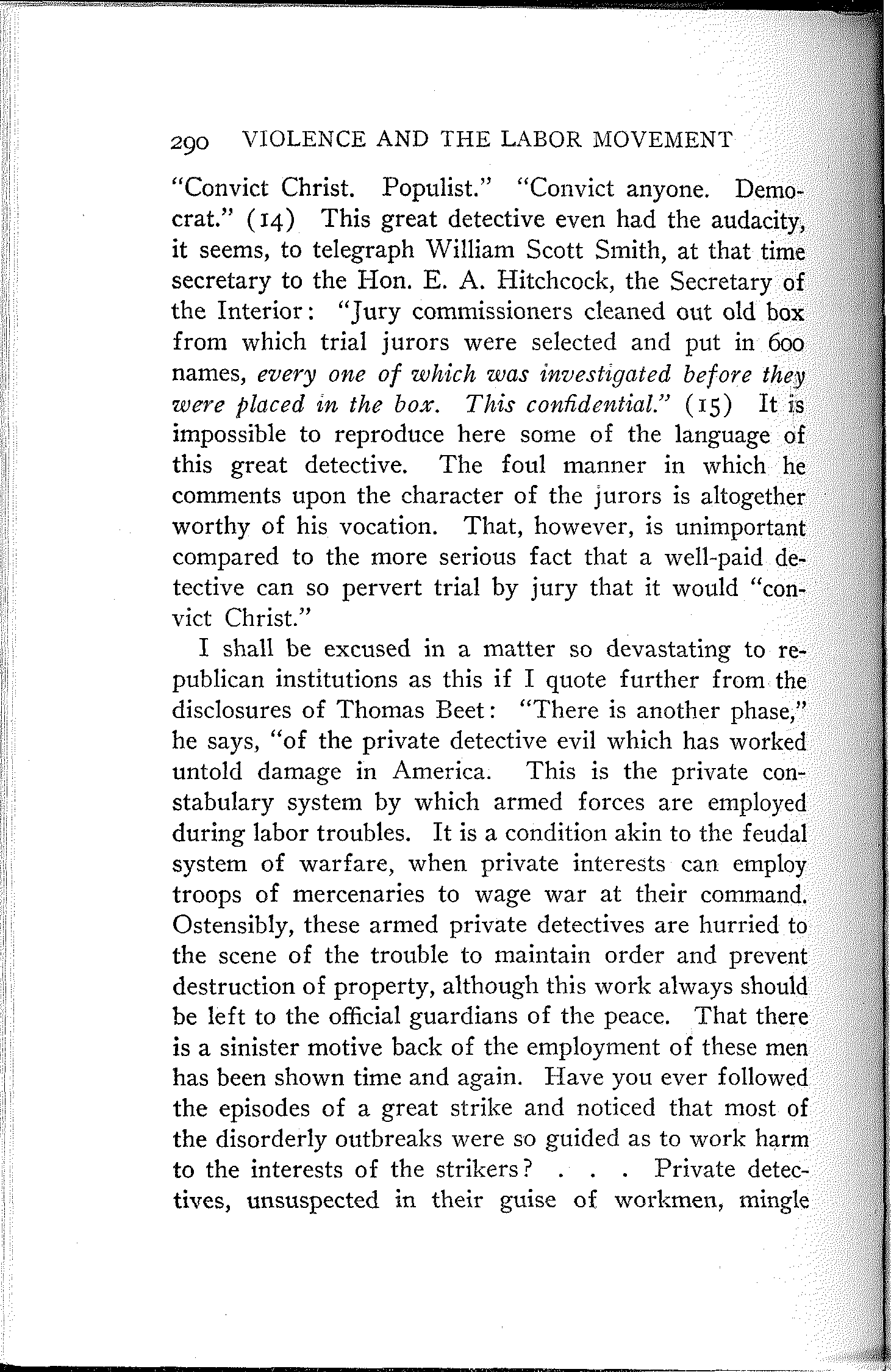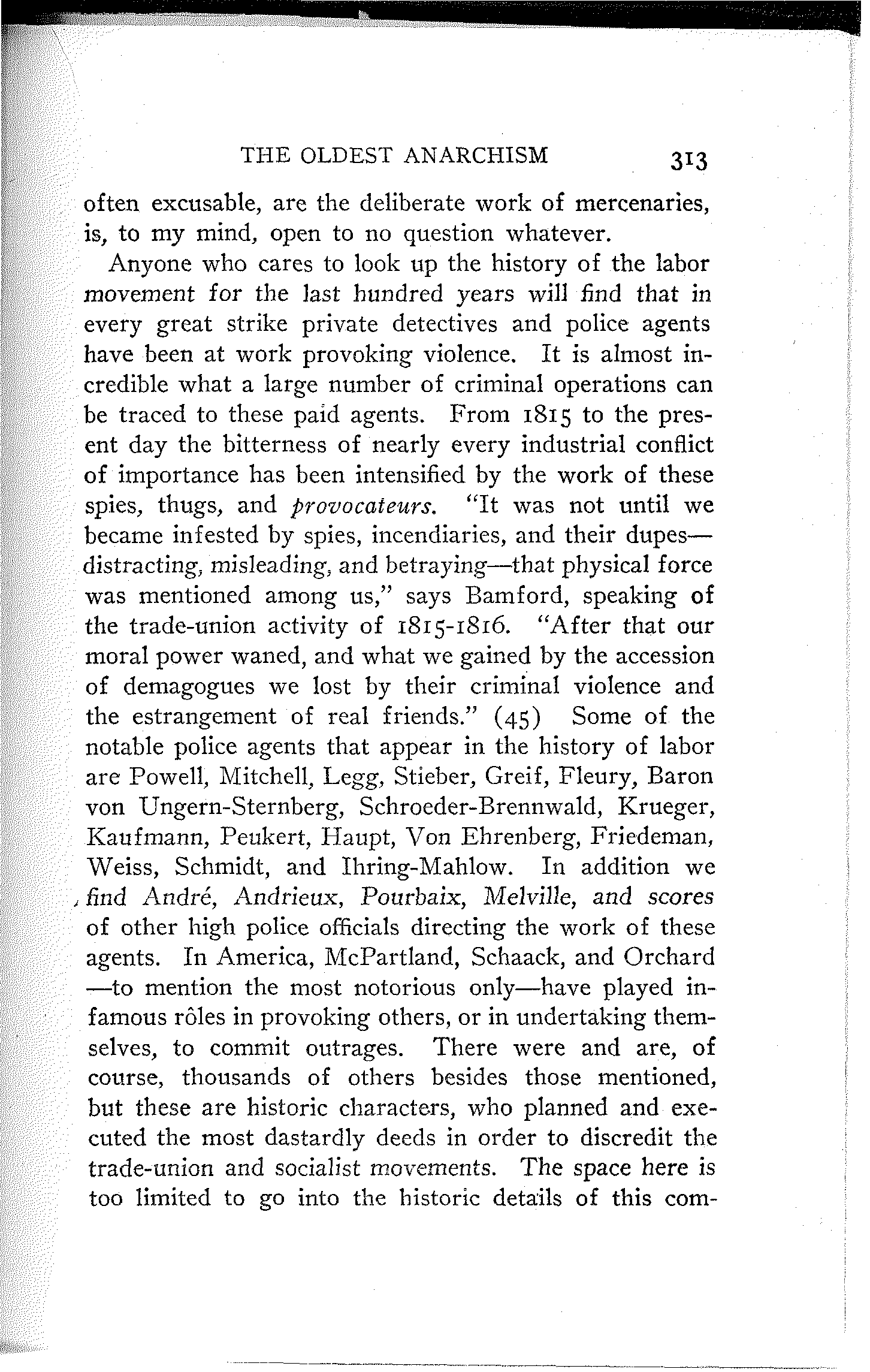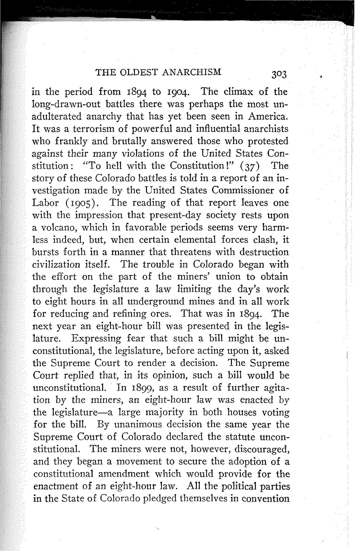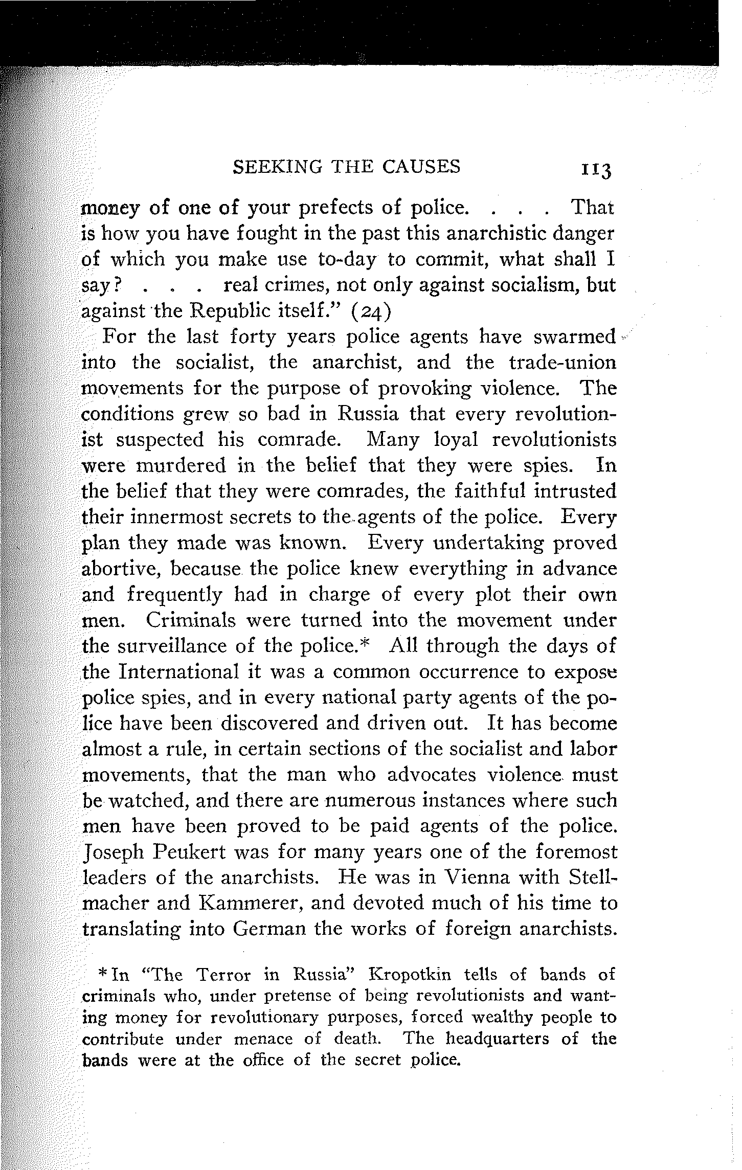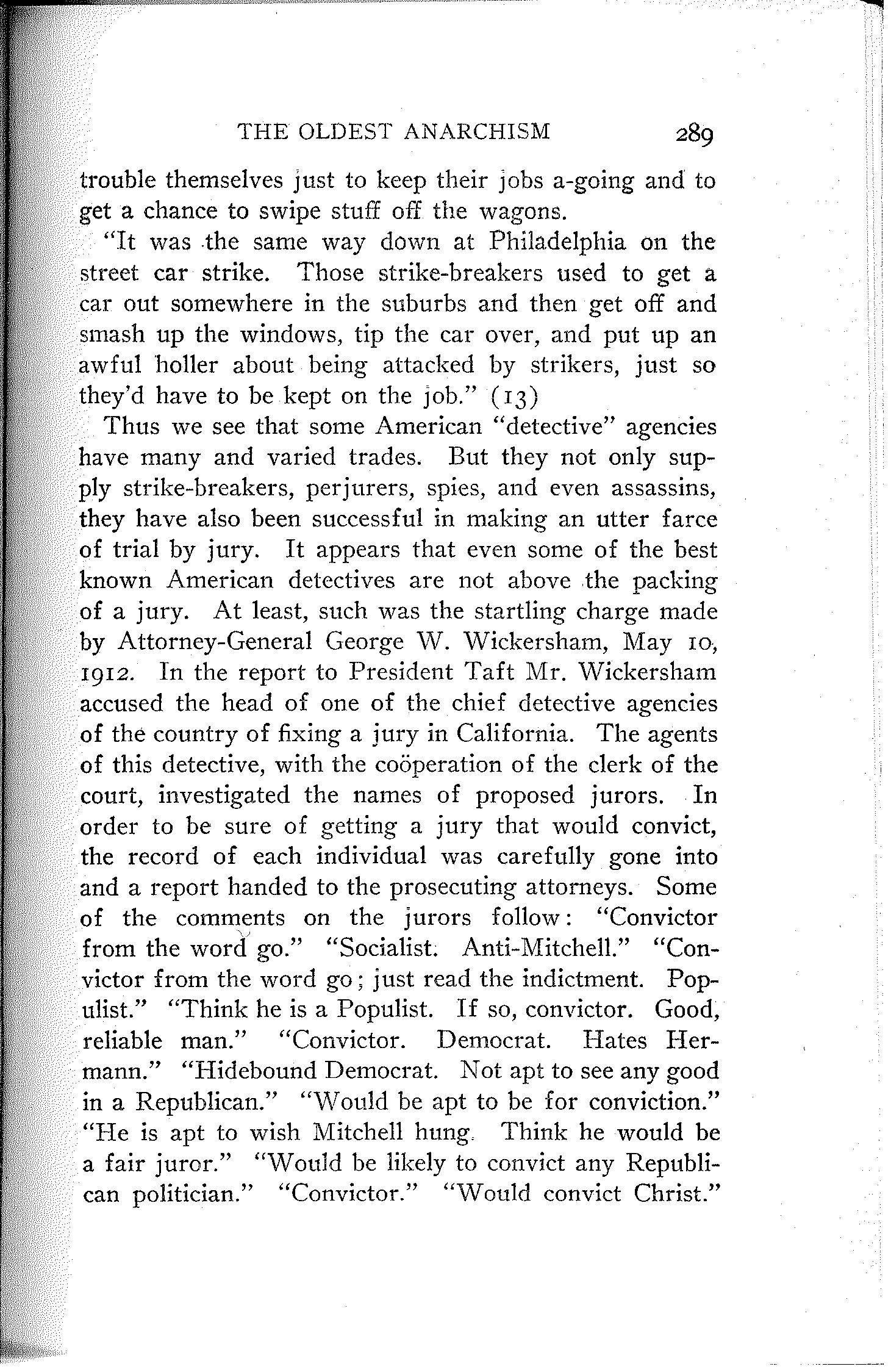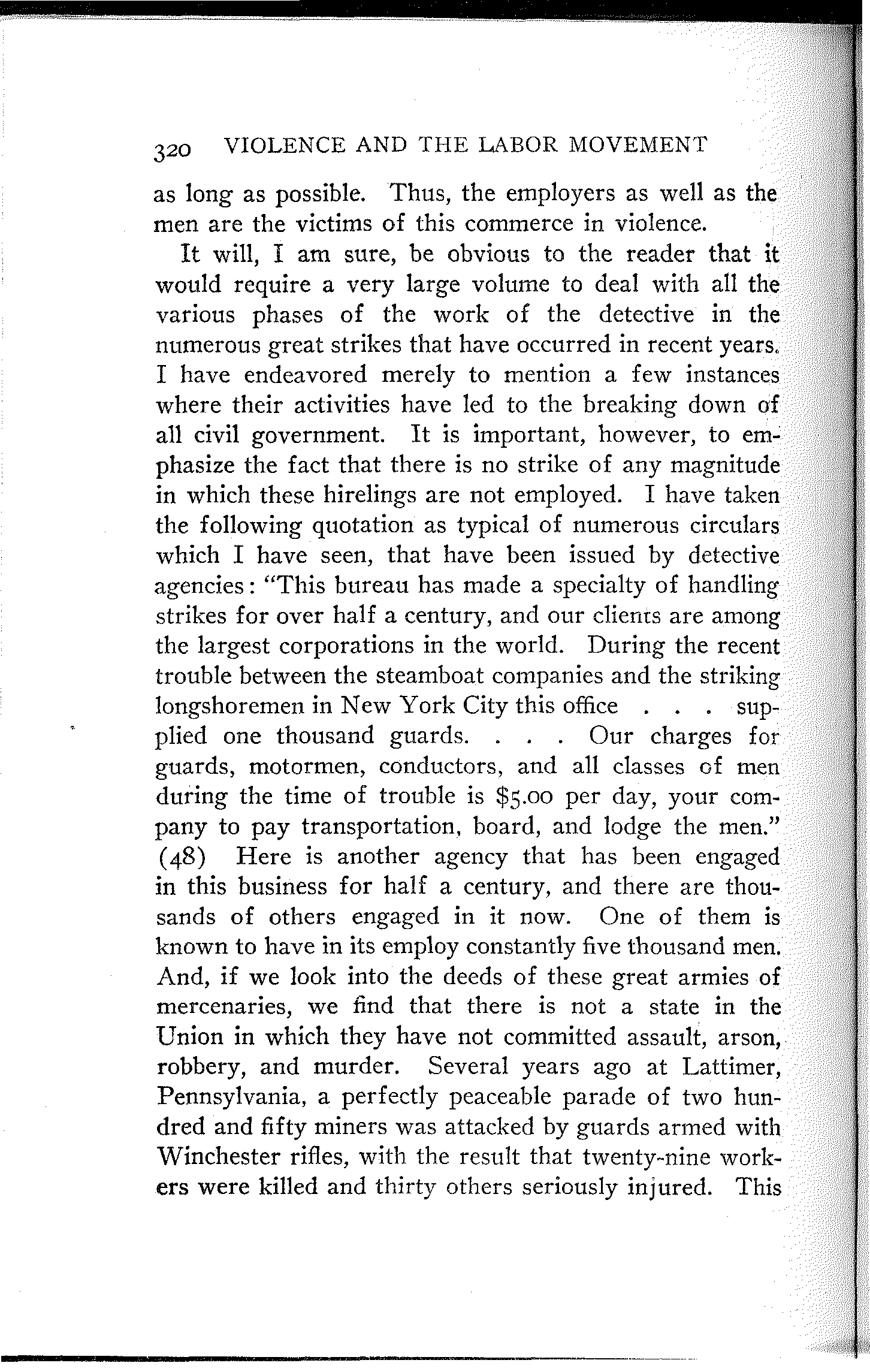 The dissensions over the use of force, that have been so continuous and passionate in the labor movement,[xii] arise from two diametrically opposed points of view. One is at bottom anarchistic, and looks upon all social evils as the result of individual wrong-doing. The other is at bottom socialistic, and looks upon all social evils as in the main the result of economic and social laws. To those who believe there are good trusts and bad trusts, good capitalists and bad capitalists, and that this is an adequate analysis of our economic ills, there is, of course, after all, nothing left but hatred of individuals and, in the extreme case, the desire to remove those individuals. To those, on the other hand, who see in certain underlying economic forces the source of nearly all of our distressing social evils, individual hatred and malice can make in reality no appeal. This volume, on its historical side, as well as in its survey of the psychology of the various elements in the labor movement, is a contribution to the study of the reactions that affect various minds and temperaments in the face of modern social wrongs. If one's point of view is that of the anarchist, he is led inevitably to make his war upon individuals. The more sensitive and sincere he is, the more bitter and implacable becomes that war. If one's point of view is based on what is now called the economic interpretation of history, one is emancipated, in so far as that is possible for emotional beings, from all hatred of individuals, and one sees before him only the necessity of readjusting the economic basis of our common life in order to achieve a more nearly perfect social order.