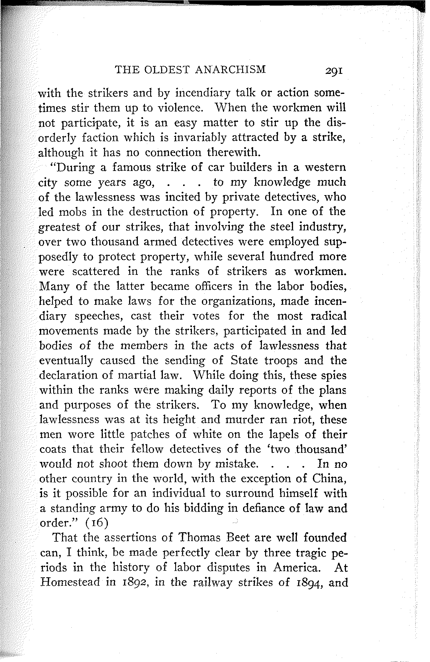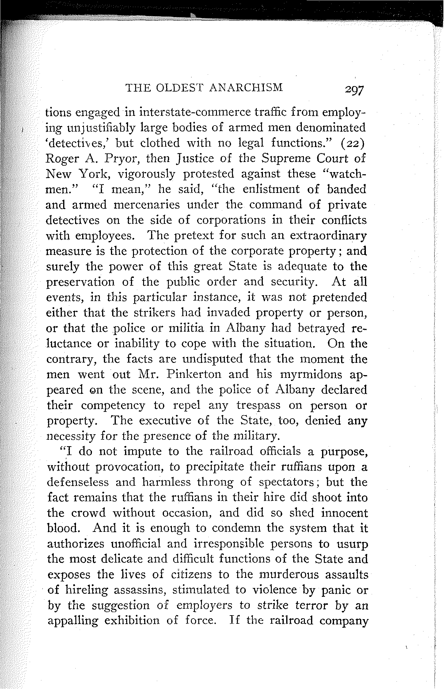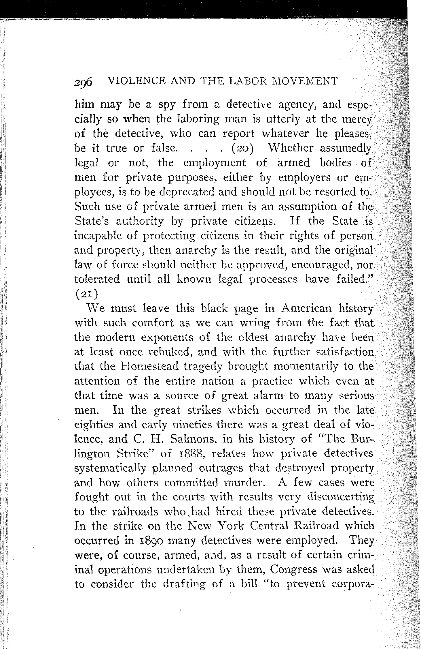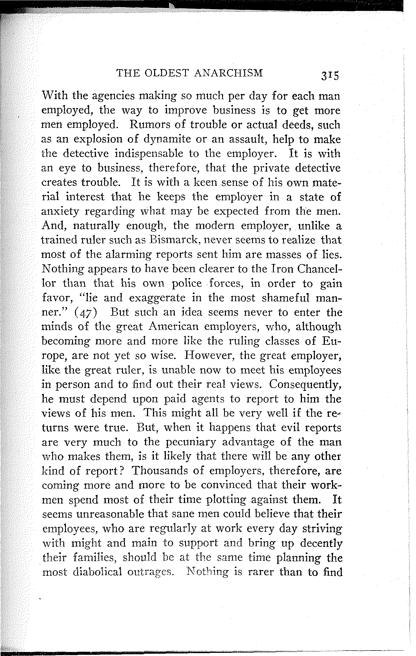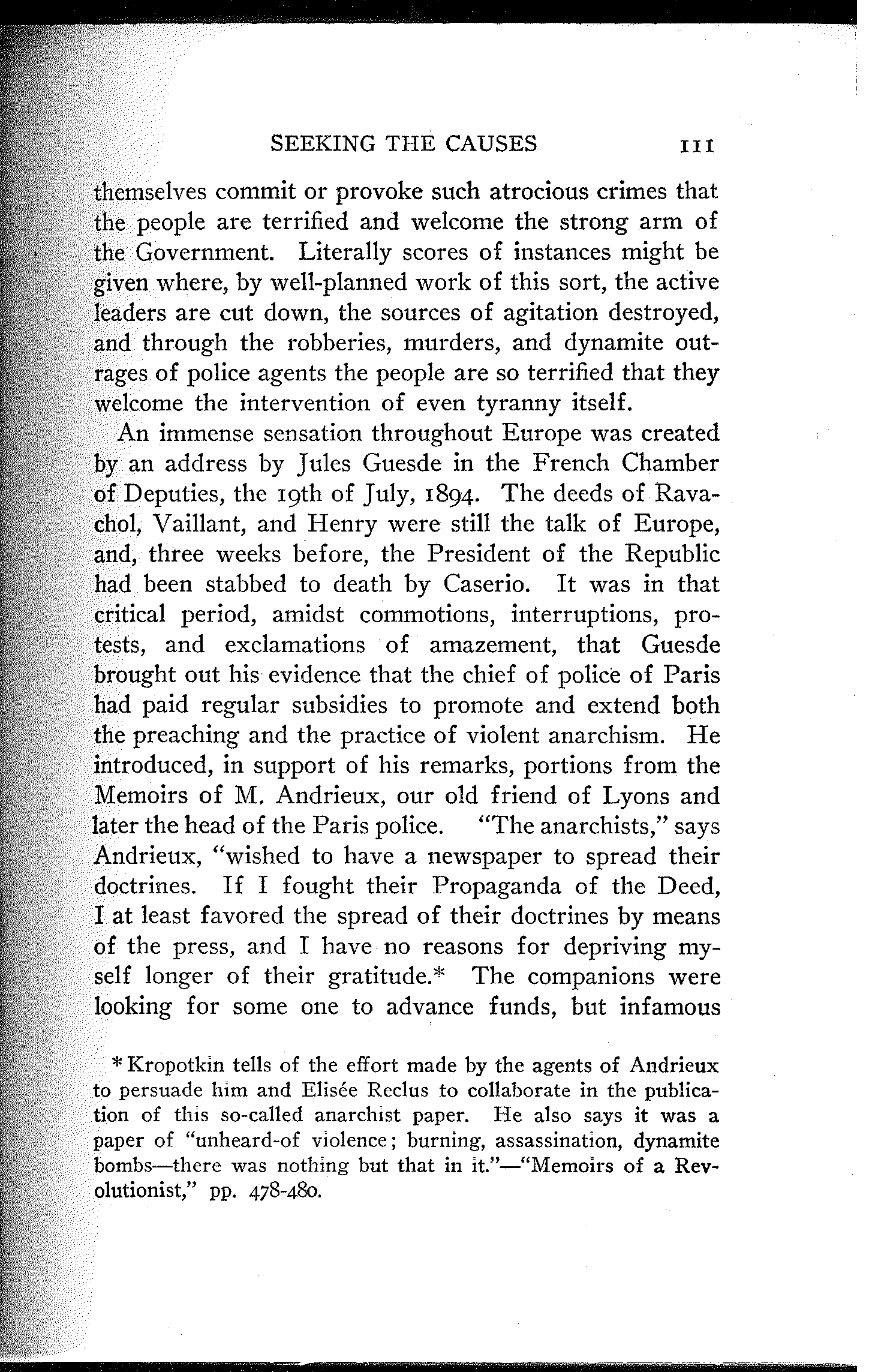 The dissensions over the use of force, that have been so continuous and passionate in the labor movement,[xii] arise from two diametrically opposed points of view. One is at bottom anarchistic, and looks upon all social evils as the result of individual wrong-doing. The other is at bottom socialistic, and looks upon all social evils as in the main the result of economic and social laws. To those who believe there are good trusts and bad trusts, good capitalists and bad capitalists, and that this is an adequate analysis of our economic ills, there is, of course, after all, nothing left but hatred of individuals and, in the extreme case, the desire to remove those individuals. To those, on the other hand, who see in certain underlying economic forces the source of nearly all of our distressing social evils, individual hatred and malice can make in reality no appeal. This volume, on its historical side, as well as in its survey of the psychology of the various elements in the labor movement, is a contribution to the study of the reactions that affect various minds and temperaments in the face of modern social wrongs. If one's point of view is that of the anarchist, he is led inevitably to make his war upon individuals. The more sensitive and sincere he is, the more bitter and implacable becomes that war. If one's point of view is based on what is now called the economic interpretation of history, one is emancipated, in so far as that is possible for emotional beings, from all hatred of individuals, and one sees before him only the necessity of readjusting the economic basis of our common life in order to achieve a more nearly perfect social order.