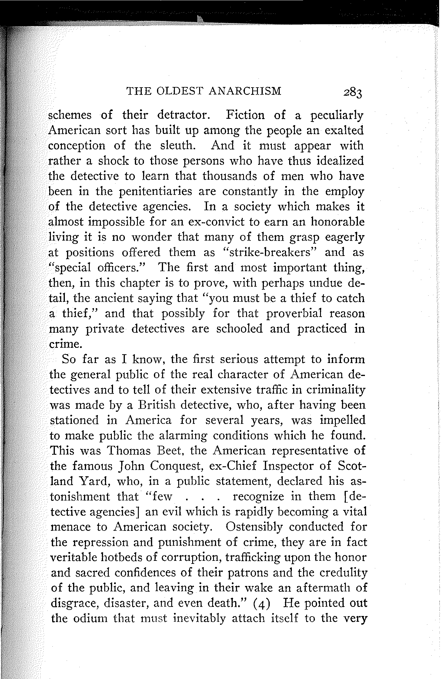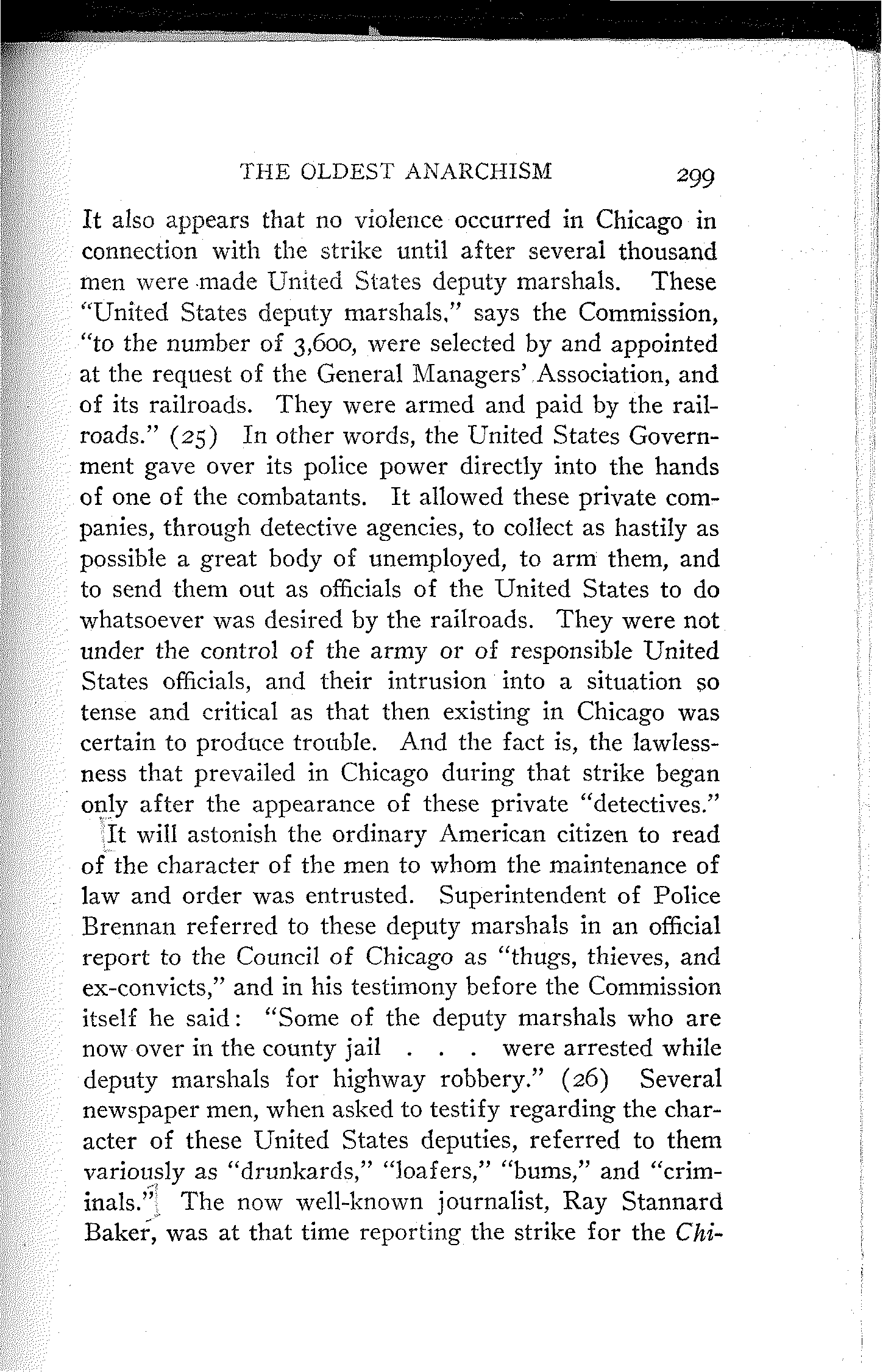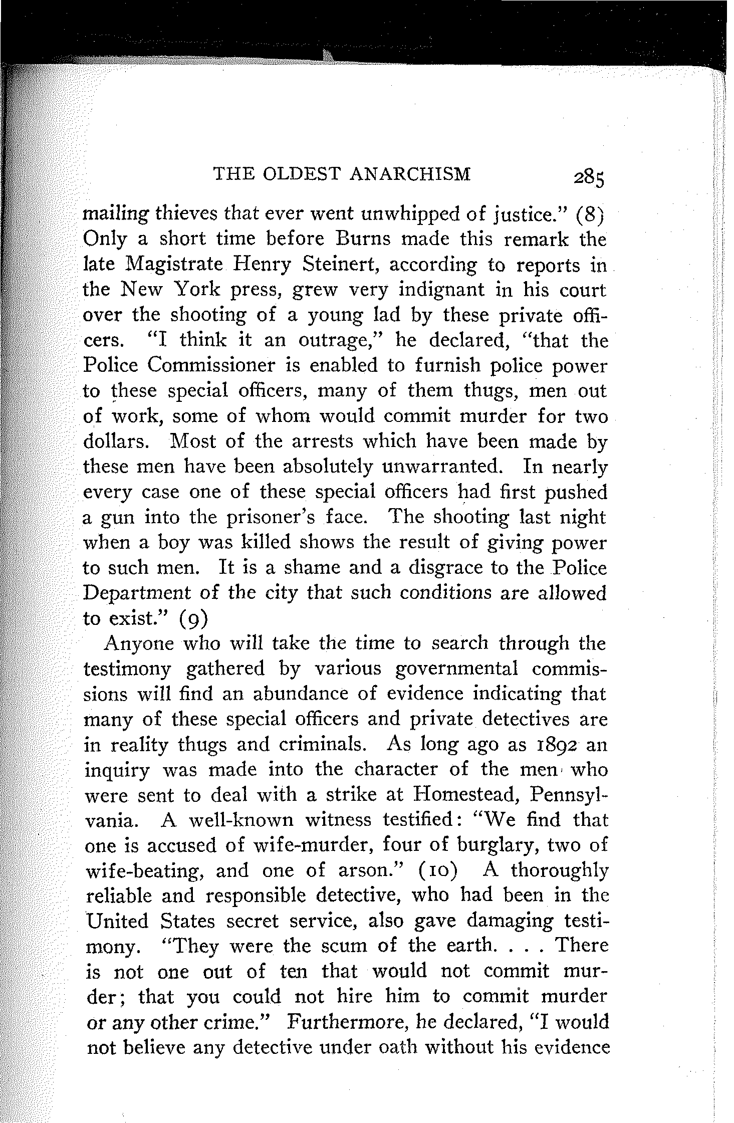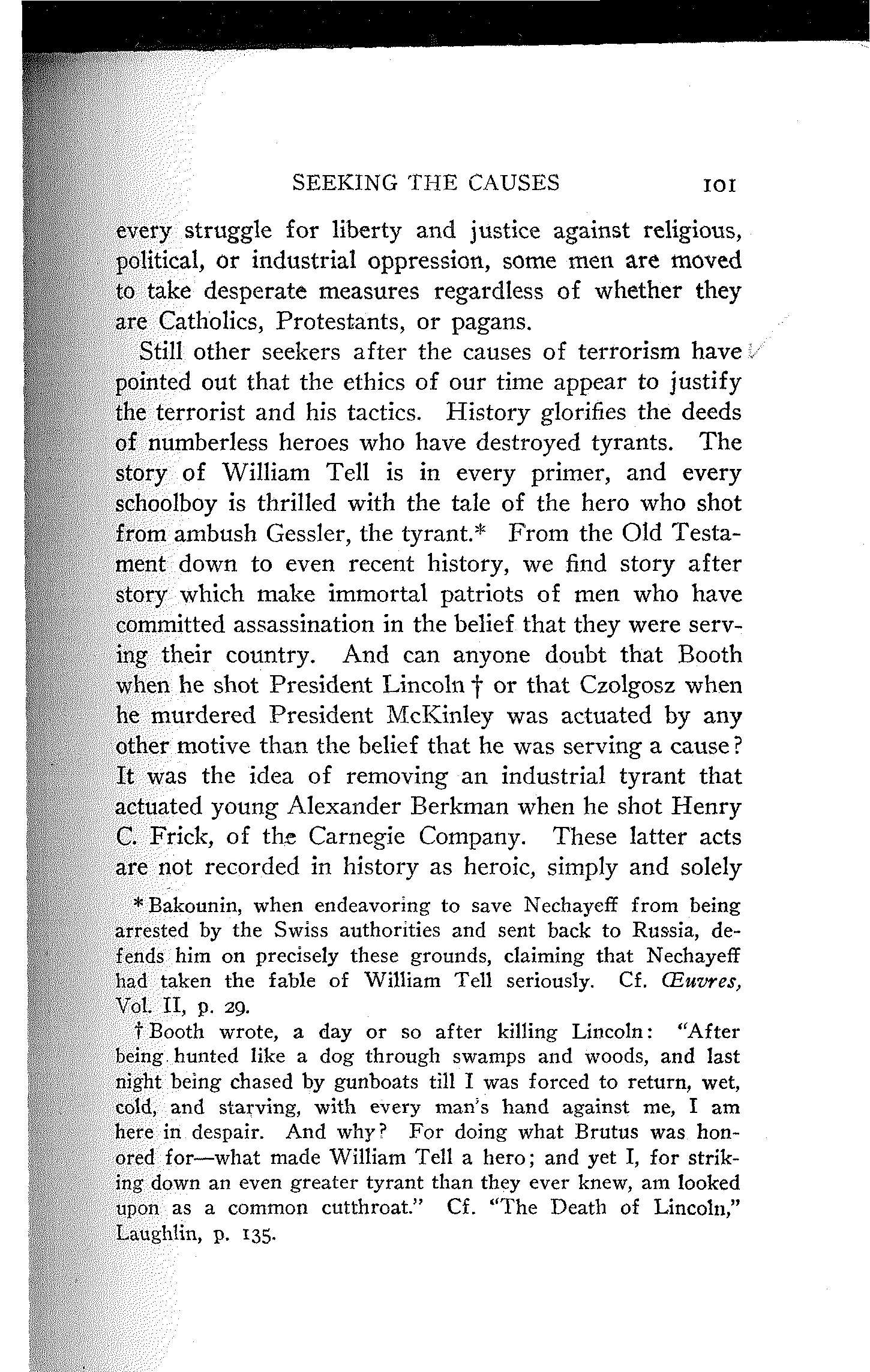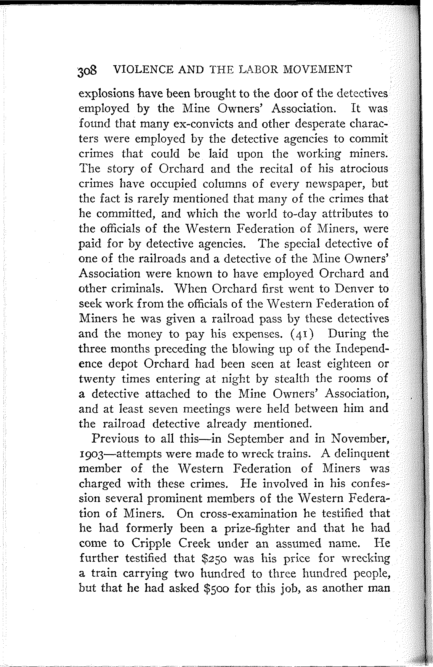 The dissensions over the use of force, that have been so continuous and passionate in the labor movement,[xii] arise from two diametrically opposed points of view. One is at bottom anarchistic, and looks upon all social evils as the result of individual wrong-doing. The other is at bottom socialistic, and looks upon all social evils as in the main the result of economic and social laws. To those who believe there are good trusts and bad trusts, good capitalists and bad capitalists, and that this is an adequate analysis of our economic ills, there is, of course, after all, nothing left but hatred of individuals and, in the extreme case, the desire to remove those individuals. To those, on the other hand, who see in certain underlying economic forces the source of nearly all of our distressing social evils, individual hatred and malice can make in reality no appeal. This volume, on its historical side, as well as in its survey of the psychology of the various elements in the labor movement, is a contribution to the study of the reactions that affect various minds and temperaments in the face of modern social wrongs. If one's point of view is that of the anarchist, he is led inevitably to make his war upon individuals. The more sensitive and sincere he is, the more bitter and implacable becomes that war. If one's point of view is based on what is now called the economic interpretation of history, one is emancipated, in so far as that is possible for emotional beings, from all hatred of individuals, and one sees before him only the necessity of readjusting the economic basis of our common life in order to achieve a more nearly perfect social order.