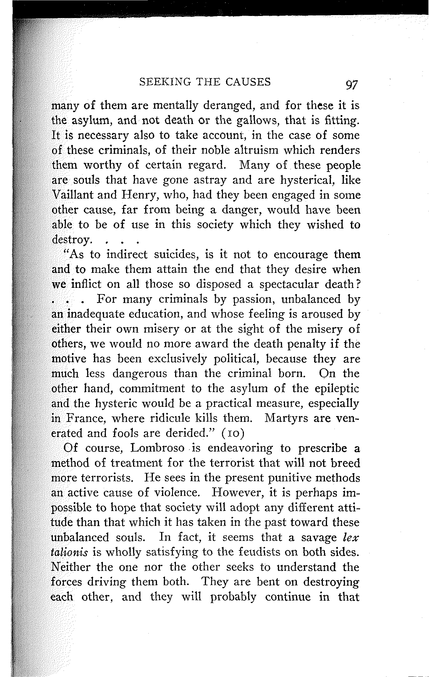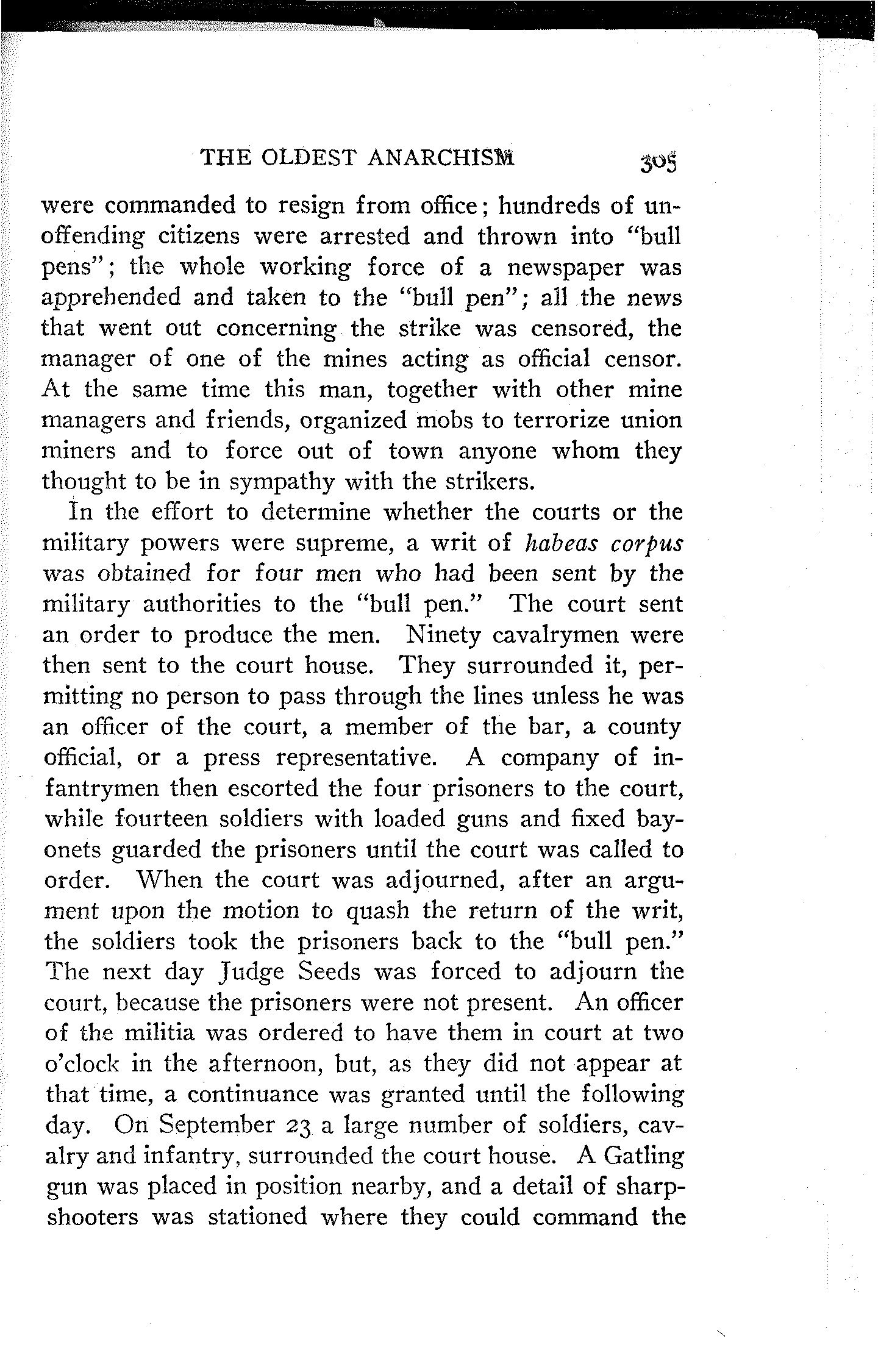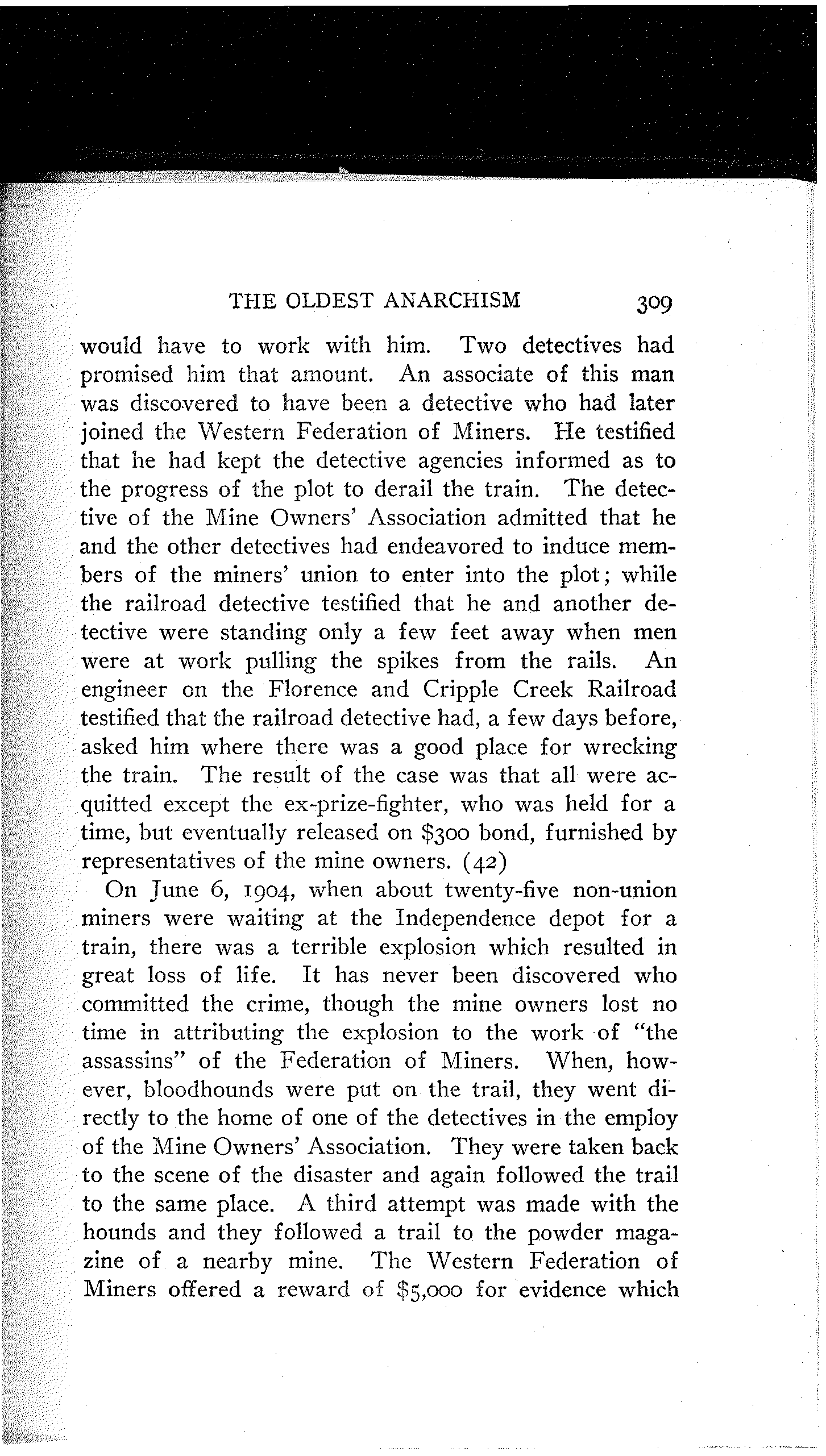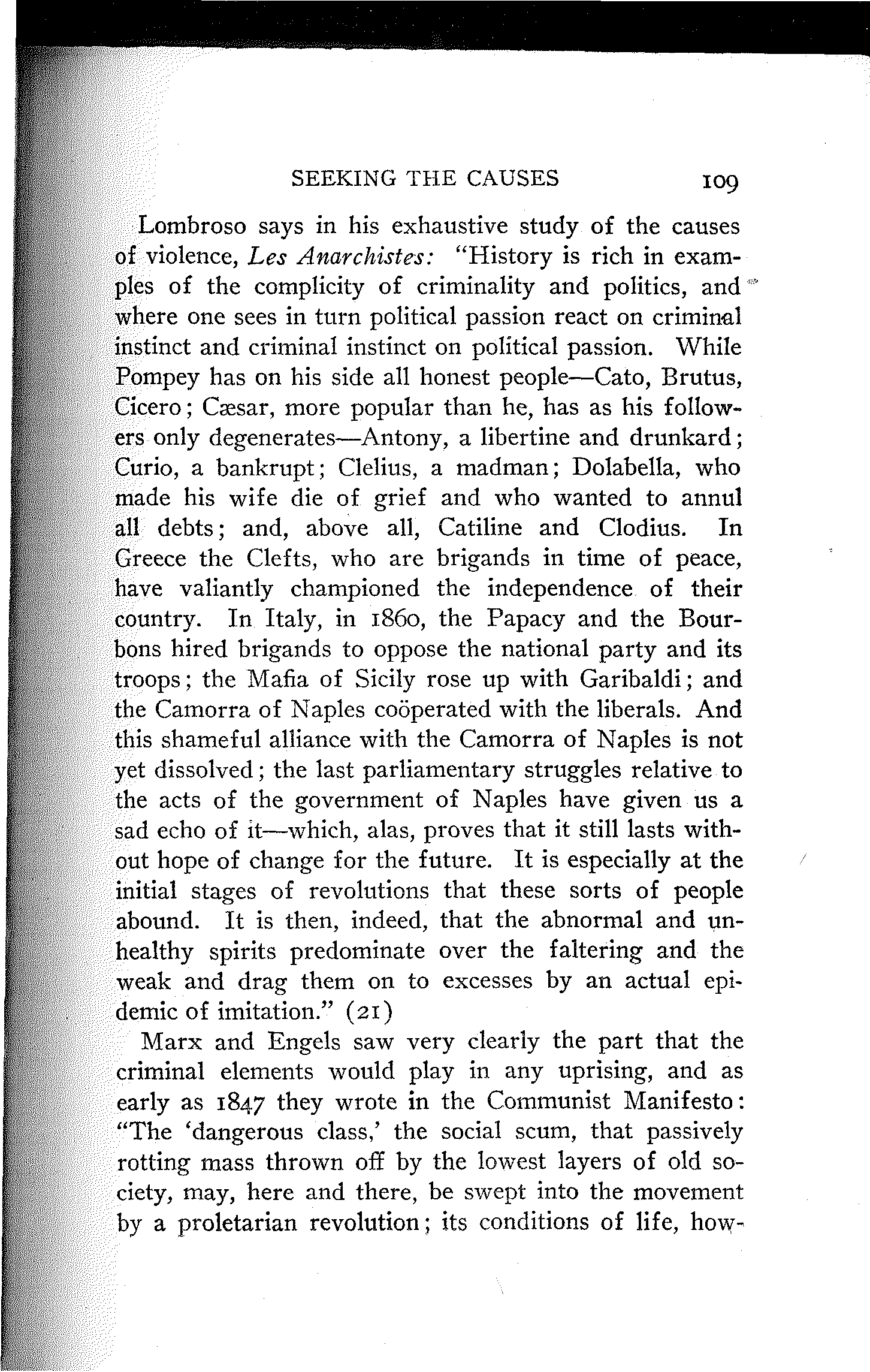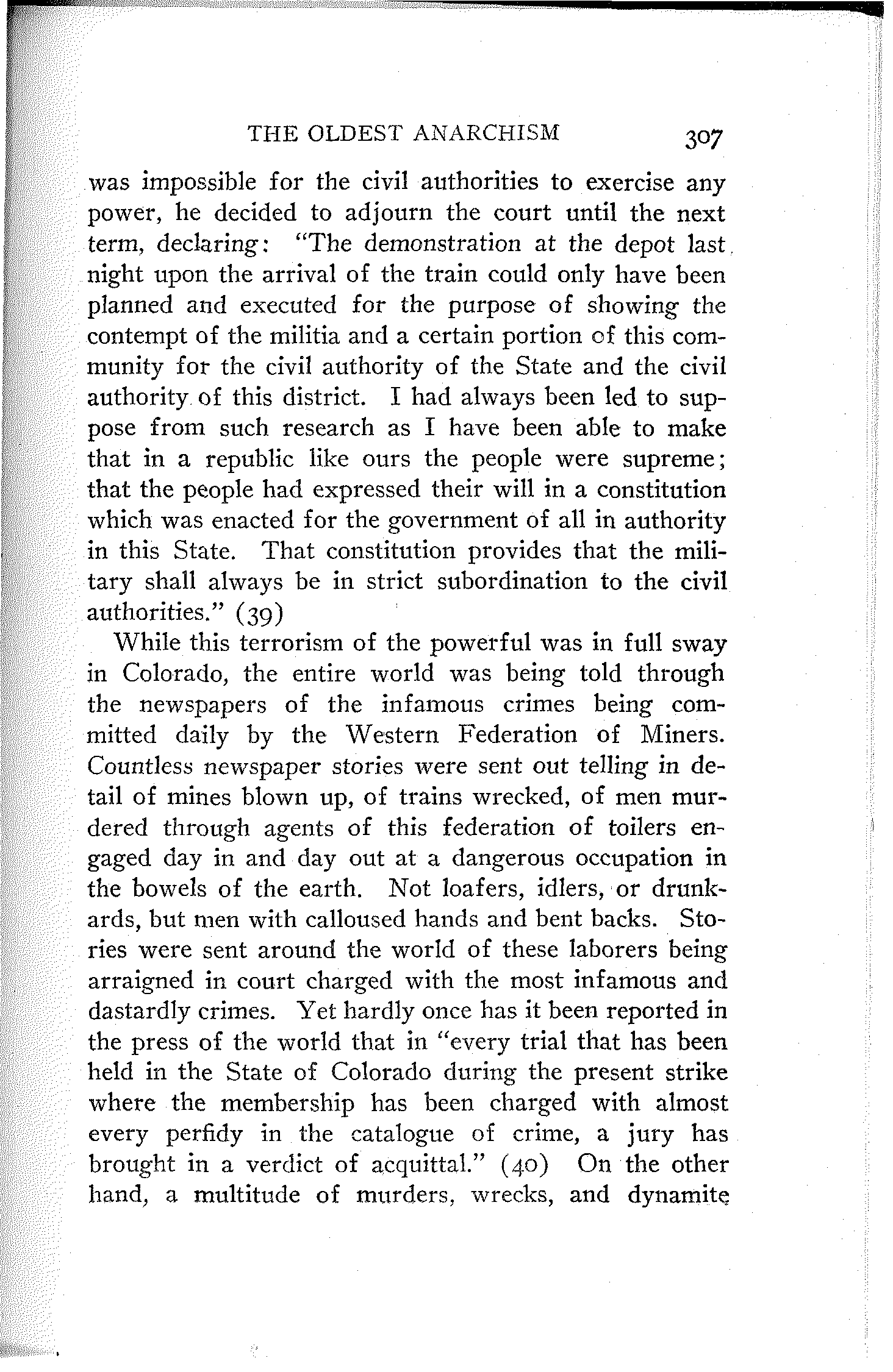 The dissensions over the use of force, that have been so continuous and passionate in the labor movement,[xii] arise from two diametrically opposed points of view. One is at bottom anarchistic, and looks upon all social evils as the result of individual wrong-doing. The other is at bottom socialistic, and looks upon all social evils as in the main the result of economic and social laws. To those who believe there are good trusts and bad trusts, good capitalists and bad capitalists, and that this is an adequate analysis of our economic ills, there is, of course, after all, nothing left but hatred of individuals and, in the extreme case, the desire to remove those individuals. To those, on the other hand, who see in certain underlying economic forces the source of nearly all of our distressing social evils, individual hatred and malice can make in reality no appeal. This volume, on its historical side, as well as in its survey of the psychology of the various elements in the labor movement, is a contribution to the study of the reactions that affect various minds and temperaments in the face of modern social wrongs. If one's point of view is that of the anarchist, he is led inevitably to make his war upon individuals. The more sensitive and sincere he is, the more bitter and implacable becomes that war. If one's point of view is based on what is now called the economic interpretation of history, one is emancipated, in so far as that is possible for emotional beings, from all hatred of individuals, and one sees before him only the necessity of readjusting the economic basis of our common life in order to achieve a more nearly perfect social order.
