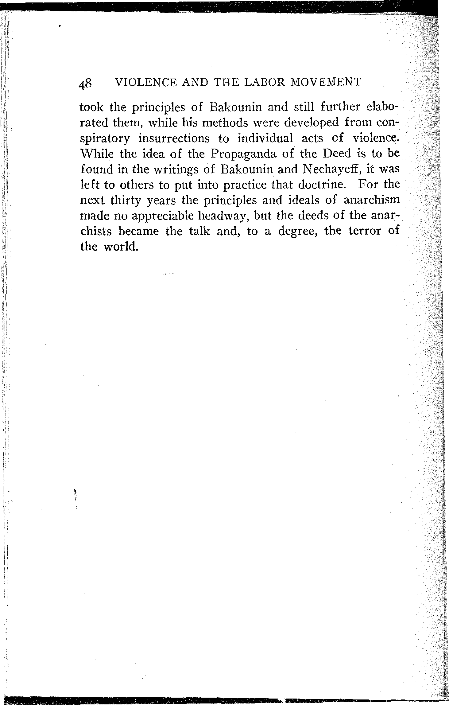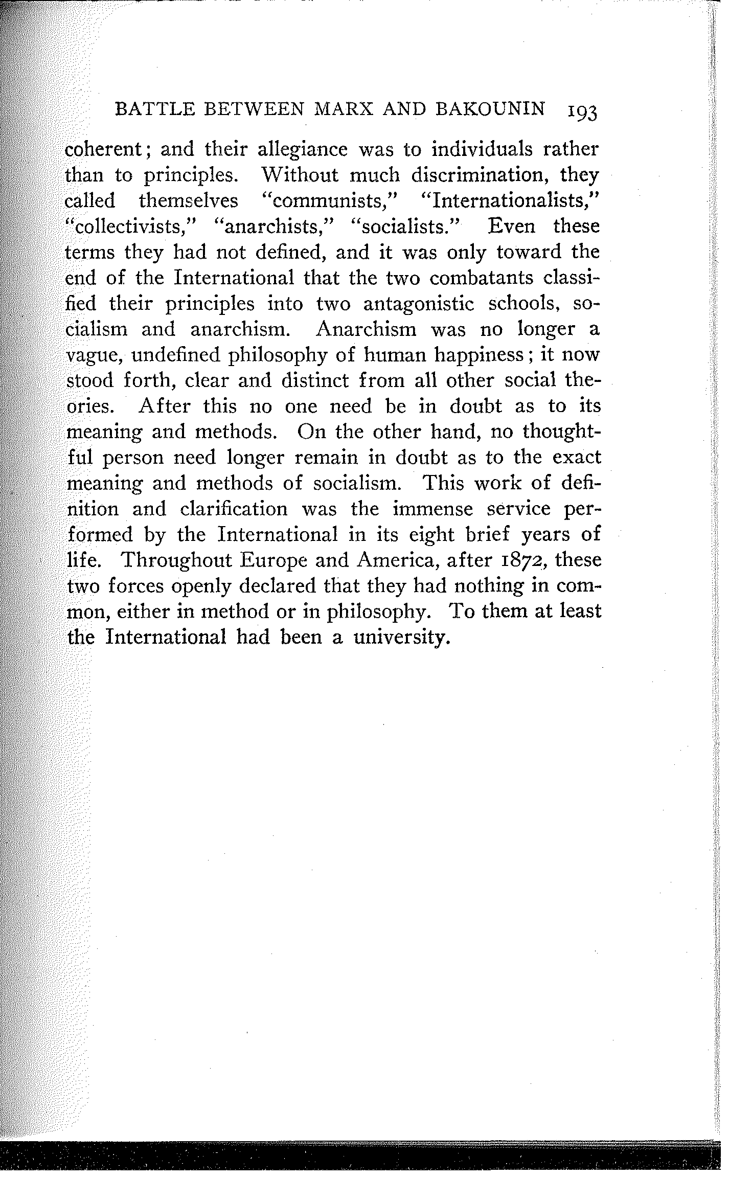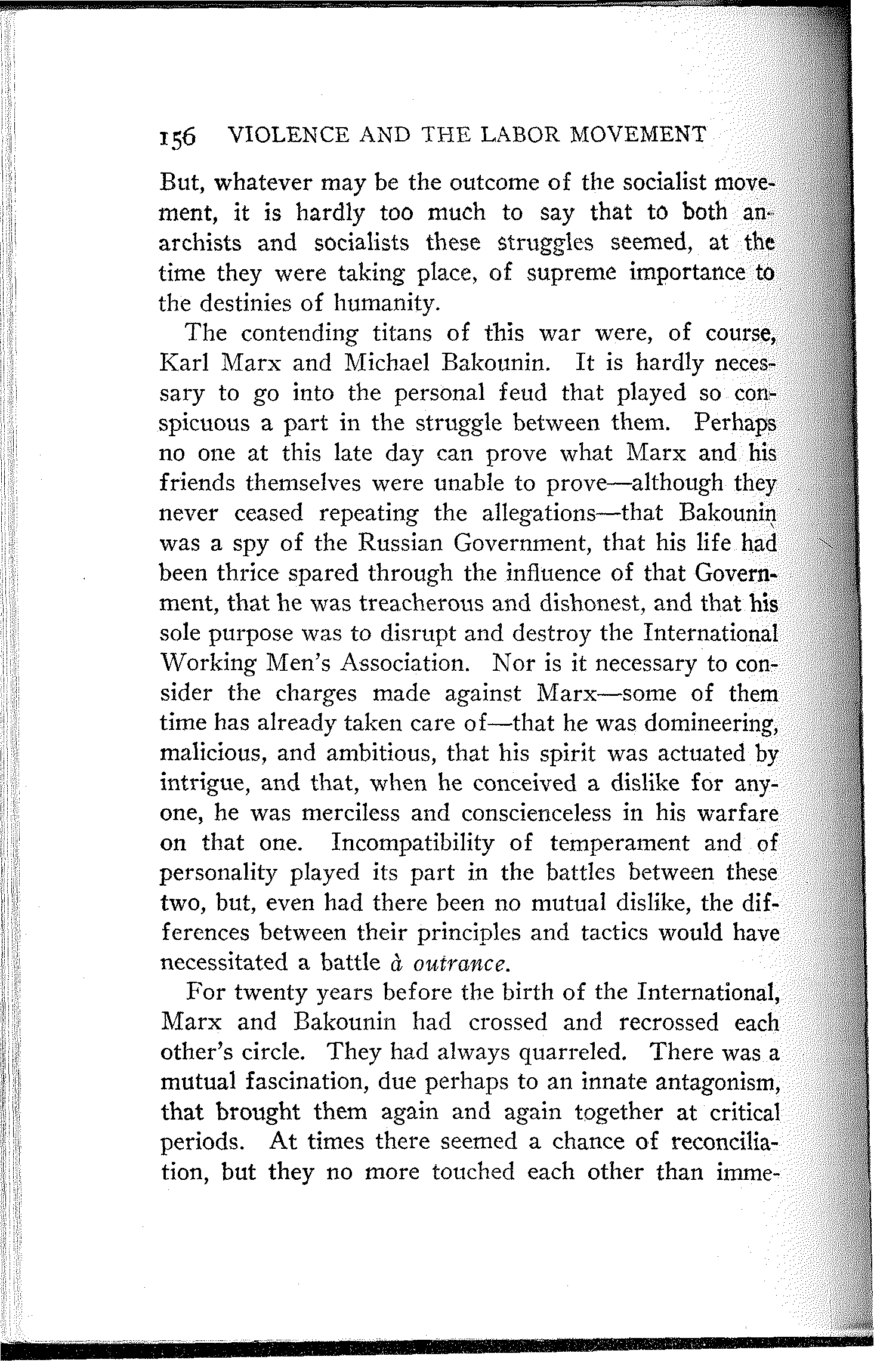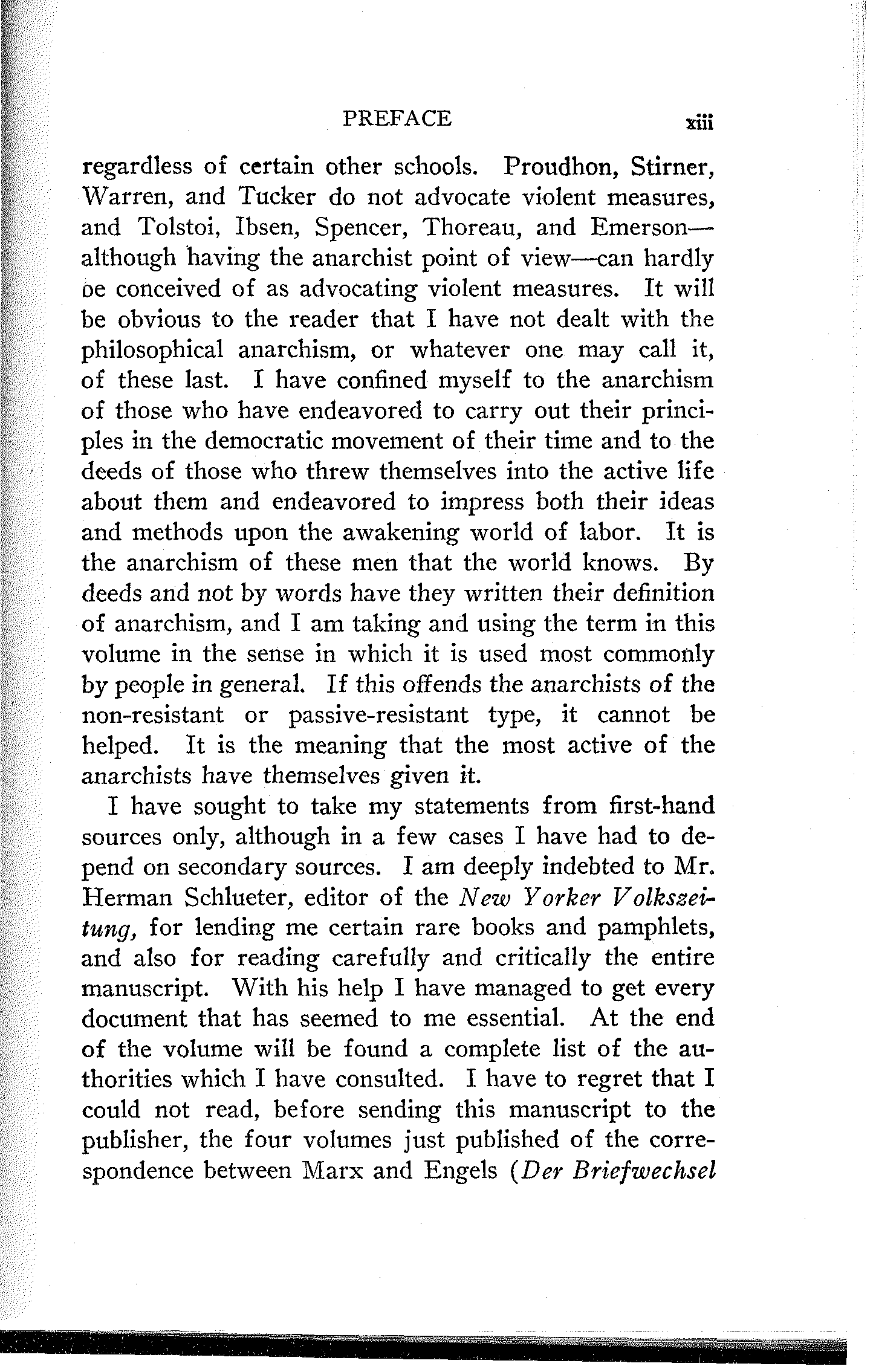 In contrasting the temperaments, the points of view, the philosophy, and the methods of these two antagonistic minds, I have been forced to take two extremes, the Bakouninist anarchist and the Marxian socialist. In the case of the former, it has been necessary to present the views of a particular school of anarchism, more or less[xiii] regardless of certain other schools. Proudhon, Stirner, Warren, and Tucker do not advocate violent measures, and Tolstoi, Ibsen, Spencer, Thoreau, and Emerson—although having the anarchist point of view—can hardly be conceived of as advocating violent measures. It will be obvious to the reader that I have not dealt with the philosophical anarchism, or whatever one may call it, of these last. I have confined myself to the anarchism of those who have endeavored to carry out their principles in the democratic movement of their time and to the deeds of those who threw themselves into the active life about them and endeavored to impress both their ideas and methods upon the awakening world of labor. It is the anarchism of these men that the world knows. By deeds and not by words have they written their definition of anarchism, and I am taking and using the term in this volume in the sense in which it is used most commonly by people in general. If this offends the anarchists of the non-resistant or passive-resistant type, it cannot be helped. It is the meaning that the most active of the anarchists have themselves given it.