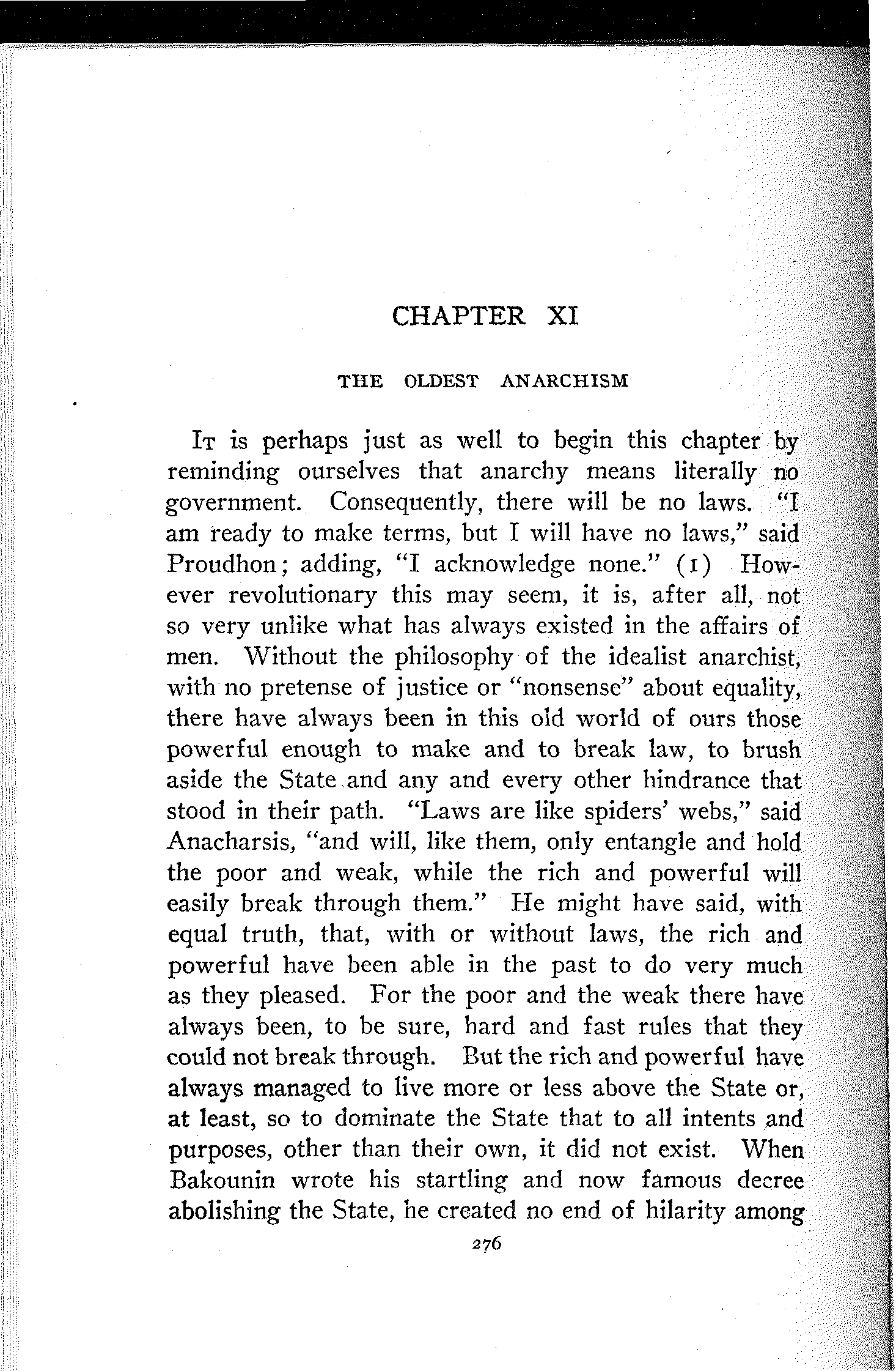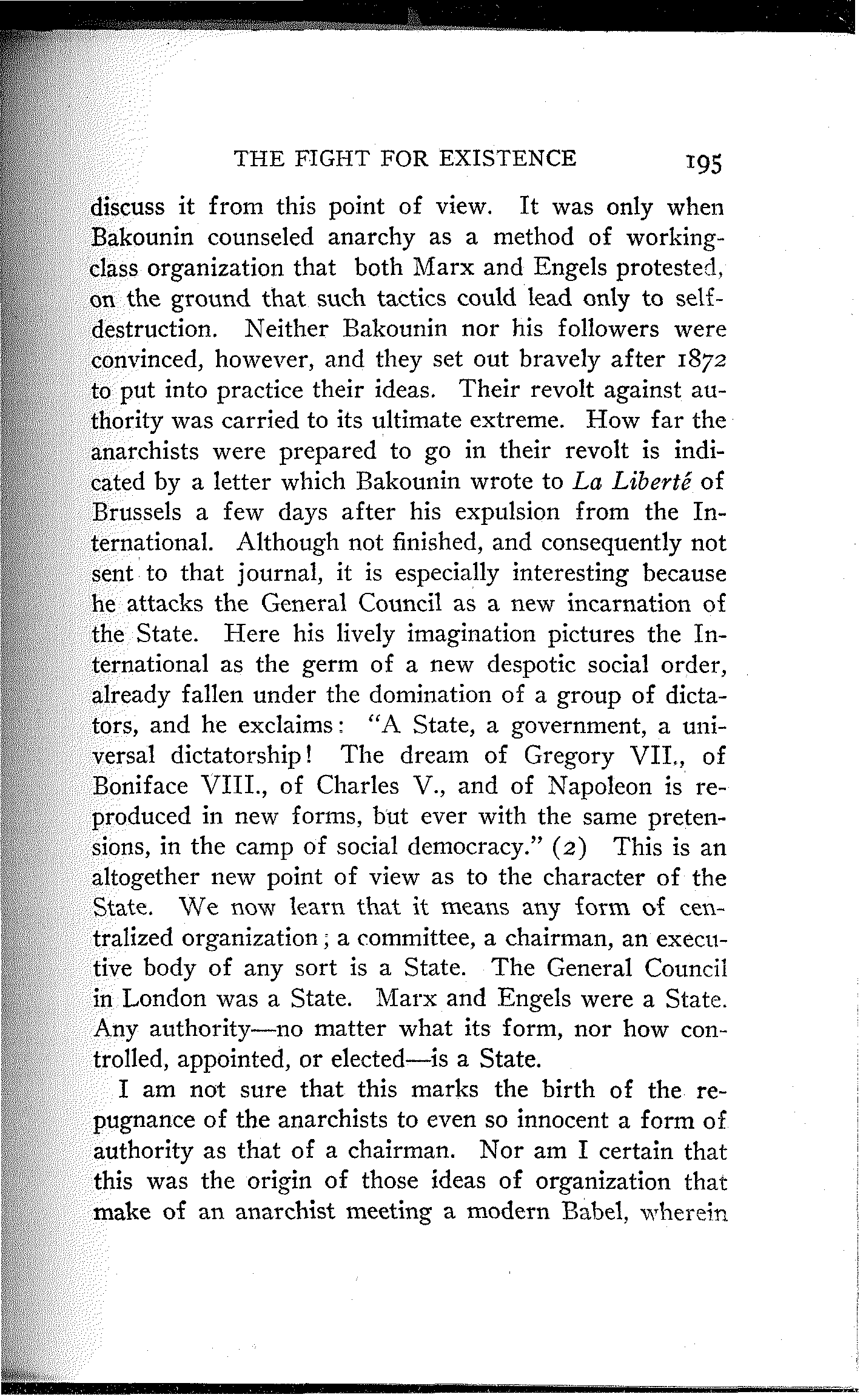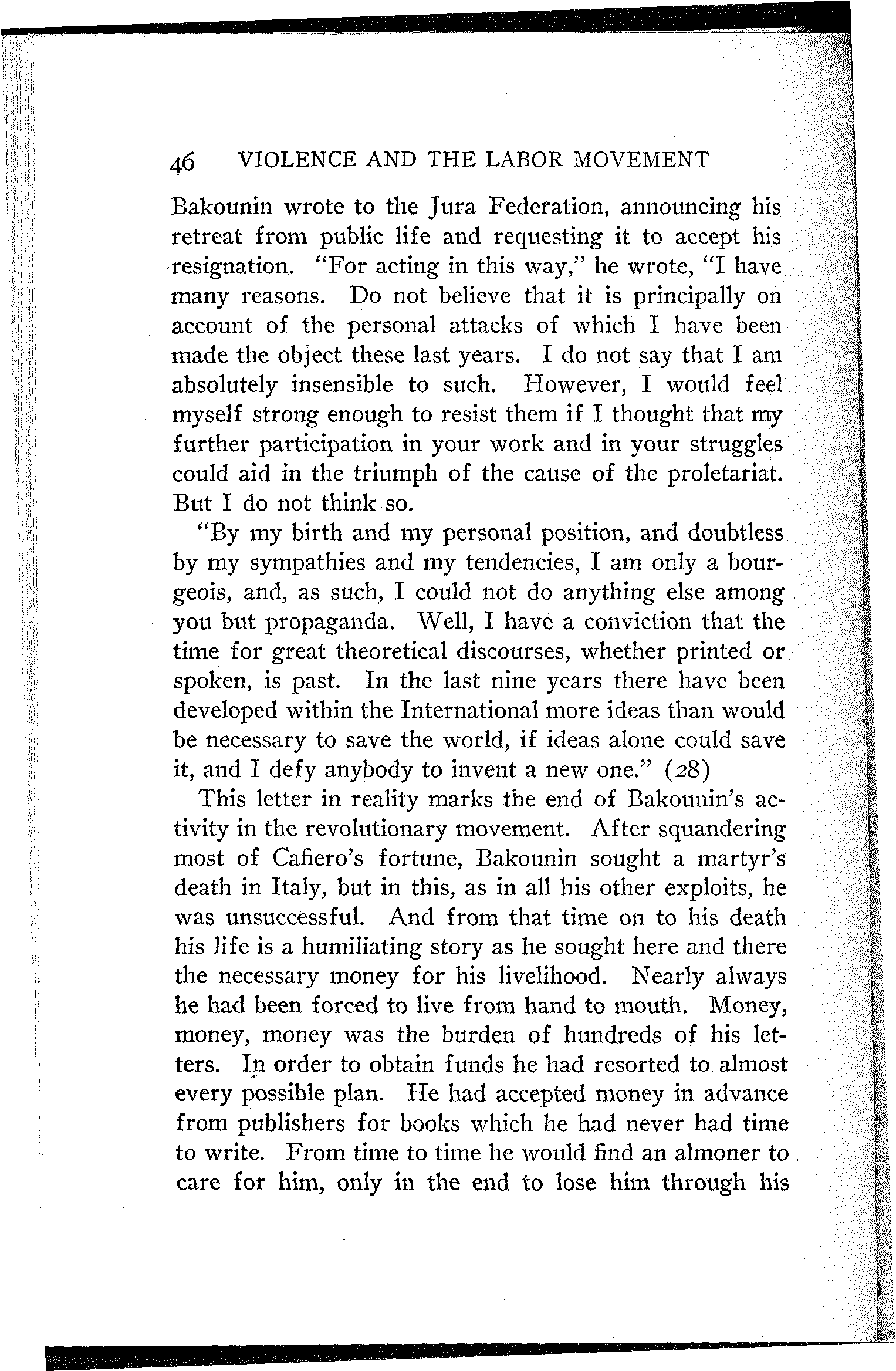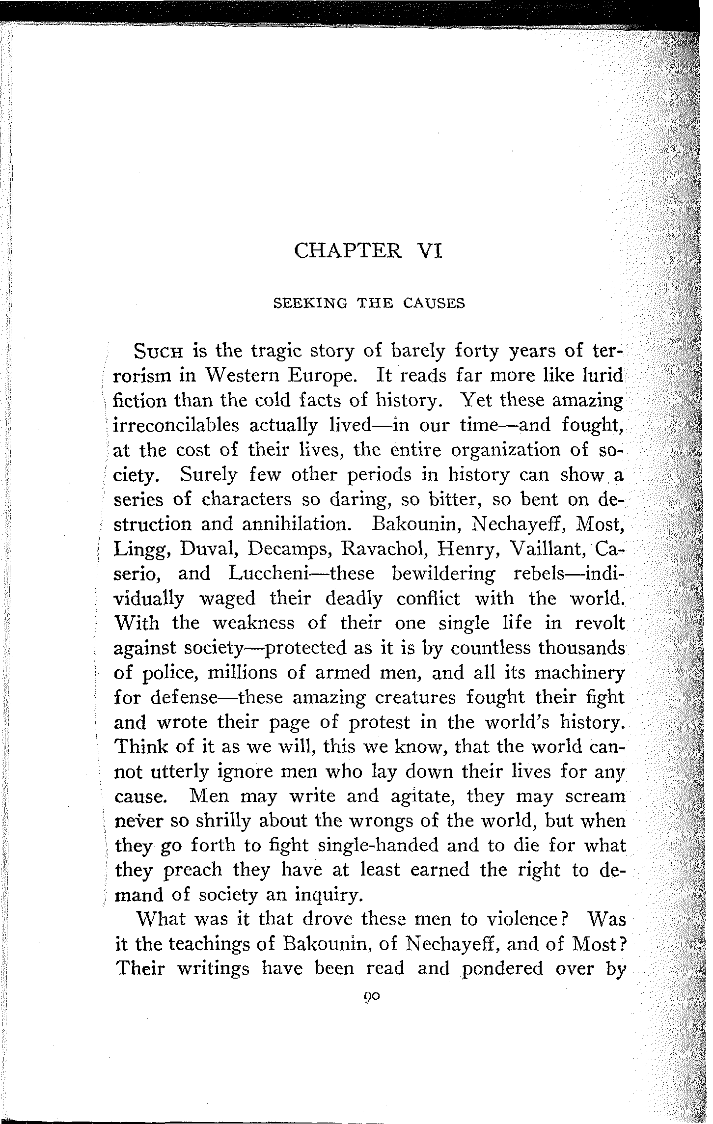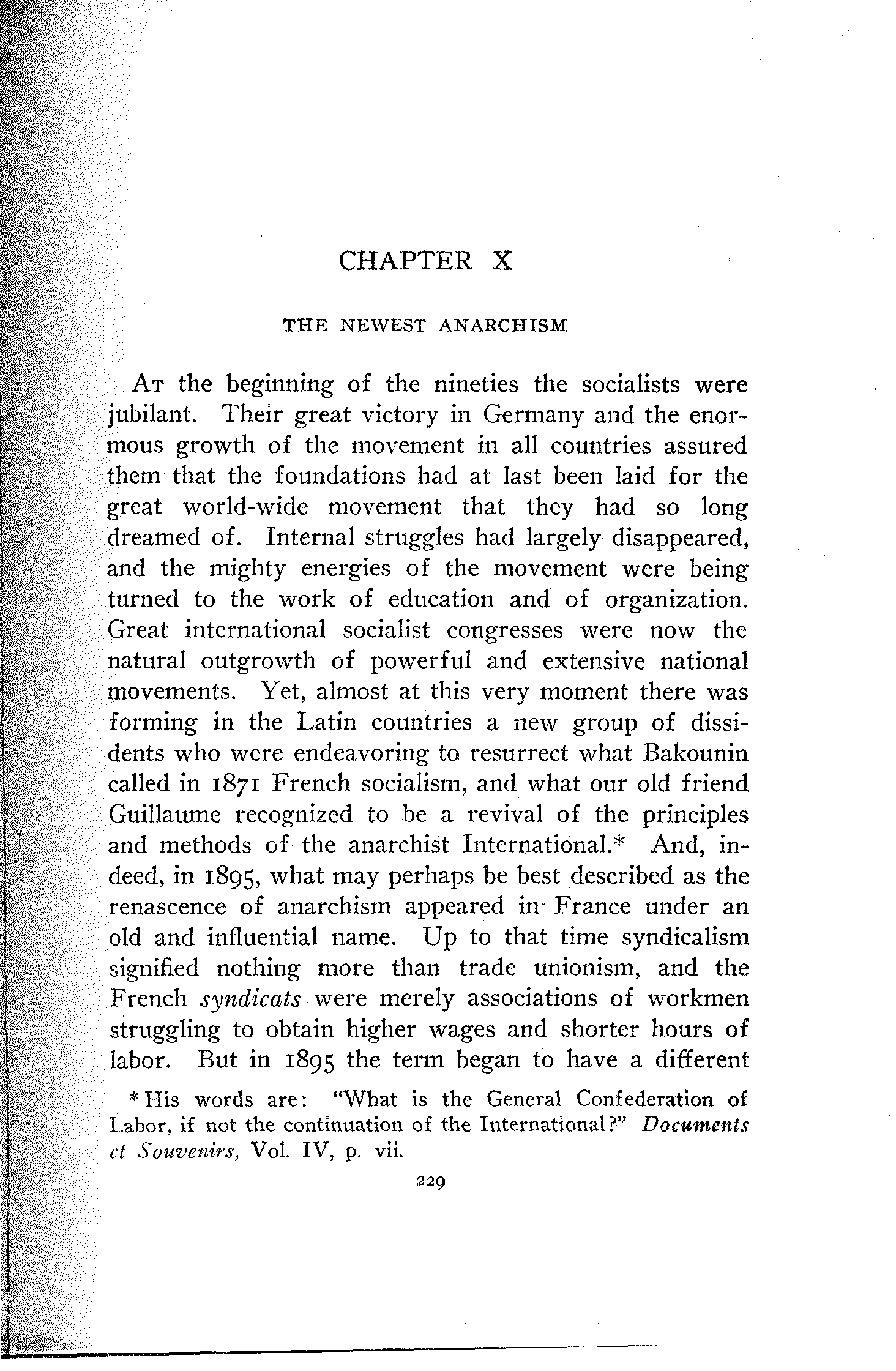In contrasting the temperaments, the points of view, the philosophy, and the methods of these two antagonistic minds, I have been forced to take two extremes, the Bakouninist anarchist and the Marxian socialist. In the case of the former, it has been necessary to present the views of a particular school of anarchism, more or less[xiii] regardless of certain other schools. Proudhon, Stirner, Warren, and Tucker do not advocate violent measures, and Tolstoi, Ibsen, Spencer, Thoreau, and Emerson—although having the anarchist point of view—can hardly be conceived of as advocating violent measures. It will be obvious to the reader that I have not dealt with the philosophical anarchism, or whatever one may call it, of these last. I have confined myself to the anarchism of those who have endeavored to carry out their principles in the democratic movement of their time and to the deeds of those who threw themselves into the active life about them and endeavored to impress both their ideas and methods upon the awakening world of labor. It is the anarchism of these men that the world knows. By deeds and not by words have they written their definition of anarchism, and I am taking and using the term in this volume in the sense in which it is used most commonly by people in general. If this offends the anarchists of the non-resistant or passive-resistant type, it cannot be helped. It is the meaning that the most active of the anarchists have themselves given it.
