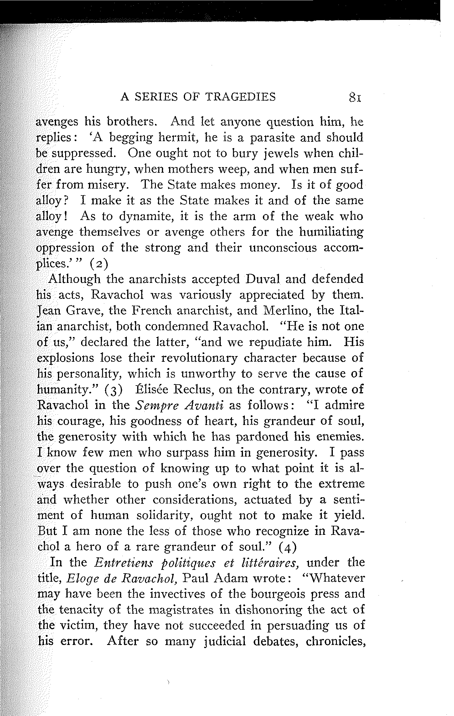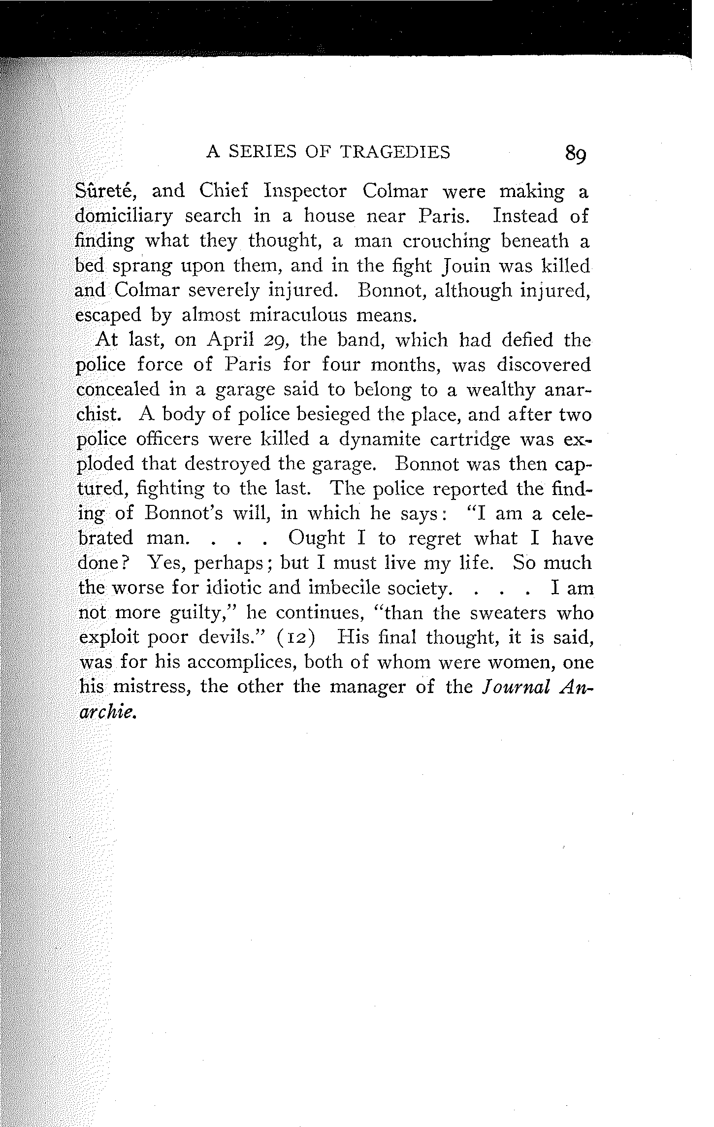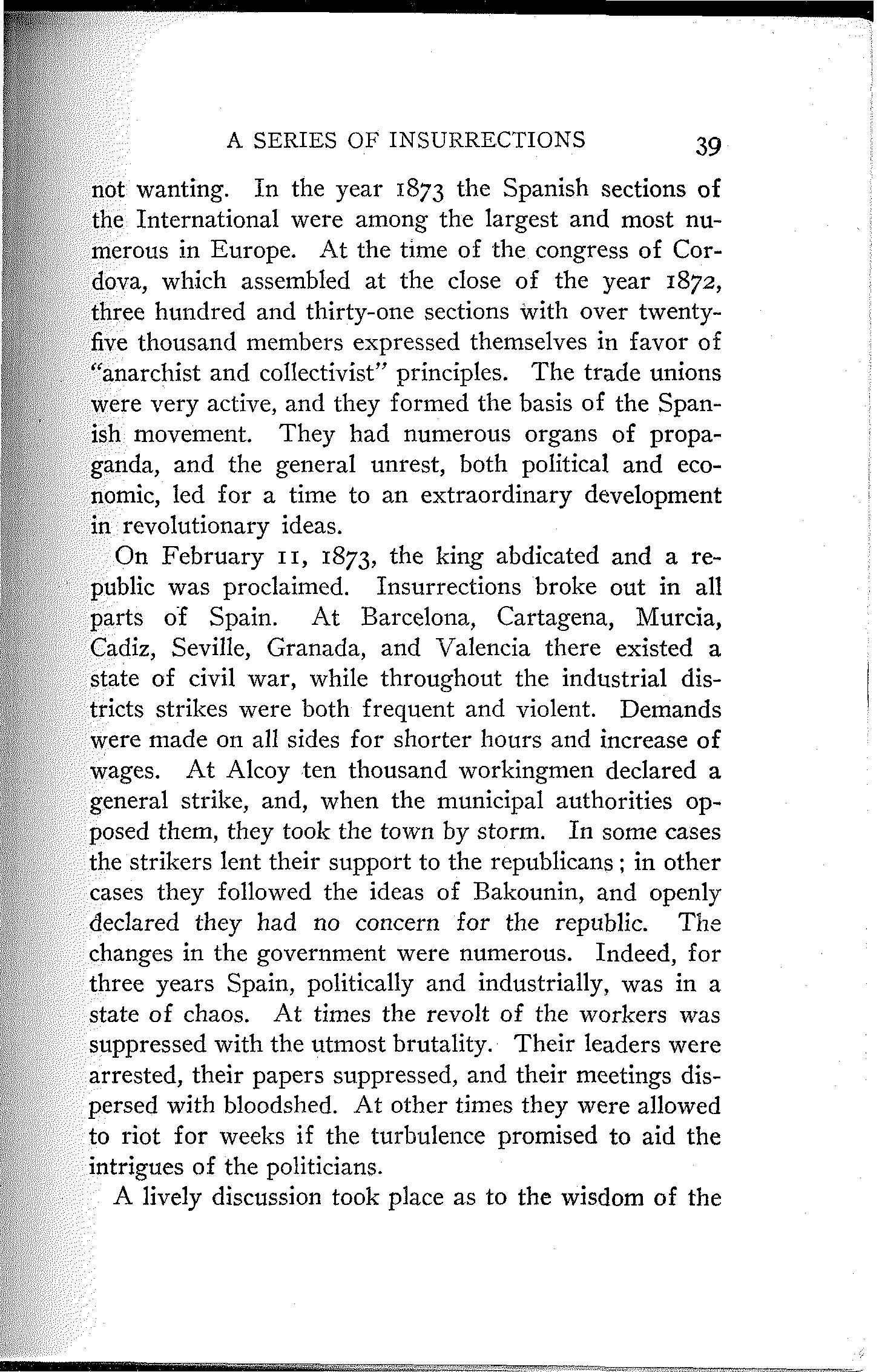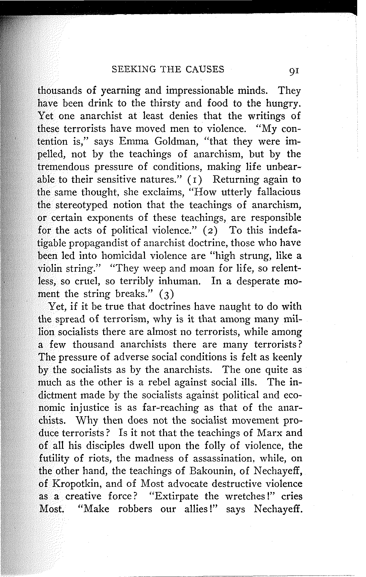 In contrasting the temperaments, the points of view, the philosophy, and the methods of these two antagonistic minds, I have been forced to take two extremes, the Bakouninist anarchist and the Marxian socialist. In the case of the former, it has been necessary to present the views of a particular school of anarchism, more or less[xiii] regardless of certain other schools. Proudhon, Stirner, Warren, and Tucker do not advocate violent measures, and Tolstoi, Ibsen, Spencer, Thoreau, and Emerson—although having the anarchist point of view—can hardly be conceived of as advocating violent measures. It will be obvious to the reader that I have not dealt with the philosophical anarchism, or whatever one may call it, of these last. I have confined myself to the anarchism of those who have endeavored to carry out their principles in the democratic movement of their time and to the deeds of those who threw themselves into the active life about them and endeavored to impress both their ideas and methods upon the awakening world of labor. It is the anarchism of these men that the world knows. By deeds and not by words have they written their definition of anarchism, and I am taking and using the term in this volume in the sense in which it is used most commonly by people in general. If this offends the anarchists of the non-resistant or passive-resistant type, it cannot be helped. It is the meaning that the most active of the anarchists have themselves given it.