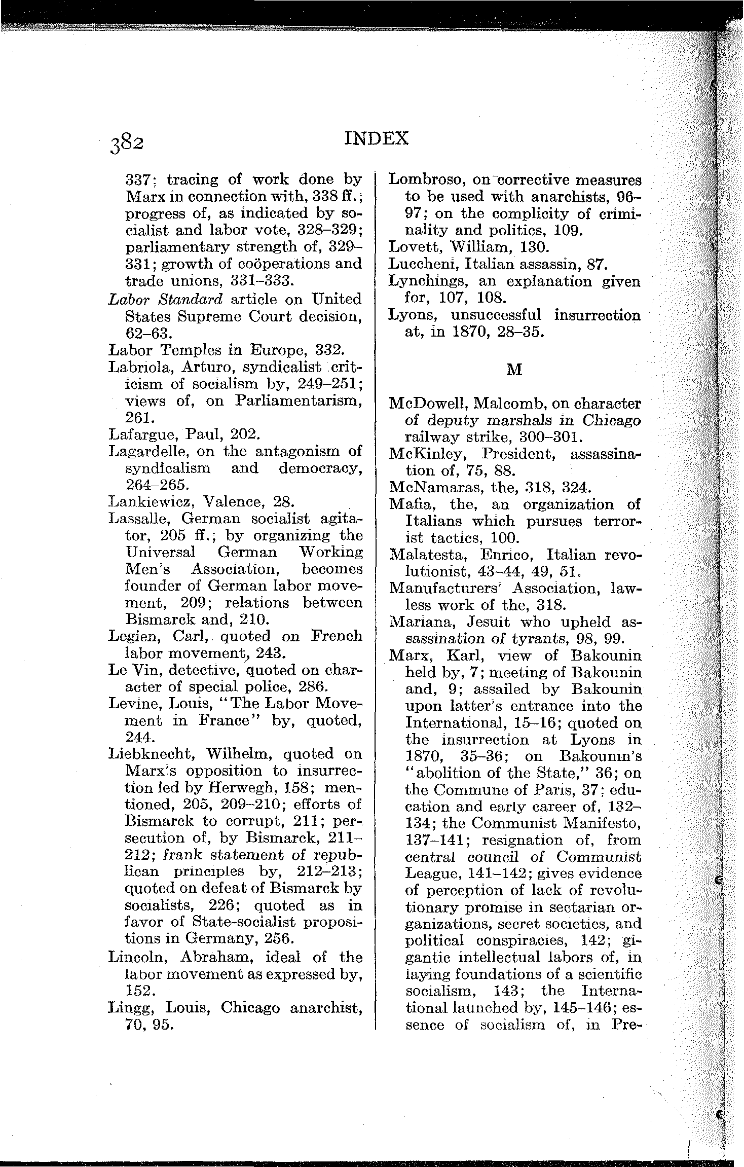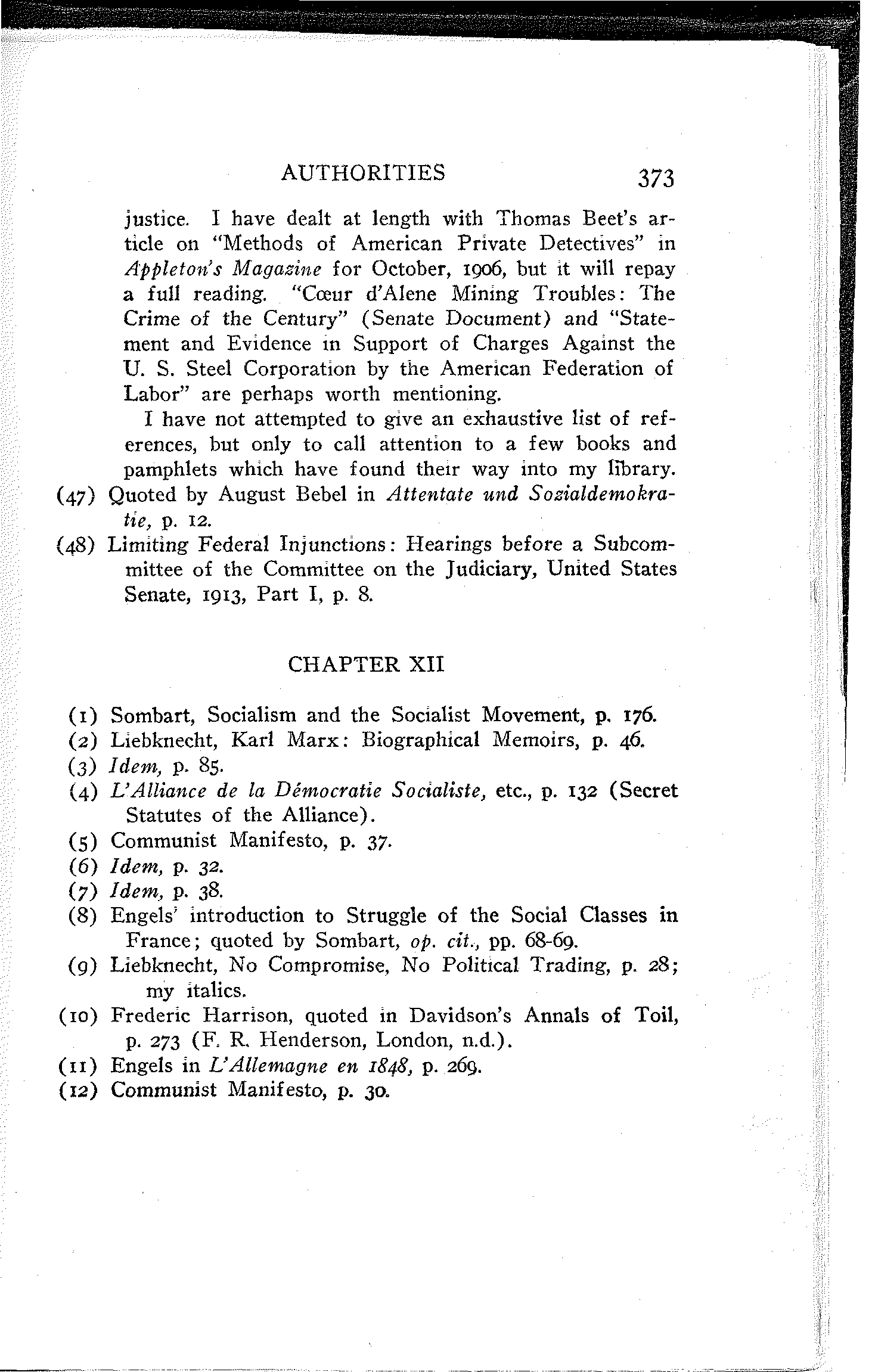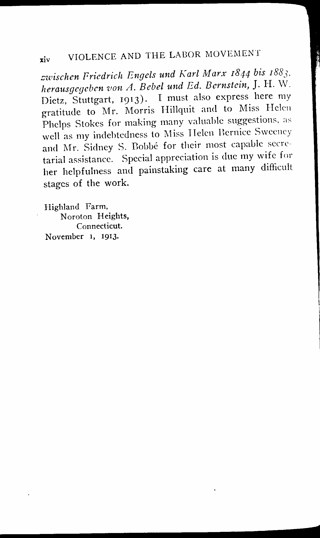 I have sought to take my statements from first-hand sources only, although in a few cases I have had to depend on secondary sources. I am deeply indebted to Mr. Herman Schlueter, editor of the New Yorker Volkszeitung, for lending me certain rare books and pamphlets, and also for reading carefully and critically the entire manuscript. With his help I have managed to get every document that has seemed to me essential. At the end of the volume will be found a complete list of the authorities which I have consulted. I have to regret that I could not read, before sending this manuscript to the publisher, the four volumes just published of the correspondence between Marx and Engels [xiv](Der Briefwechsel zwischen Friedrich Engels und Karl Marx 1844 bis 1833, herausgegeben von A. Bebel und Ed. Bernstein, J. H. W. Dietz, Stuttgart, 1913). I must also express here my gratitude to Mr. Morris Hillquit and to Miss Helen Phelps Stokes for making many valuable suggestions, as well as my indebtedness to Miss Helen Bernice Sweeney and Mr. Sidney S. Bobbé for their most capable secretarial assistance. Special appreciation is due my wife for her helpfulness and painstaking care at many difficult stages of the work.