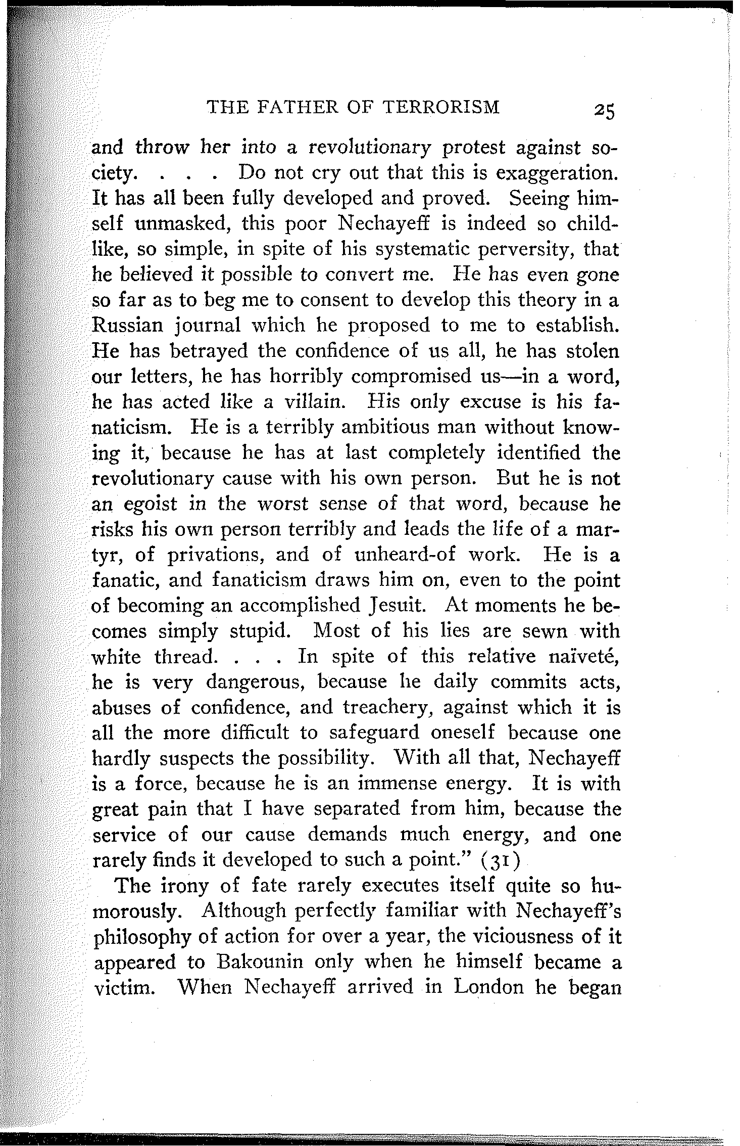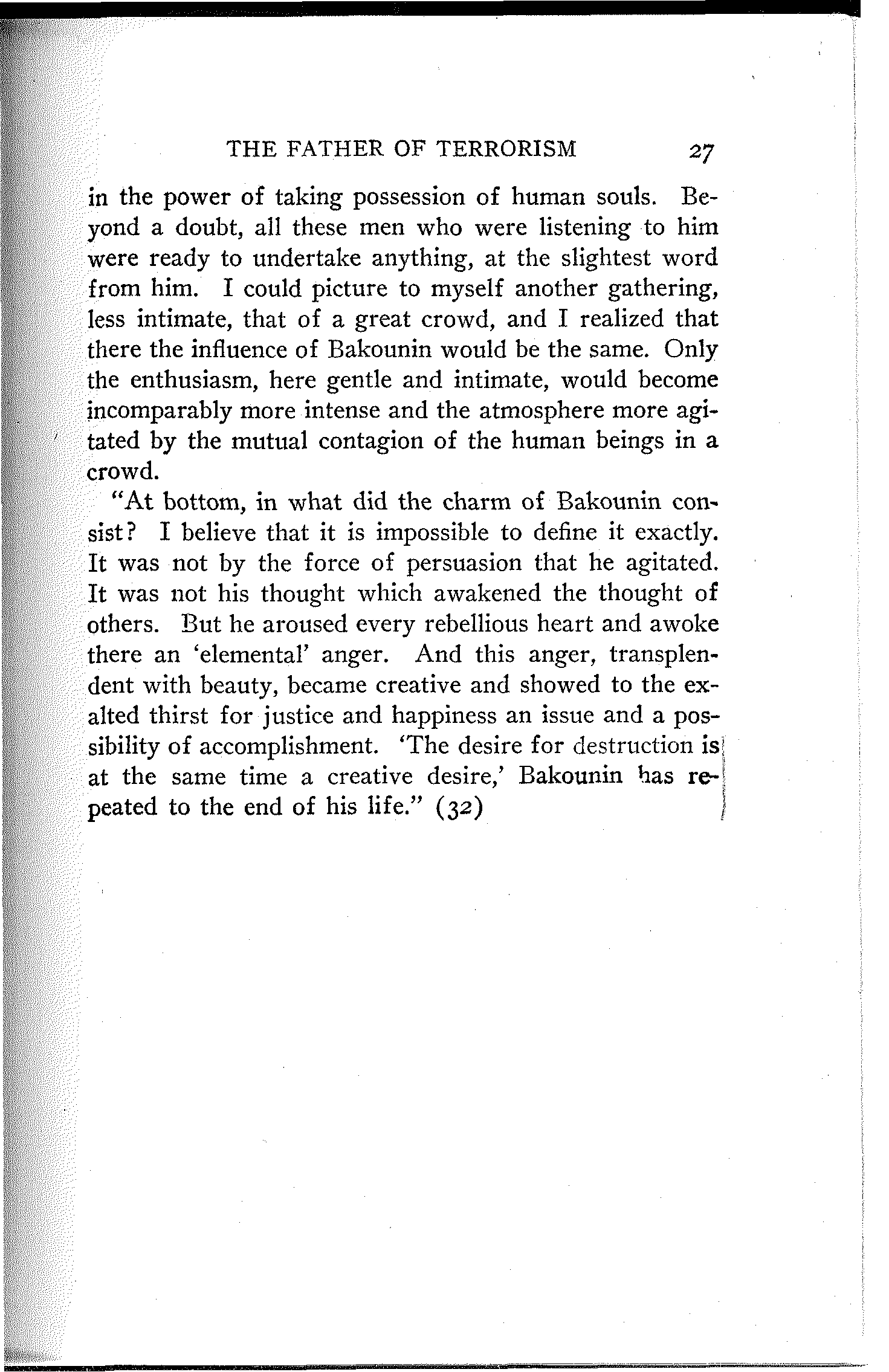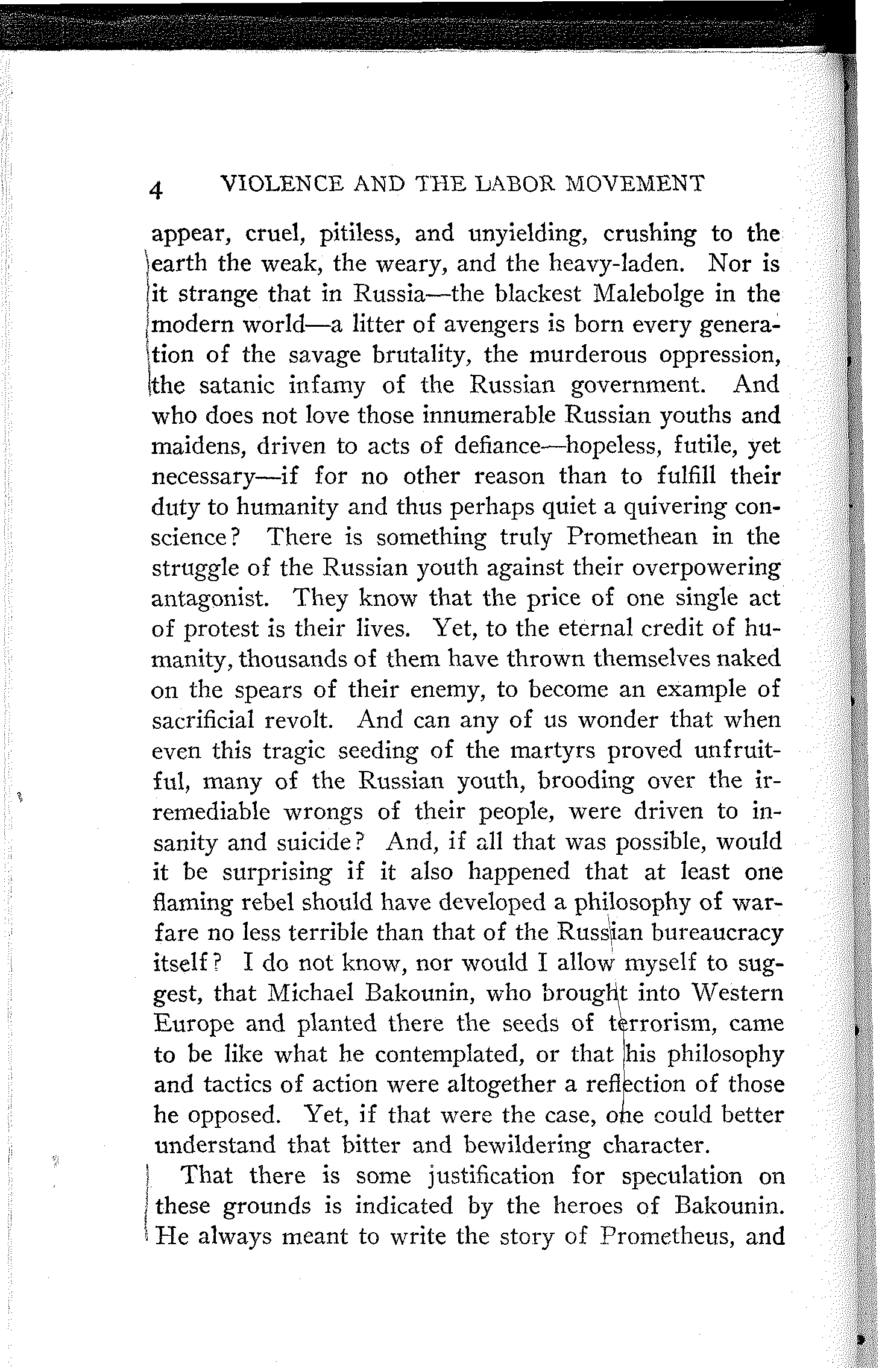 It would not be strange, then, if here and there a man's entire nature were transfigured when he sees a monster[4] appear, cruel, pitiless, and unyielding, crushing to the earth the weak, the weary, and the heavy-laden. Nor is it strange that in Russia—the blackest Malebolge in the modern world—a litter of avengers is born every generation of the savage brutality, the murderous oppression, the satanic infamy of the Russian government. And who does not love those innumerable Russian youths and maidens, driven to acts of defiance—hopeless, futile, yet necessary—if for no other reason than to fulfill their duty to humanity and thus perhaps quiet a quivering conscience? There is something truly Promethean in the struggle of the Russian youth against their overpowering antagonist. They know that the price of one single act of protest is their lives. Yet, to the eternal credit of humanity, thousands of them have thrown themselves naked on the spears of their enemy, to become an example of sacrificial revolt. And can any of us wonder that when even this tragic seeding of the martyrs proved unfruitful, many of the Russian youth, brooding over the irremediable wrongs of their people, were driven to insanity and suicide? And, if all that was possible, would it be surprising if it also happened that at least one flaming rebel should have developed a philosophy of warfare no less terrible than that of the Russian bureaucracy itself? I do not know, nor would I allow myself to suggest, that Michael Bakounin, who brought into Western Europe and planted there the seeds of terrorism, came to be like what he contemplated, or that his philosophy and tactics of action were altogether a reflection of those he opposed. Yet, if that were the case, one could better understand that bitter and bewildering character.