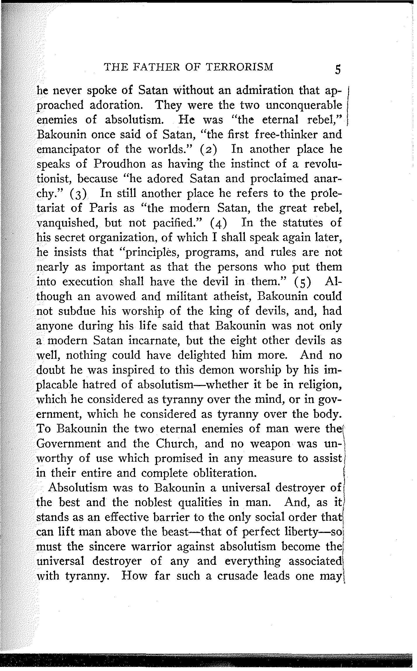 That there is some justification for speculation on these grounds is indicated by the heroes of Bakounin. He always meant to write the story of Prometheus, and[5] he never spoke of Satan without an admiration that approached adoration. They were the two unconquerable enemies of absolutism. He was "the eternal rebel," Bakounin once said of Satan, "the first free-thinker and emancipator of the worlds." (2) In another place he speaks of Proudhon as having the instinct of a revolutionist, because "he adored Satan and proclaimed anarchy." (3) In still another place he refers to the proletariat of Paris as "the modern Satan, the great rebel, vanquished, but not pacified." (4) In the statutes of his secret organization, of which I shall speak again later, he insists that "principles, programs, and rules are not nearly as important as that the persons who put them into execution shall have the devil in them." (5) Although an avowed and militant atheist, Bakounin could not subdue his worship of the king of devils, and, had anyone during his life said that Bakounin was not only a modern Satan incarnate, but the eight other devils as well, nothing could have delighted him more. And no doubt he was inspired to this demon worship by his implacable hatred of absolutism—whether it be in religion, which he considered as tyranny over the mind, or in government, which he considered as tyranny over the body. To Bakounin the two eternal enemies of man were the Government and the Church, and no weapon was unworthy of use which promised in any measure to assist in their entire and complete obliteration.