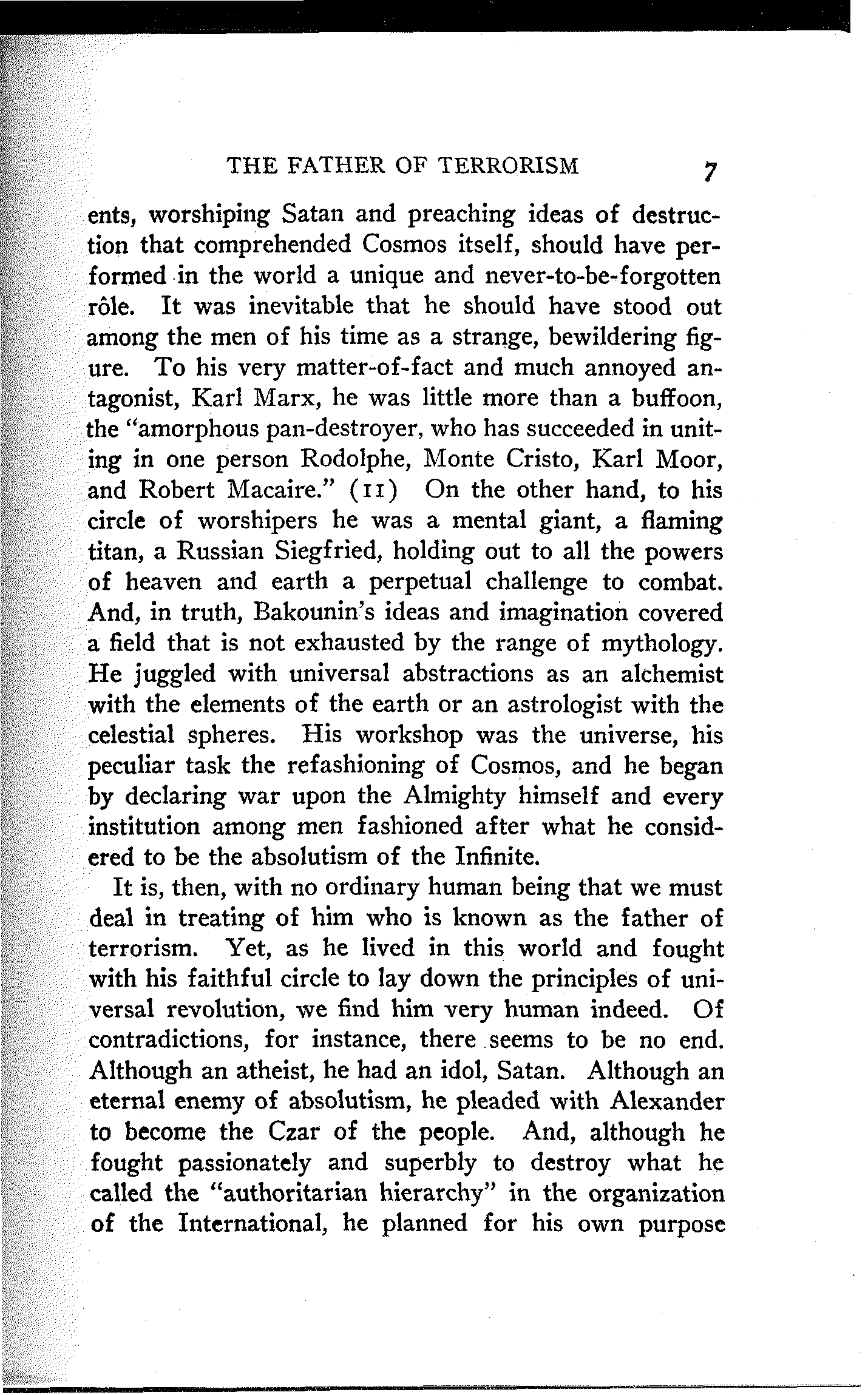 Even so brief a glimpse into Bakounin's mind is likely to startle the reader. But there is no fiction here; he is what Carlyle would have called "a terrible God's Fact." He was a very real product of Russia's infamy, and we need not be surprised if one with Bakounin's great [7]talents, worshiping Satan and preaching ideas of destruction that comprehended Cosmos itself, should have performed in the world a unique and never-to-be-forgotten rôle. It was inevitable that he should have stood out among the men of his time as a strange, bewildering figure. To his very matter-of-fact and much annoyed antagonist, Karl Marx, he was little more than a buffoon, the "amorphous pan-destroyer, who has succeeded in uniting in one person Rodolphe, Monte Cristo, Karl Moor, and Robert Macaire." (11) On the other hand, to his circle of worshipers he was a mental giant, a flaming titan, a Russian Siegfried, holding out to all the powers of heaven and earth a perpetual challenge to combat. And, in truth, Bakounin's ideas and imagination covered a field that is not exhausted by the range of mythology. He juggled with universal abstractions as an alchemist with the elements of the earth or an astrologist with the celestial spheres. His workshop was the universe, his peculiar task the refashioning of Cosmos, and he began by declaring war upon the Almighty himself and every institution among men fashioned after what he considered to be the absolutism of the Infinite.