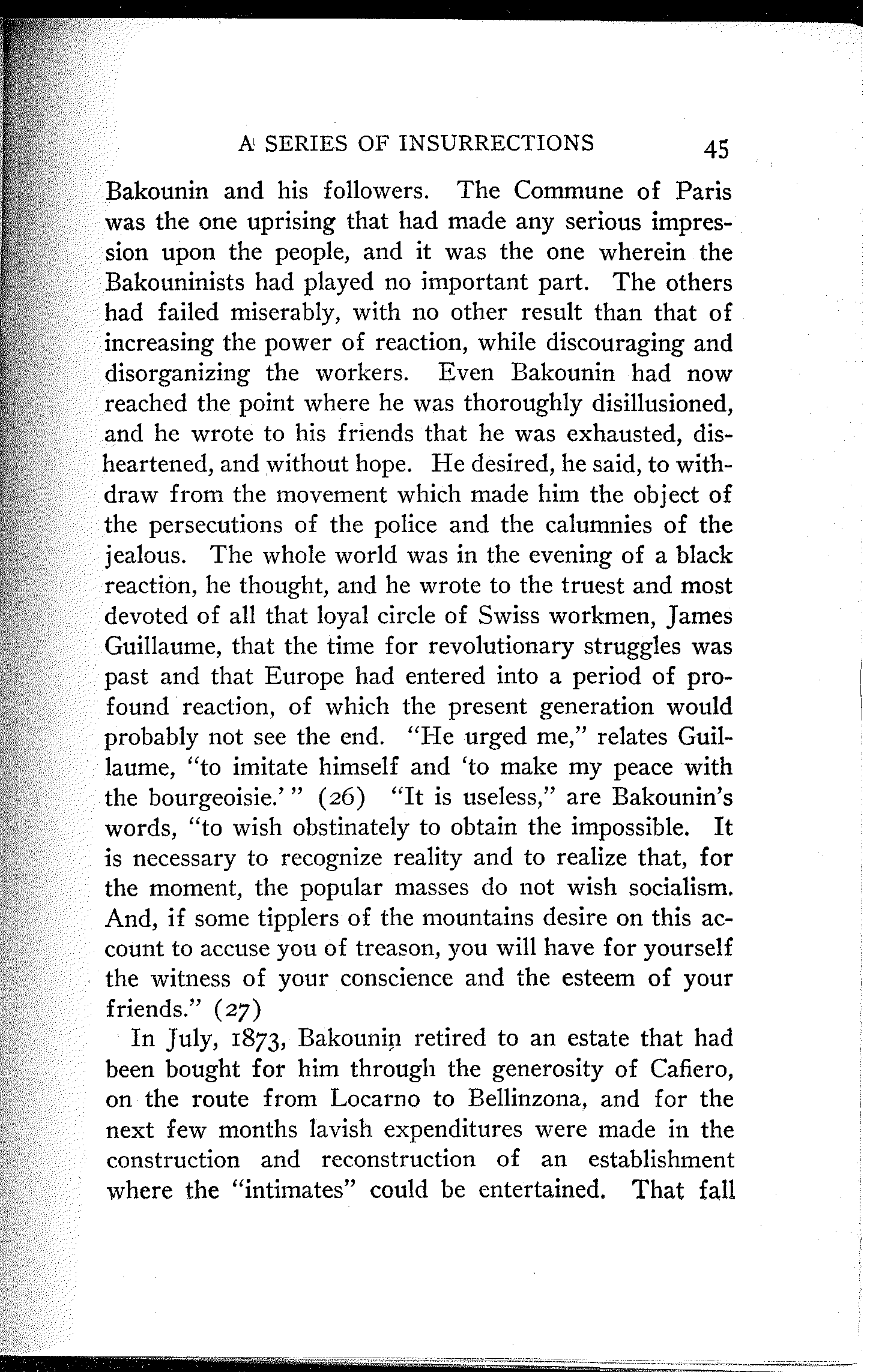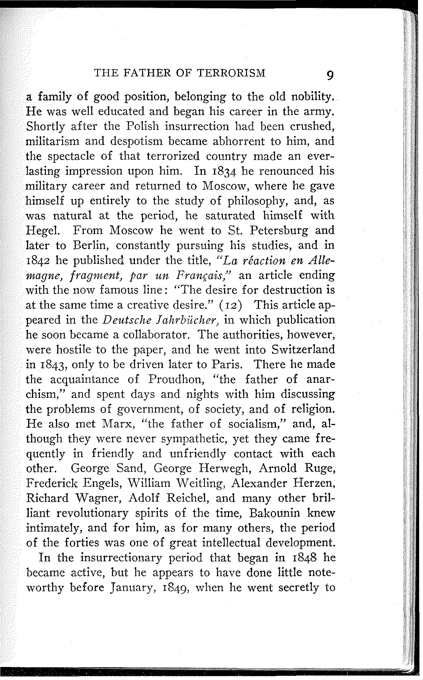 In general outline, this is the father of terrorism as I see him. How he developed his views is not entirely clear, as very little is known of his early life, and there are several broken threads at different periods both early and late in his career. The little known of his youth may be quickly told. He was born in Russia in 1814, of[9] a family of good position, belonging to the old nobility. He was well educated and began his career in the army. Shortly after the Polish insurrection had been crushed, militarism and despotism became abhorrent to him, and the spectacle of that terrorized country made an everlasting impression upon him. In 1834 he renounced his military career and returned to Moscow, where he gave himself up entirely to the study of philosophy, and, as was natural at the period, he saturated himself with Hegel. From Moscow he went to St. Petersburg and later to Berlin, constantly pursuing his studies, and in 1842 he published under the title, "La réaction en Allemagne, fragment, par un Français," an article ending with the now famous line: "The desire for destruction is at the same time a creative desire." (12) This article appeared in the Deutsche Jahrbücher, in which publication he soon became a collaborator. The authorities, however, were hostile to the paper, and he went into Switzerland in 1843, only to be driven later to Paris. There he made the acquaintance of Proudhon, "the father of anarchism," and spent days and nights with him discussing the problems of government, of society, and of religion. He also met Marx, "the father of socialism," and, although they were never sympathetic, yet they came frequently in friendly and unfriendly contact with each other. George Sand, George Herwegh, Arnold Ruge, Frederick Engels, William Weitling, Alexander Herzen, Richard Wagner, Adolf Reichel, and many other brilliant revolutionary spirits of the time, Bakounin knew intimately, and for him, as for many others, the period of the forties was one of great intellectual development.