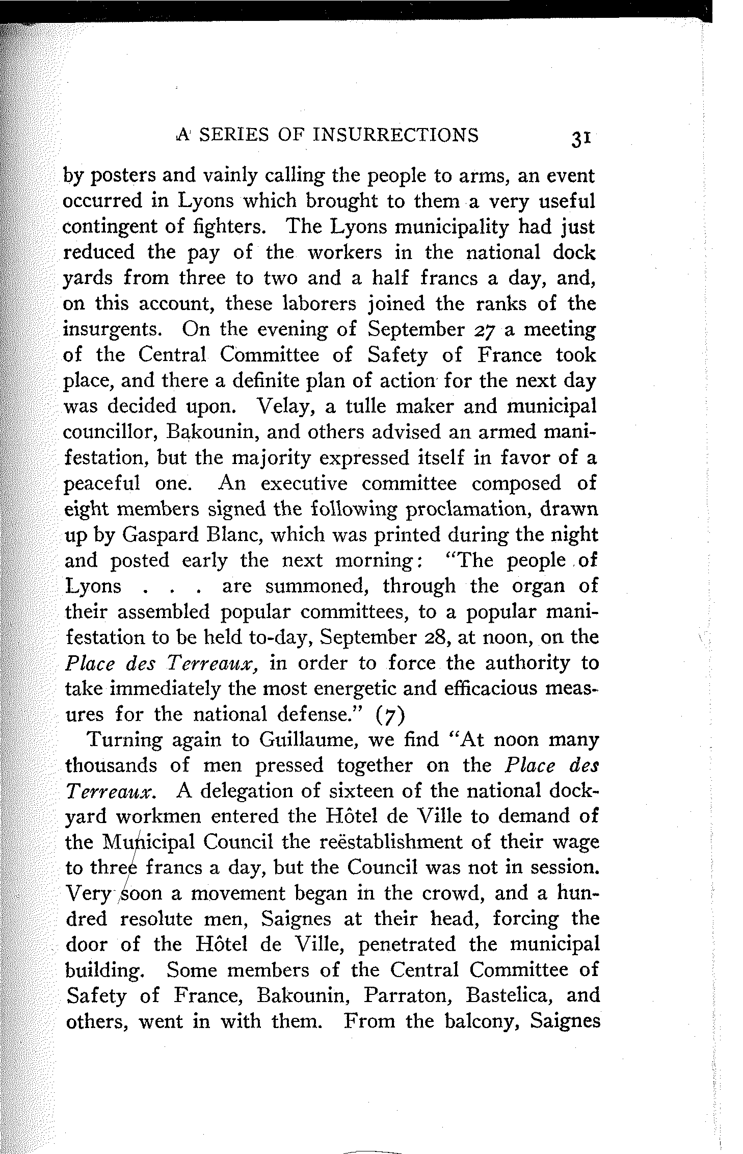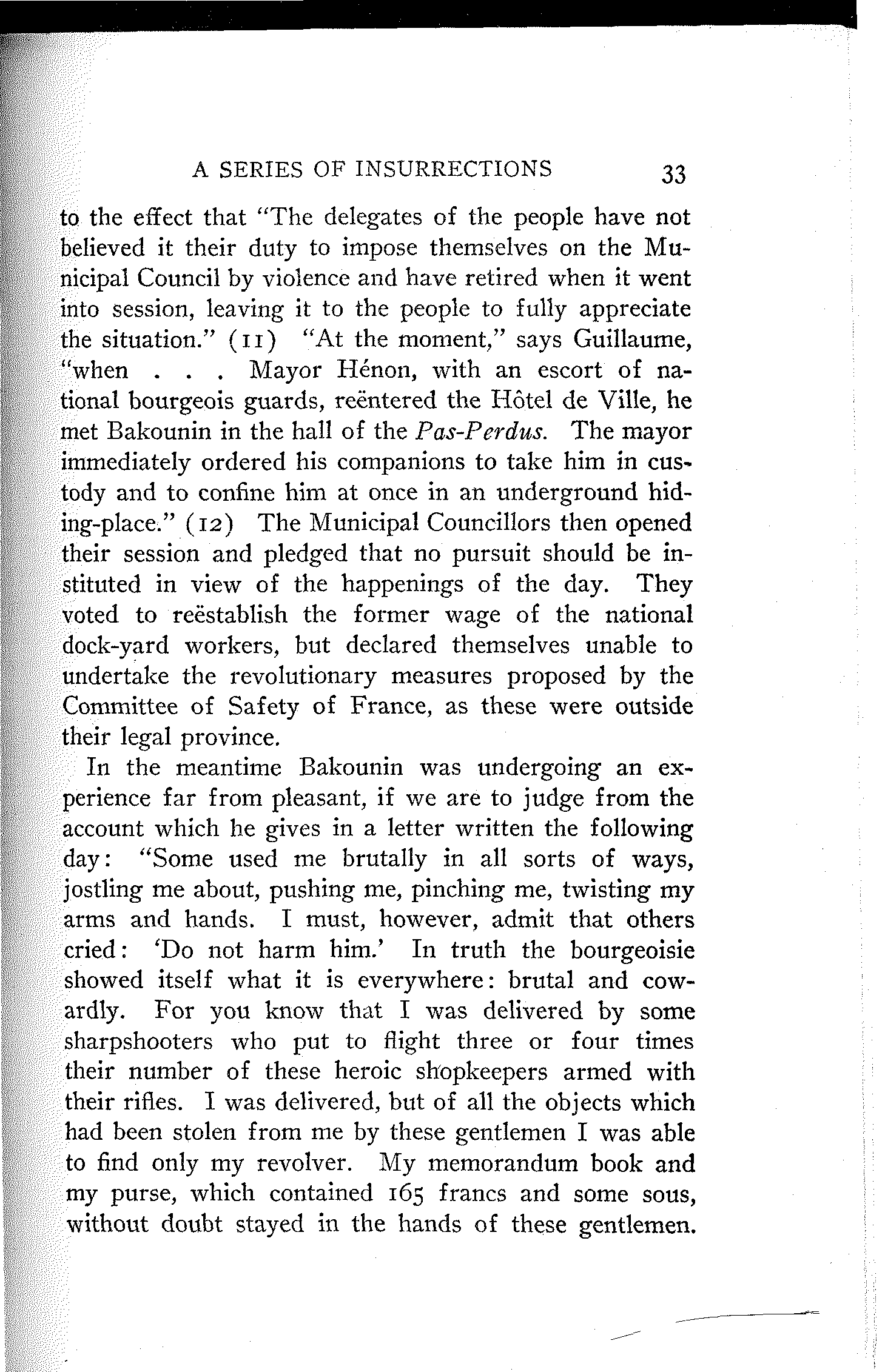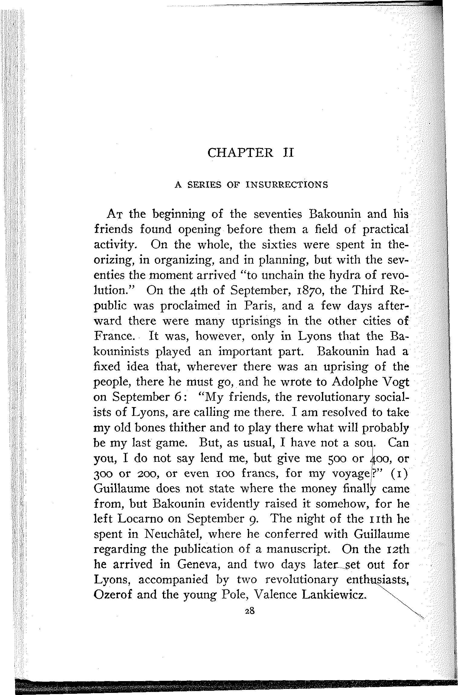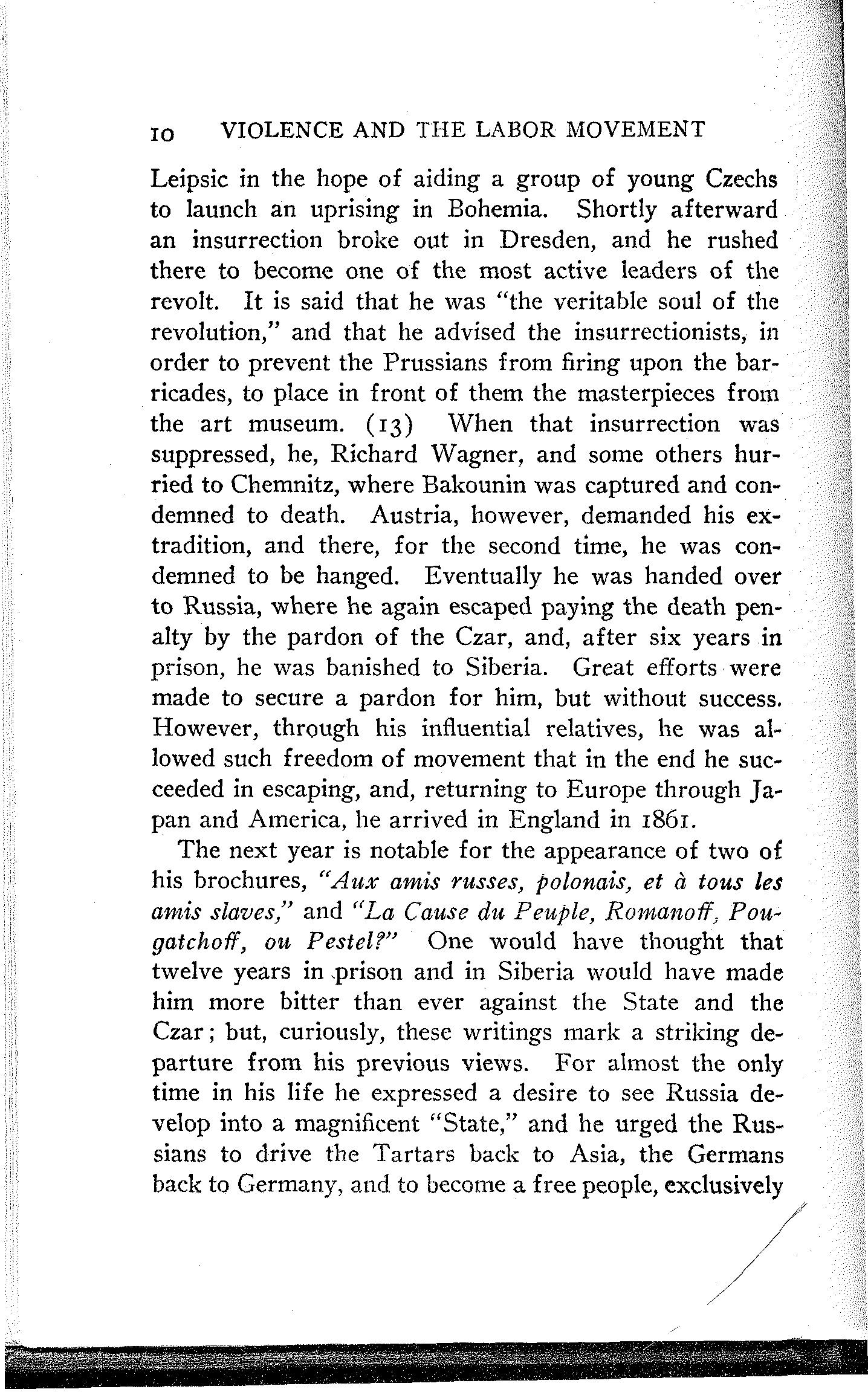 In the insurrectionary period that began in 1848 he became active, but he appears to have done little noteworthy before January, 1849, when he went secretly to[10] Leipsic in the hope of aiding a group of young Czechs to launch an uprising in Bohemia. Shortly afterward an insurrection broke out in Dresden, and he rushed there to become one of the most active leaders of the revolt. It is said that he was "the veritable soul of the revolution," and that he advised the insurrectionists, in order to prevent the Prussians from firing upon the barricades, to place in front of them the masterpieces from the art museum. (13) When that insurrection was suppressed, he, Richard Wagner, and some others hurried to Chemnitz, where Bakounin was captured and condemned to death. Austria, however, demanded his extradition, and there, for the second time, he was condemned to be hanged. Eventually he was handed over to Russia, where he again escaped paying the death penalty by the pardon of the Czar, and, after six years in prison, he was banished to Siberia. Great efforts were made to secure a pardon for him, but without success. However, through his influential relatives, he was allowed such freedom of movement that in the end he succeeded in escaping, and, returning to Europe through Japan and America, he arrived in England in 1861.
