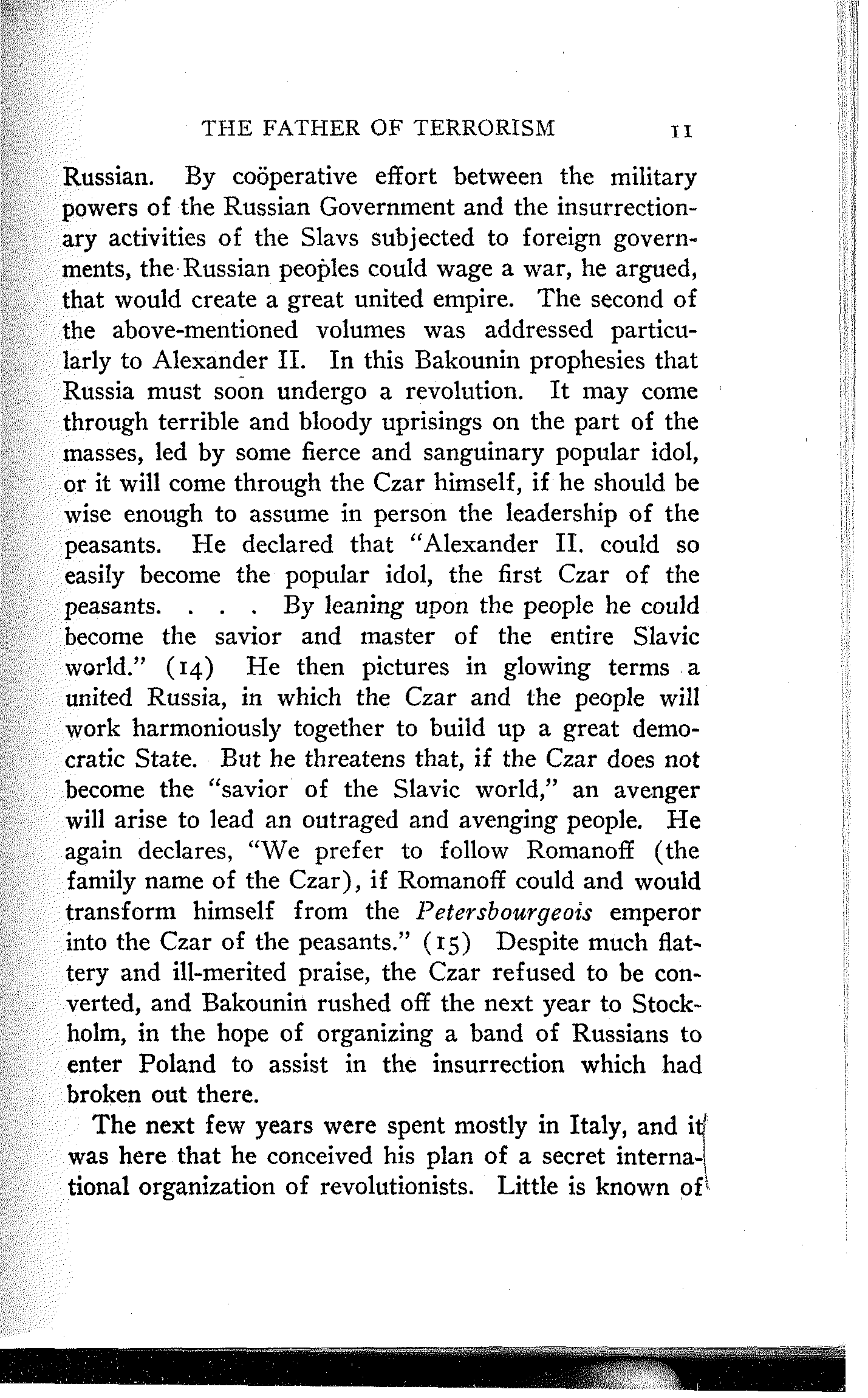 The next year is notable for the appearance of two of his brochures, "Aux amis russes, polonais, et à tous les amis slaves," and "La Cause du Peuple, Romanoff, Pougatchoff, ou Pestel?" One would have thought that twelve years in prison and in Siberia would have made him more bitter than ever against the State and the Czar; but, curiously, these writings mark a striking departure from his previous views. For almost the only time in his life he expressed a desire to see Russia develop into a magnificent "State," and he urged the Russians to drive the Tartars back to Asia, the Germans back to Germany, and to become a free people, exclusively[11] Russian. By coöperative effort between the military powers of the Russian Government and the insurrectionary activities of the Slavs subjected to foreign governments, the Russian peoples could wage a war, he argued, that would create a great united empire. The second of the above-mentioned volumes was addressed particularly to Alexander II. In this Bakounin prophesies that Russia must soon undergo a revolution. It may come through terrible and bloody uprisings on the part of the masses, led by some fierce and sanguinary popular idol, or it will come through the Czar himself, if he should be wise enough to assume in person the leadership of the peasants. He declared that "Alexander II. could so easily become the popular idol, the first Czar of the peasants.... By leaning upon the people he could become the savior and master of the entire Slavic world." (14) He then pictures in glowing terms a united Russia, in which the Czar and the people will work harmoniously together to build up a great democratic State. But he threatens that, if the Czar does not become the "savior of the Slavic world," an avenger will arise to lead an outraged and avenging people. He again declares, "We prefer to follow Romanoff (the family name of the Czar), if Romanoff could and would transform himself from the Petersbourgeois emperor into the Czar of the peasants." (15) Despite much flattery and ill-merited praise, the Czar refused to be converted, and Bakounin rushed off the next year to Stockholm, in the hope of organizing a band of Russians to enter Poland to assist in the insurrection which had broken out there.
