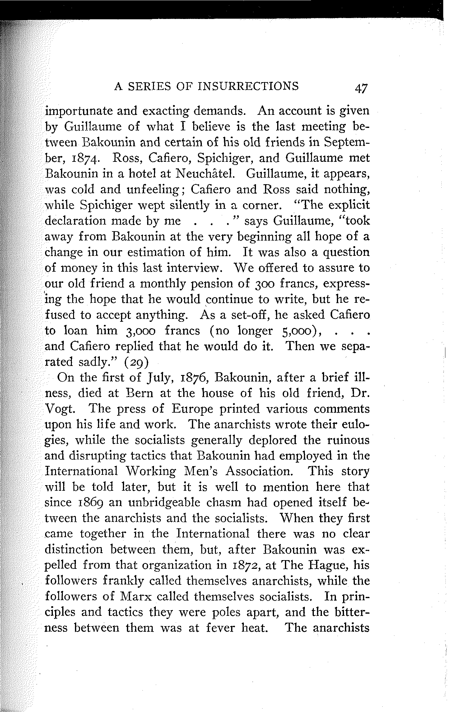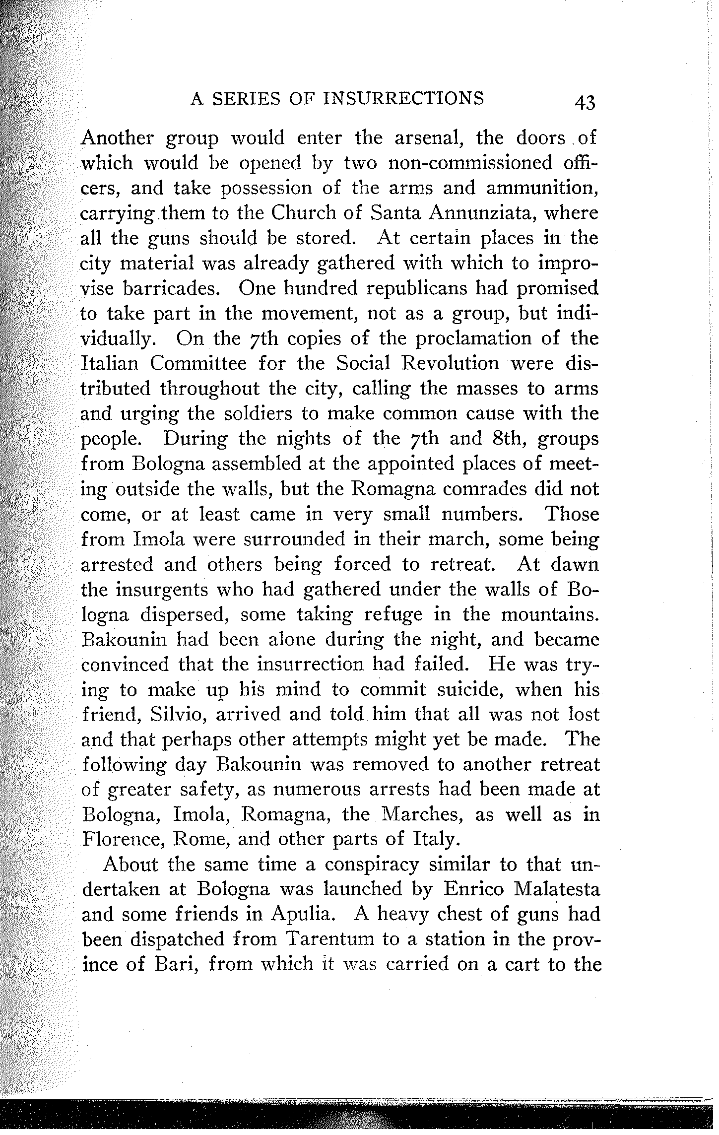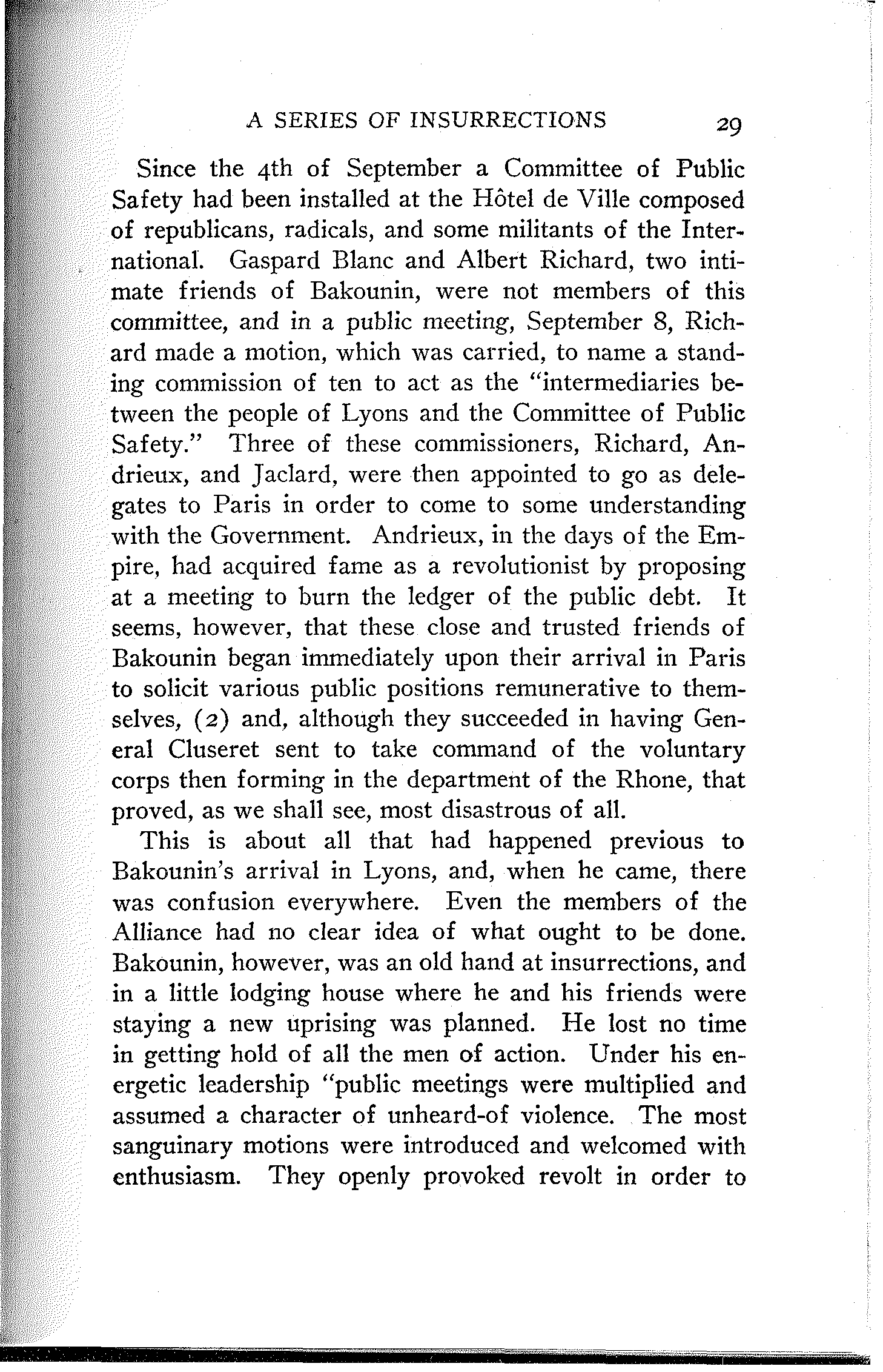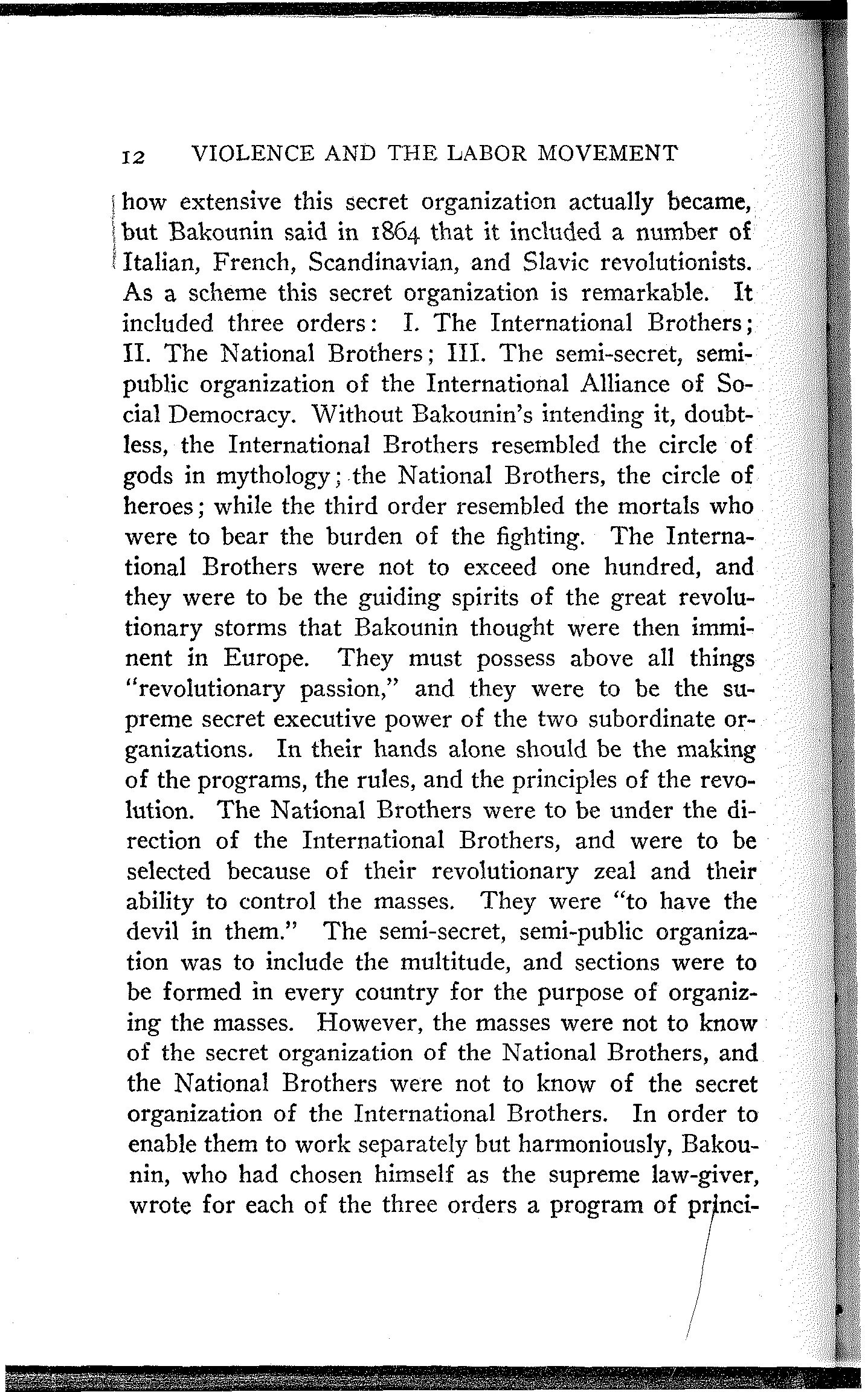 The next few years were spent mostly in Italy, and it was here that he conceived his plan of a secret international organization of revolutionists. Little is known of[12] how extensive this secret organization actually became, but Bakounin said in 1864 that it included a number of Italian, French, Scandinavian, and Slavic revolutionists. As a scheme this secret organization is remarkable. It included three orders: I. The International Brothers; II. The National Brothers; III. The semi-secret, semi-public organization of the International Alliance of Social Democracy. Without Bakounin's intending it, doubtless, the International Brothers resembled the circle of gods in mythology; the National Brothers, the circle of heroes; while the third order resembled the mortals who were to bear the burden of the fighting. The International Brothers were not to exceed one hundred, and they were to be the guiding spirits of the great revolutionary storms that Bakounin thought were then imminent in Europe. They must possess above all things "revolutionary passion," and they were to be the supreme secret executive power of the two subordinate organizations. In their hands alone should be the making of the programs, the rules, and the principles of the revolution. The National Brothers were to be under the direction of the International Brothers, and were to be selected because of their revolutionary zeal and their ability to control the masses. They were "to have the devil in them." The semi-secret, semi-public organization was to include the multitude, and sections were to be formed in every country for the purpose of organizing the masses. However, the masses were not to know of the secret organization of the National Brothers, and the National Brothers were not to know of the secret organization of the International Brothers. In order to enable them to work separately but harmoniously, Bakounin, who had chosen himself as the supreme law-giver, wrote for each of the three orders a program of [13]principles, a code of rules, and a plan of methods all its own. The ultimate ends of this movement were not to be communicated to either the National Brothers or to the Alliance, and the masses were to know only that which was good for them to know, and which would not be likely to frighten them. These are very briefly the outlines of the extraordinary hierarchy that was to form throughout all Europe and America an invisible network of "the real revolutionists."