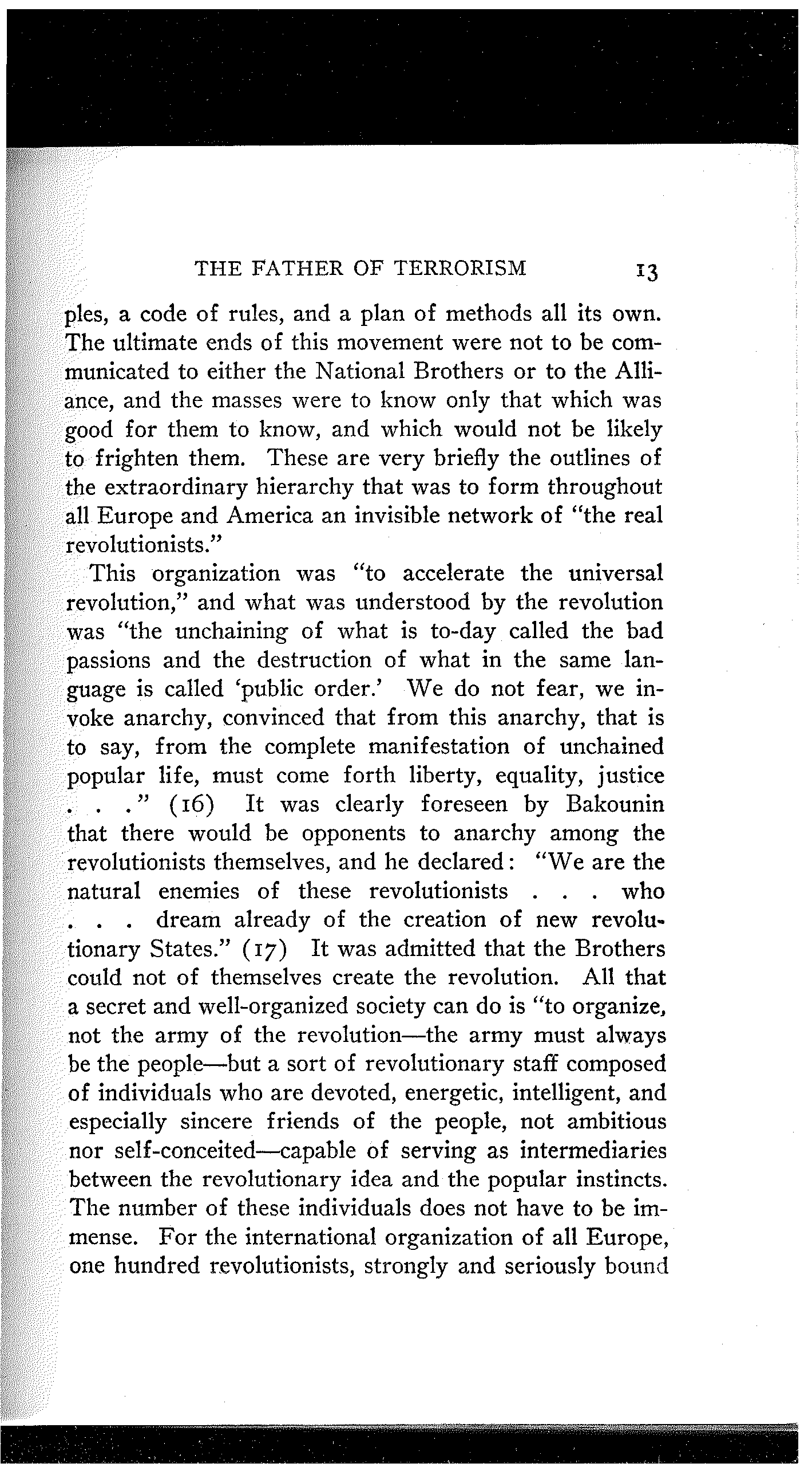 This organization was "to accelerate the universal revolution," and what was understood by the revolution was "the unchaining of what is to-day called the bad passions and the destruction of what in the same language is called 'public order.' We do not fear, we invoke anarchy, convinced that from this anarchy, that is to say, from the complete manifestation of unchained popular life, must come forth liberty, equality, justice ..." (16) It was clearly foreseen by Bakounin that there would be opponents to anarchy among the revolutionists themselves, and he declared: "We are the natural enemies of these revolutionists ... who ... dream already of the creation of new revolutionary States." (17) It was admitted that the Brothers could not of themselves create the revolution. All that a secret and well-organized society can do is "to organize, not the army of the revolution—the army must always be the people—but a sort of revolutionary staff composed of individuals who are devoted, energetic, intelligent, and especially sincere friends of the people, not ambitious nor self-conceited—capable of serving as intermediaries between the revolutionary idea and the popular instincts. The number of these individuals does not have to be immense. For the international organization of all Europe, one hundred revolutionists, strongly and seriously bound[14] together, are sufficient. Two or three hundred revolutionists will be sufficient for the organization of the largest country." (18)