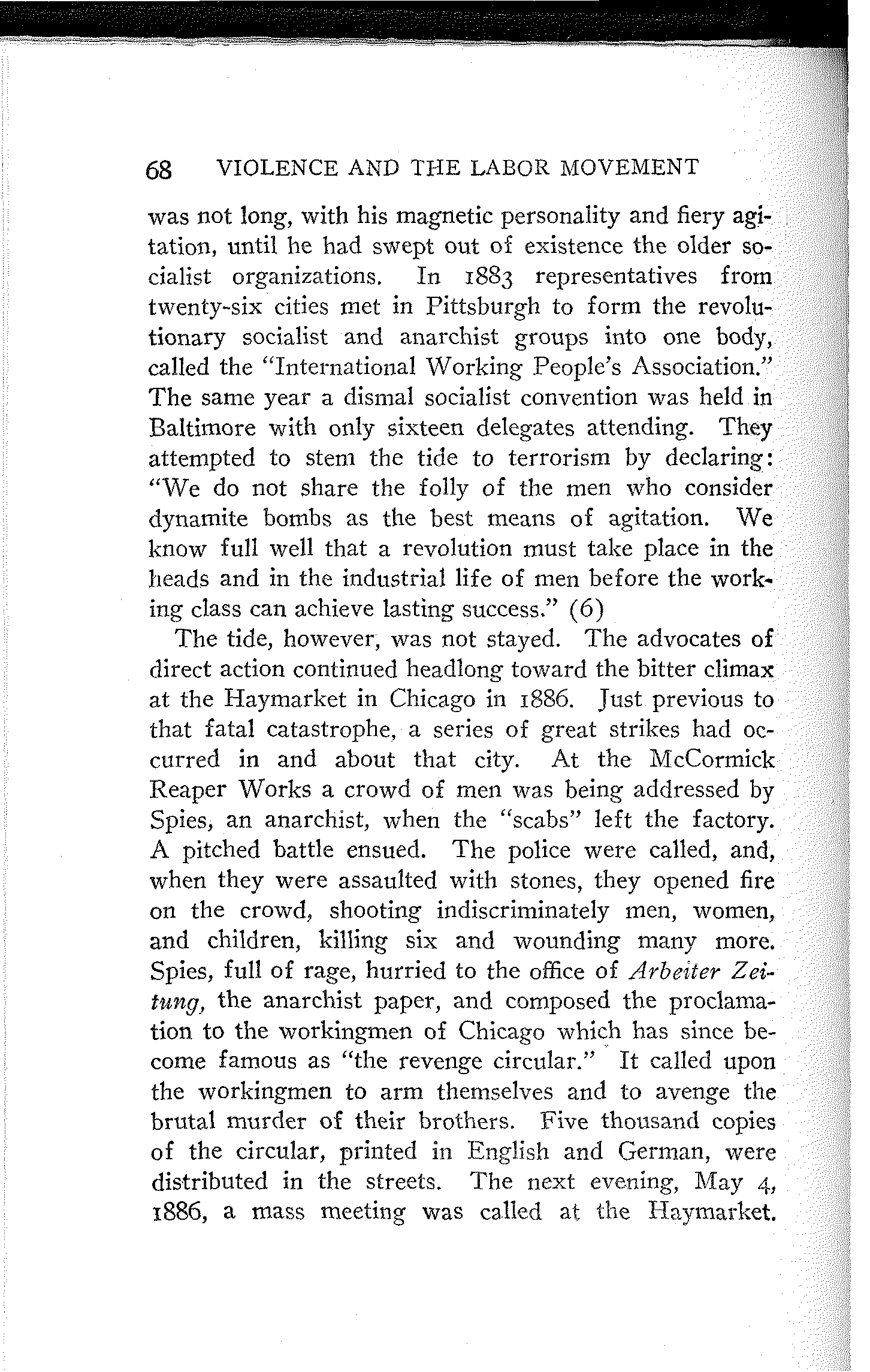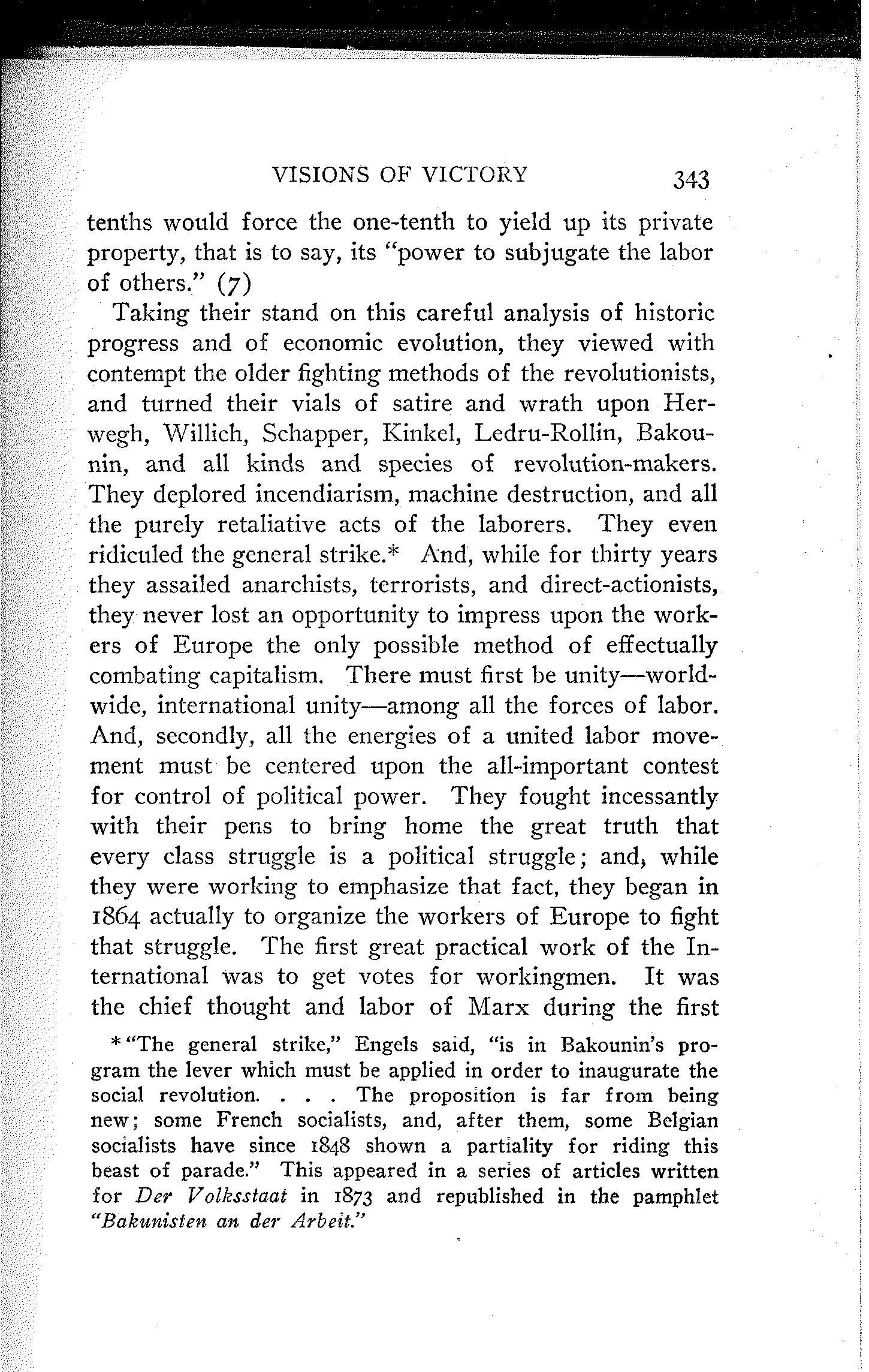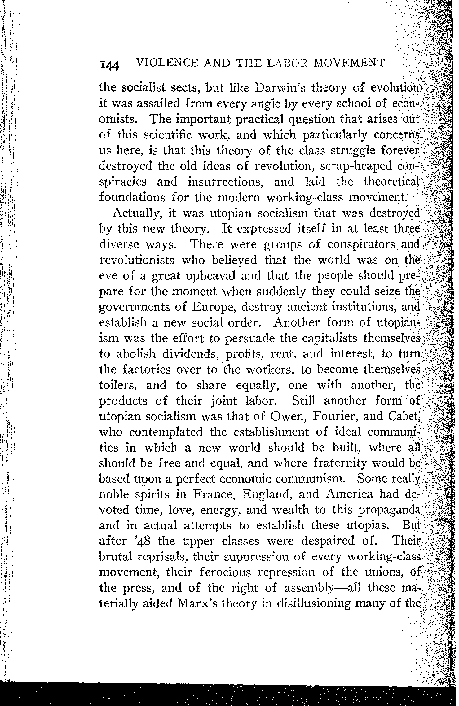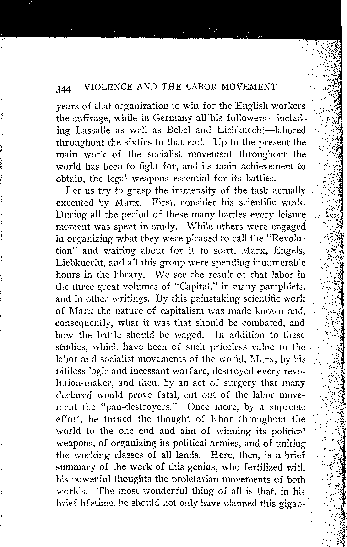 The advocacy of such doctrines alarmed the older socialists, who were familiar with the many disasters that had overtaken the labor movement in its earlier days, and nearly all of them assailed the direct actionists. Mr. Eugene V. Debs, Mr. Victor L. Berger, Mr. John Spargo, Mr. Morris Hillquit, and many others, less well known, combated "the new methods" in vigorous language. Mr. Hillquit dealt with the question in a manner that immediately awakened the attention of every active socialist. Condemning without reserve every resort to lawbreaking and violence, and insisting that both were "ethically unjustifiable and tactically suicidal," Mr. Hillquit pointed out that whenever any group or section of the labor movement "has embarked upon a policy of 'breaking the law' or using 'any weapons which will win the fight,' whether such policy was styled 'terrorism,' 'propaganda of the deed,' 'direct action,' 'sabotage,' or 'anarchism,' it has invariably served to demoralize and destroy the movement, by attracting to it professional criminals, infesting it with spies, leading the workers to needless and senseless slaughter, and ultimately engendering a spirit of disgust and reaction. It was this advocacy of 'lawbreaking' which Marx and Engels fought so severely in the International and which finally led to the disruption of the first great international parliament of labor, and the socialist party of every country in the civilized world has since uniformly and emphatically rejected that policy."[C]