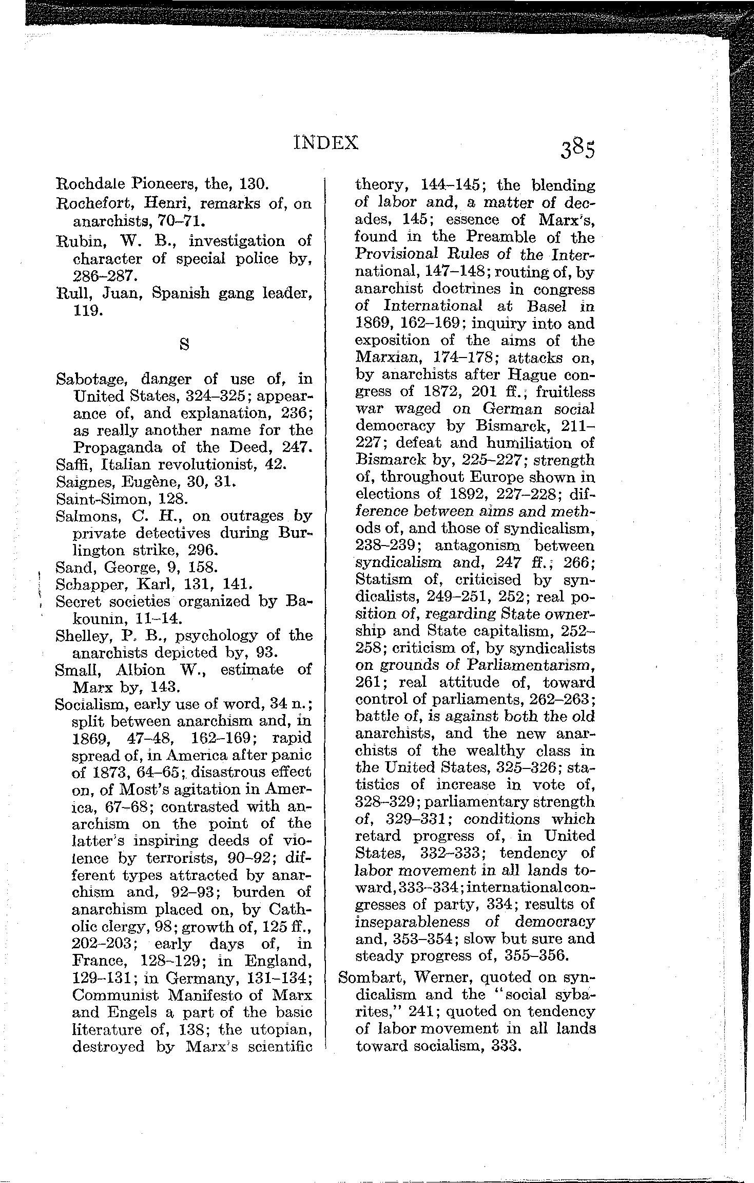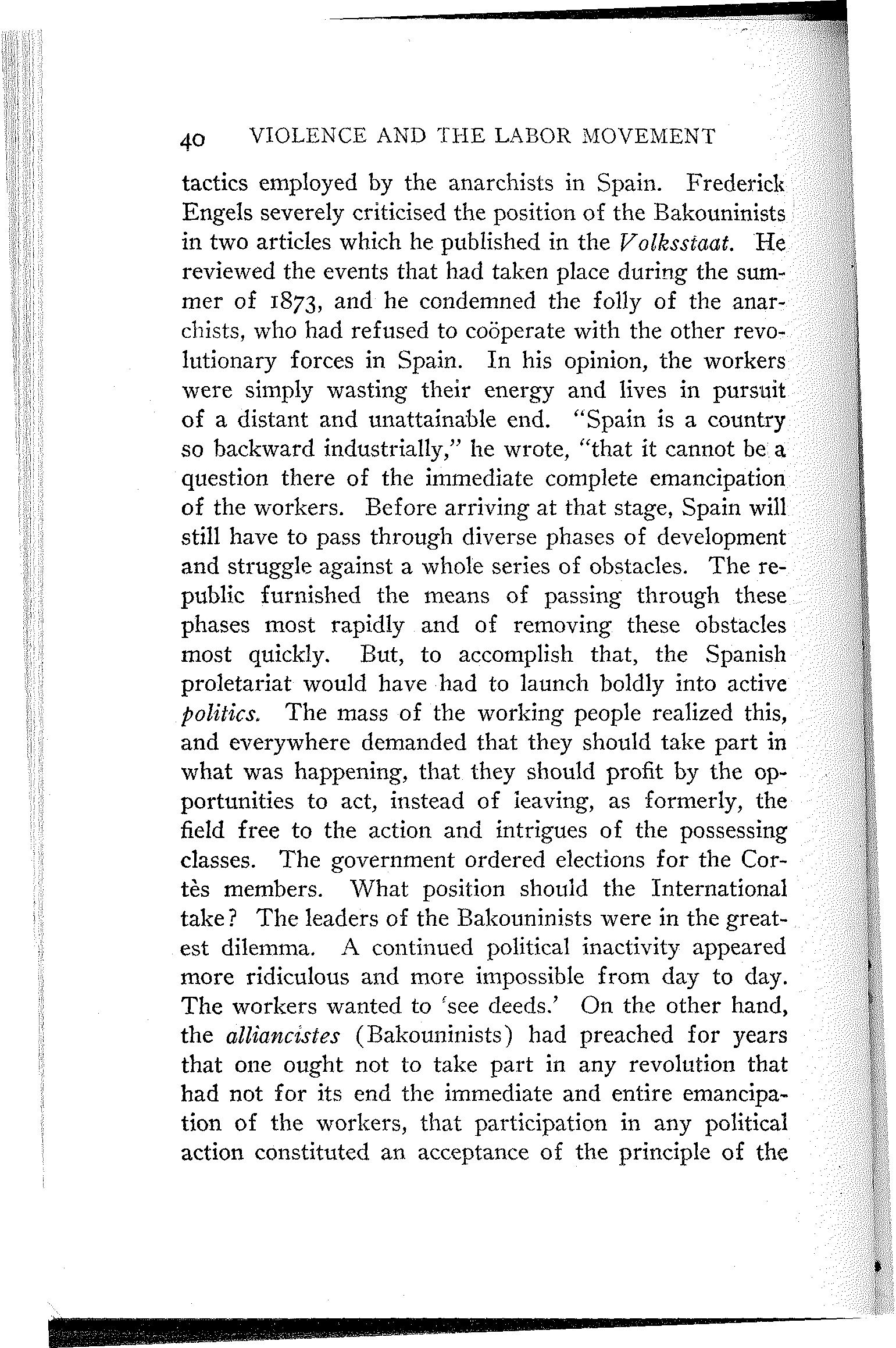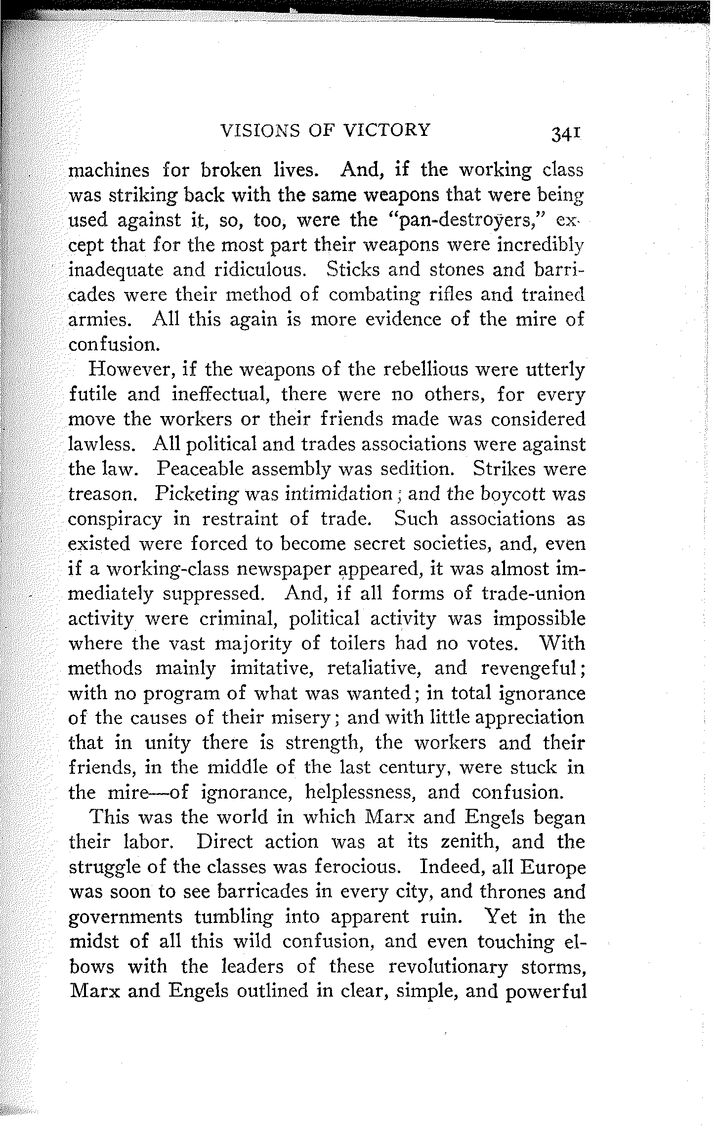 The advocacy of such doctrines alarmed the older socialists, who were familiar with the many disasters that had overtaken the labor movement in its earlier days, and nearly all of them assailed the direct actionists. Mr. Eugene V. Debs, Mr. Victor L. Berger, Mr. John Spargo, Mr. Morris Hillquit, and many others, less well known, combated "the new methods" in vigorous language. Mr. Hillquit dealt with the question in a manner that immediately awakened the attention of every active socialist. Condemning without reserve every resort to lawbreaking and violence, and insisting that both were "ethically unjustifiable and tactically suicidal," Mr. Hillquit pointed out that whenever any group or section of the labor movement "has embarked upon a policy of 'breaking the law' or using 'any weapons which will win the fight,' whether such policy was styled 'terrorism,' 'propaganda of the deed,' 'direct action,' 'sabotage,' or 'anarchism,' it has invariably served to demoralize and destroy the movement, by attracting to it professional criminals, infesting it with spies, leading the workers to needless and senseless slaughter, and ultimately engendering a spirit of disgust and reaction. It was this advocacy of 'lawbreaking' which Marx and Engels fought so severely in the International and which finally led to the disruption of the first great international parliament of labor, and the socialist party of every country in the civilized world has since uniformly and emphatically rejected that policy."[C]