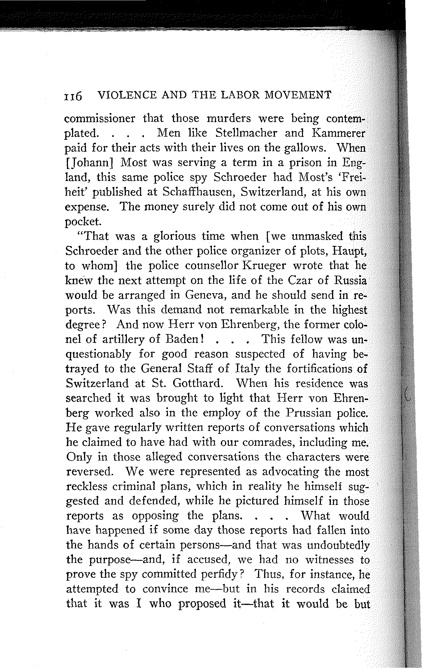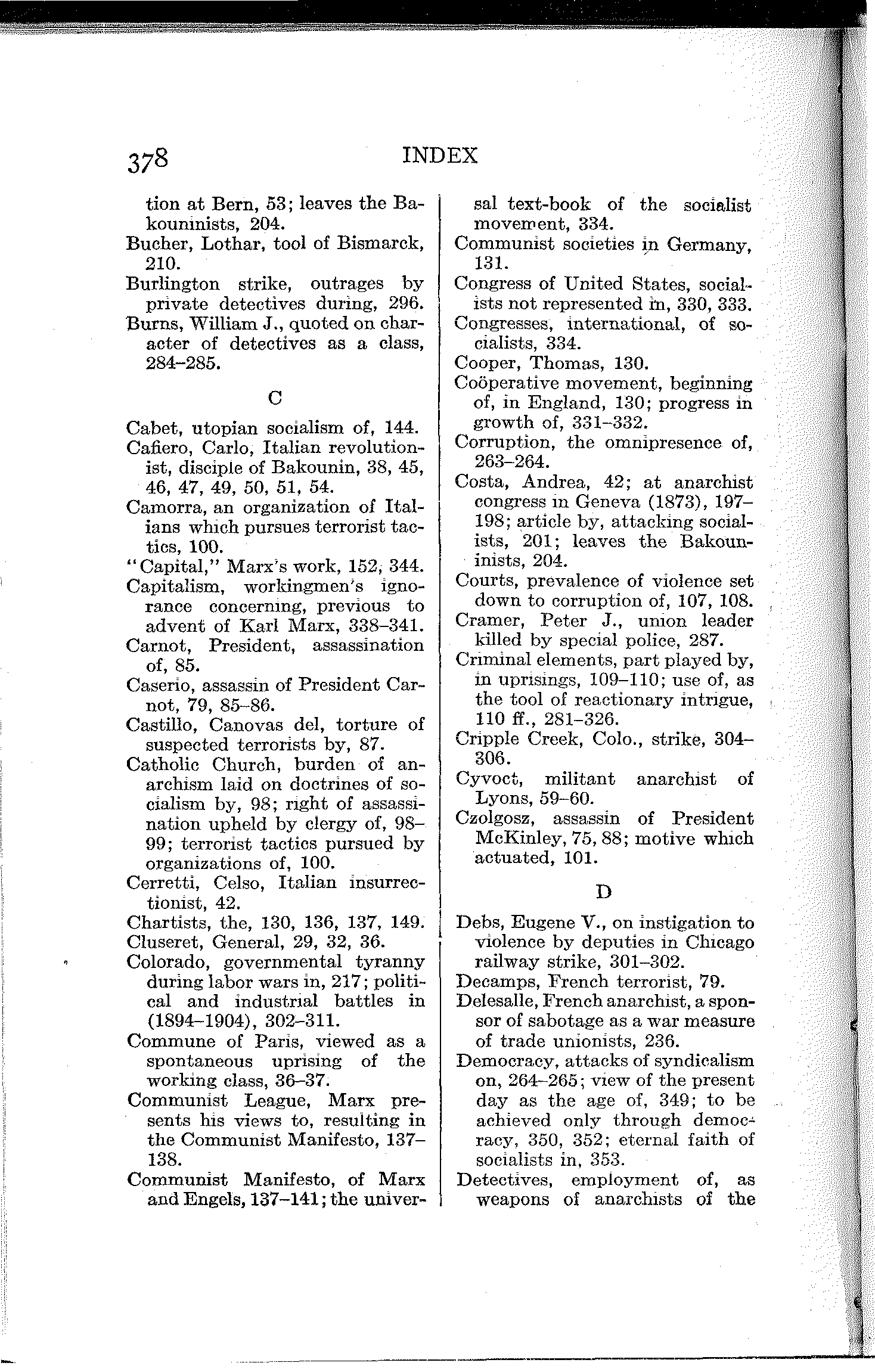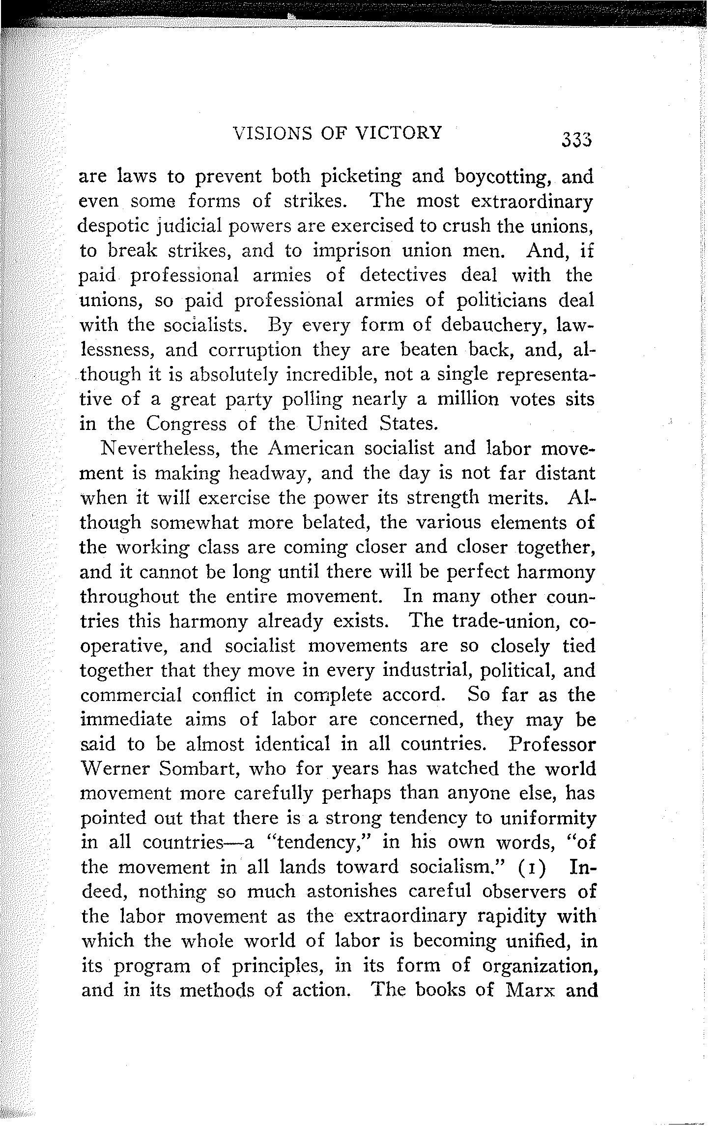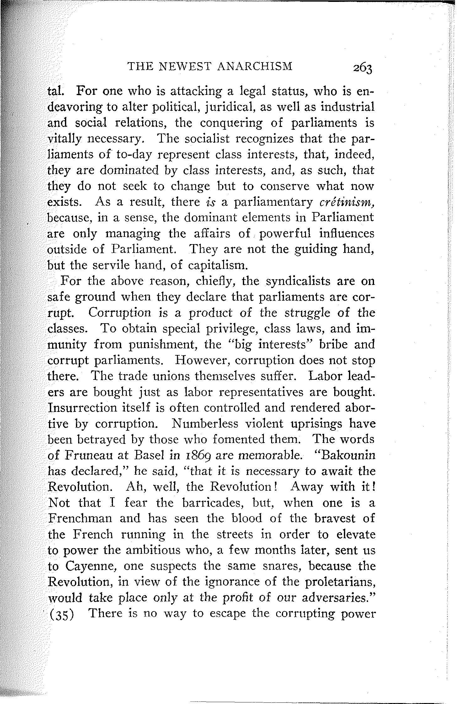 The advocacy of such doctrines alarmed the older socialists, who were familiar with the many disasters that had overtaken the labor movement in its earlier days, and nearly all of them assailed the direct actionists. Mr. Eugene V. Debs, Mr. Victor L. Berger, Mr. John Spargo, Mr. Morris Hillquit, and many others, less well known, combated "the new methods" in vigorous language. Mr. Hillquit dealt with the question in a manner that immediately awakened the attention of every active socialist. Condemning without reserve every resort to lawbreaking and violence, and insisting that both were "ethically unjustifiable and tactically suicidal," Mr. Hillquit pointed out that whenever any group or section of the labor movement "has embarked upon a policy of 'breaking the law' or using 'any weapons which will win the fight,' whether such policy was styled 'terrorism,' 'propaganda of the deed,' 'direct action,' 'sabotage,' or 'anarchism,' it has invariably served to demoralize and destroy the movement, by attracting to it professional criminals, infesting it with spies, leading the workers to needless and senseless slaughter, and ultimately engendering a spirit of disgust and reaction. It was this advocacy of 'lawbreaking' which Marx and Engels fought so severely in the International and which finally led to the disruption of the first great international parliament of labor, and the socialist party of every country in the civilized world has since uniformly and emphatically rejected that policy."[C]