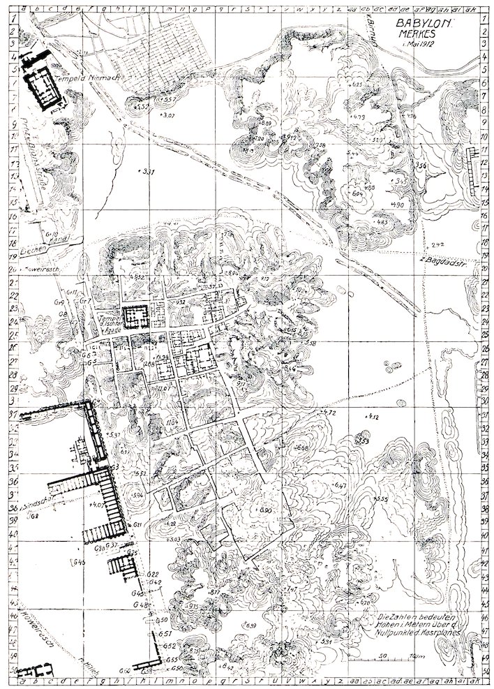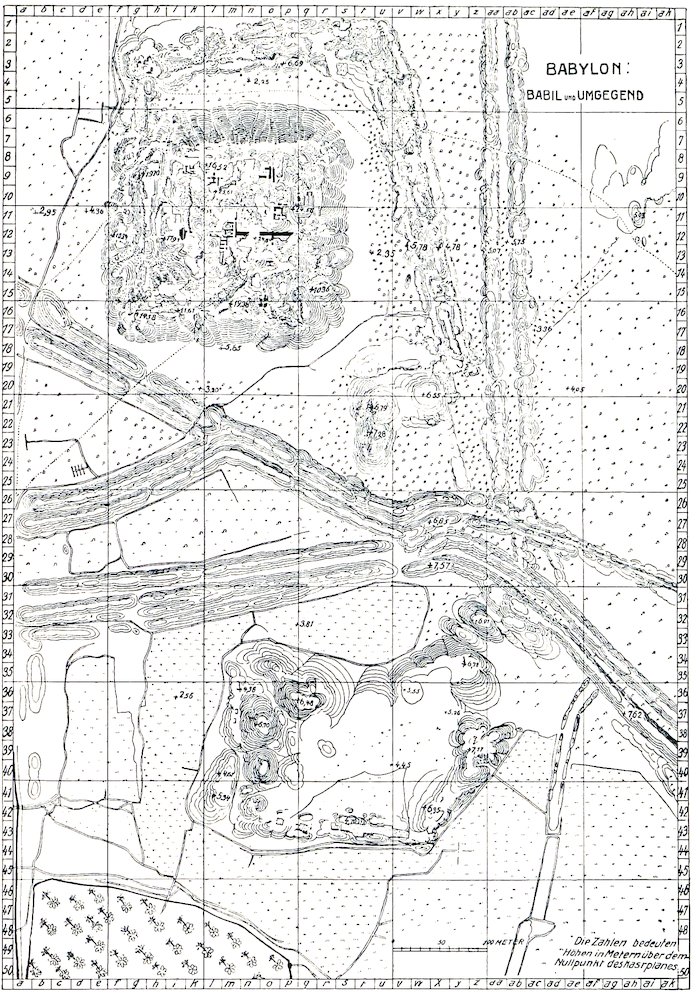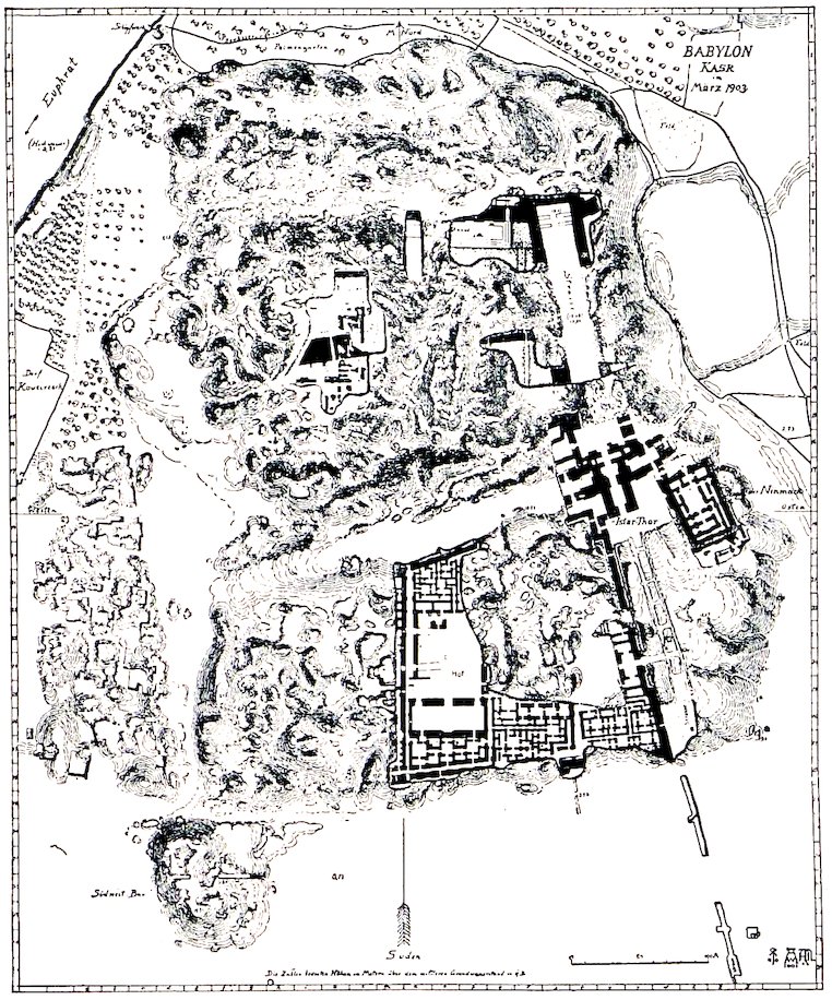 It is most desirable, if not absolutely necessary, that the excavation of Babylon should be completed. Up to the present time only about half the work has been accomplished, although since it began we have worked daily, both summer and winter, with from 200 to 250 workmen. This is easily comprehensible when we consider the magnitude of the undertaking. The city walls, for instance, which in other ancient towns measure 3 metres, or at the most 6 or 7 metres, in Babylon are fully 17 to 22 metres thick. On many ancient sites the mounds piled above the remains are not more than 2 or 3 to 6 metres high, while here we have to deal with 12 to 24 metres, and the vast extent of the area that was once inhabited is reflected in the grand scale of the ruins.