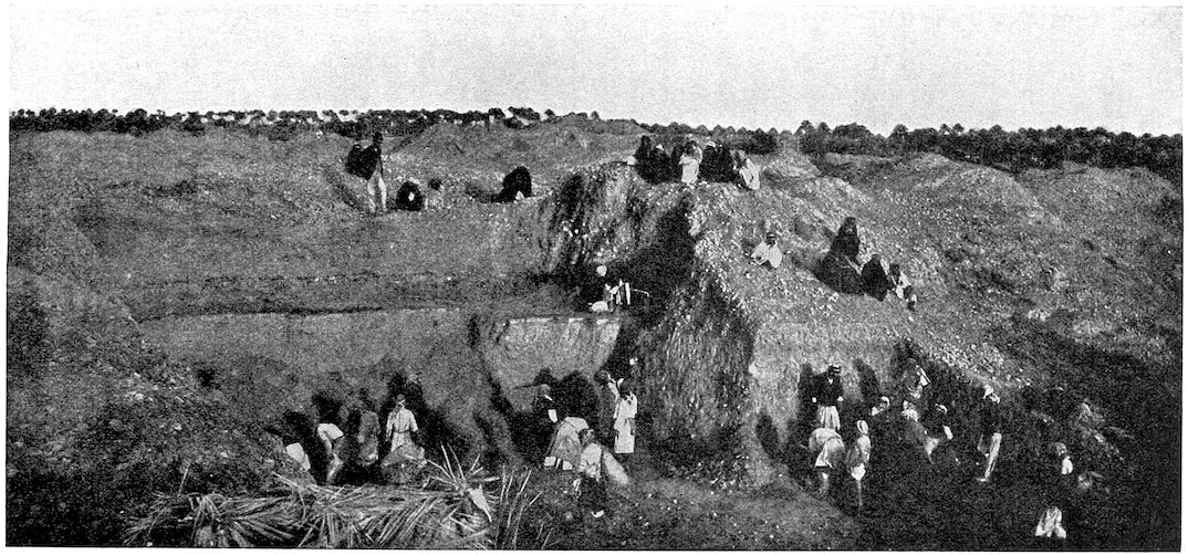 The digging is carried out by the general administration of the Royal Museums in Berlin, present Director-General His Excellency W. Bode, in conjunction with the Deutsche Orient-Gesellschaft, President His Excellency von Hollmann, under the patronage of H.M. the Emperor of Germany.