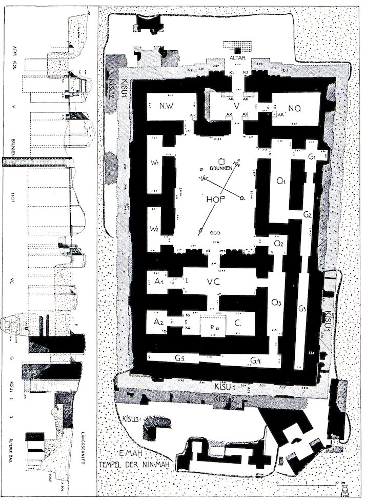 On the northern side stood 2 temples, one devoted to the god Hea, the other to Nusku. The temple of Hea was 85 cubits long and 30 broad (142 feet by 50 feet), and that of Nusku was a square, 35 cubits each way (58 feet by 58 feet).